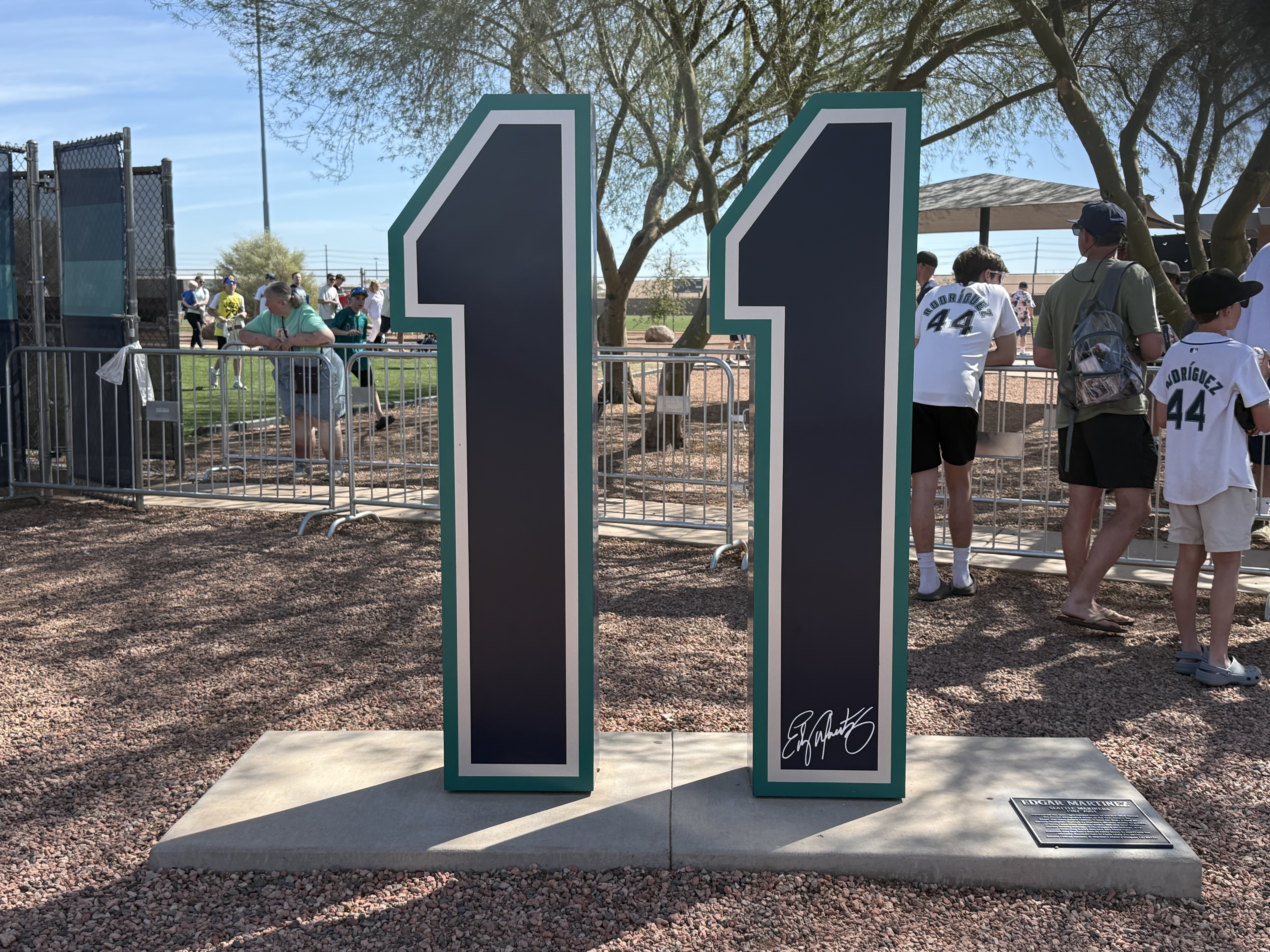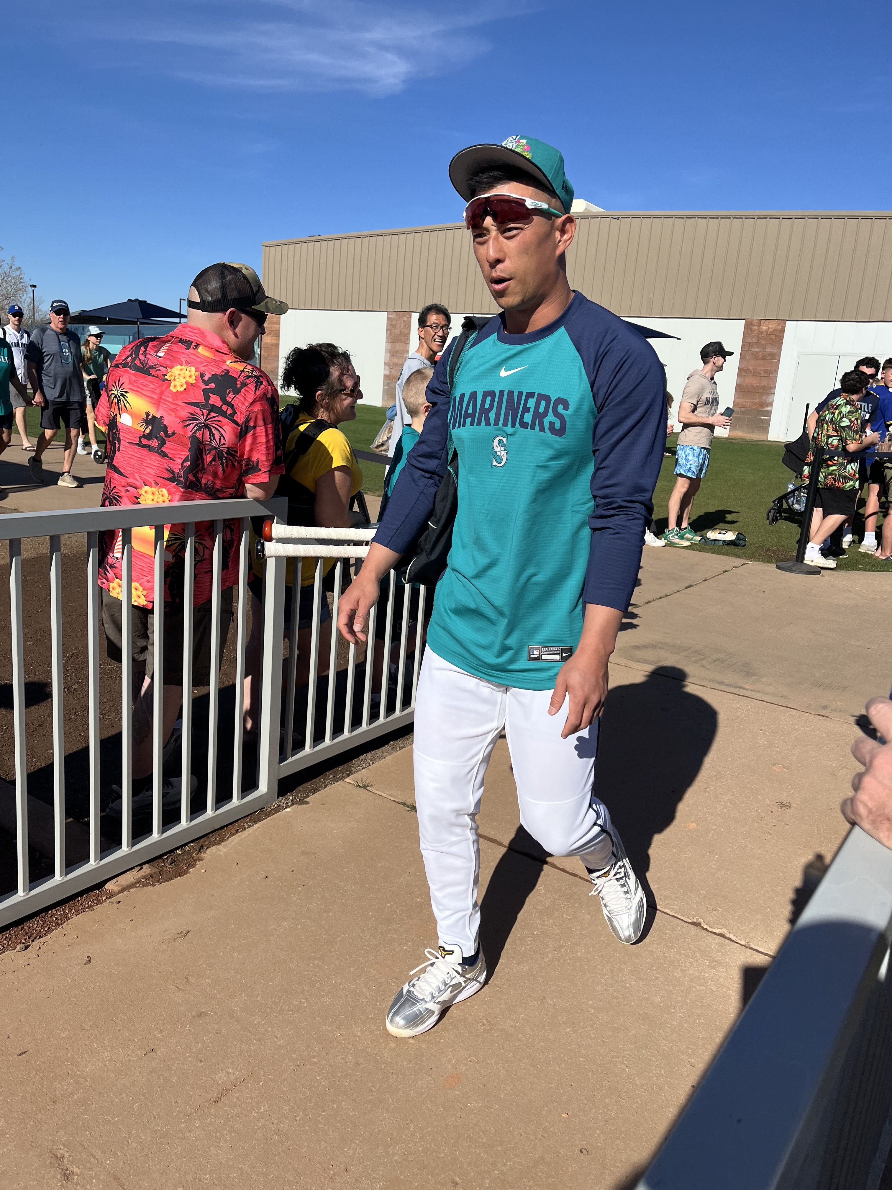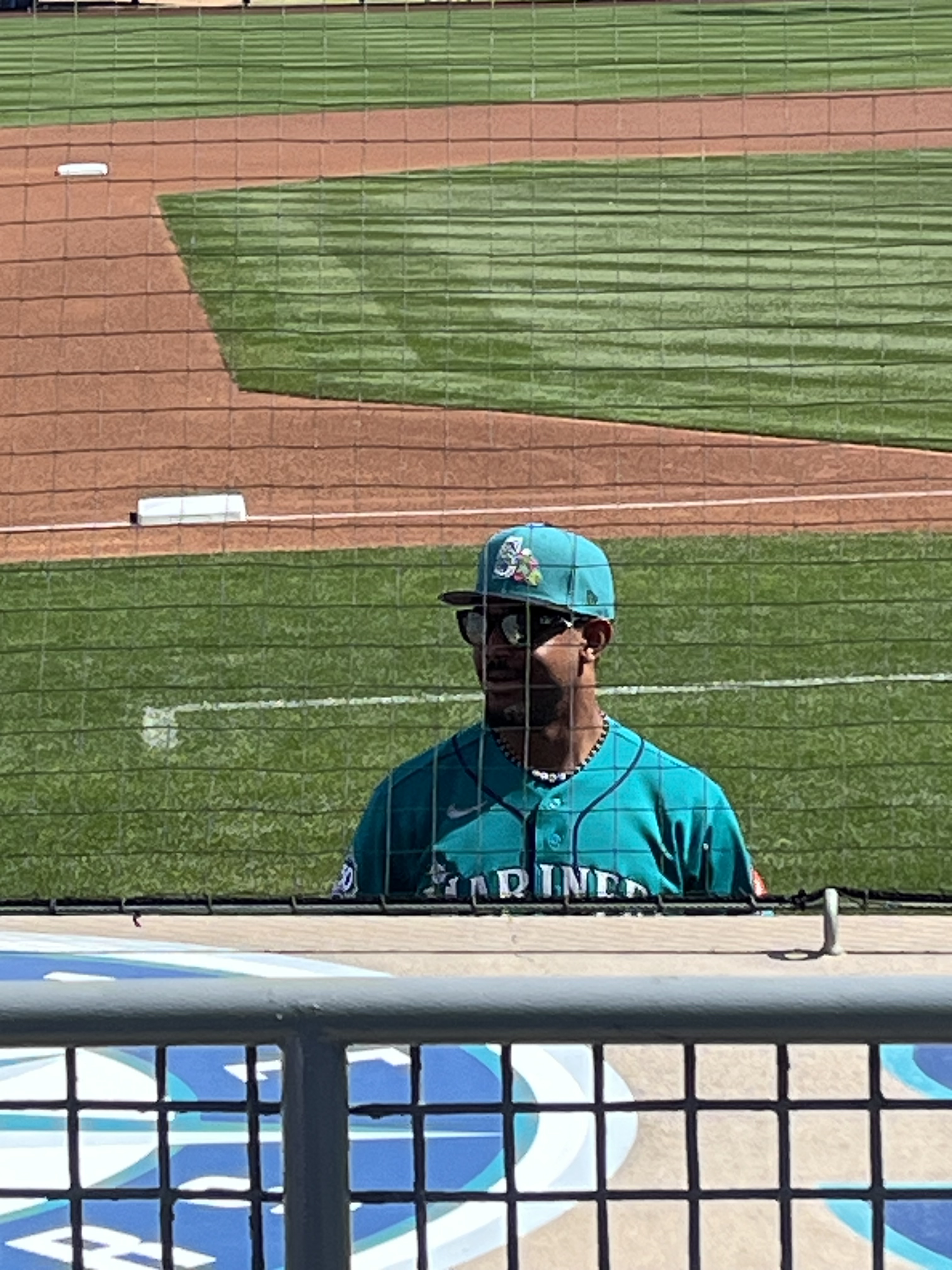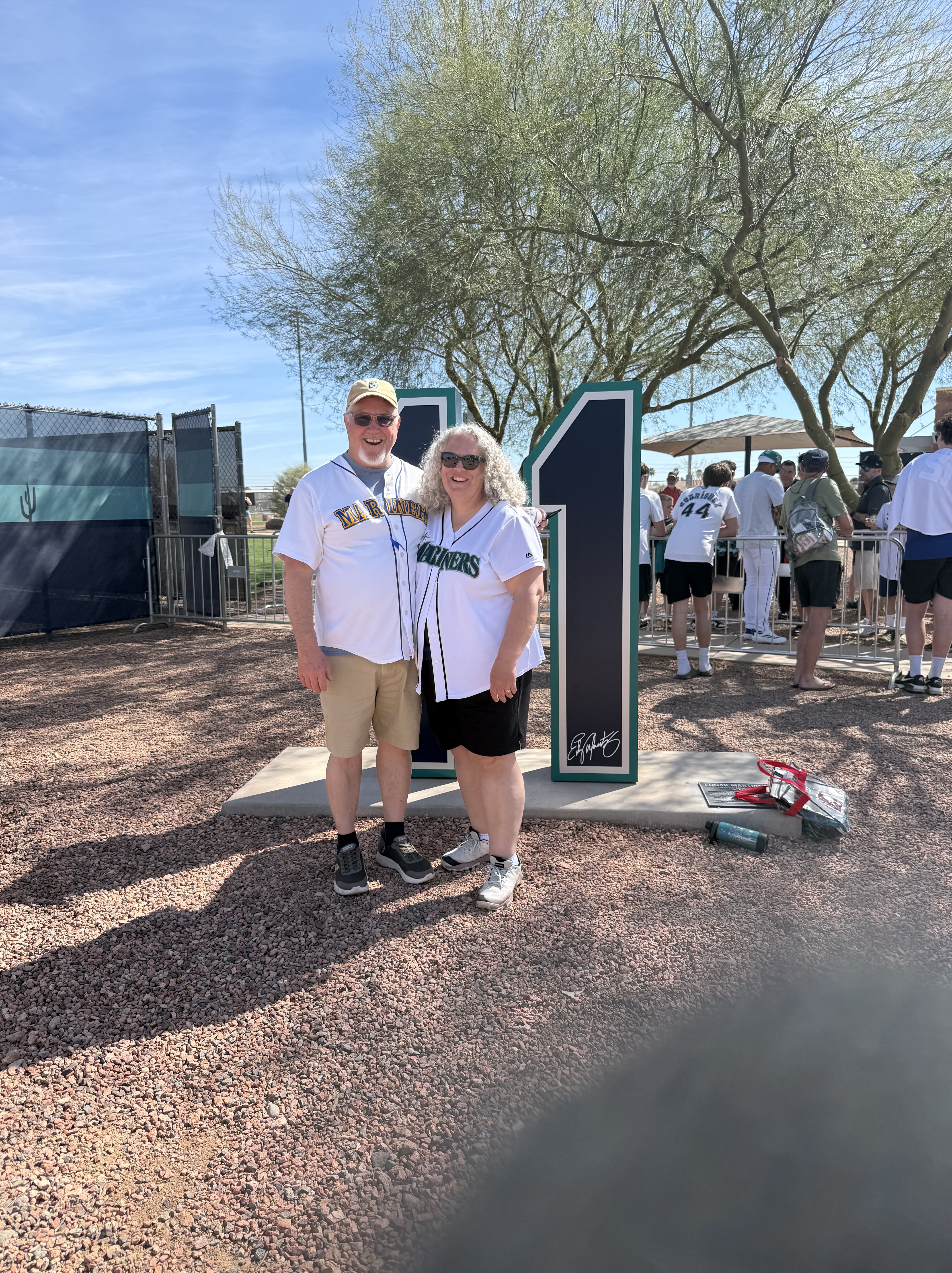 We had never been to spring training before, so we weren’t sure what to expect (that seems to be an ongoing theme with this trip!). We were grateful for the help and explanations other shared about where the players would be and when. We brought with us a variety of things we hoped to get autographed, including a collection of baseball cards and a hand-drawn picture of the Mariner Moose from our grandson, a hat and jersey from our son, our own jerseys, and a baseball. As players started filtering out of the clubhouse and onto the practice fields (there were four!), we soon realized that the autographs being given were almost exclusively to kids…which we are not! However, we did get to talk with Rick Rizzs, “the voice of the Mariners,” and a MiLB player, Victor something, who is currently assigned to play in Arkansas. Victor was very friendly and chatty; and who knows, maybe someday we will see him playing at T-Mobile! We saw a number of ‘big name’ players, like Julio Rodriquez, Luke Raley, Randy Arozarano, Victor Robles, Josh Naylor, JP Crawford, Logan Gilbert, and Andres Munoz. It was fun to see manager Dan Wilson participating in infield drills with the players, and to see Ichiro Suzuki shagging hits in right field during batting practice. And, it was great to see Edgar Martinez up close coaching the guys during BP, too.