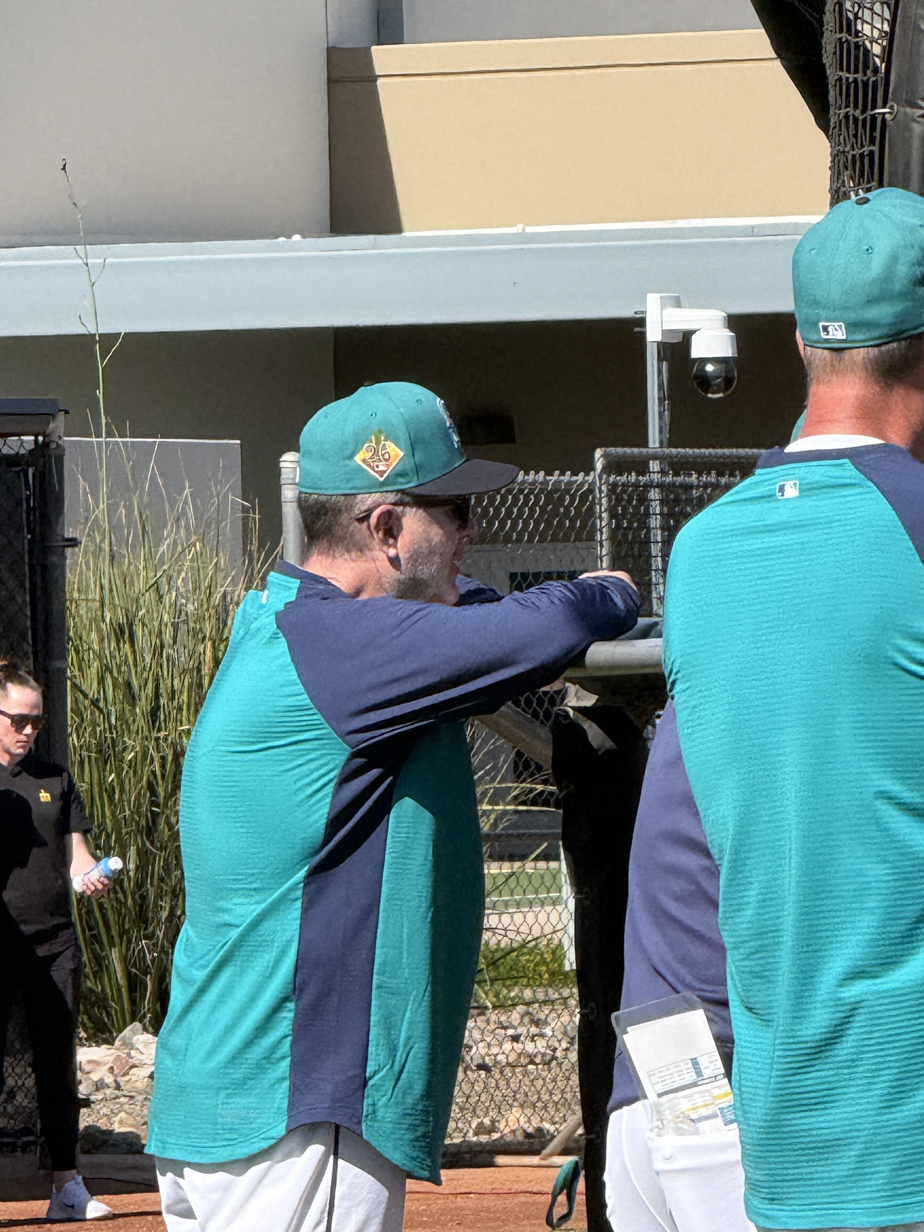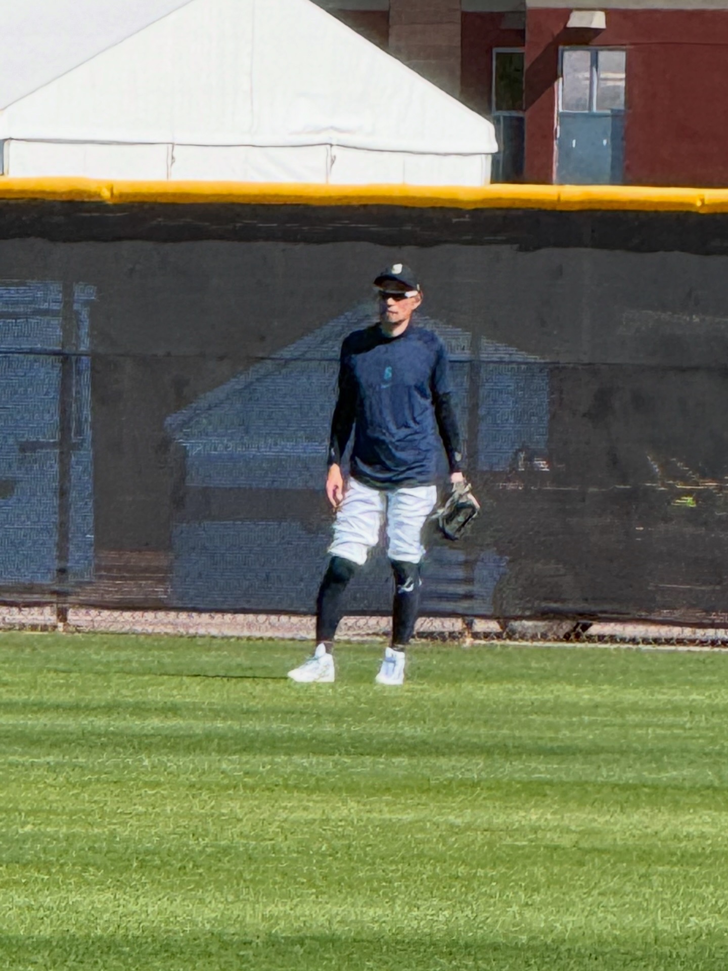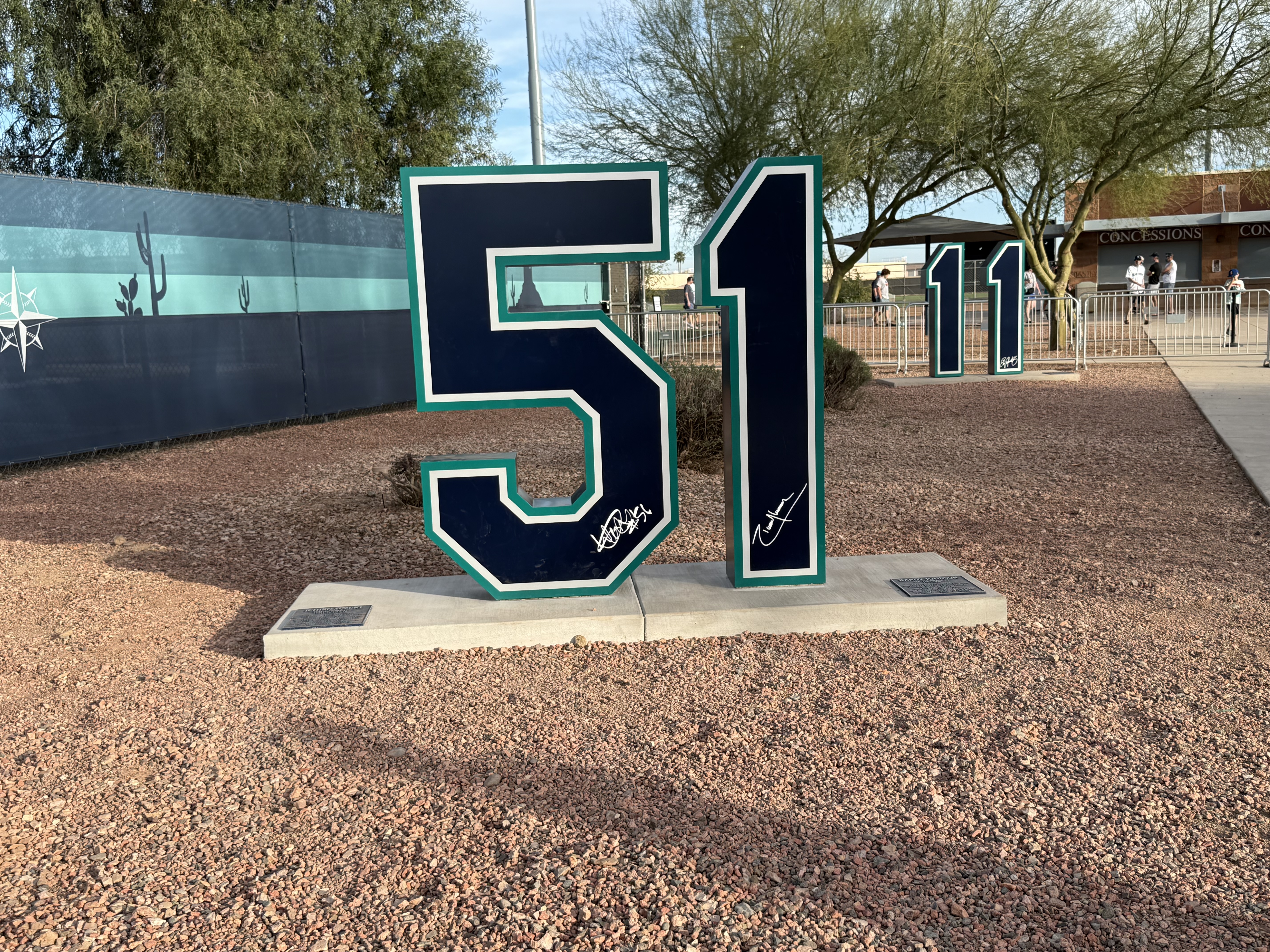 We had never been to spring training before, so we weren’t sure what to expect (that seems to be an ongoing theme with this trip!). We were grateful for the help and explanations other shared about where the players would be and when. We brought with us a variety of things we hoped to get autographed, including a collection of baseball cards and a hand-drawn picture of the Mariner Moose from our grandson, a hat and jersey from our son, our own jerseys, and a baseball. As players started filtering out of the clubhouse and onto the practice fields (there were four!), we soon realized that the autographs being given were almost exclusively to kids…which we are not! However, we did get to talk with Rick Rizzs, “the voice of the Mariners,” and a MiLB player, Victor something, who is currently assigned to play in Arkansas. Victor was very friendly and chatty; and who knows, maybe someday we will see him playing at T-Mobile! We saw a number of ‘big name’ players, like Julio Rodriquez, Luke Raley, Randy Arozarano, Victor Robles, Josh Naylor, JP Crawford, Logan Gilbert, and Andres Munoz. It was fun to see manager Dan Wilson participating in infield drills with the players, and to see Ichiro Suzuki shagging hits in right field during batting practice. And, it was great to see Edgar Martinez up close coaching the guys during BP, too.