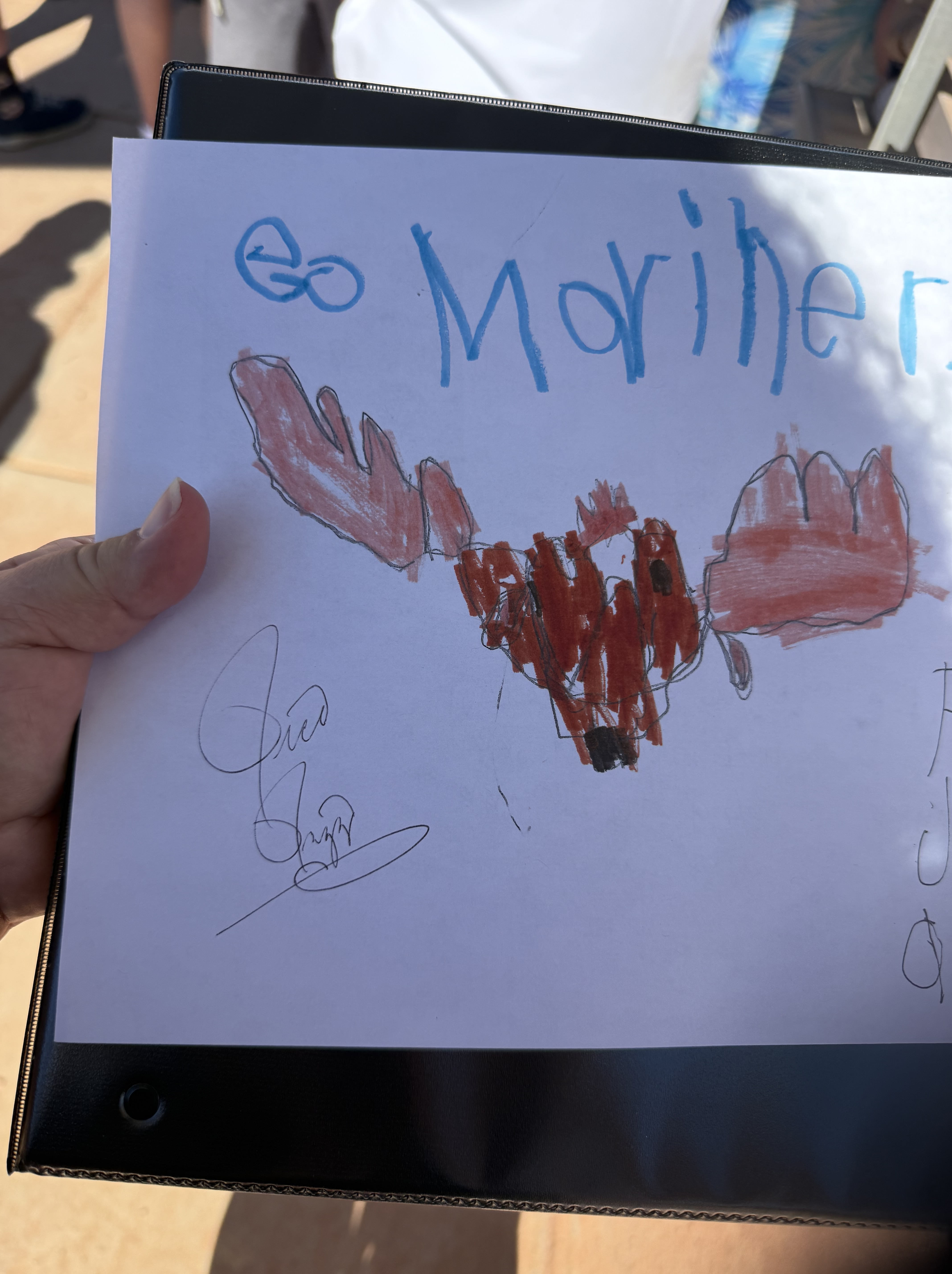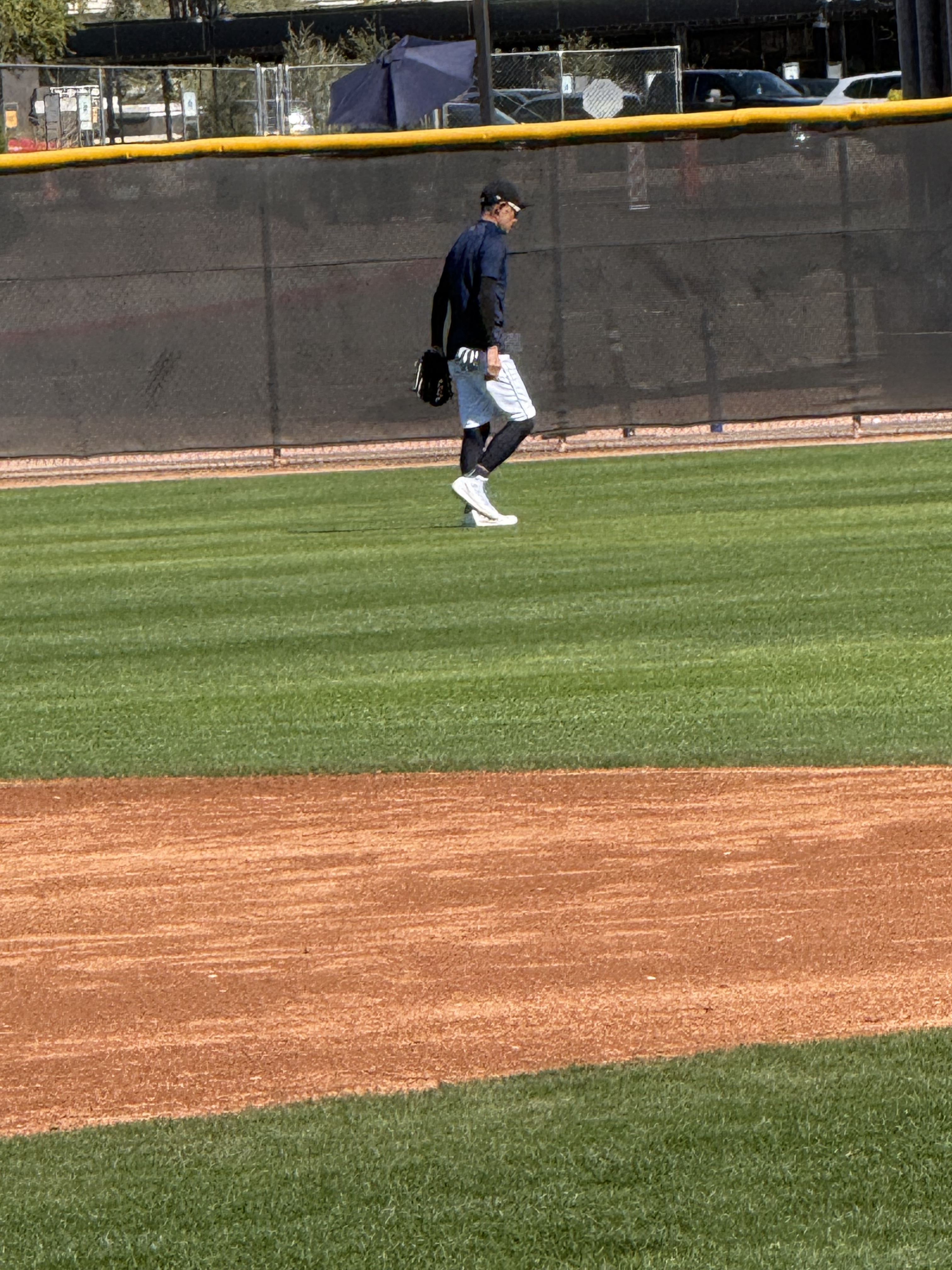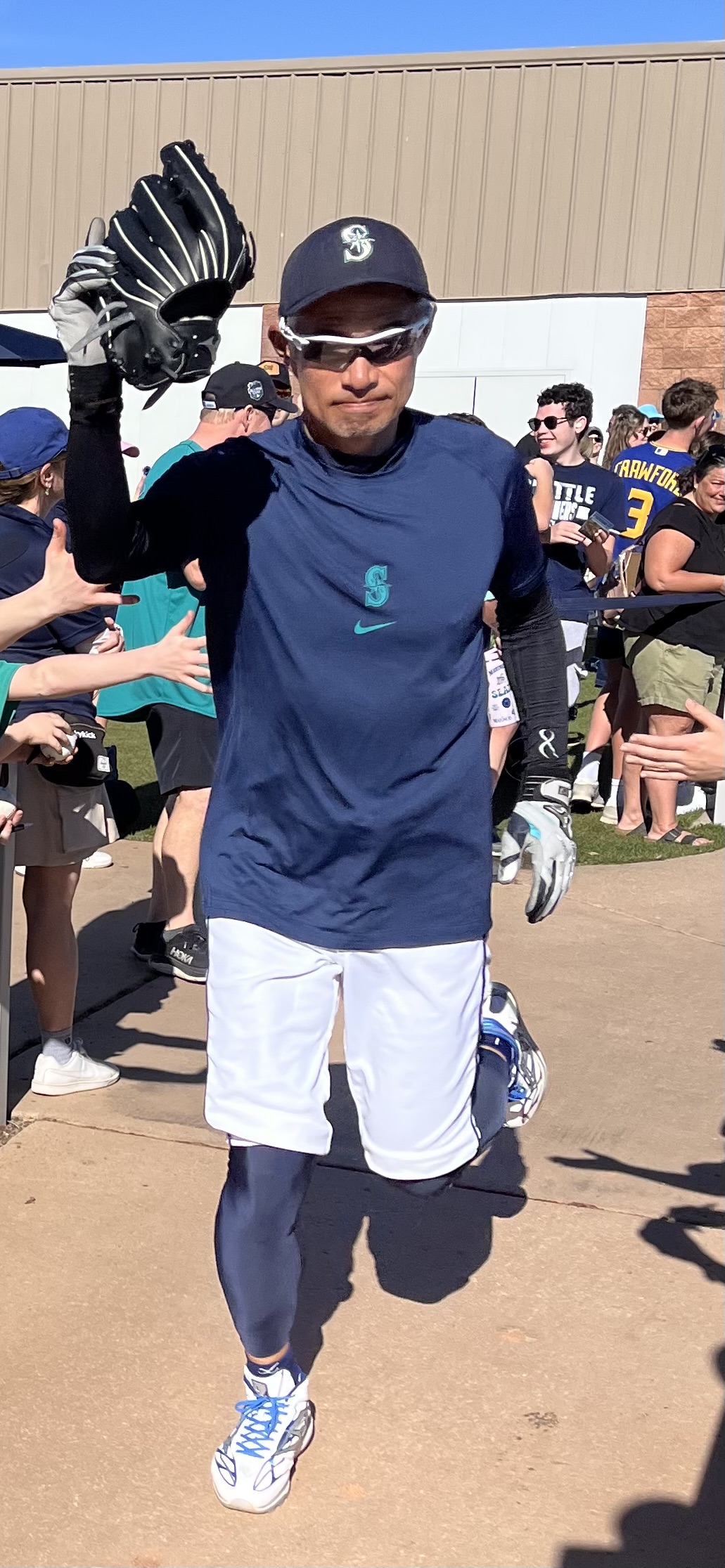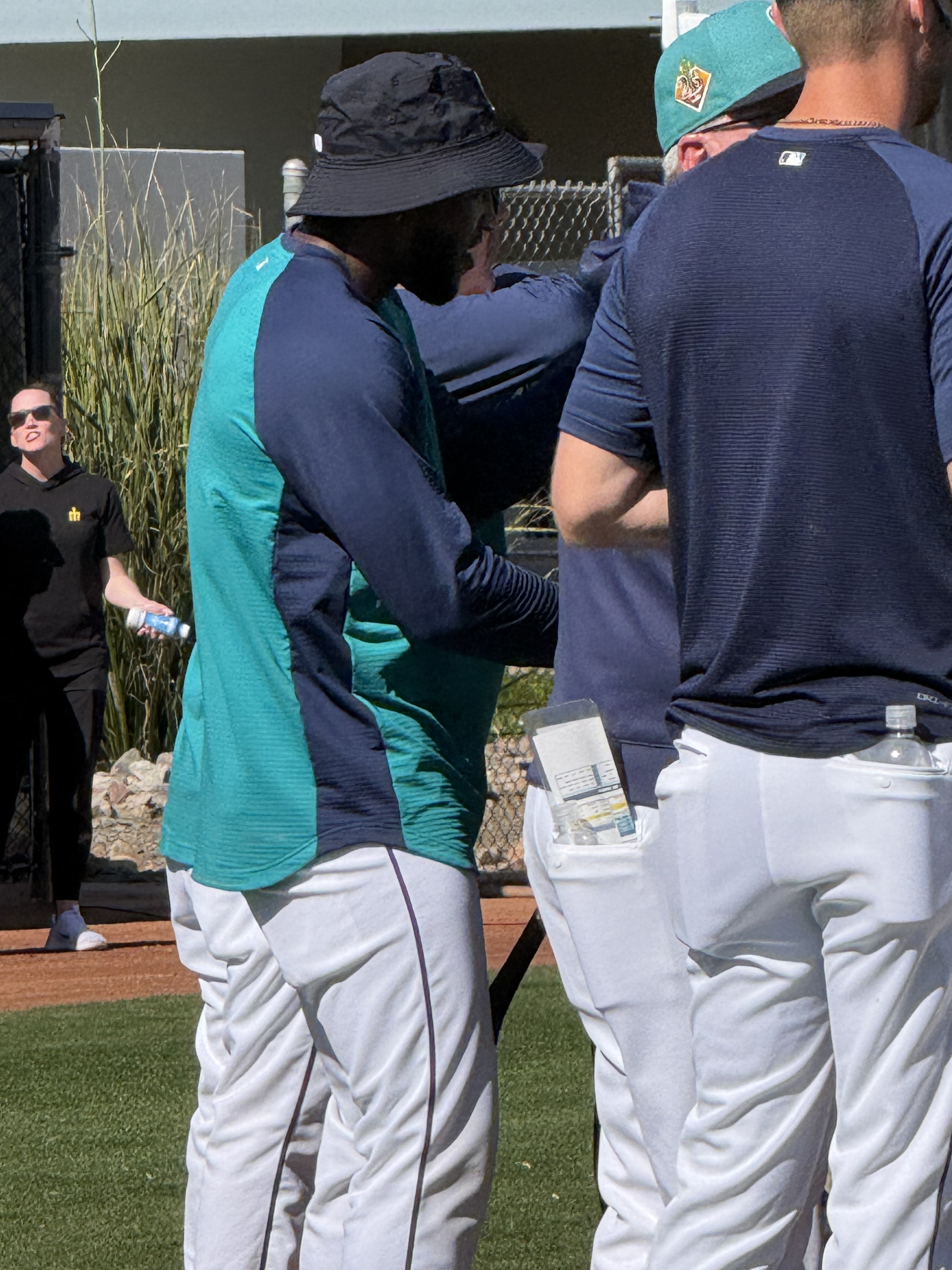 We had never been to spring training before, so we weren’t sure what to expect (that seems to be an ongoing theme with this trip!). We were grateful for the help and explanations other shared about where the players would be and when. We brought with us a variety of things we hoped to get autographed, including a collection of baseball cards and a hand-drawn picture of the Mariner Moose from our grandson, a hat and jersey from our son, our own jerseys, and a baseball. As players started filtering out of the clubhouse and onto the practice fields (there were four!), we soon realized that the autographs being given were almost exclusively to kids…which we are not! However, we did get to talk with Rick Rizzs, “the voice of the Mariners,” and a MiLB player, Victor something, who is currently assigned to play in Arkansas. Victor was very friendly and chatty; and who knows, maybe someday we will see him playing at T-Mobile! We saw a number of ‘big name’ players, like Julio Rodriquez, Luke Raley, Randy Arozarano, Victor Robles, Josh Naylor, JP Crawford, Logan Gilbert, and Andres Munoz. It was fun to see manager Dan Wilson participating in infield drills with the players, and to see Ichiro Suzuki shagging hits in right field during batting practice. And, it was great to see Edgar Martinez up close coaching the guys during BP, too.
