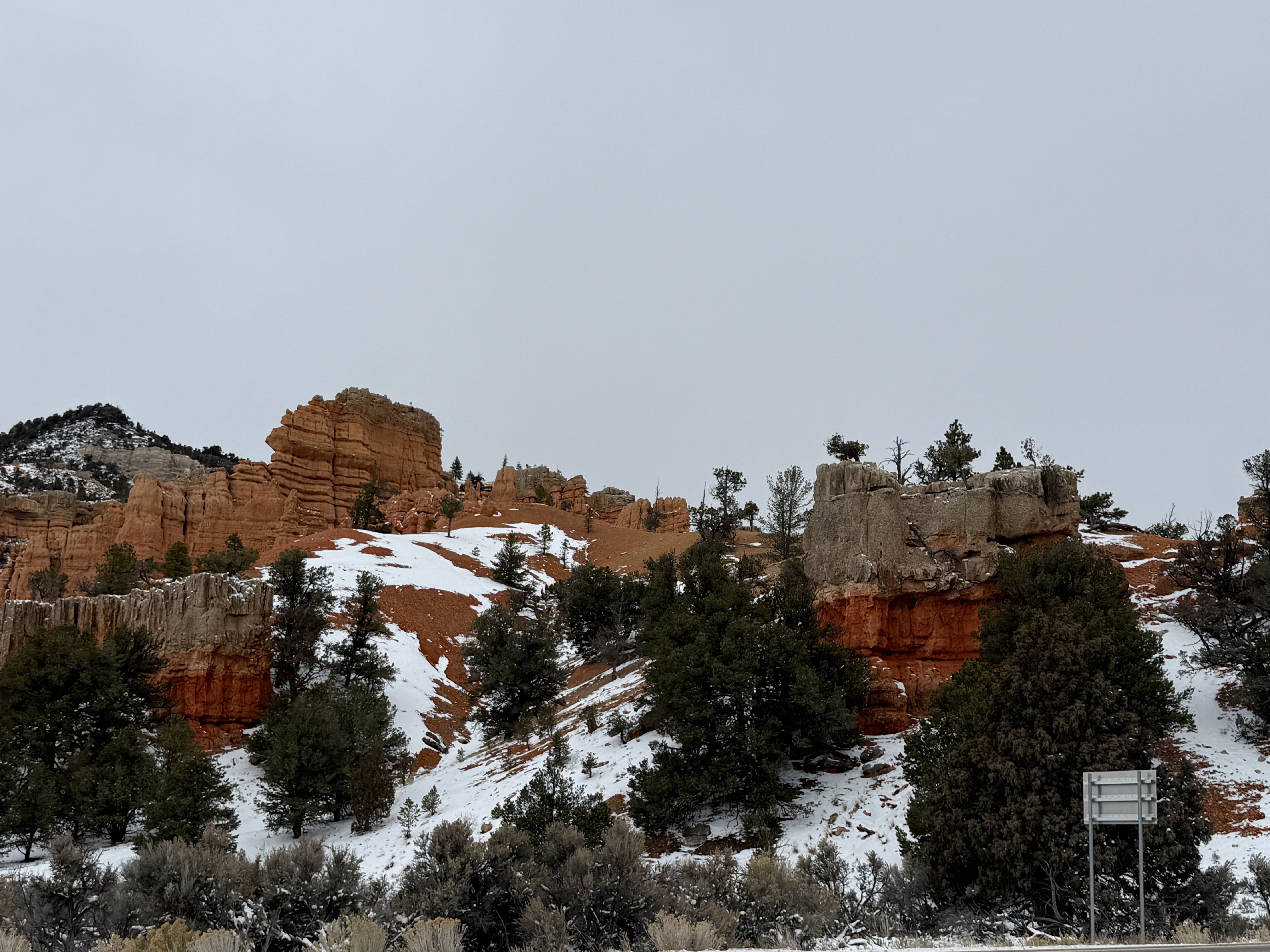 As we turned off the highway towards the Bryce Canyon City, we were soon greeted with some spectacular views of the plateaus and bluffs in the distance, in spit of the gray clouds. Our excitement continued to grow as we drove through Dixie National Forest and Red Canyon. Surely this was the inspiration for Big Thunder Mountain at Disneyland! Because it’s the off season, the visitor center at Red Canyon was not open.