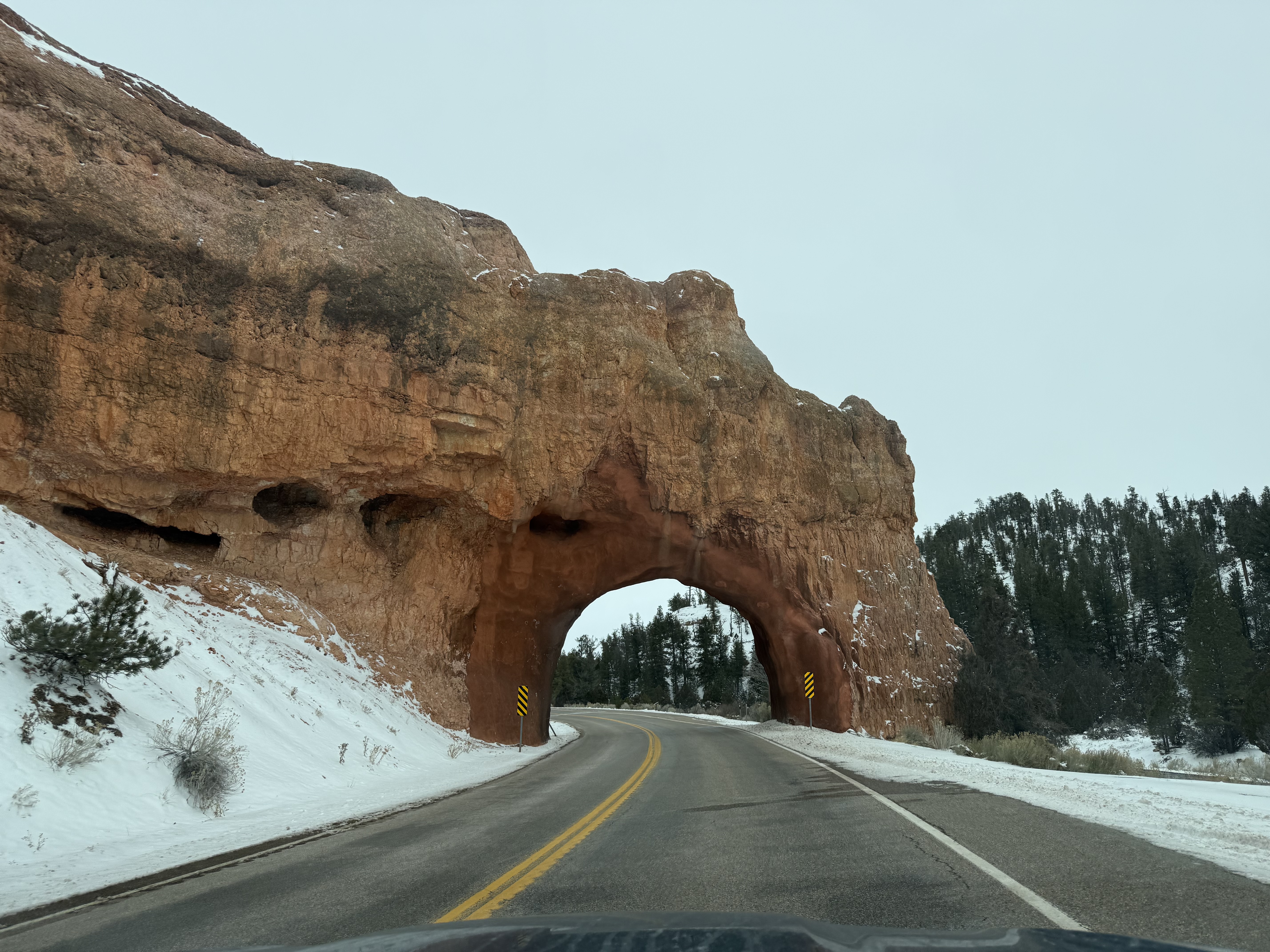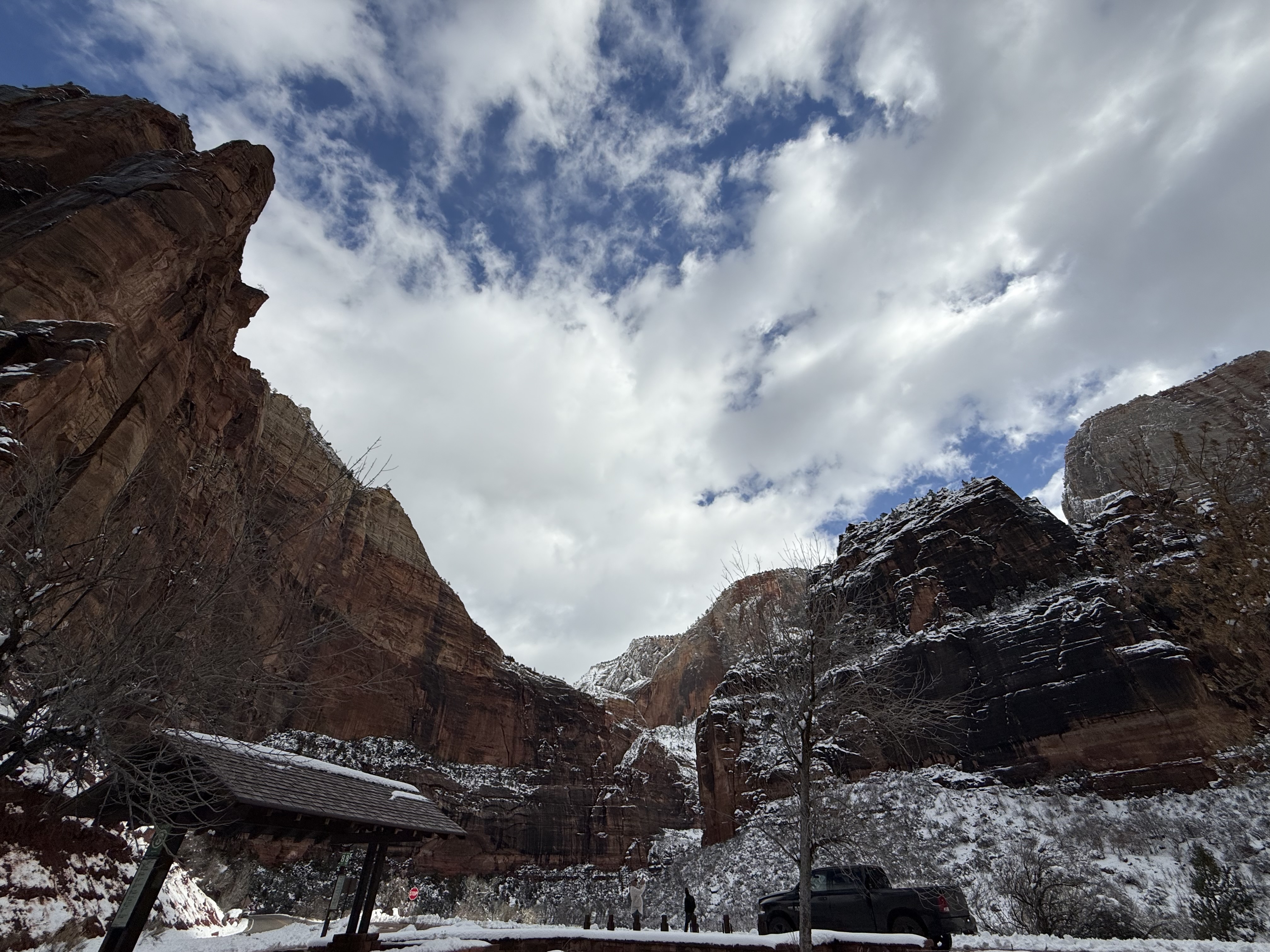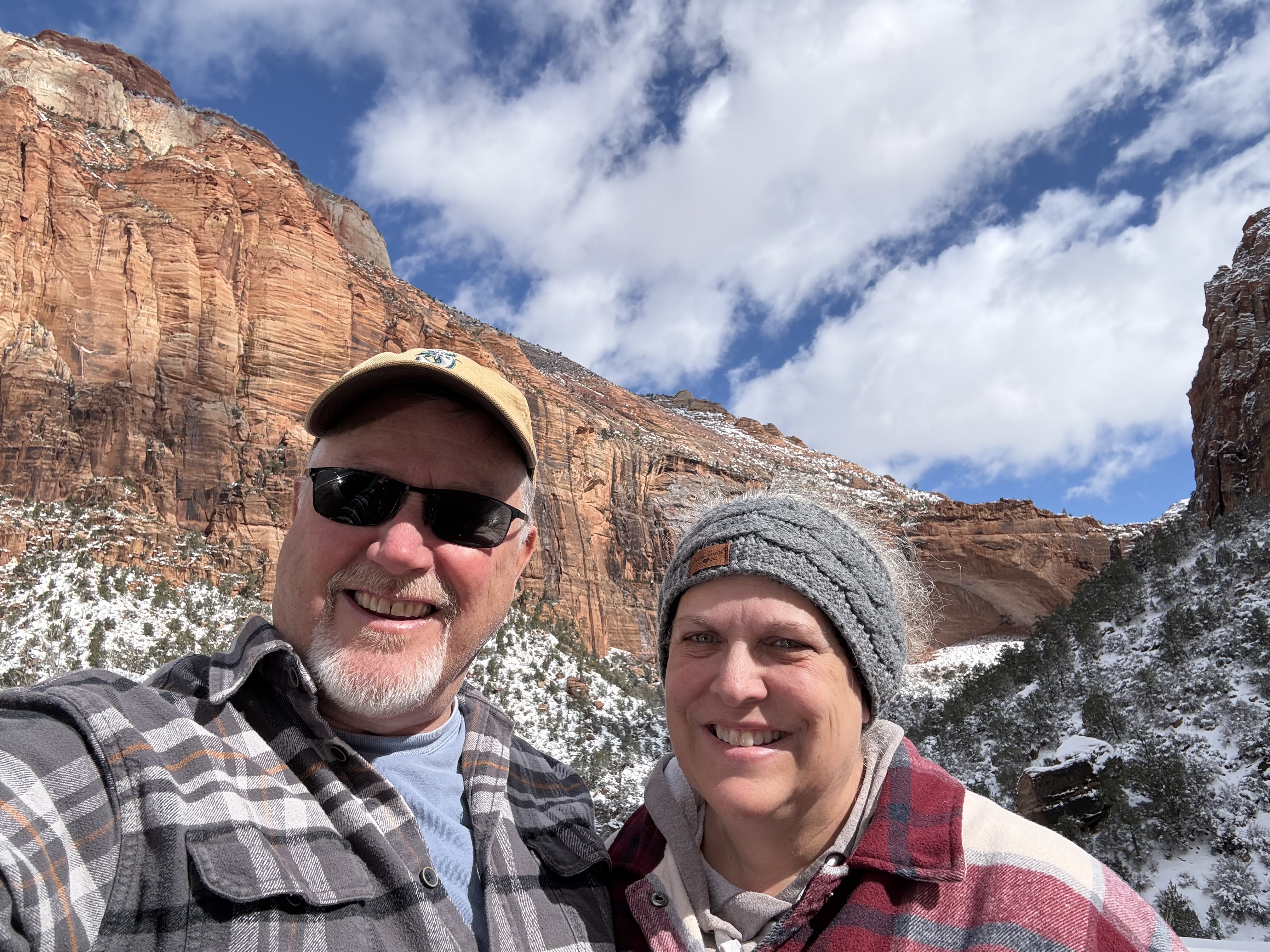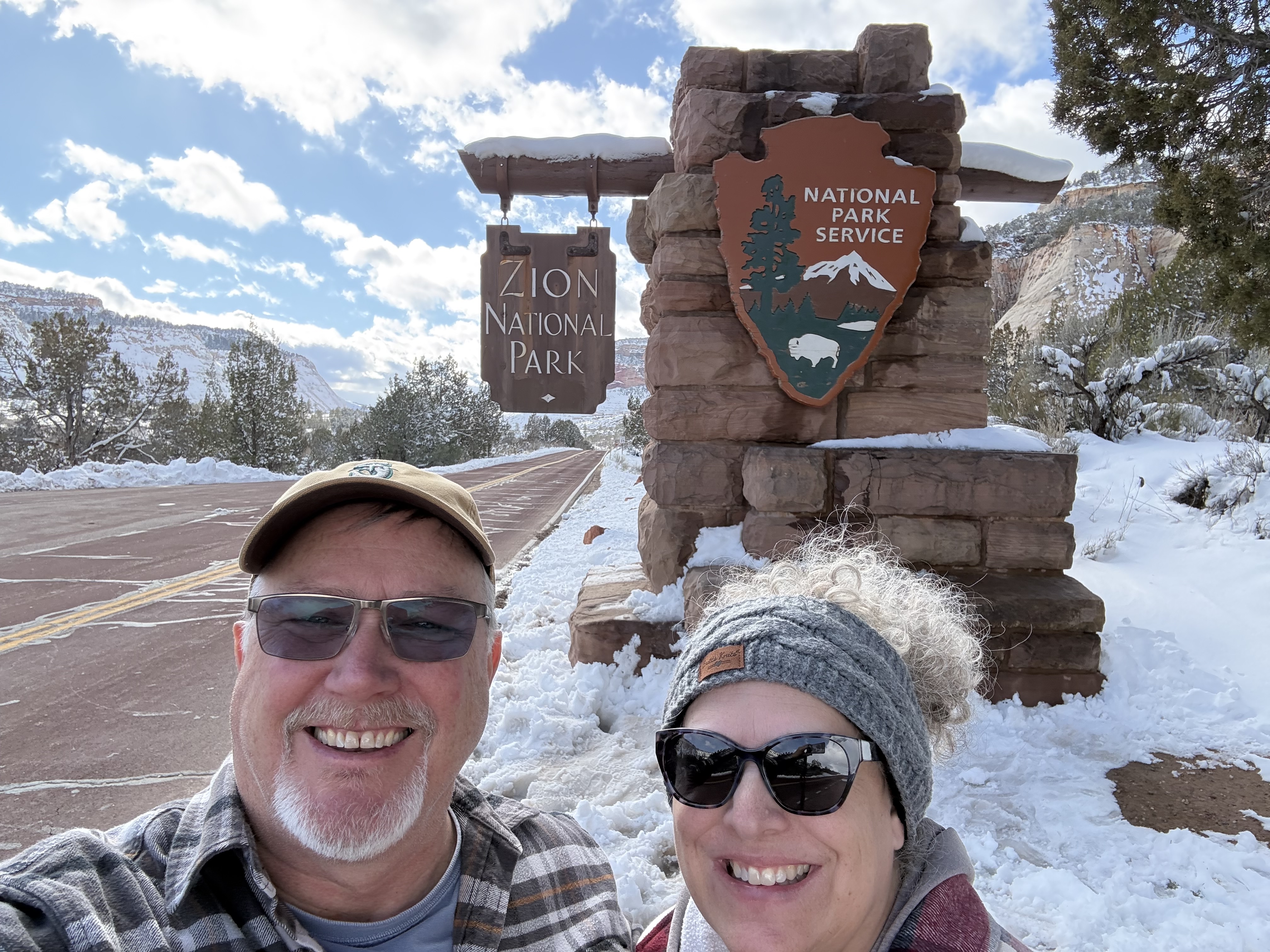The two hour, 83 mile drive to Zion National Park was easier than we anticipated with the highway being clear and bare of any snow or ice. When we were planning this trip, we were not sure we would make it to Zion, so I had not done any research on what to see or do. As we entered the park, we were once again amazed at the rock formations we encountered. They looked like melted (red) ice cream! And then, there was “the tunnel”…a 1.1 mile pitch-dark passage through a solid rock mountain, with intermittent air-vent “windows” that offered a glimpse of the canyon. As we passed by the first window, my thought was, “wait…what did I just see out there?” and I eagerly hoped there was another window. As we passed by the next window, I was ready and was left speechless by what I saw. We could not get out of the tunnel quick enough, and when we did, it was a view that made us realize why people rave about this park. The massive sheer red rock cliffs dwarfed the cars weaving around the curves of the two lane road. We made several stops to take in the sights, each being more impressive than the last. We took the Zion Canyon Scenic Drive and stopped at the nine viewpoints along the way. We made a quick stop at the visitor center for more postcards and a stamp in our National Park Passport. After a quick run through the little town nearby looking for a place to eat lunch, we decided to turn around and just have some cheese and crackers from the cooler while enjoying a view in the park. Given that we had a two hour drive facing us and there was some light snow beginning to fall, we decided to head back towards Bryce.