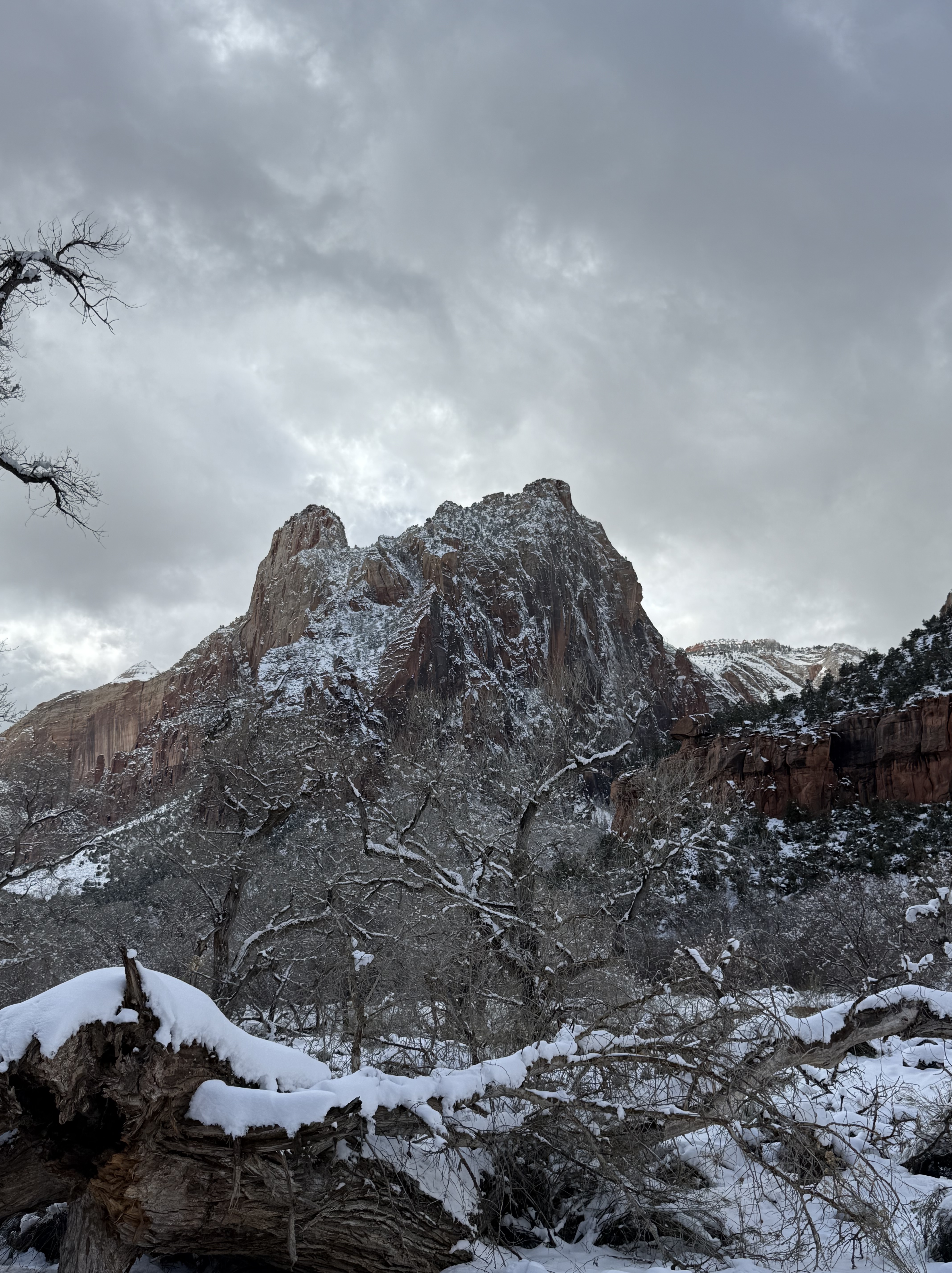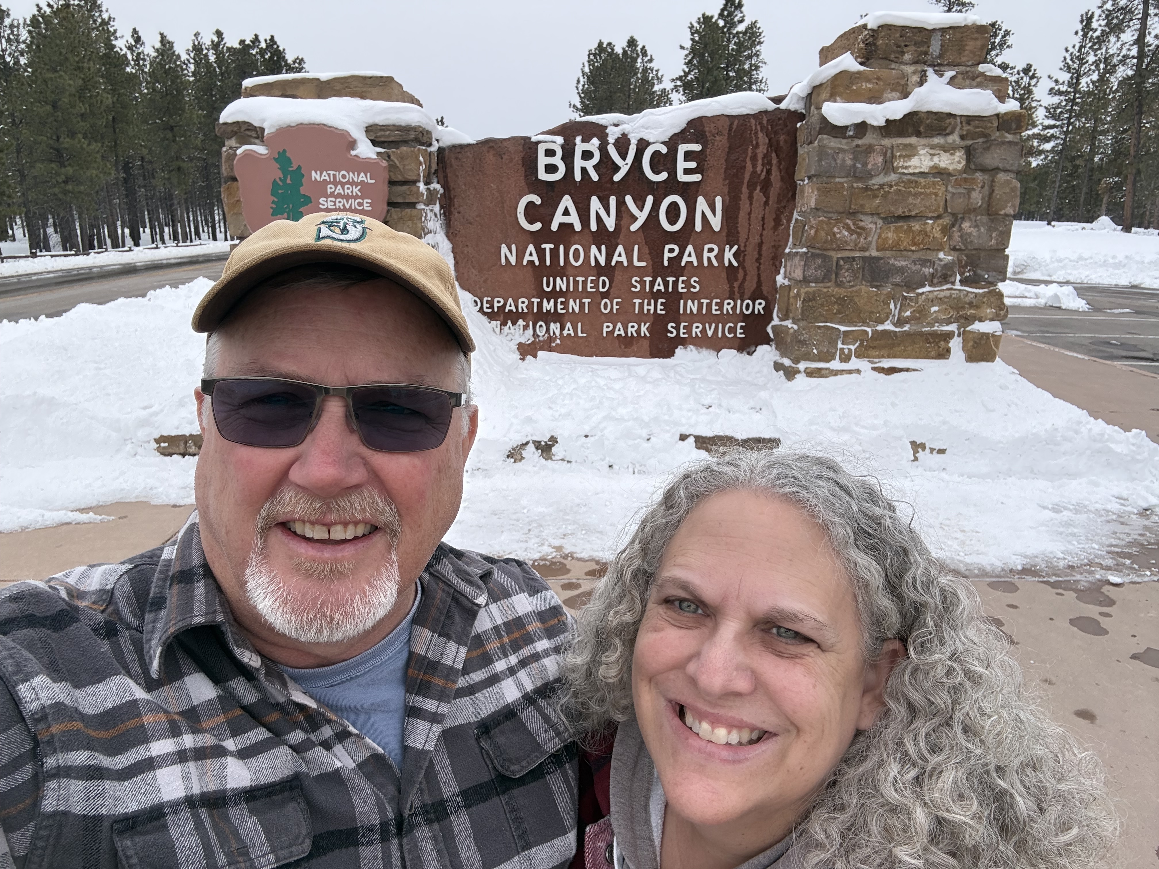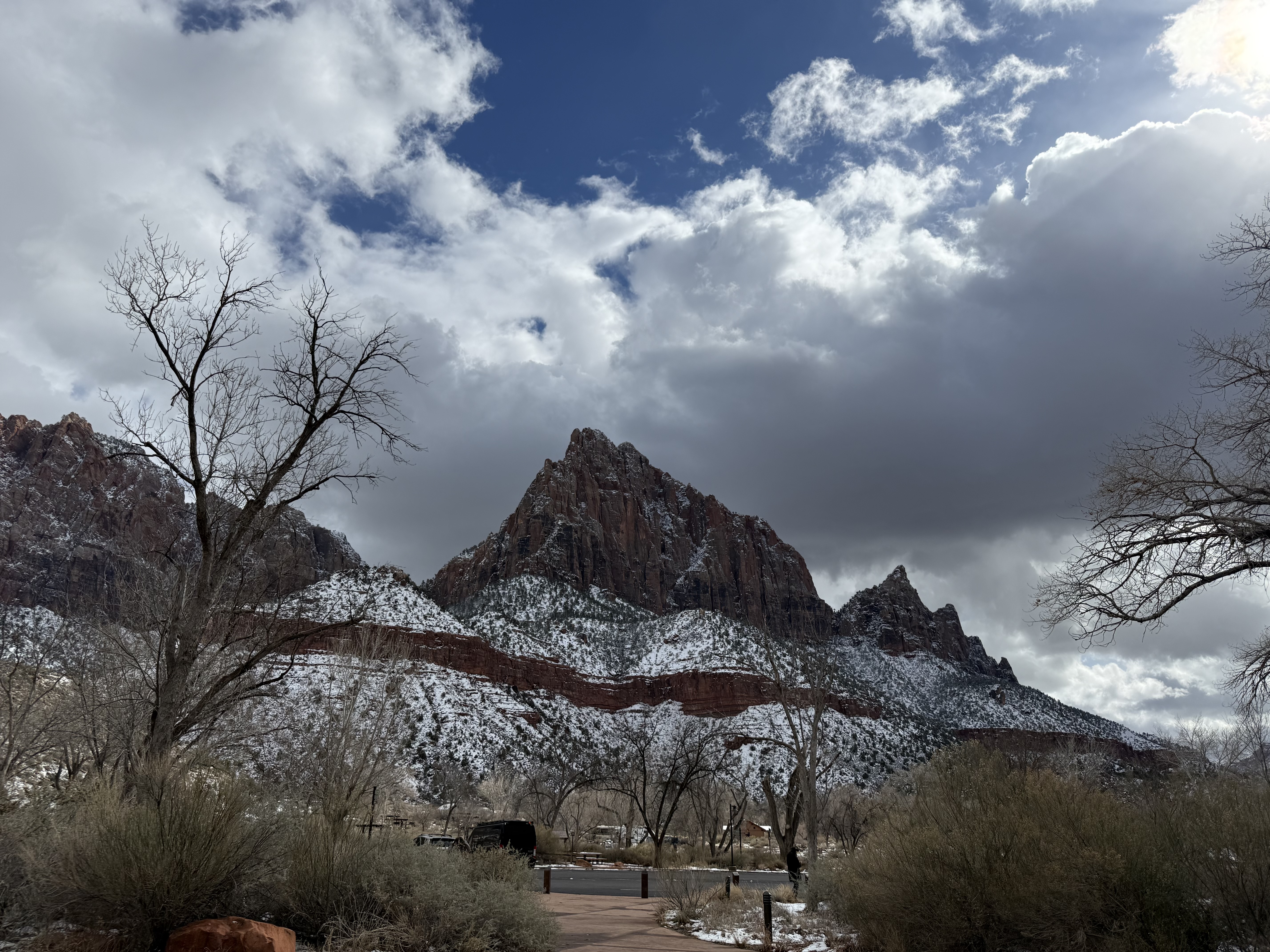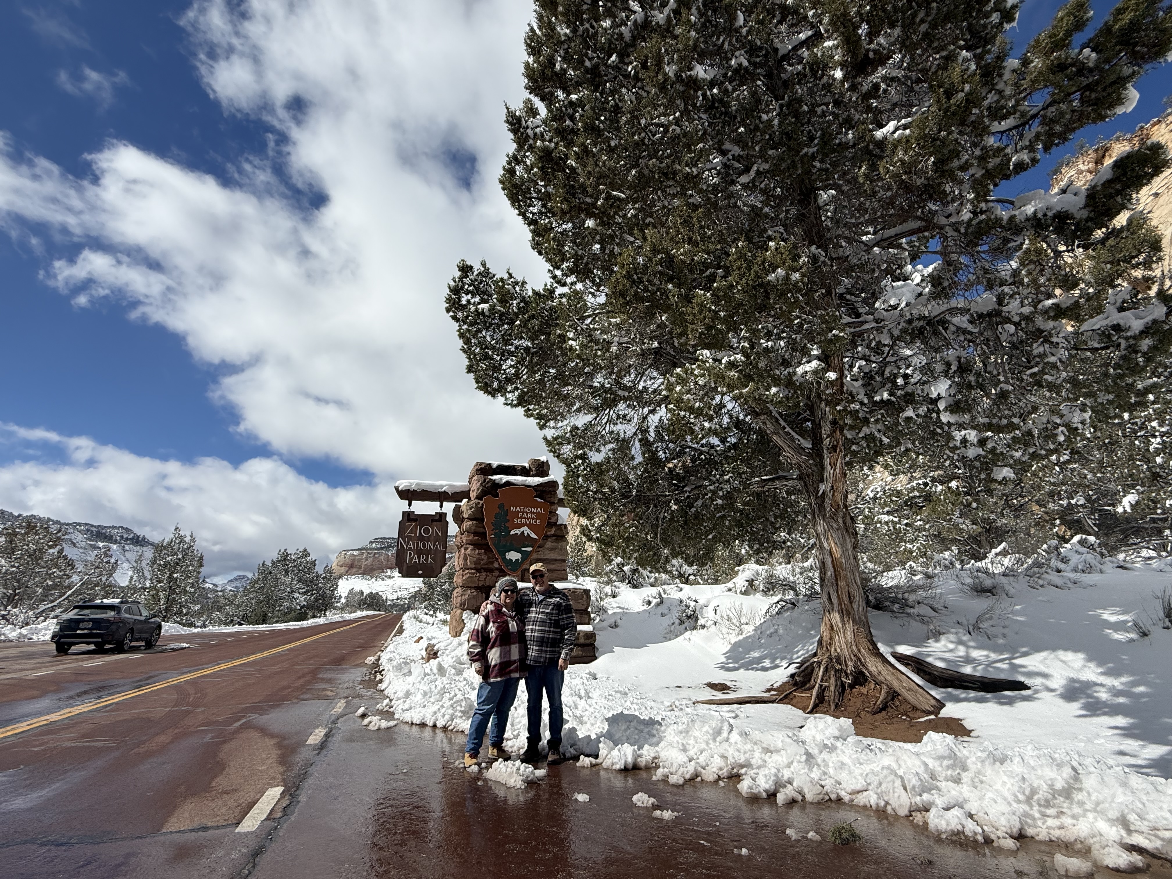 The two hour, 83 mile drive to Zion National Park was easier than we anticipated with the highway being clear and bare of any snow or ice. When we were planning this trip, we were not sure we would make it to Zion, so I had not done any research on what to see or do. As we entered the park, we were once again amazed at the rock formations we encountered. They looked like melted (red) ice cream! And then, there was “the tunnel”…a 1.1 mile pitch-dark passage through a solid rock mountain, with intermittent air-vent “windows” that offered a glimpse of the canyon. As we passed by the first window, my thought was, “wait…what did I just see out there?” and I eagerly hoped there was another window. As we passed by the next window, I was ready and was left speechless by what I saw. We could not get out of the tunnel quick enough, and when we did, it was a view that made us realize why people rave about this park. The massive sheer red rock cliffs dwarfed the cars weaving around the curves of the two lane road. We made several stops to take in the sights, each being more impressive than the last. We took the Zion Canyon Scenic Drive and stopped at the nine viewpoints along the way. We made a quick stop at the visitor center for more postcards and a stamp in our National Park Passport. After a quick run through the little town nearby looking for a place to eat lunch, we decided to turn around and just have some cheese and crackers from the cooler while enjoying a view in the park. Given that we had a two hour drive facing us and there was some light snow beginning to fall, we decided to head back towards Bryce.
