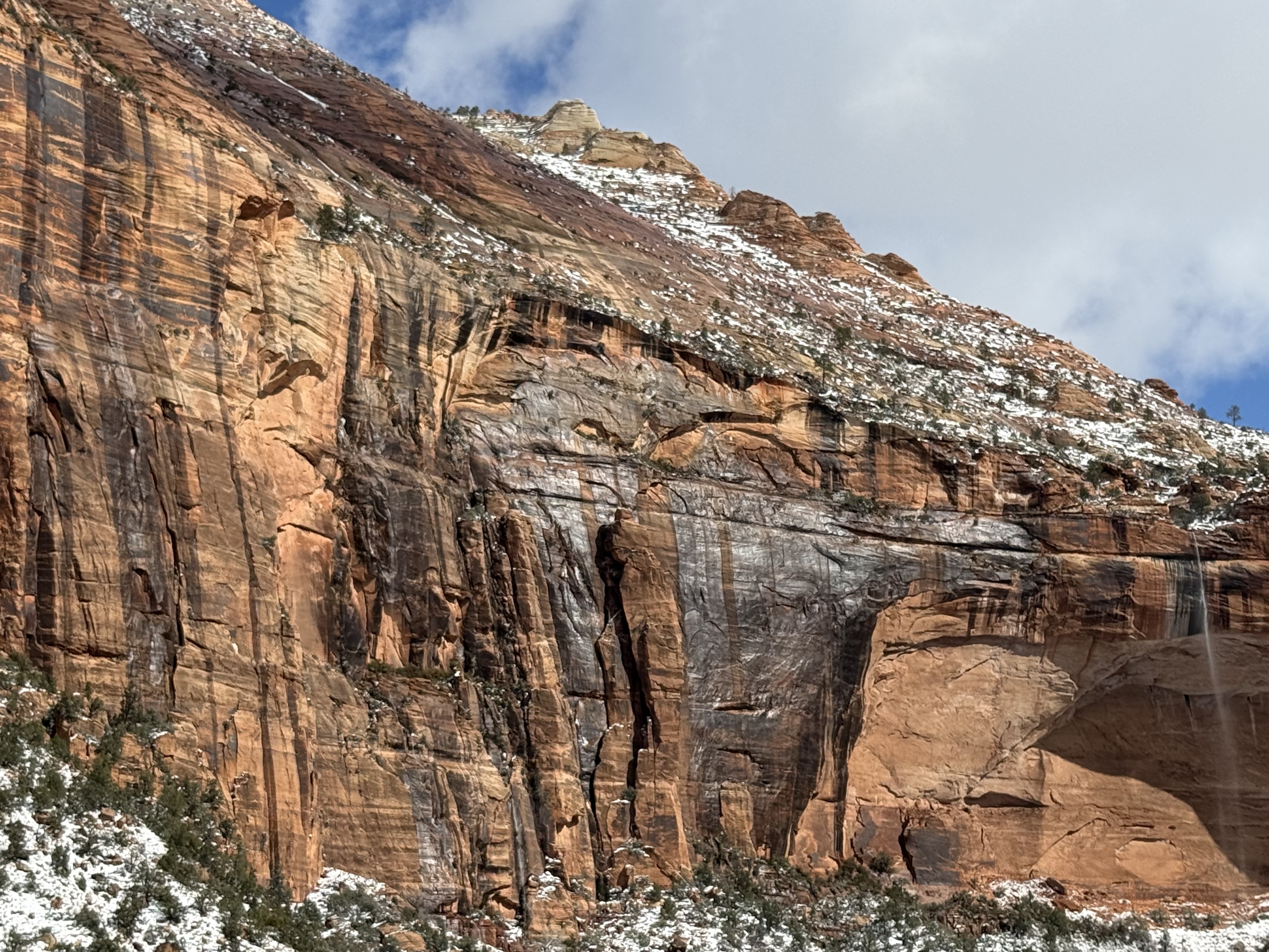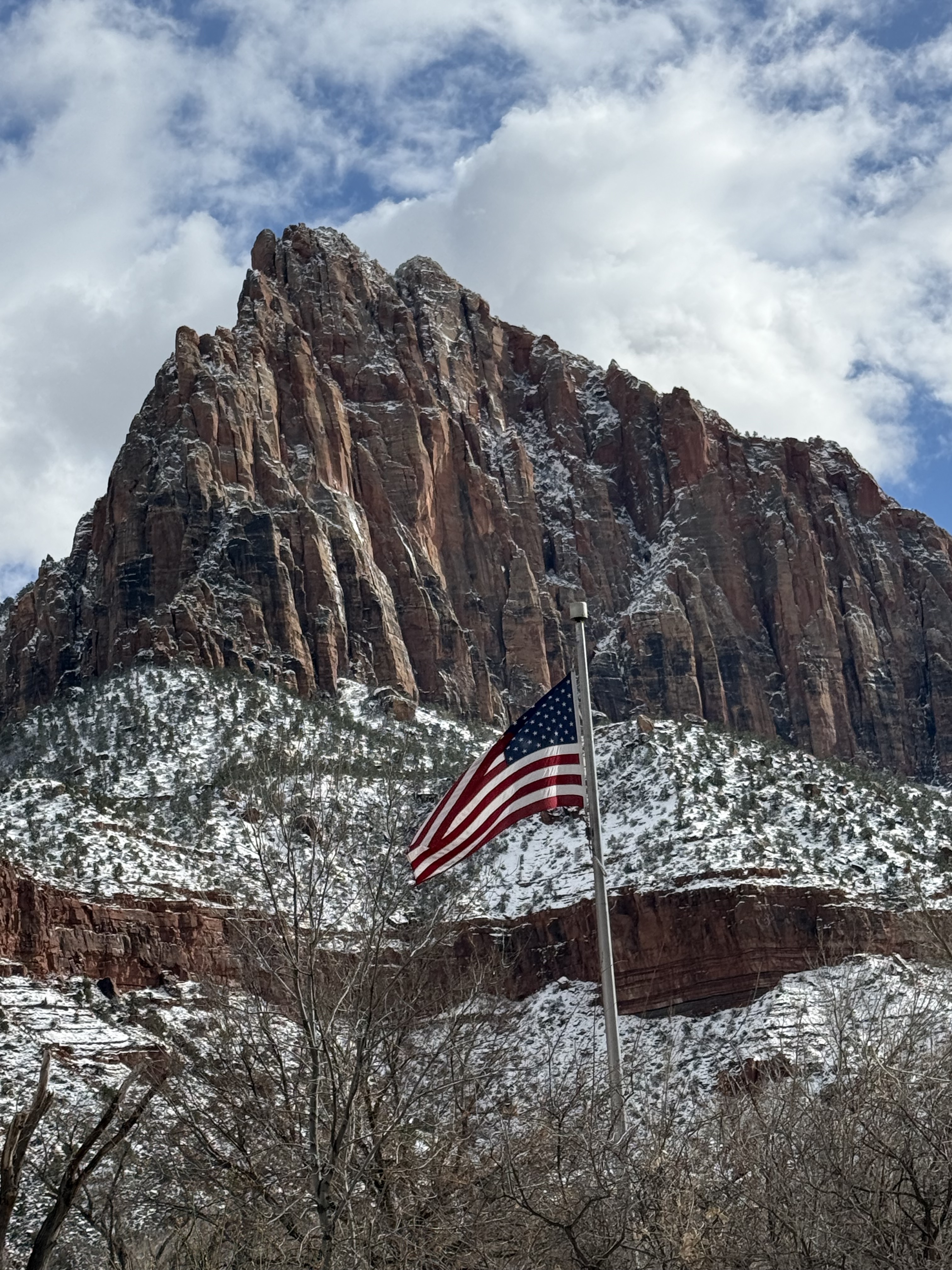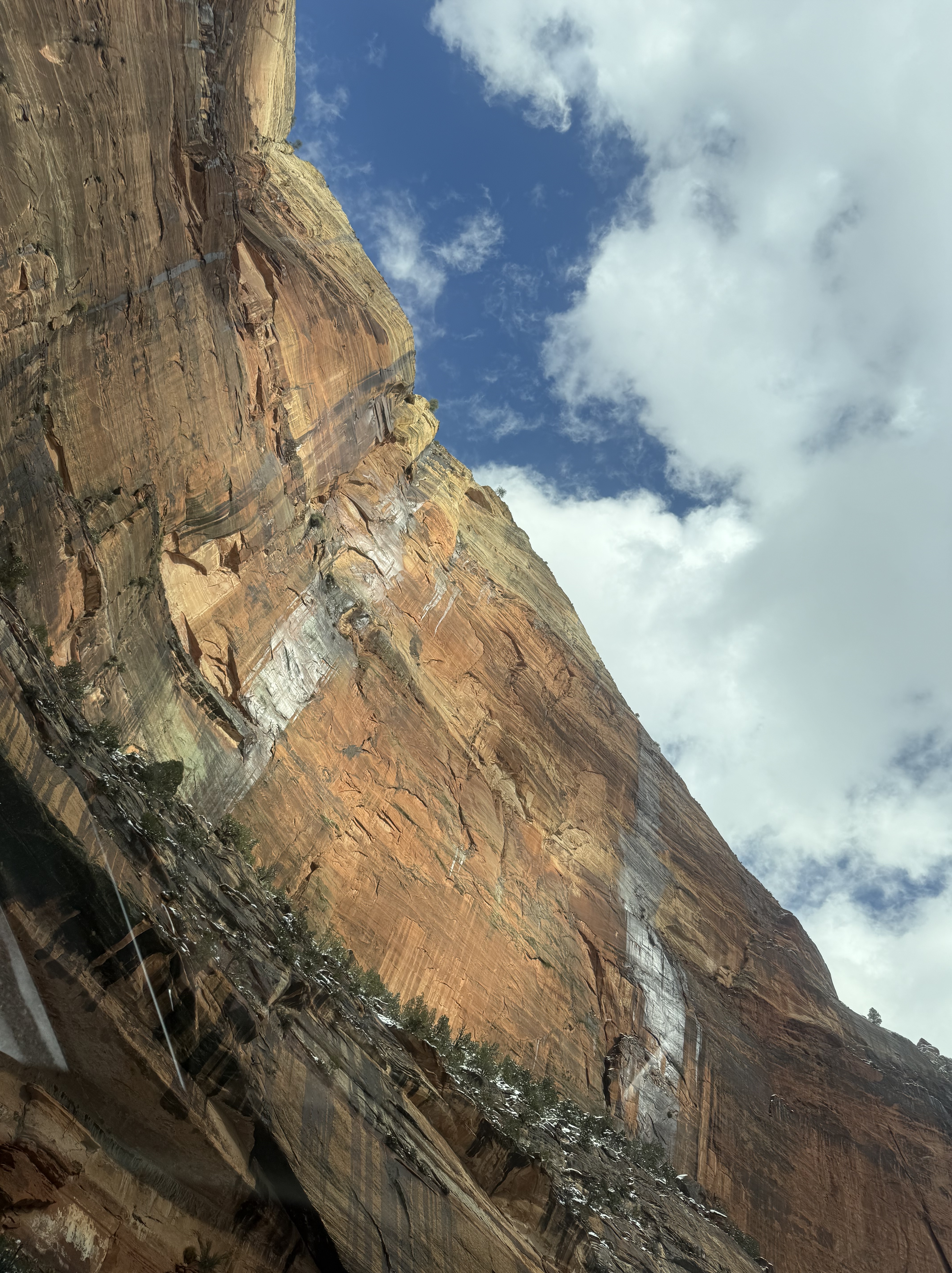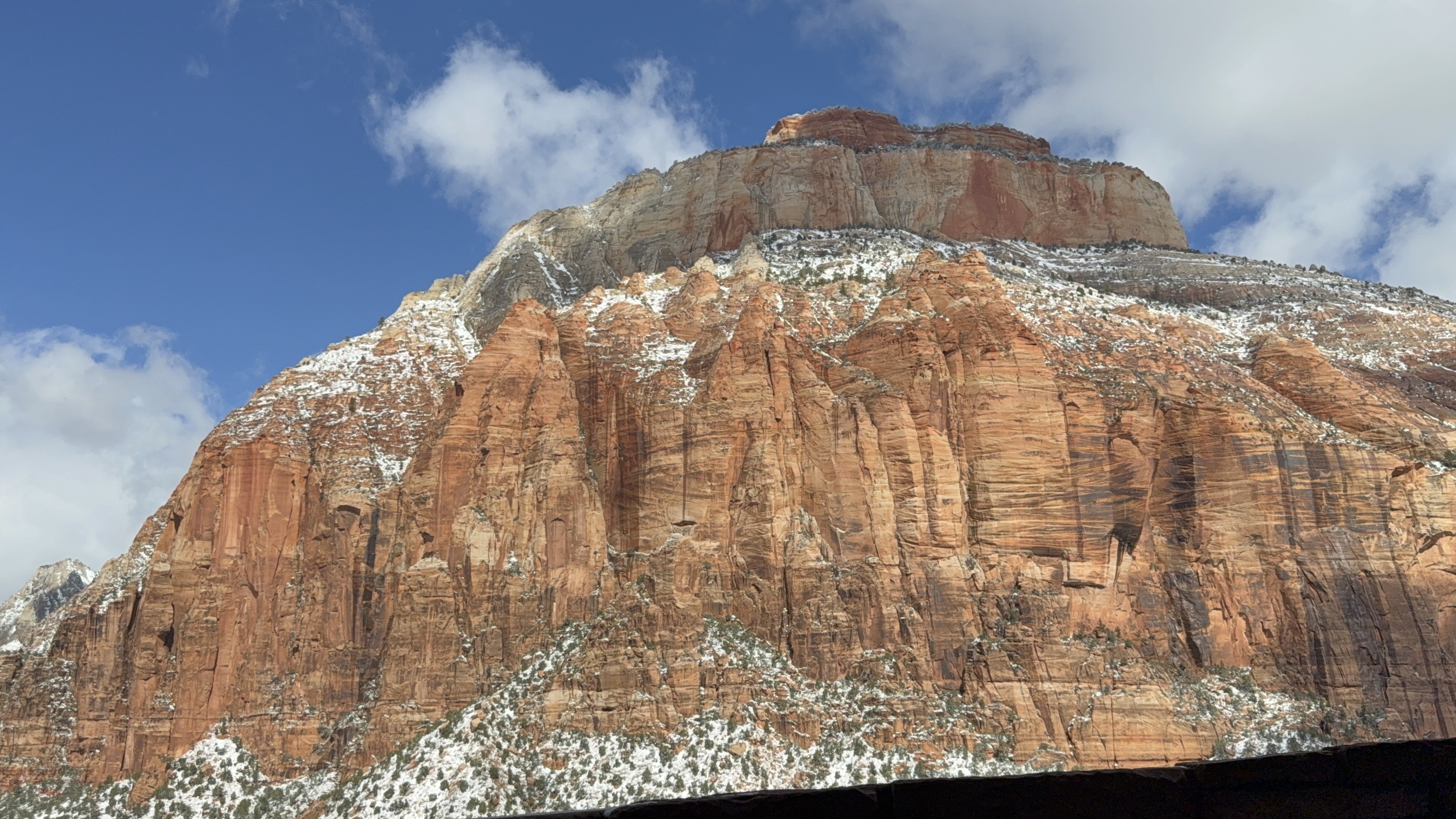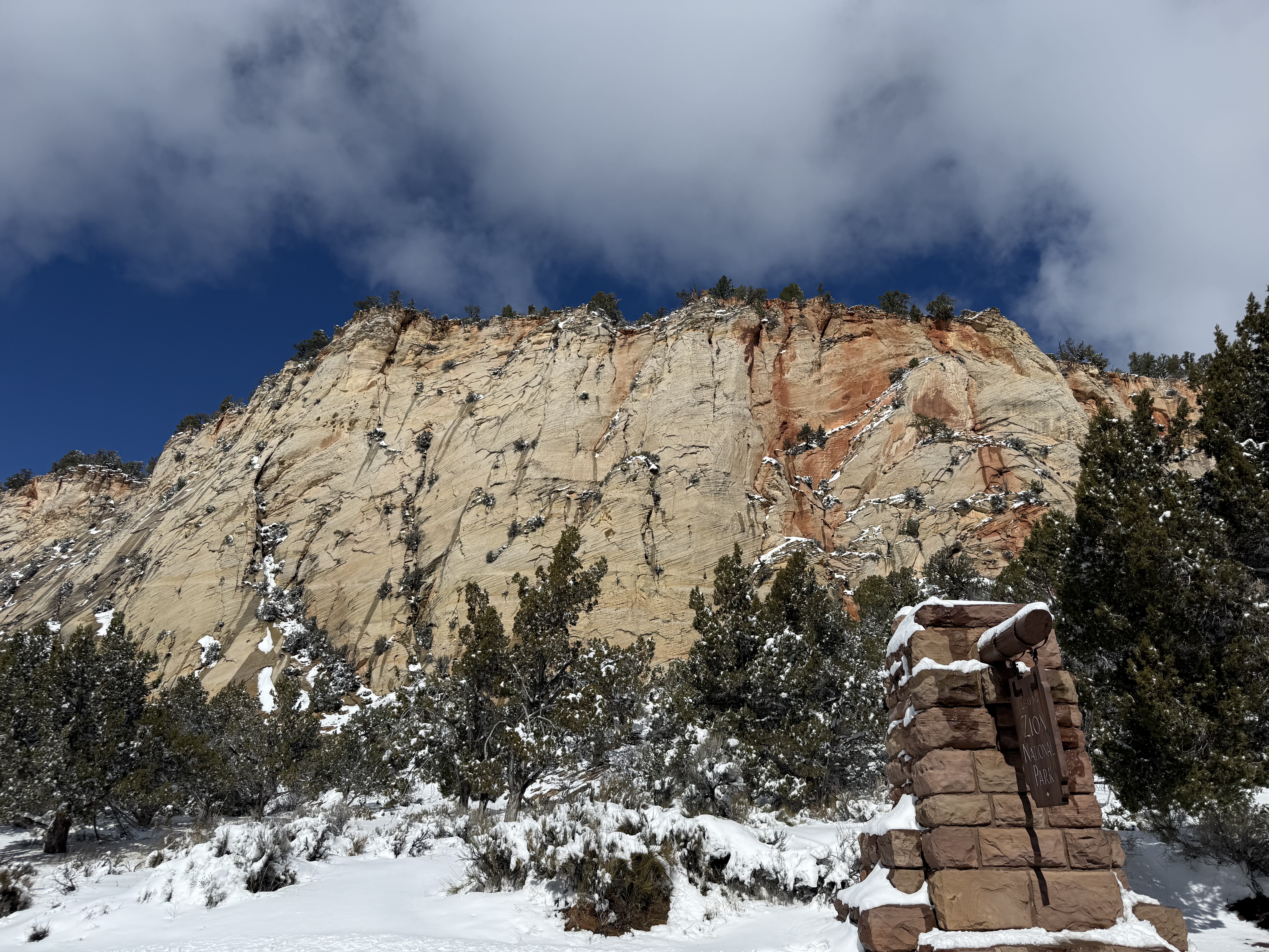 The two hour, 83 mile drive to Zion National Park was easier than we anticipated with the highway being clear and bare of any snow or ice. When we were planning this trip, we were not sure we would make it to Zion, so I had not done any research on what to see or do. As we entered the park, we were once again amazed at the rock formations we encountered. They looked like melted (red) ice cream! And then, there was “the tunnel”…a 1.1 mile pitch-dark passage through a solid rock mountain, with intermittent air-vent “windows” that offered a glimpse of the canyon. As we passed by the first window, my thought was, “wait…what did I just see out there?” and I eagerly hoped there was another window. As we passed by the next window, I was ready and was left speechless by what I saw. We could not get out of the tunnel quick enough, and when we did, it was a view that made us realize why people rave about this park. The massive sheer red rock cliffs dwarfed the cars weaving around the curves of the two lane road. We made several stops to take in the sights, each being more impressive than the last. We took the Zion Canyon Scenic Drive and stopped at the nine viewpoints along the way. We made a quick stop at the visitor center for more postcards and a stamp in our National Park Passport. After a quick run through the little town nearby looking for a place to eat lunch, we decided to turn around and just have some cheese and crackers from the cooler while enjoying a view in the park. Given that we had a two hour drive facing us and there was some light snow beginning to fall, we decided to head back towards Bryce.