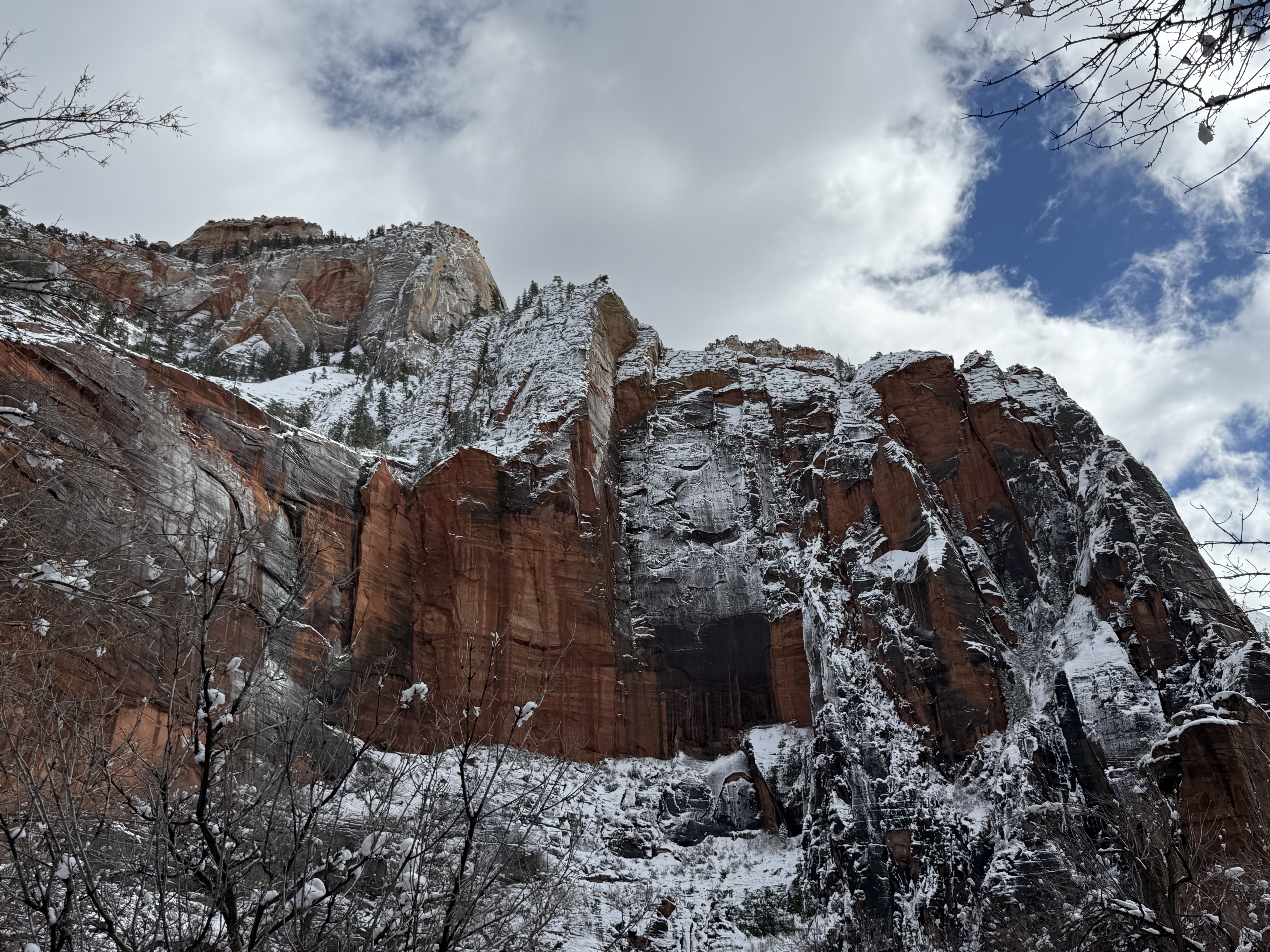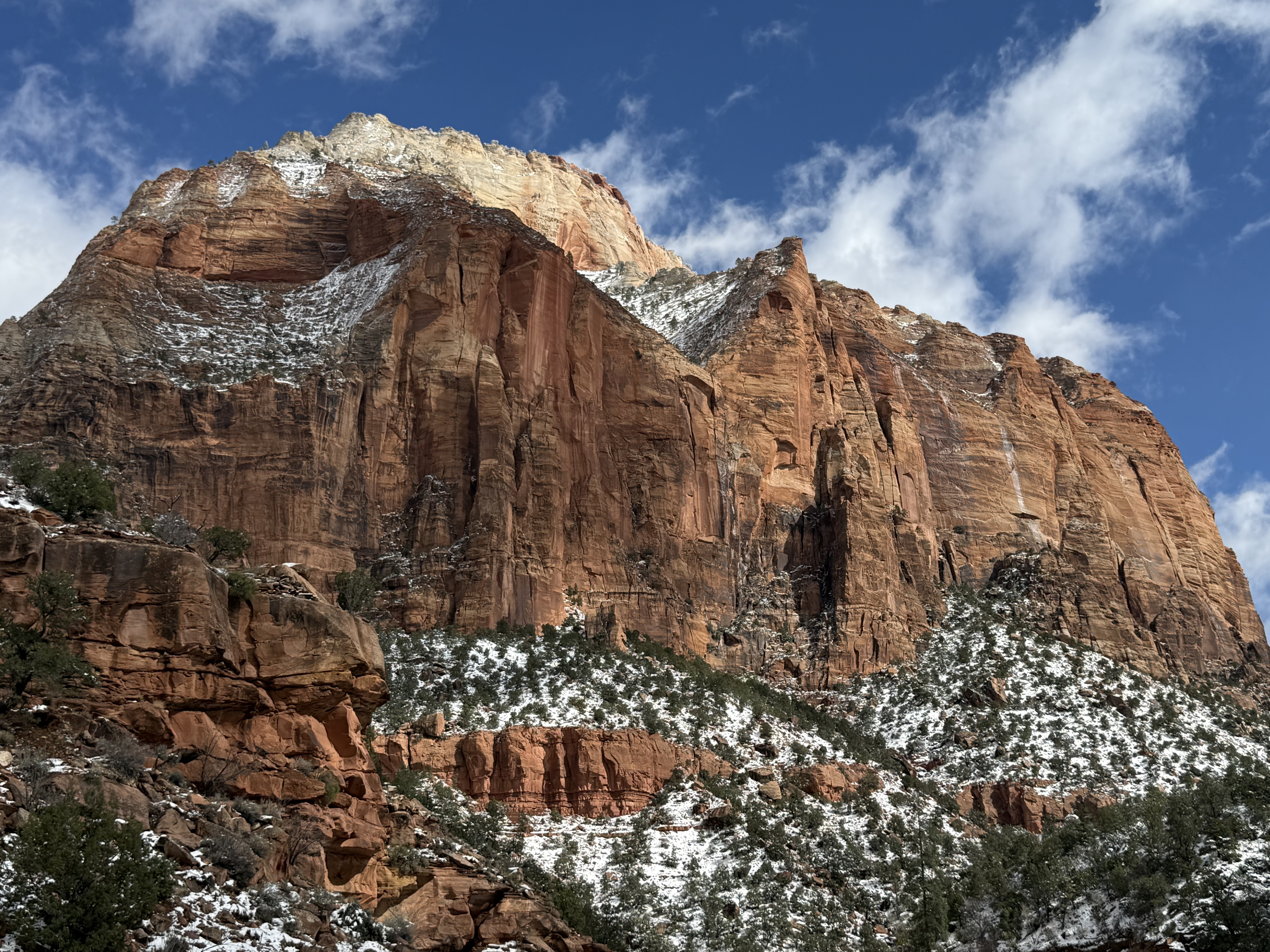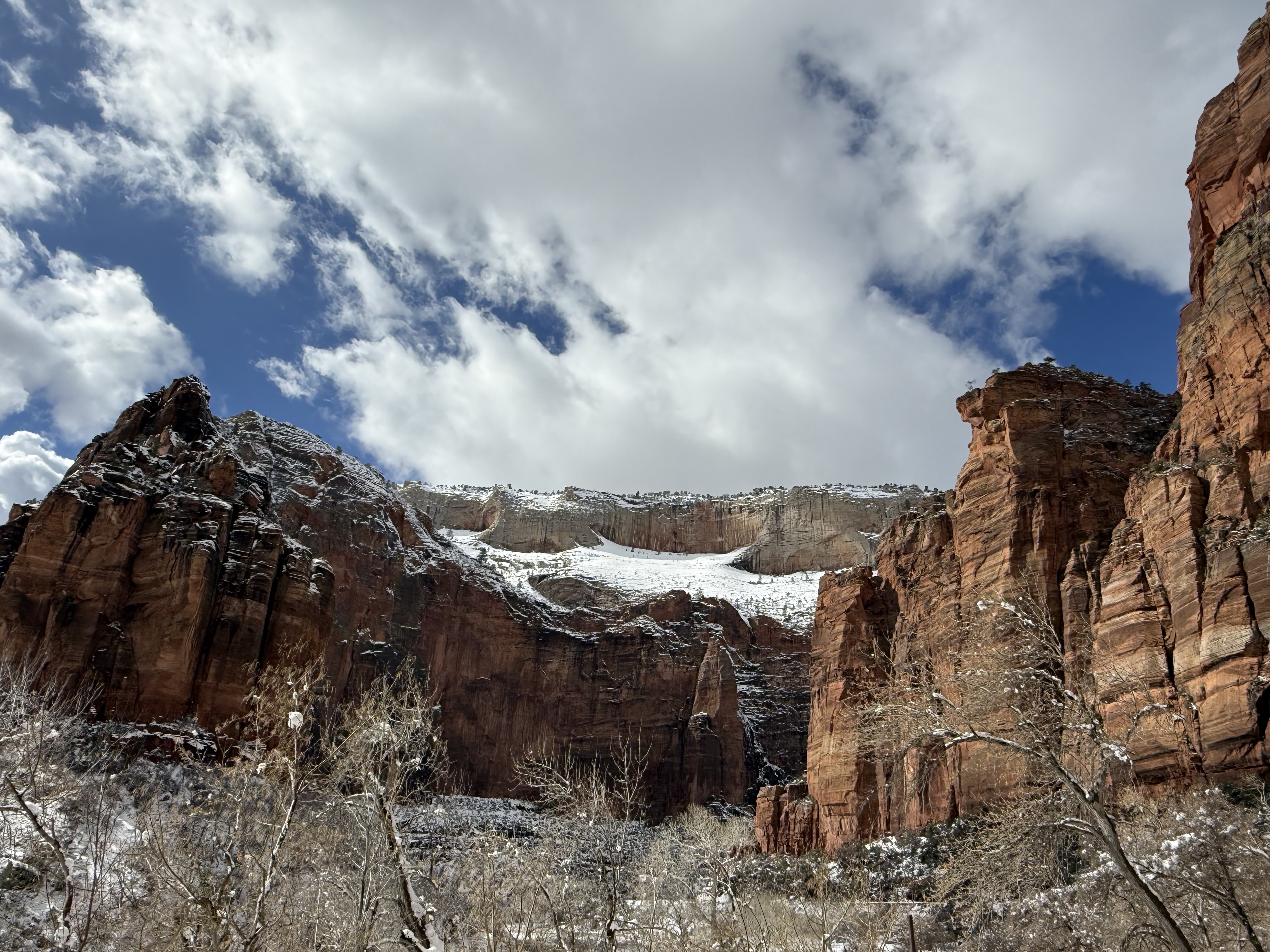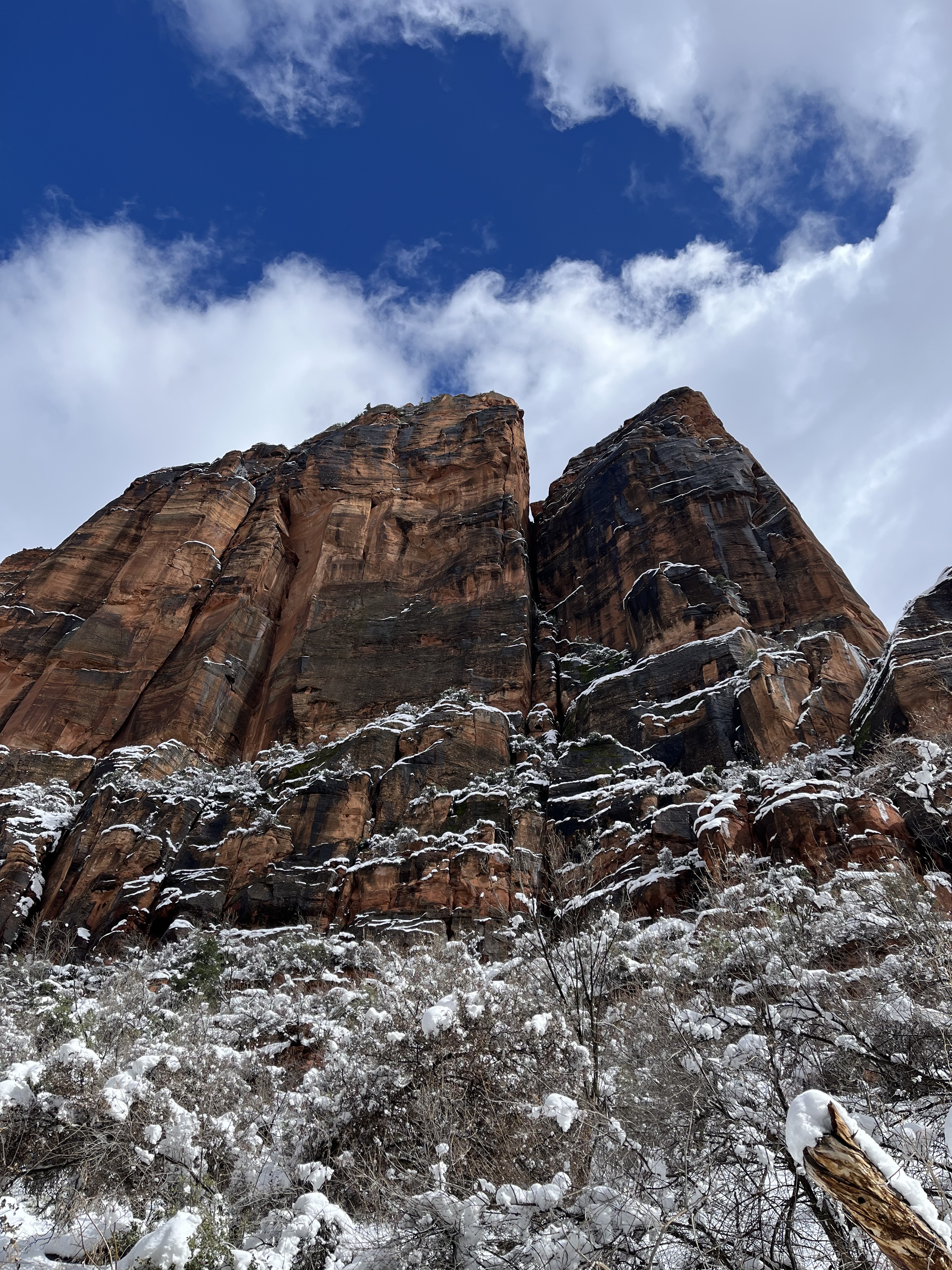 The two hour, 83 mile drive to Zion National Park was easier than we anticipated with the highway being clear and bare of any snow or ice. When we were planning this trip, we were not sure we would make it to Zion, so I had not done any research on what to see or do. As we entered the park, we were once again amazed at the rock formations we encountered. They looked like melted (red) ice cream! And then, there was “the tunnel”…a 1.1 mile pitch-dark passage through a solid rock mountain, with intermittent air-vent “windows” that offered a glimpse of the canyon. As we passed by the first window, my thought was, “wait…what did I just see out there?” and I eagerly hoped there was another window. As we passed by the next window, I was ready and was left speechless by what I saw. We could not get out of the tunnel quick enough, and when we did, it was a view that made us realize why people rave about this park. The massive sheer red rock cliffs dwarfed the cars weaving around the curves of the two lane road. We made several stops to take in the sights, each being more impressive than the last. We took the Zion Canyon Scenic Drive and stopped at the nine viewpoints along the way. We made a quick stop at the visitor center for more postcards and a stamp in our National Park Passport. After a quick run through the little town nearby looking for a place to eat lunch, we decided to turn around and just have some cheese and crackers from the cooler while enjoying a view in the park. Given that we had a two hour drive facing us and there was some light snow beginning to fall, we decided to head back towards Bryce.