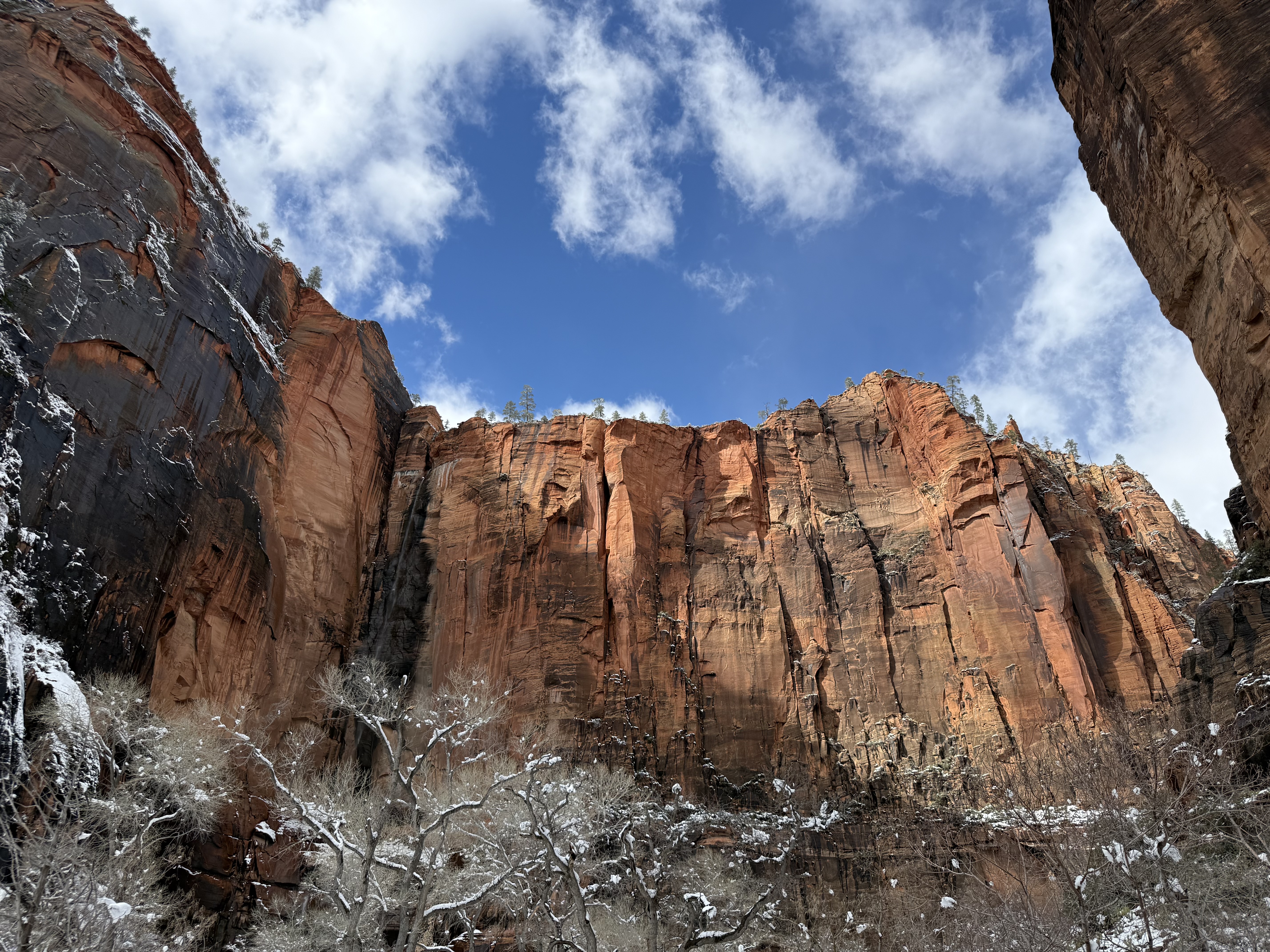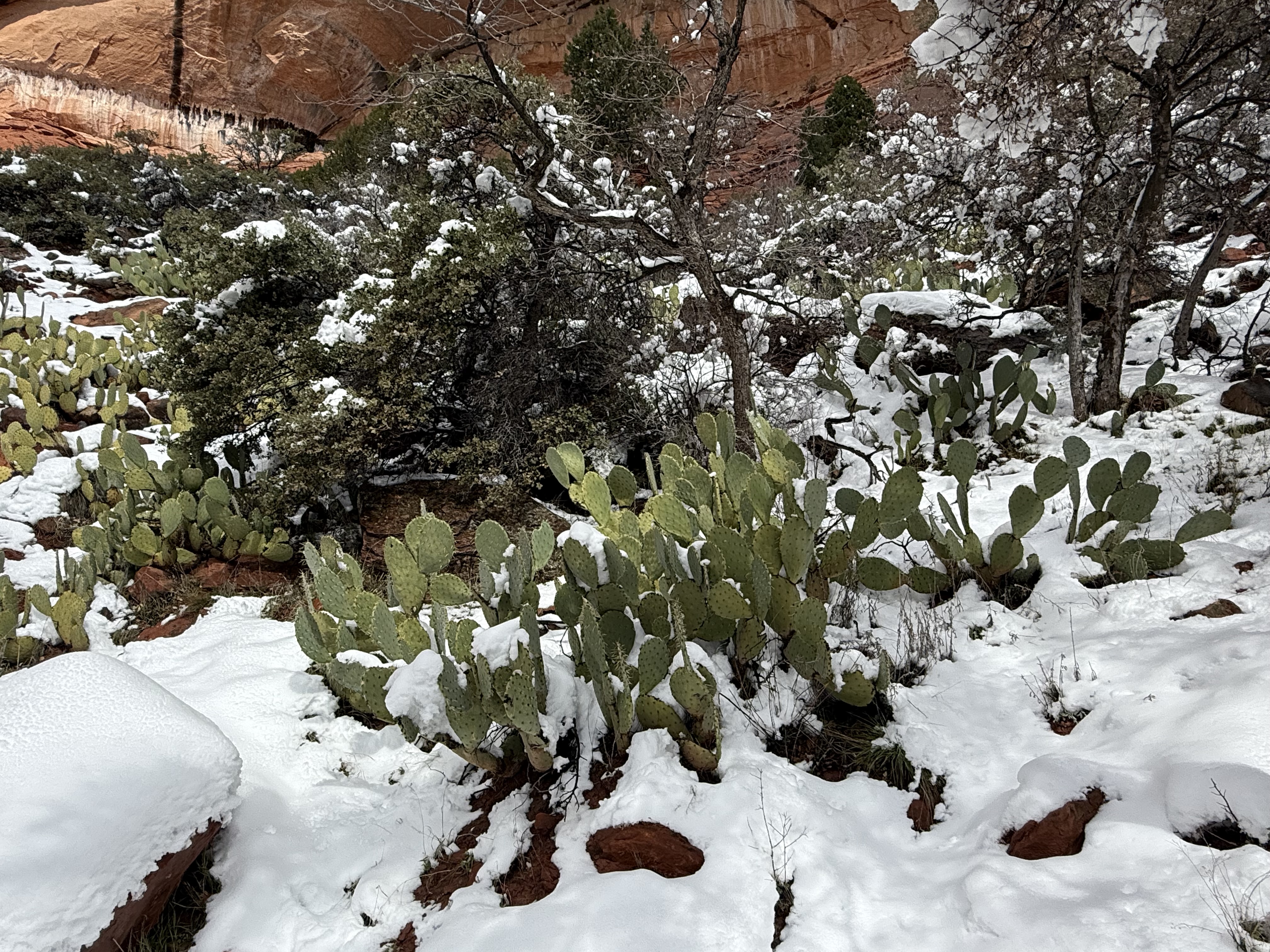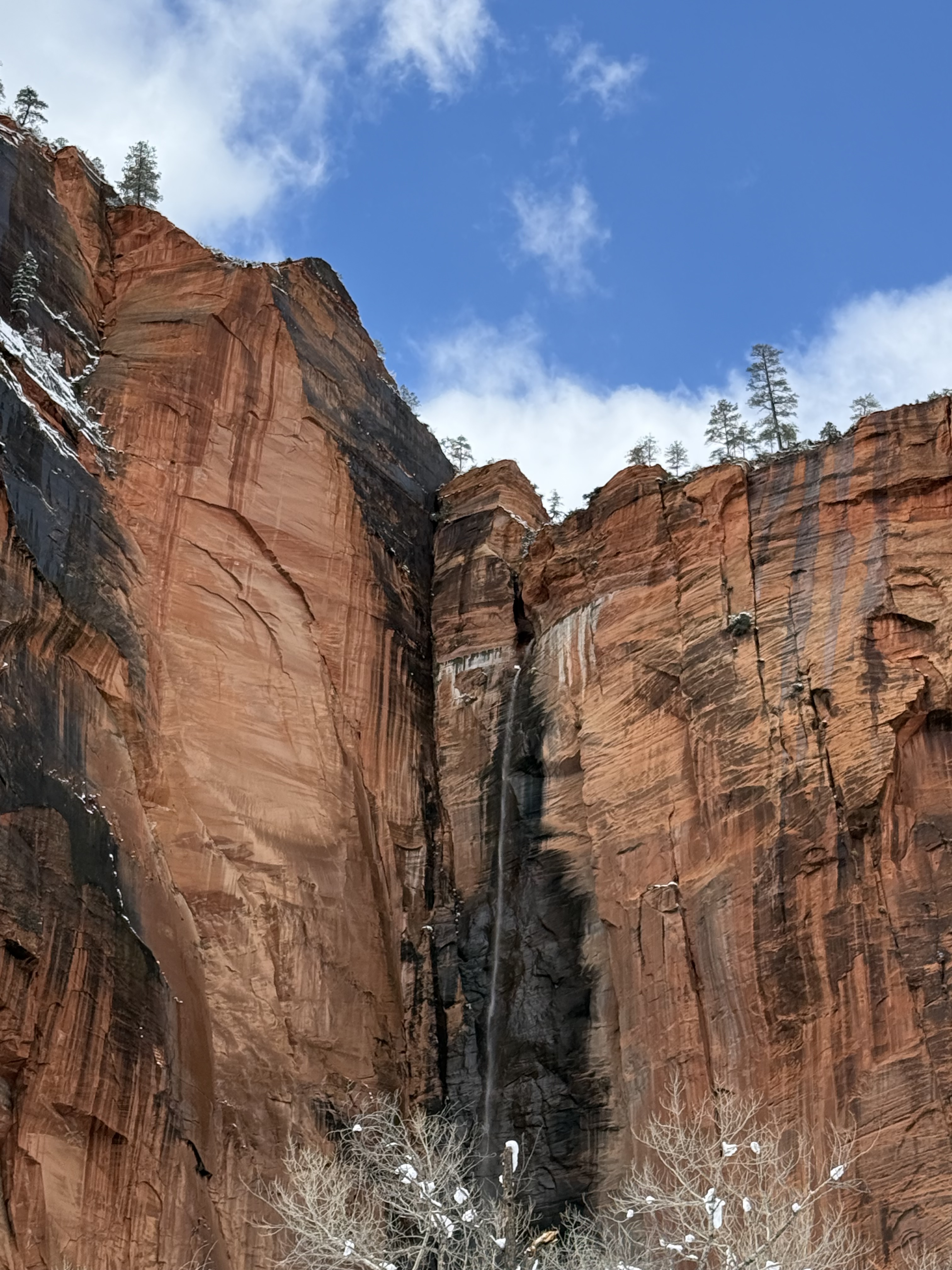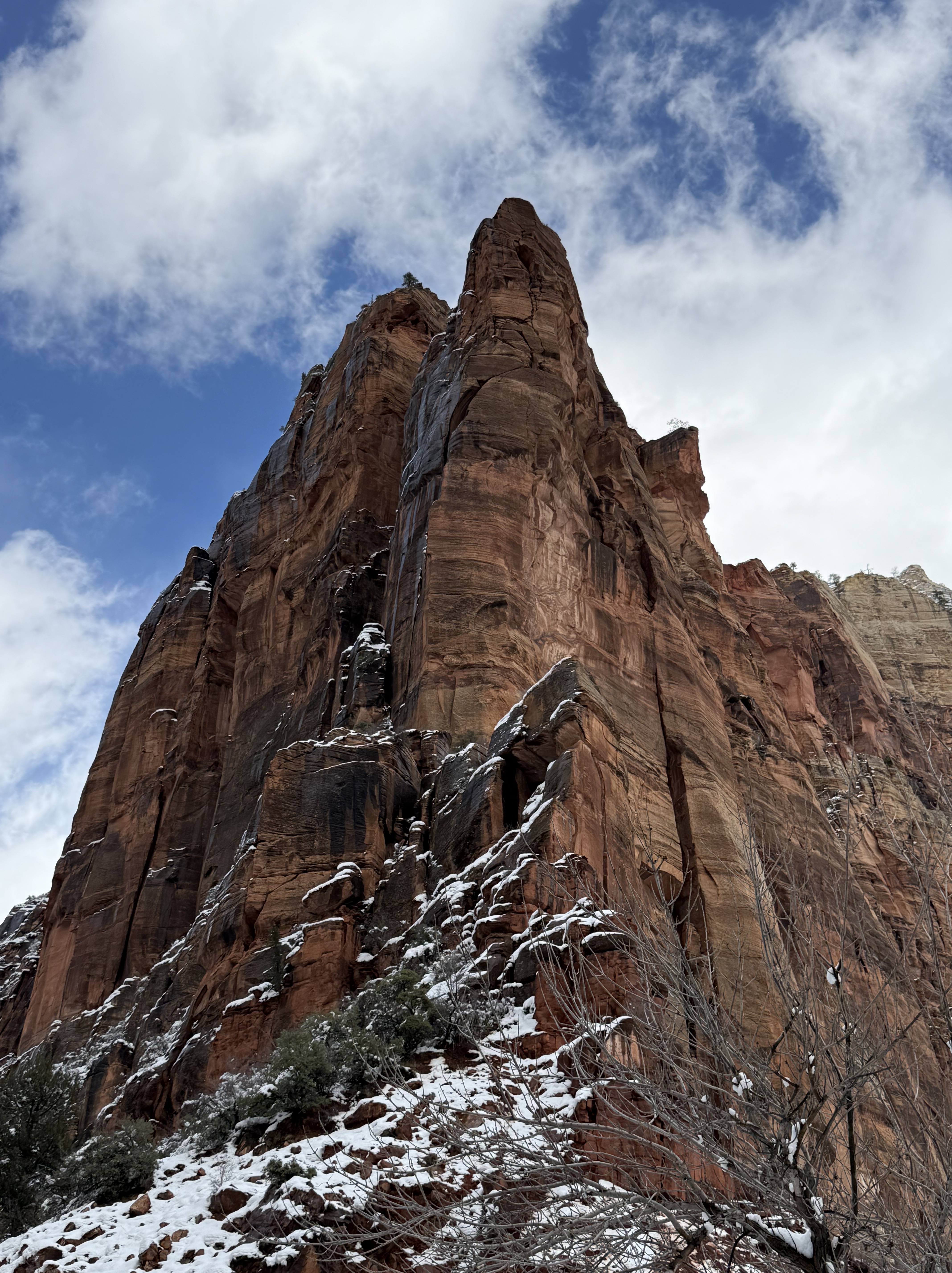 The two hour, 83 mile drive to Zion National Park was easier than we anticipated with the highway being clear and bare of any snow or ice. When we were planning this trip, we were not sure we would make it to Zion, so I had not done any research on what to see or do. As we entered the park, we were once again amazed at the rock formations we encountered. They looked like melted (red) ice cream! And then, there was “the tunnel”…a 1.1 mile pitch-dark passage through a solid rock mountain, with intermittent air-vent “windows” that offered a glimpse of the canyon. As we passed by the first window, my thought was, “wait…what did I just see out there?” and I eagerly hoped there was another window. As we passed by the next window, I was ready and was left speechless by what I saw. We could not get out of the tunnel quick enough, and when we did, it was a view that made us realize why people rave about this park. The massive sheer red rock cliffs dwarfed the cars weaving around the curves of the two lane road. We made several stops to take in the sights, each being more impressive than the last. We took the Zion Canyon Scenic Drive and stopped at the nine viewpoints along the way. We made a quick stop at the visitor center for more postcards and a stamp in our National Park Passport. After a quick run through the little town nearby looking for a place to eat lunch, we decided to turn around and just have some cheese and crackers from the cooler while enjoying a view in the park. Given that we had a two hour drive facing us and there was some light snow beginning to fall, we decided to head back towards Bryce.