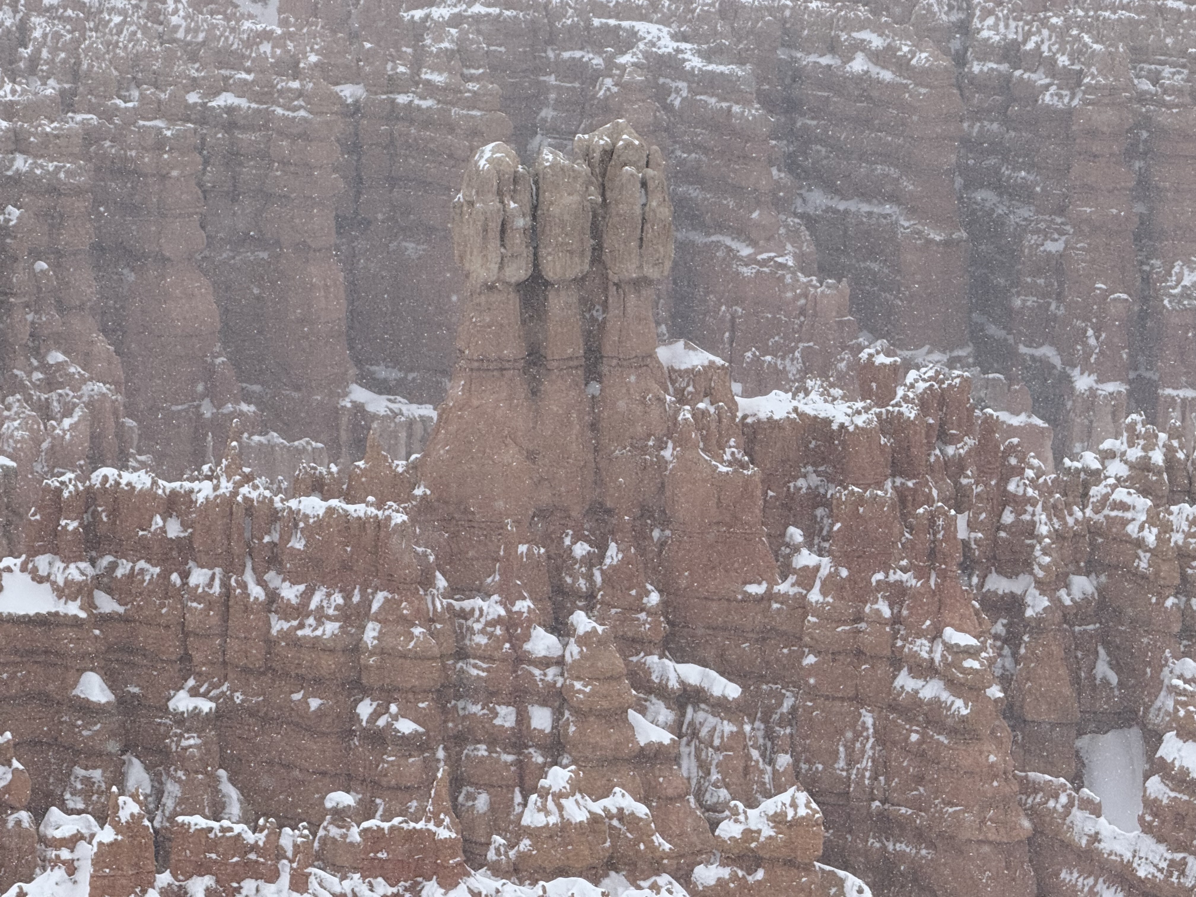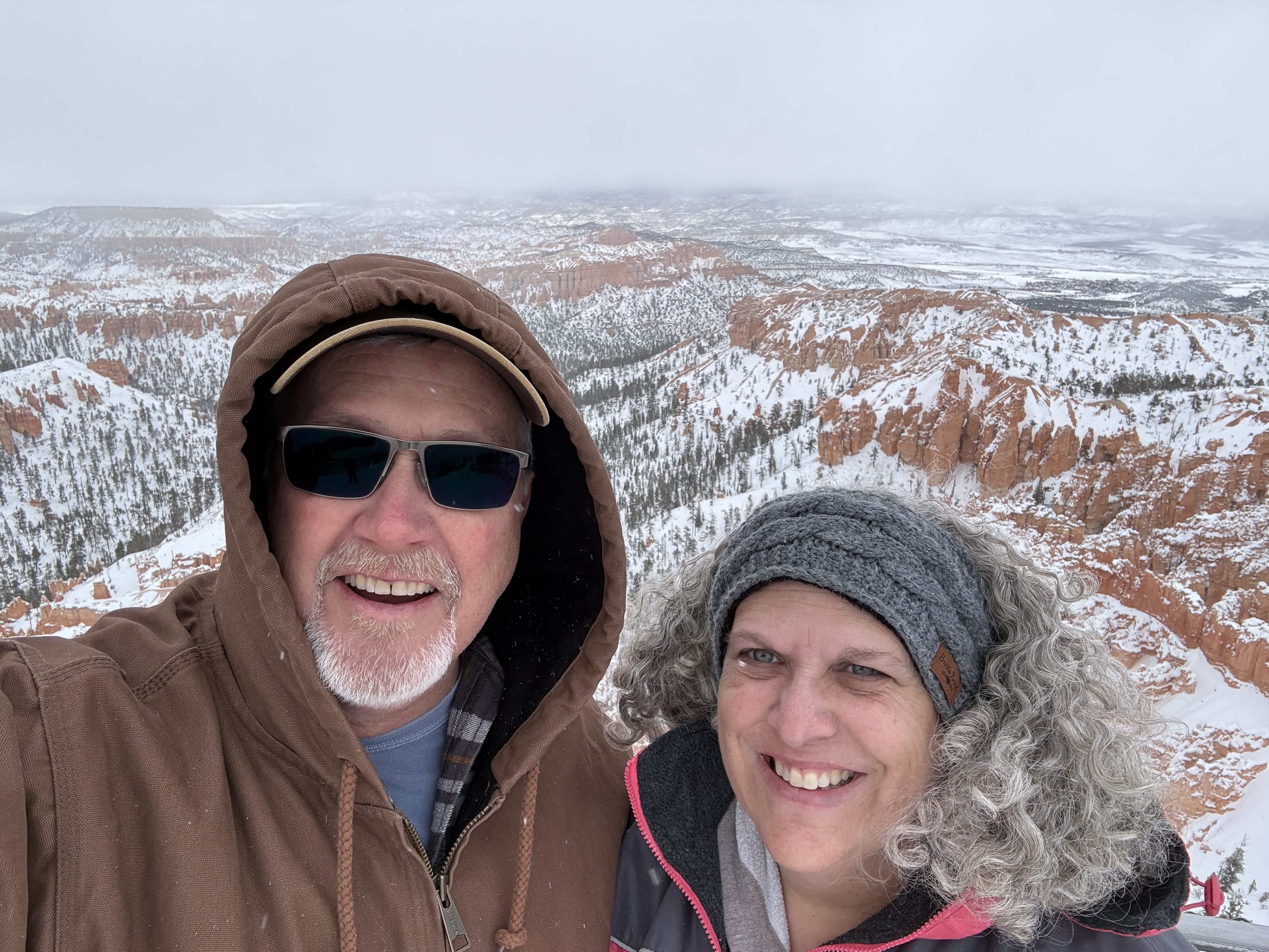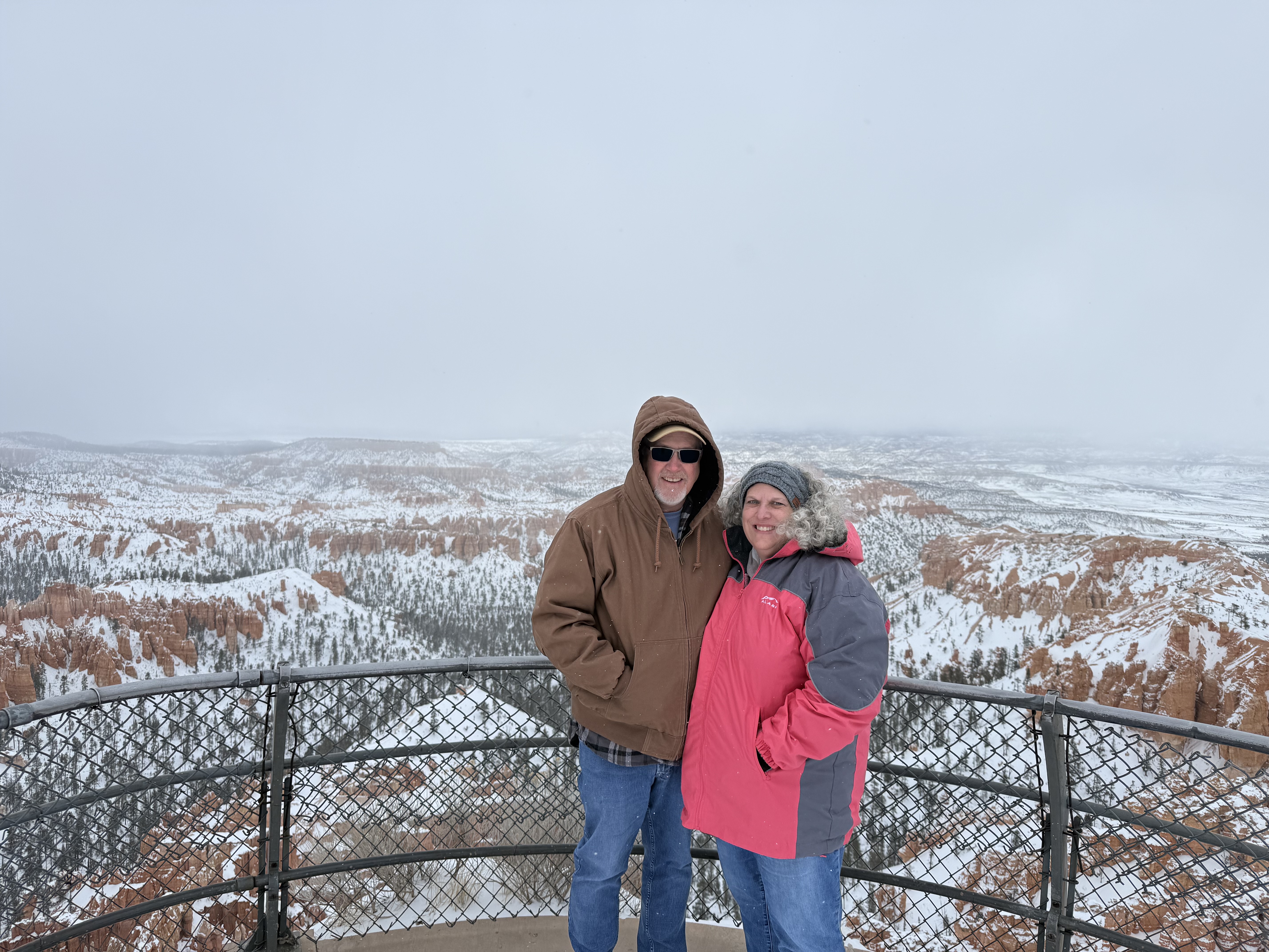 We arrived at the Best Western Plus Ruby’s Inn in Bryce Canyon City, UT at about 3:00. Unfortunately our room was ready yet, so we headed down the road to the Bryce Canyon National Park Visitor Center, which was scheduled to close for the day at 4:00. After a short visit with a park ranger to check on road status, we picked up a few souvenirs and postcards and headed off to the see the amphitheater. The area received about 15″ of snow about a day prior to our arrival, and the forecast was predicting another 8″-12″ in the coming hours. Even though the park was under heavy cloud cover, we wanted to see what we could in case the roads were impassable the next day. The park staff had done a fantastic job of plowing roads and clearing walk ways through about half the park, so we were able to visit the Sunrise, Sunset, Inspiration and Bryce viewpoints. With each view point, we were amazed with what we saw! The amphitheater was filled with giant stone pillars called Hoodoos (“who-do”) and cave-like holes into the walls of the canyon. The hoodoos soar hundreds of feet from the floor and walls of the canyon, and according to Native American lore, are though to be the stone remains of ancestors.