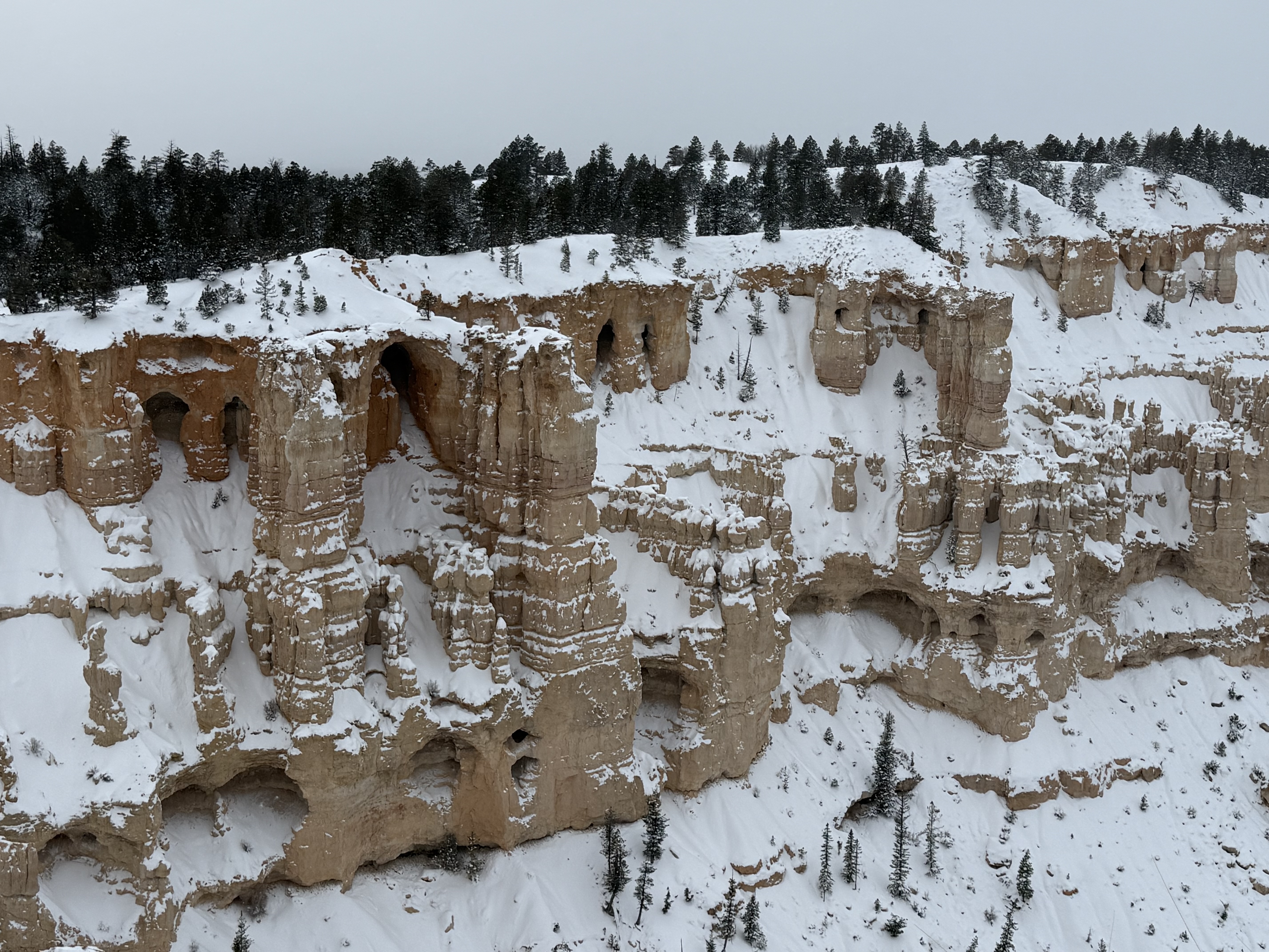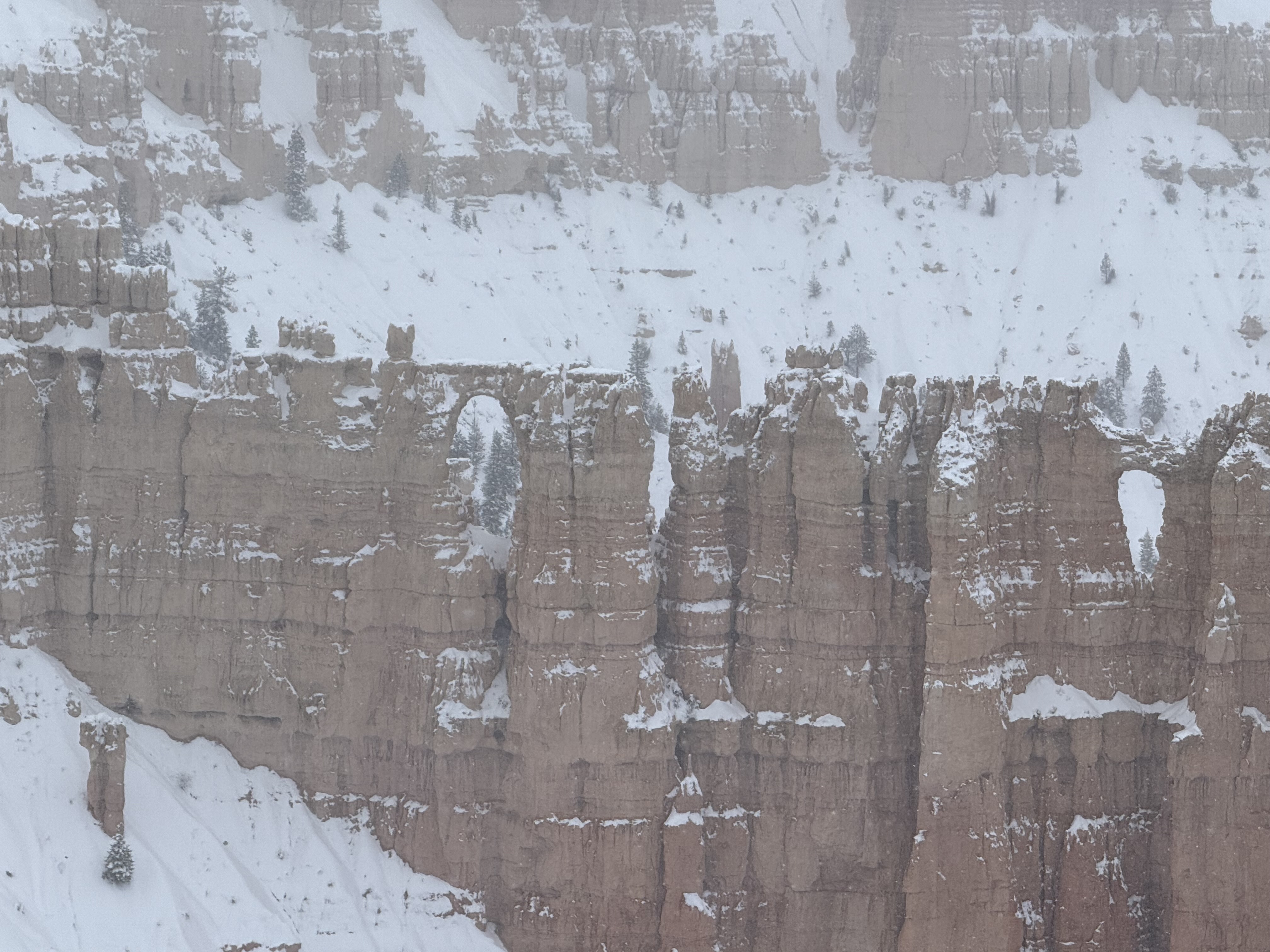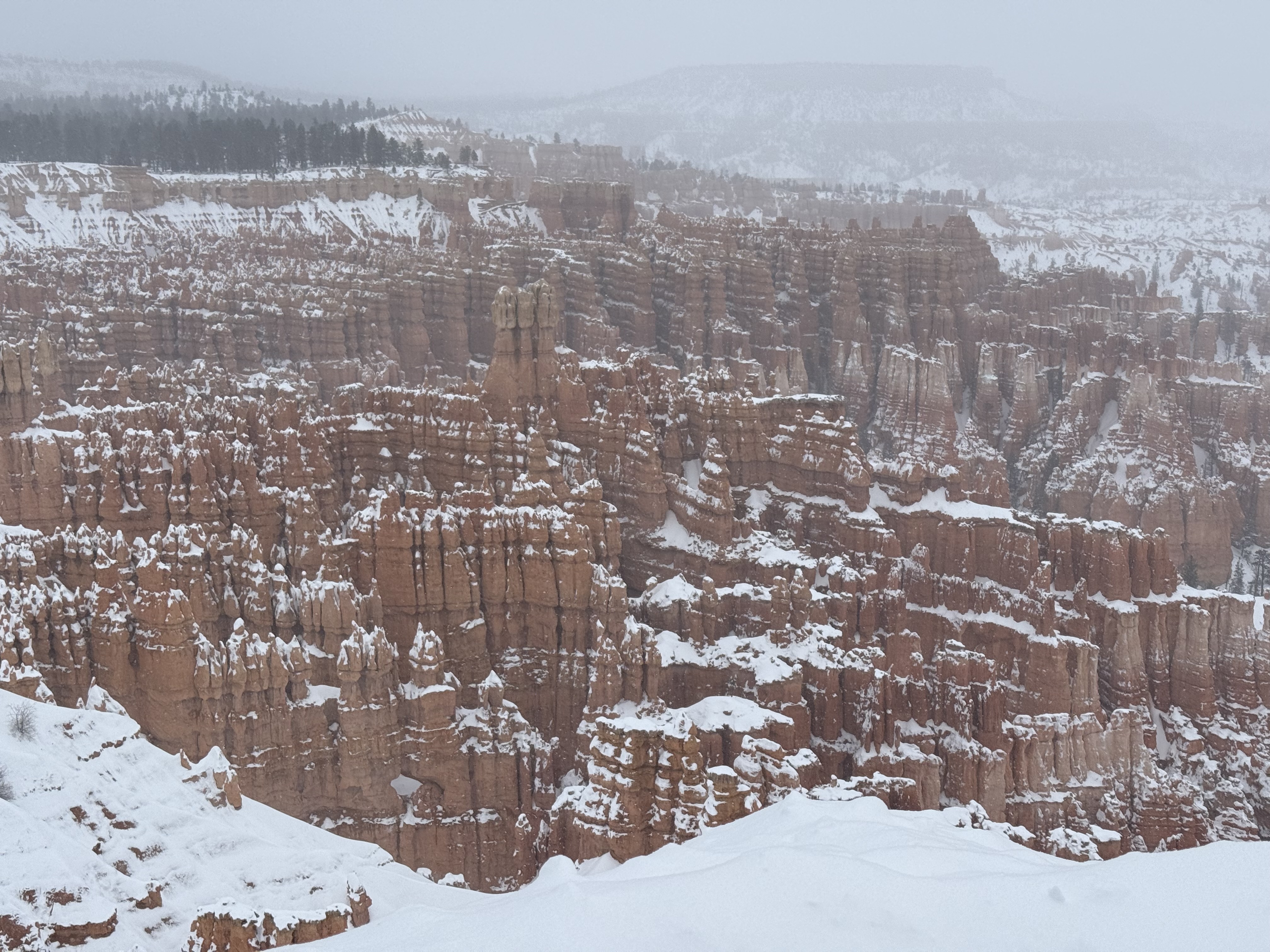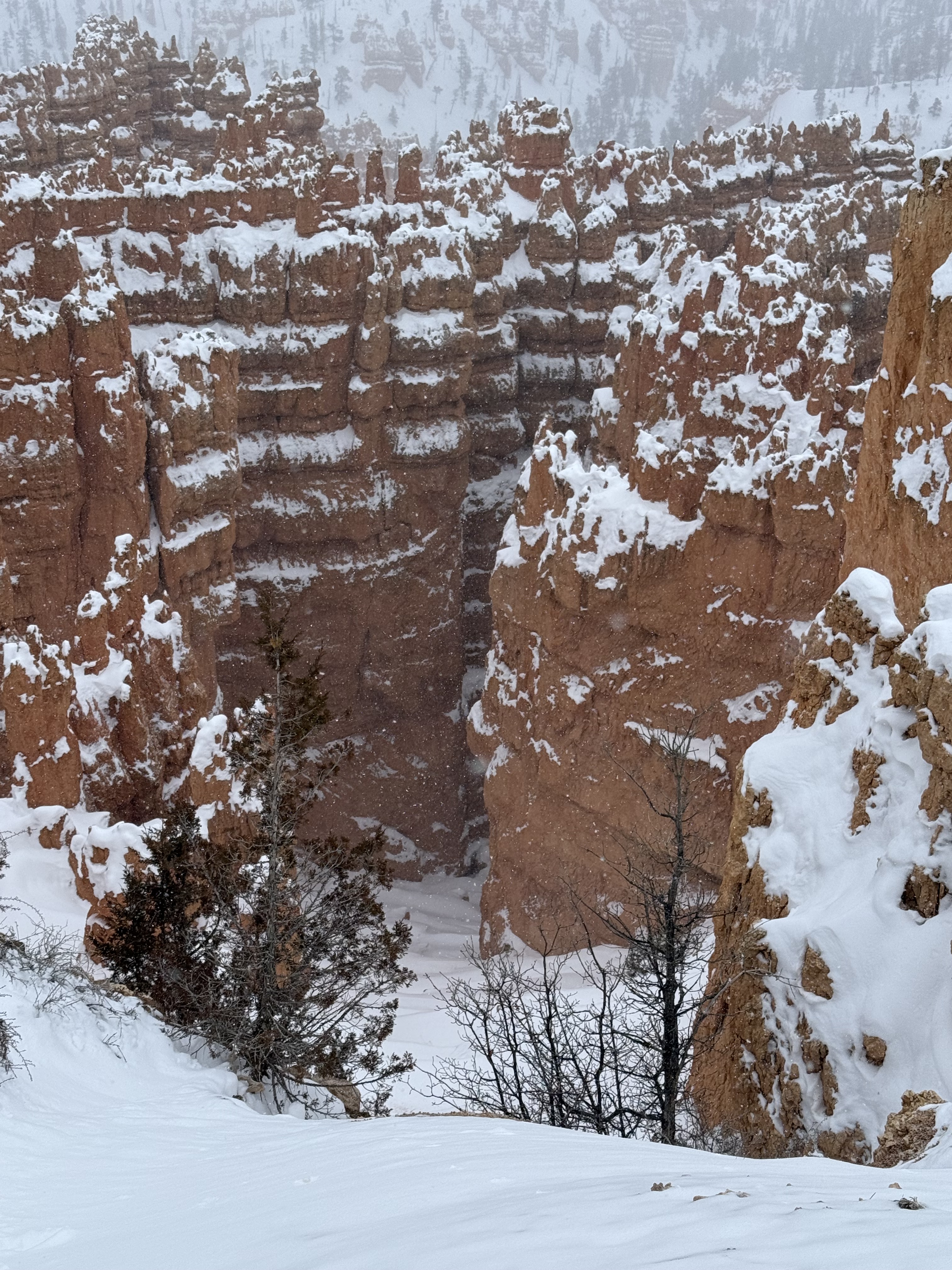 We arrived at the Best Western Plus Ruby’s Inn in Bryce Canyon City, UT at about 3:00. Unfortunately our room was ready yet, so we headed down the road to the Bryce Canyon National Park Visitor Center, which was scheduled to close for the day at 4:00. After a short visit with a park ranger to check on road status, we picked up a few souvenirs and postcards and headed off to the see the amphitheater. The area received about 15″ of snow about a day prior to our arrival, and the forecast was predicting another 8″-12″ in the coming hours. Even though the park was under heavy cloud cover, we wanted to see what we could in case the roads were impassable the next day. The park staff had done a fantastic job of plowing roads and clearing walk ways through about half the park, so we were able to visit the Sunrise, Sunset, Inspiration and Bryce viewpoints. With each view point, we were amazed with what we saw! The amphitheater was filled with giant stone pillars called Hoodoos (“who-do”) and cave-like holes into the walls of the canyon. The hoodoos soar hundreds of feet from the floor and walls of the canyon, and according to Native American lore, are though to be the stone remains of ancestors.