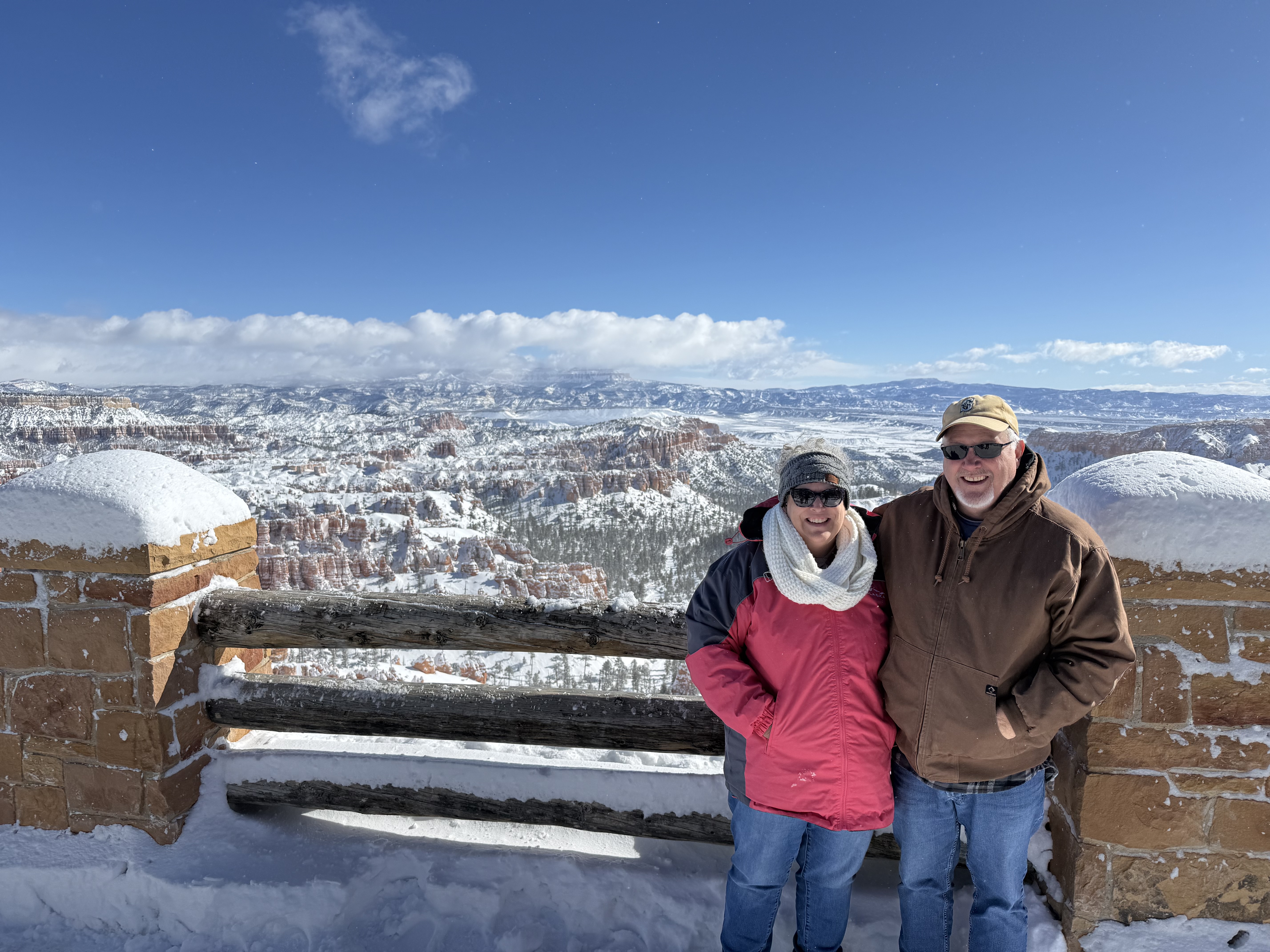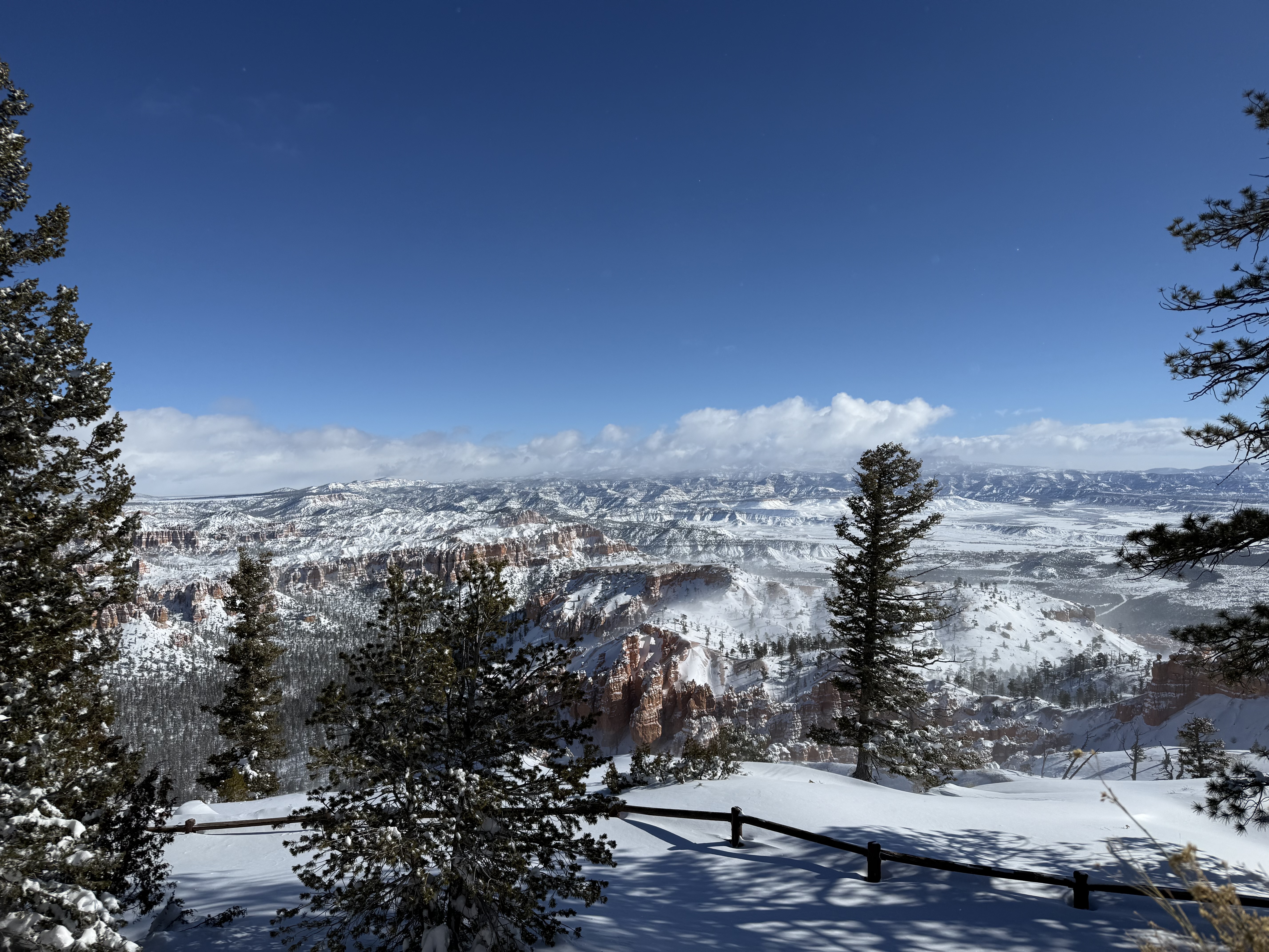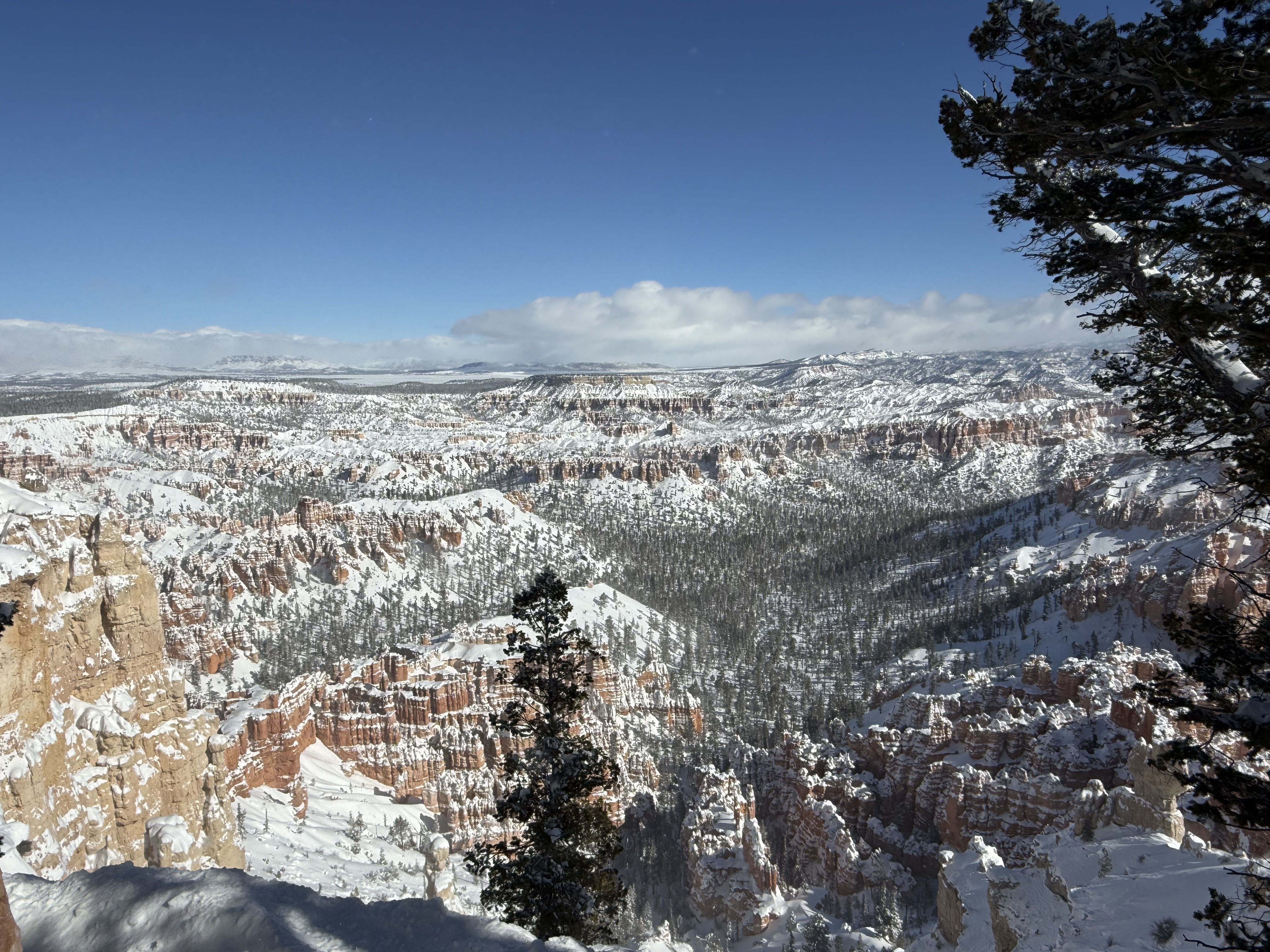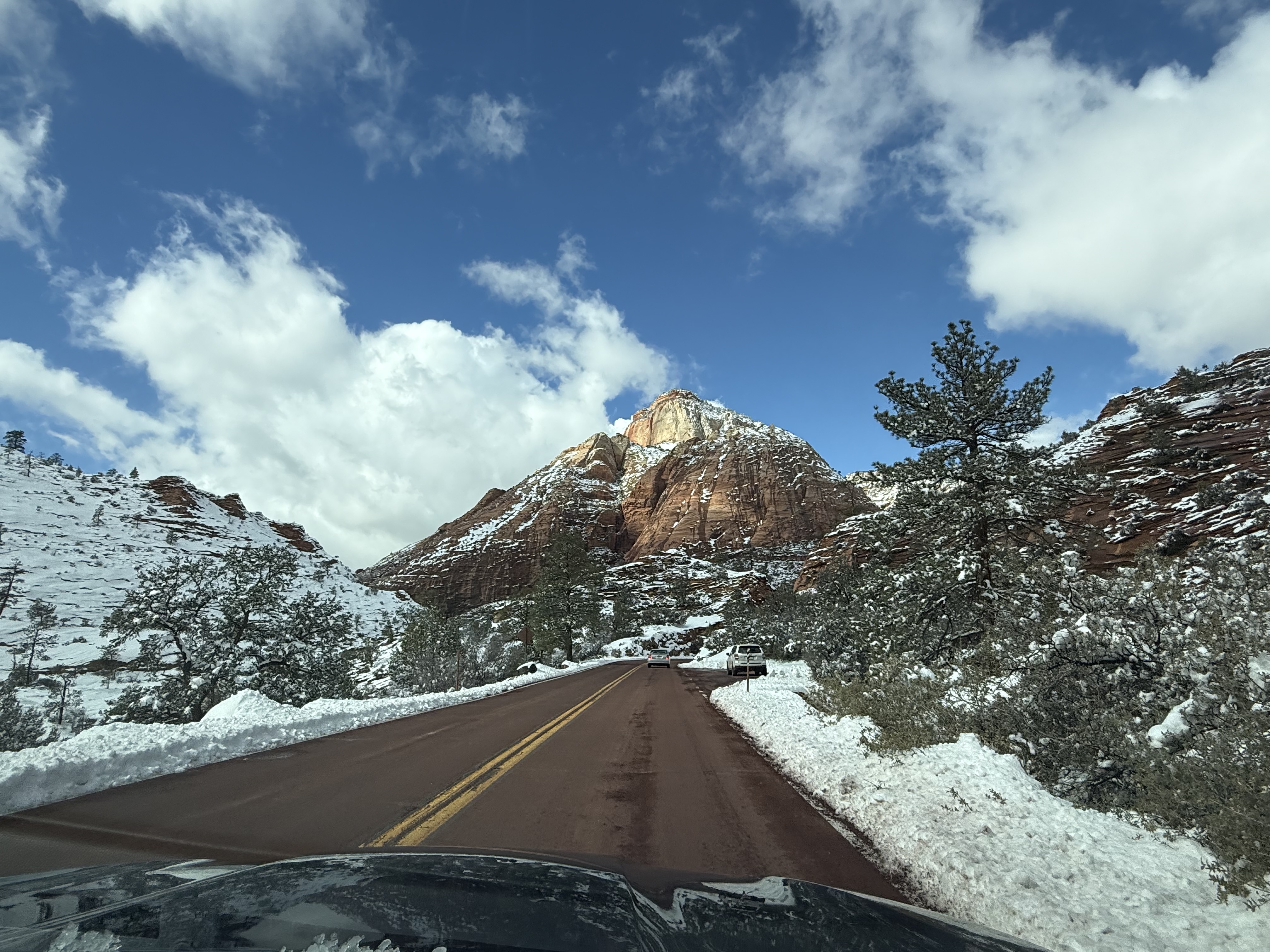 Total miles driven: 1,152We woke up at about 4:00 AM to snow plows dealing with 10″-12″ of new snow. Not an ideal alarm clock and certainly not an ideal wake up time! But, the snow had stopped falling, and we were happy to see that it was being dealt with! We failed to fall back asleep, so we had an early breakfast. The hotel offers a full hot breakfast buffet with the room; a pleasant change from the usual cold cereal and yogurts found with most hotel continental breakfasts. By the time we were done with breakfast, the snow plows were done, and the sun was shining and the sky was clear blue with very few clouds! We headed back into the park to see the views unobstructed. The road was again well plowed, but the maintenance staff was still running bobcats with snowblowers to clear some of the paths. We had the amphitheater viewpoints all to ourselves for a while! And as stunning as the views were yesterday, they were incredible today in the sun. We were able to see out over the plateaus in the distance, and the hoodoos shimmered with the fresh snow that had collected in the crevices. By about 10:00 AM, we decided to head towards Zion National Park, and hope the roads were clear.