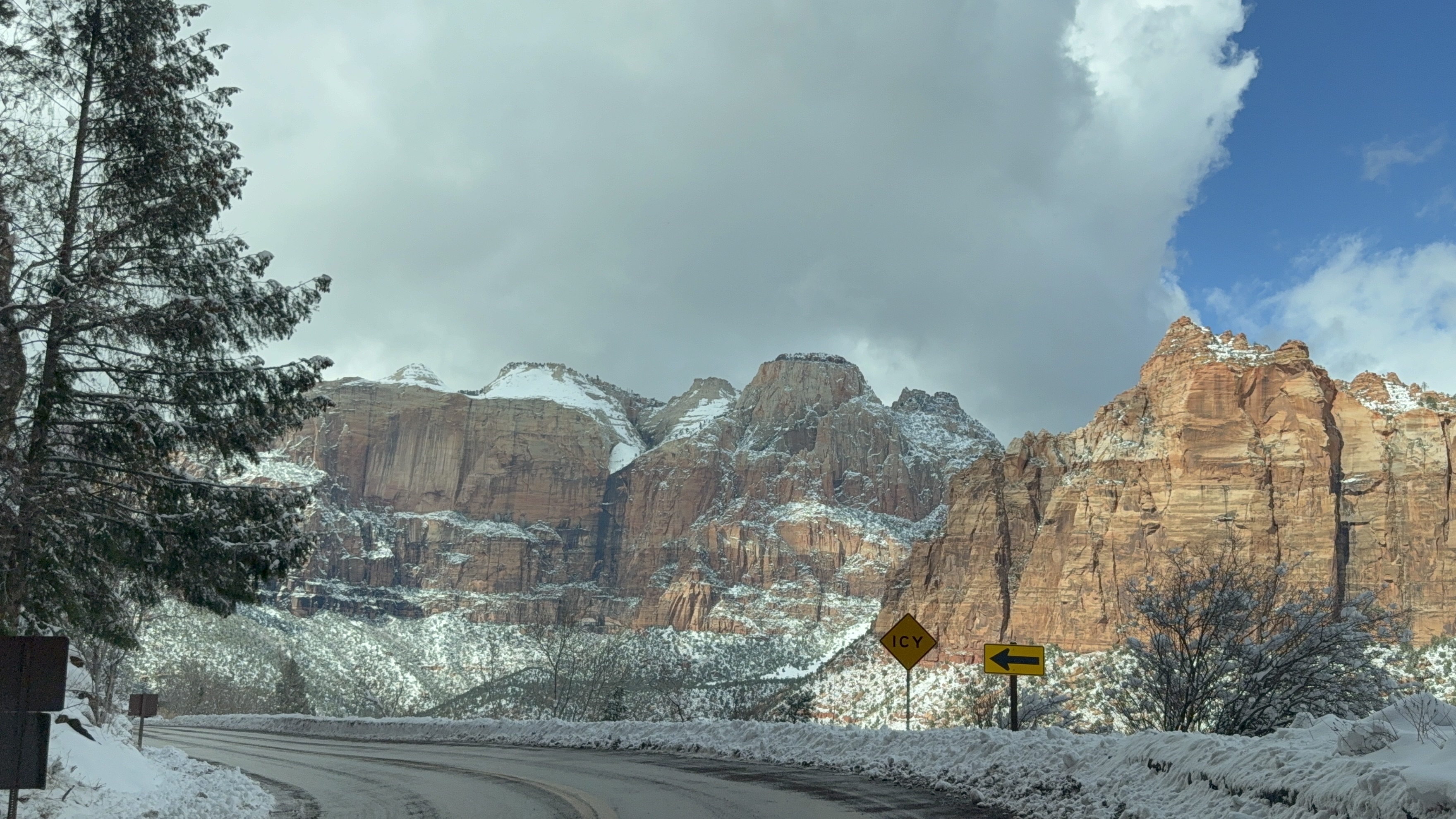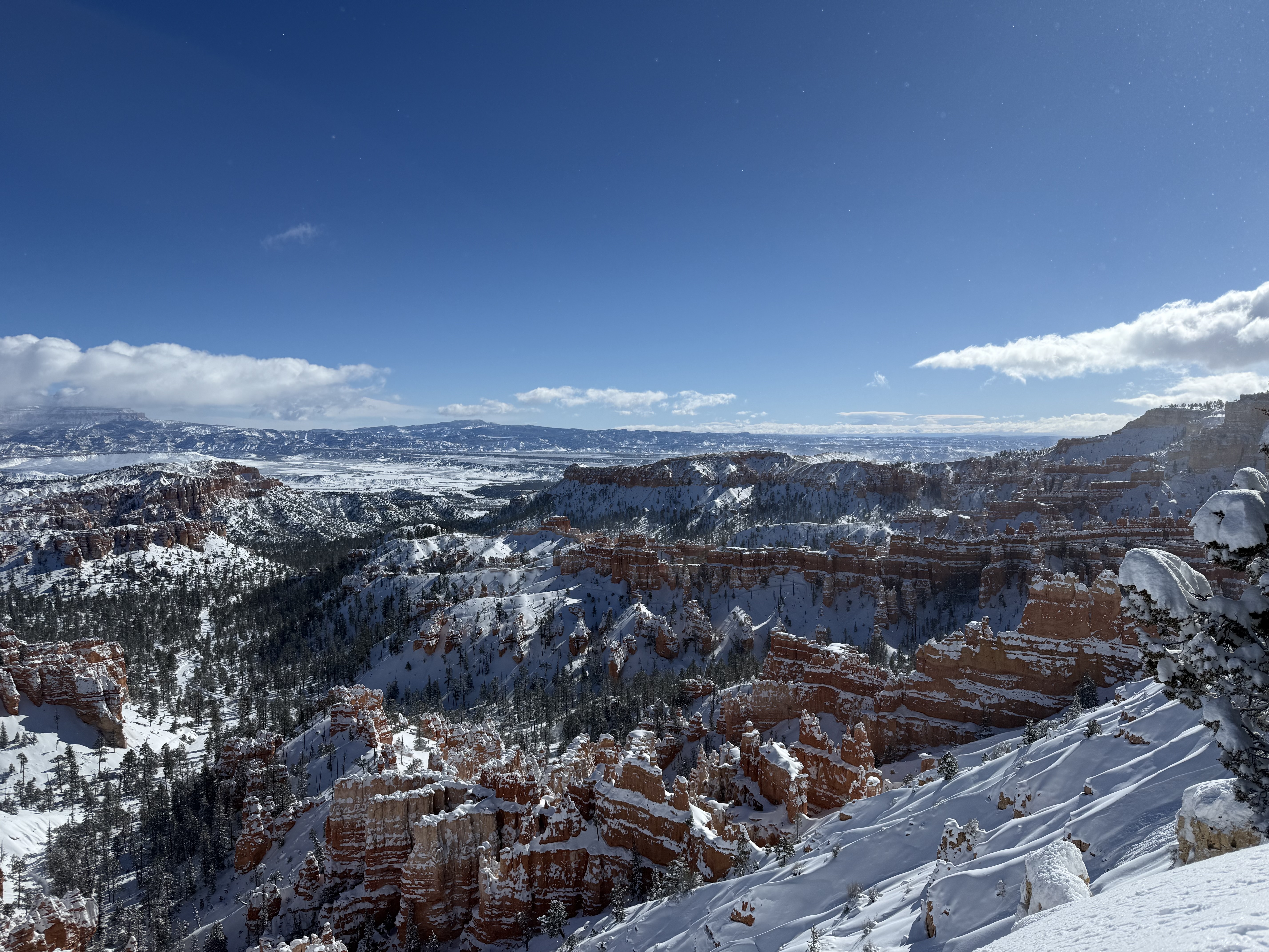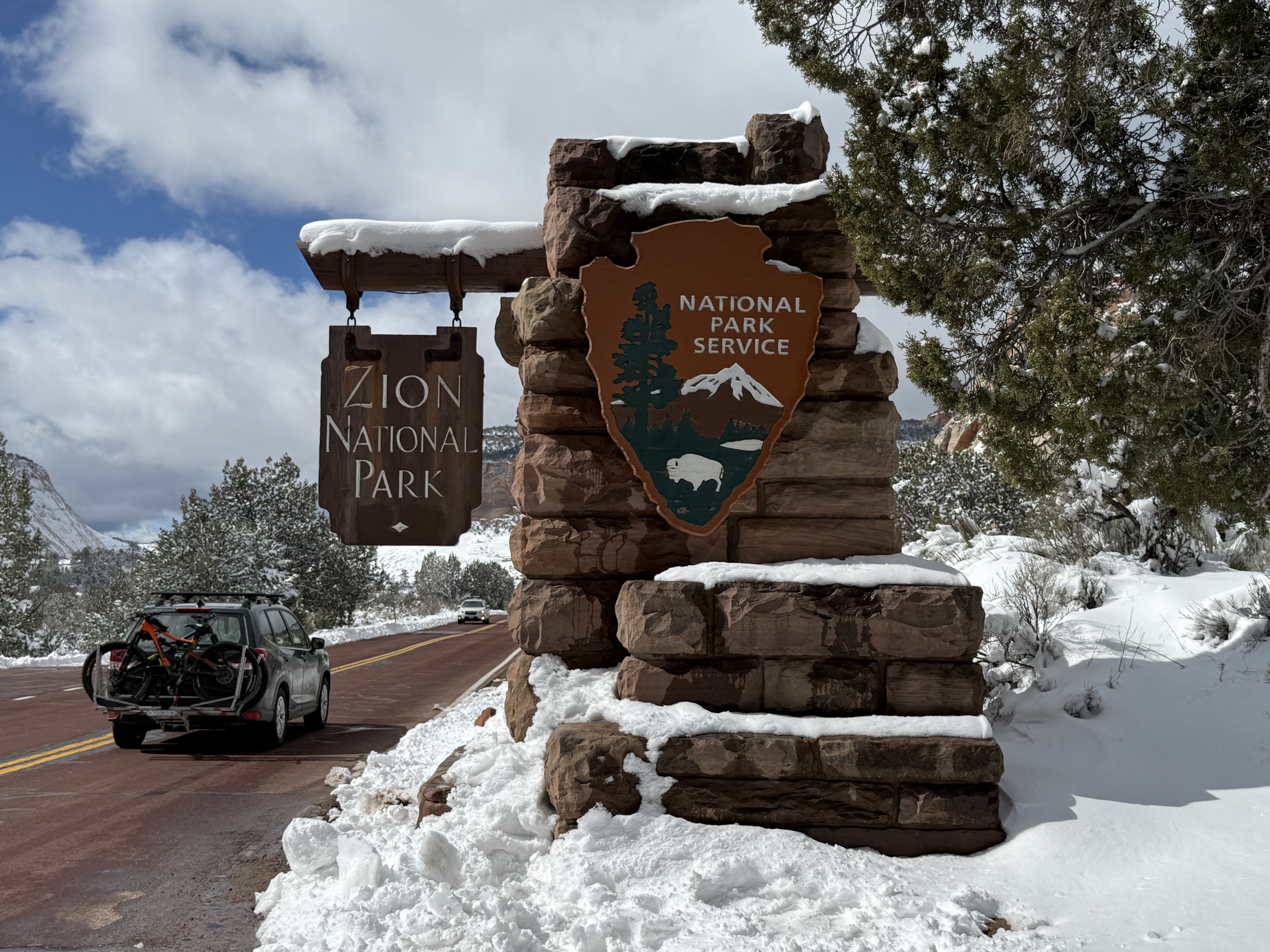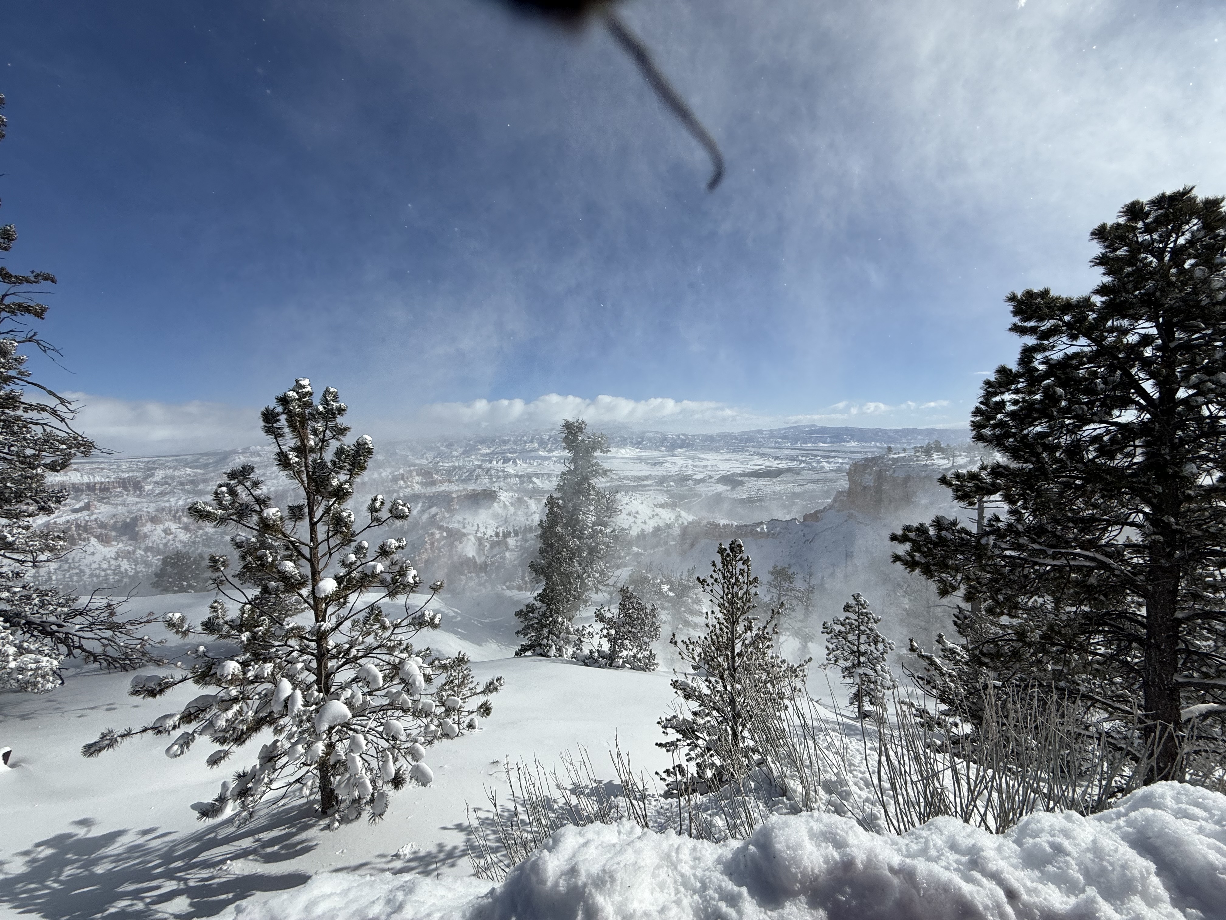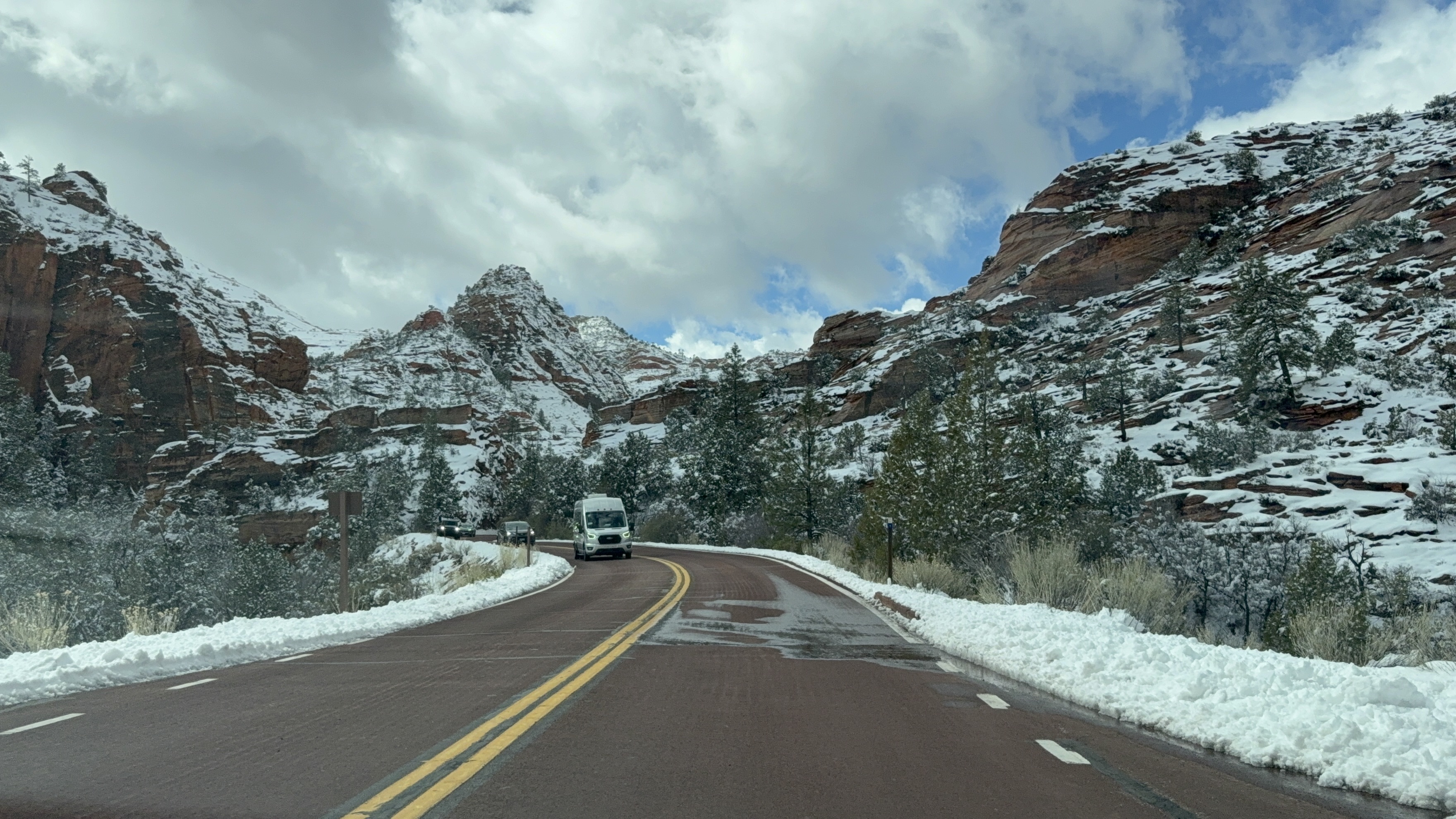 Total miles driven: 1,152We woke up at about 4:00 AM to snow plows dealing with 10″-12″ of new snow. Not an ideal alarm clock and certainly not an ideal wake up time! But, the snow had stopped falling, and we were happy to see that it was being dealt with! We failed to fall back asleep, so we had an early breakfast. The hotel offers a full hot breakfast buffet with the room; a pleasant change from the usual cold cereal and yogurts found with most hotel continental breakfasts. By the time we were done with breakfast, the snow plows were done, and the sun was shining and the sky was clear blue with very few clouds! We headed back into the park to see the views unobstructed. The road was again well plowed, but the maintenance staff was still running bobcats with snowblowers to clear some of the paths. We had the amphitheater viewpoints all to ourselves for a while! And as stunning as the views were yesterday, they were incredible today in the sun. We were able to see out over the plateaus in the distance, and the hoodoos shimmered with the fresh snow that had collected in the crevices. By about 10:00 AM, we decided to head towards Zion National Park, and hope the roads were clear.