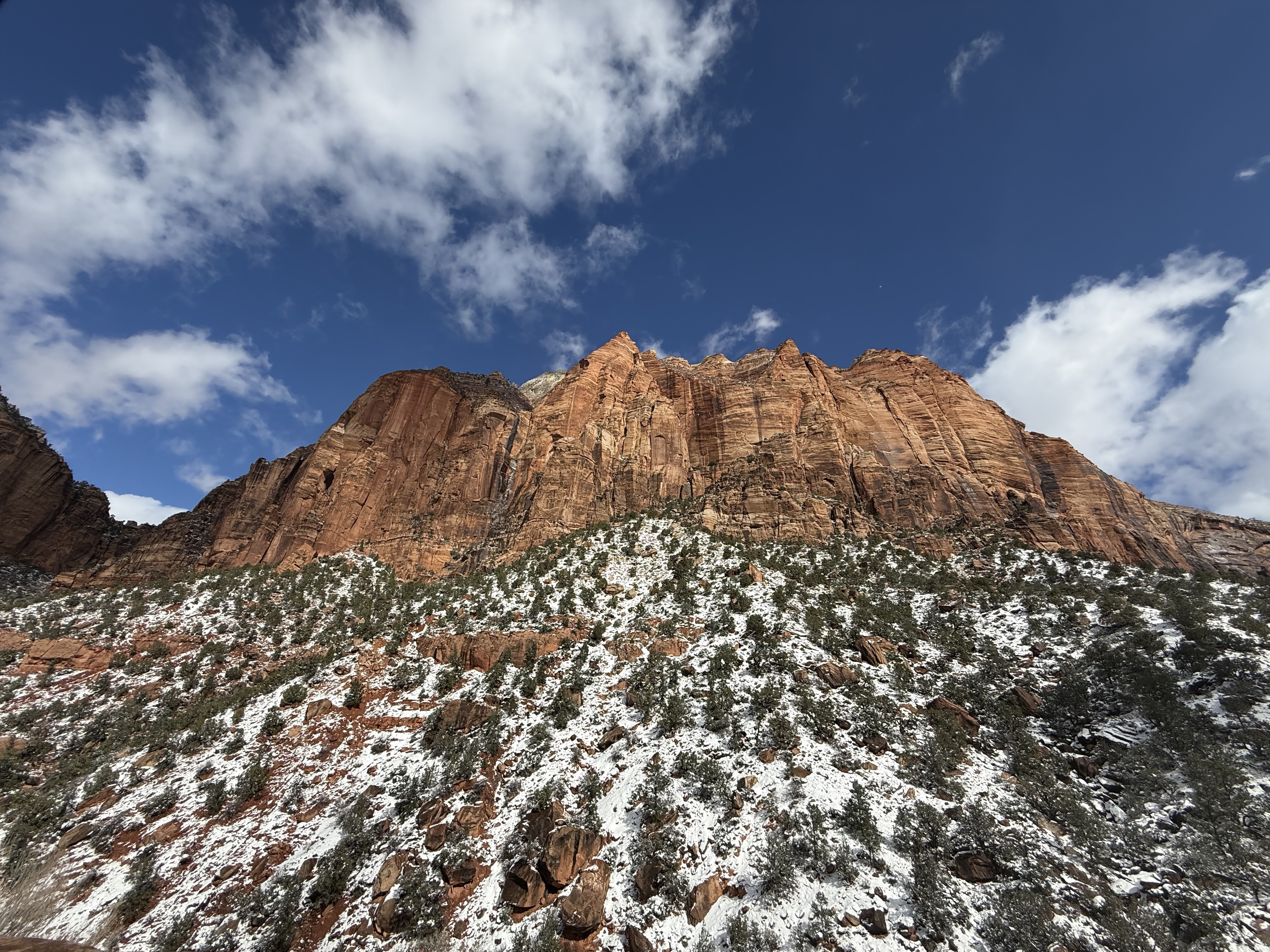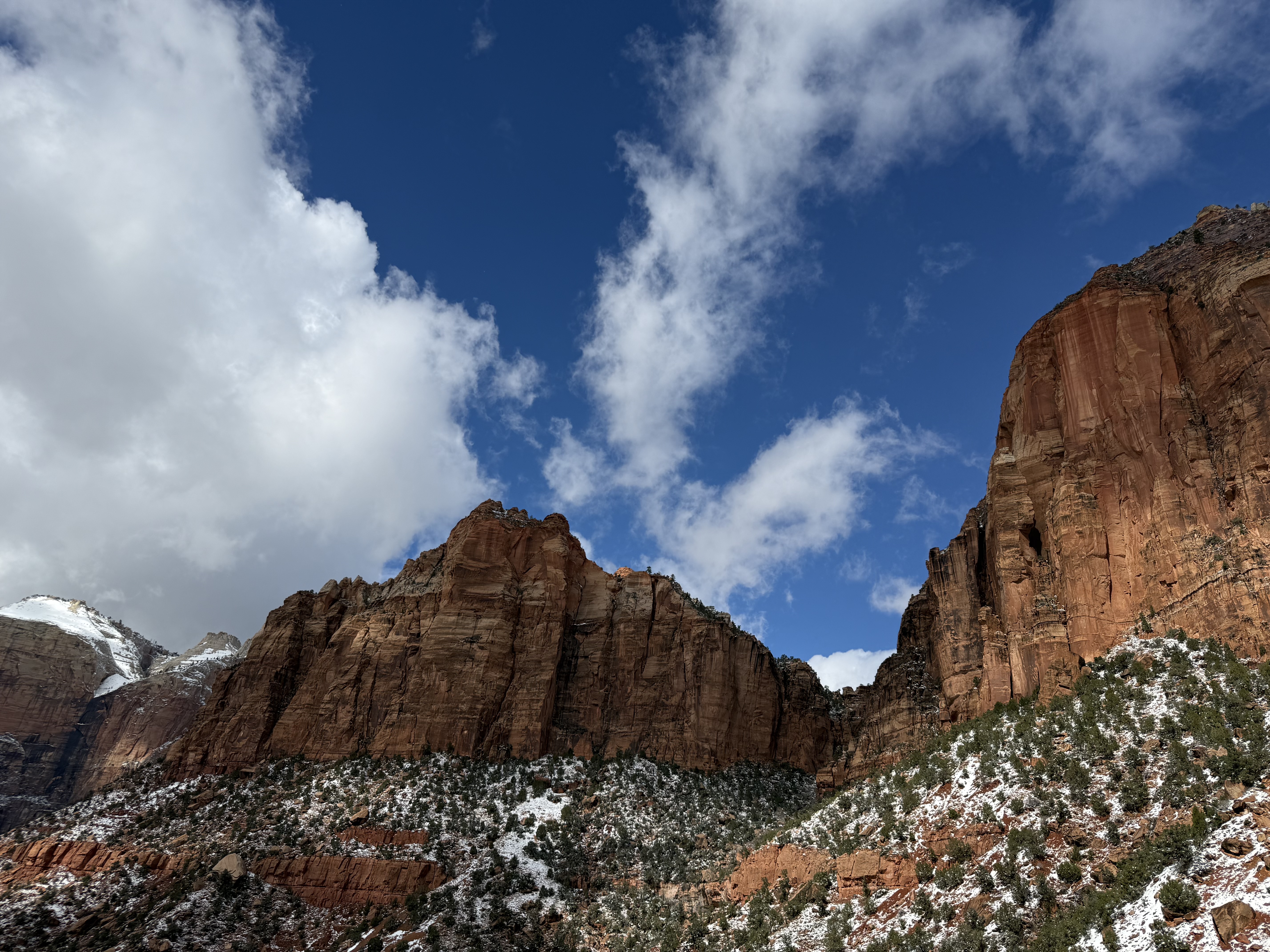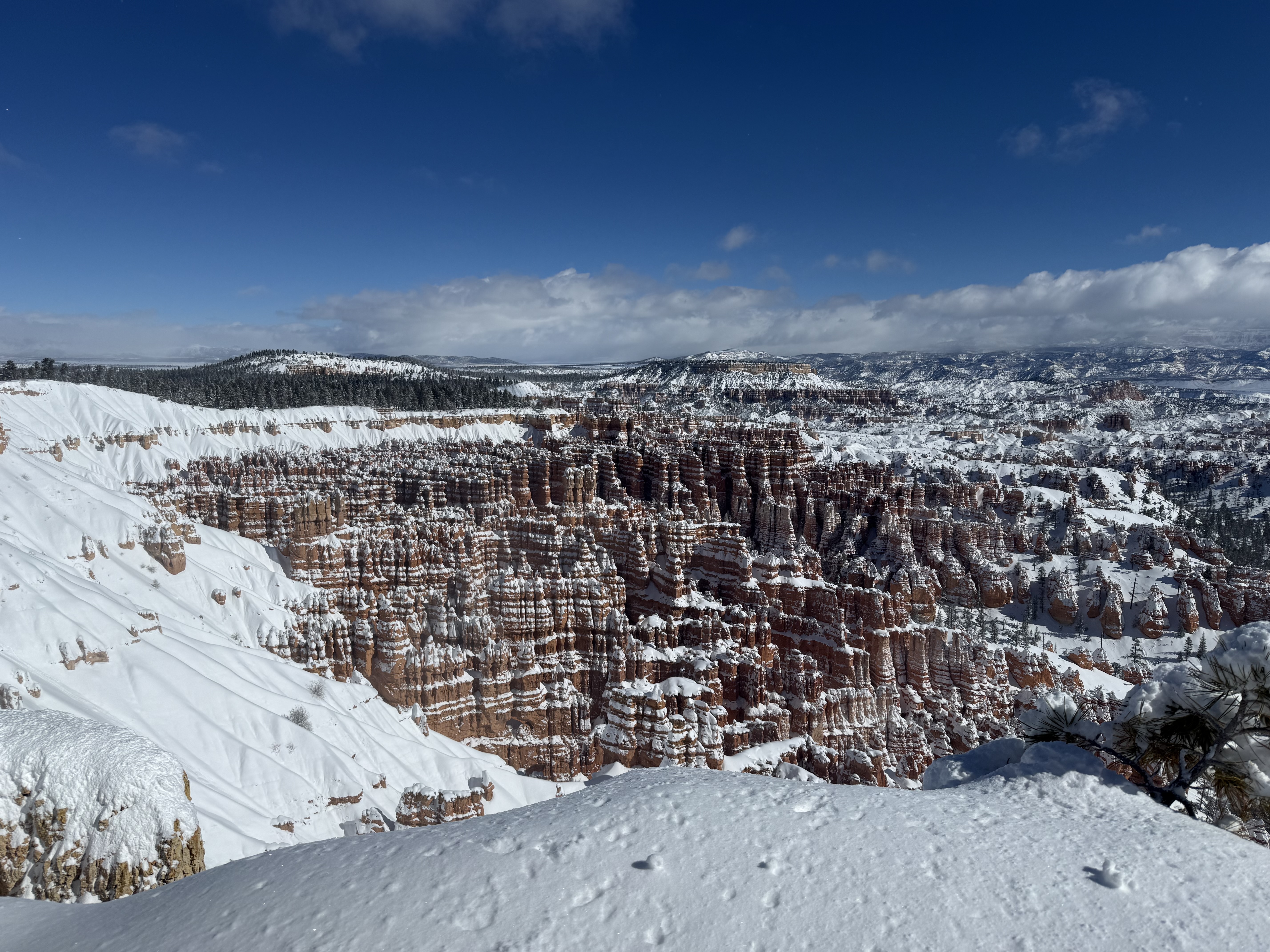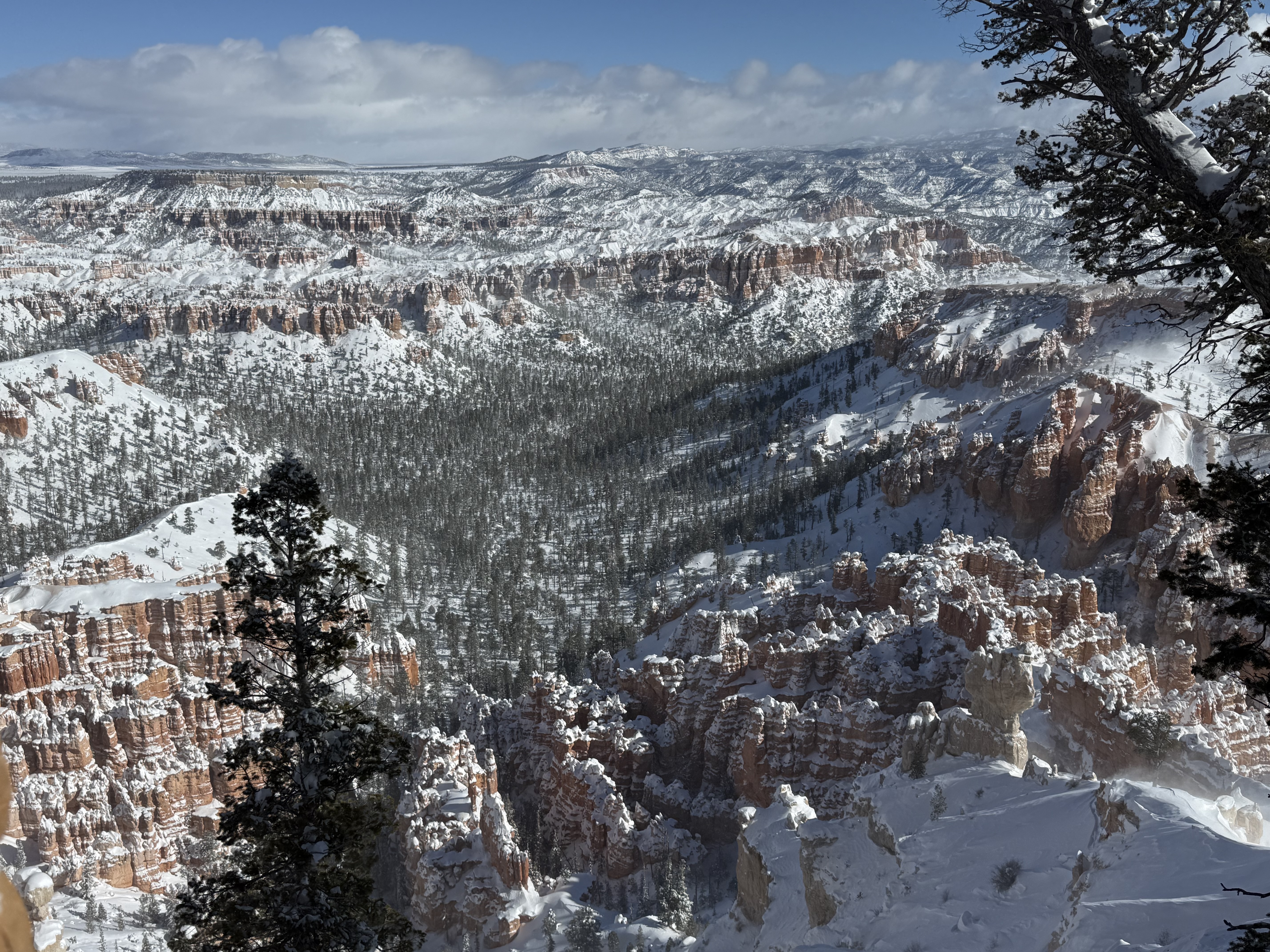 Total miles driven: 1,152We woke up at about 4:00 AM to snow plows dealing with 10″-12″ of new snow. Not an ideal alarm clock and certainly not an ideal wake up time! But, the snow had stopped falling, and we were happy to see that it was being dealt with! We failed to fall back asleep, so we had an early breakfast. The hotel offers a full hot breakfast buffet with the room; a pleasant change from the usual cold cereal and yogurts found with most hotel continental breakfasts. By the time we were done with breakfast, the snow plows were done, and the sun was shining and the sky was clear blue with very few clouds! We headed back into the park to see the views unobstructed. The road was again well plowed, but the maintenance staff was still running bobcats with snowblowers to clear some of the paths. We had the amphitheater viewpoints all to ourselves for a while! And as stunning as the views were yesterday, they were incredible today in the sun. We were able to see out over the plateaus in the distance, and the hoodoos shimmered with the fresh snow that had collected in the crevices. By about 10:00 AM, we decided to head towards Zion National Park, and hope the roads were clear.