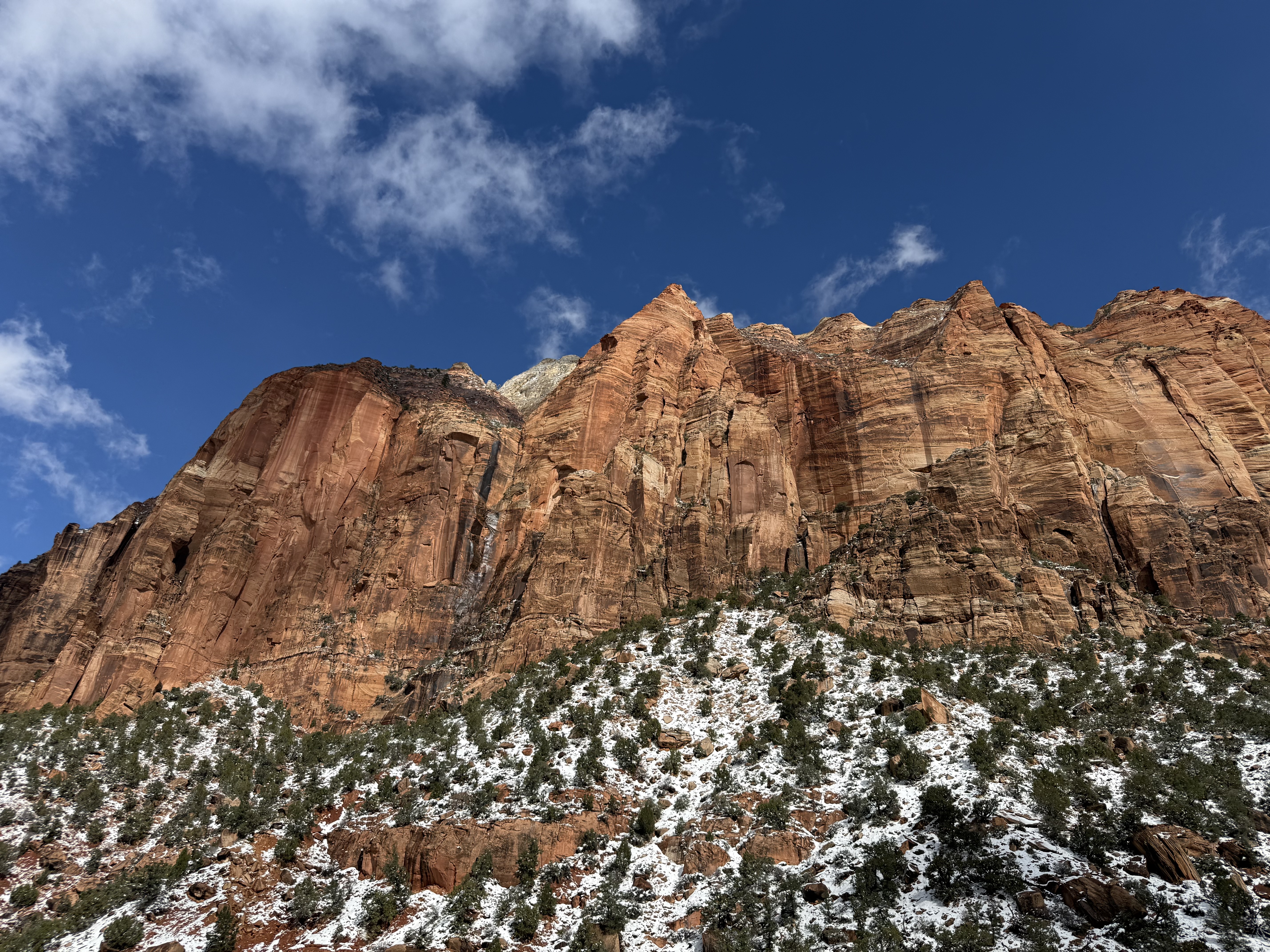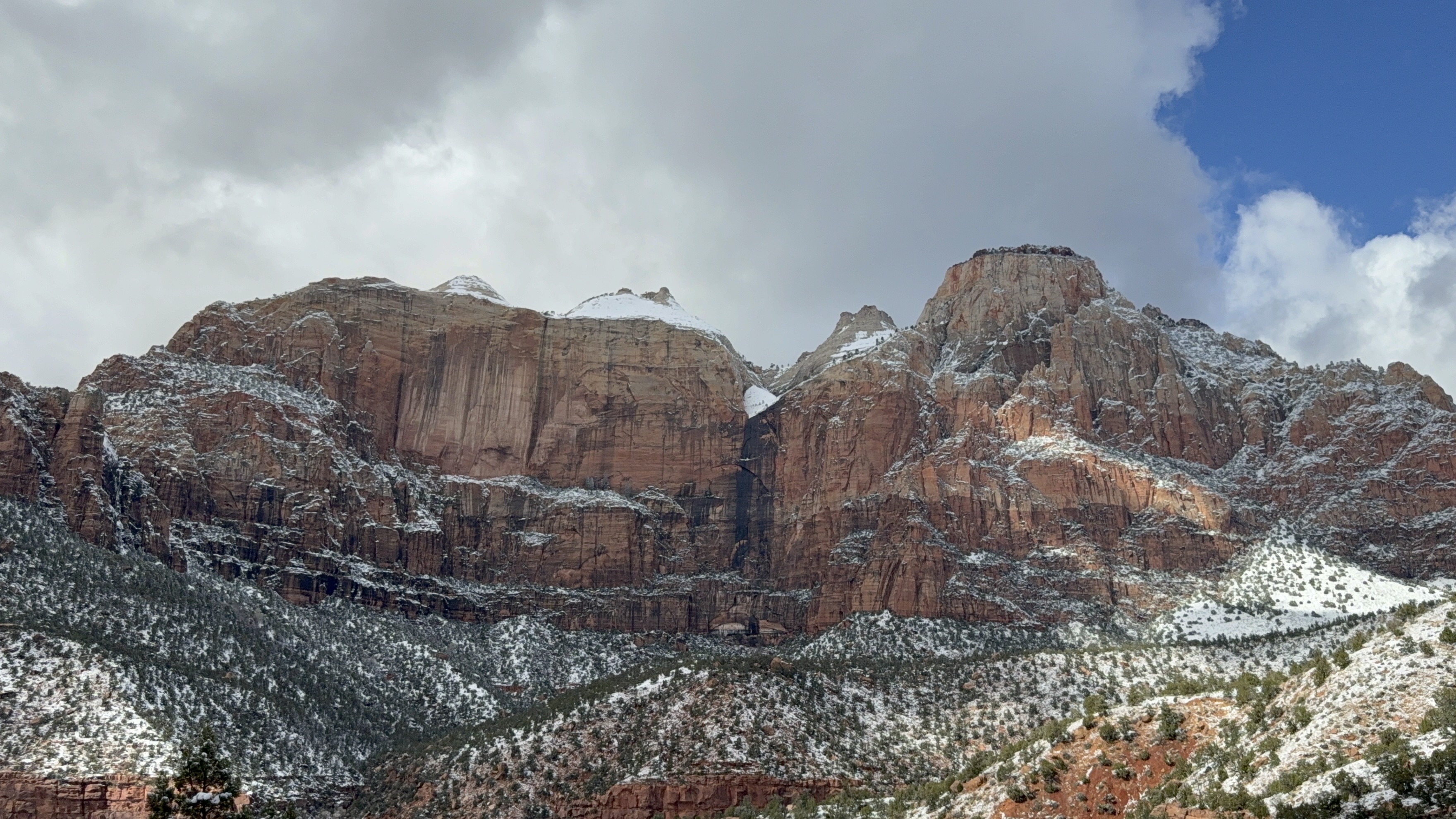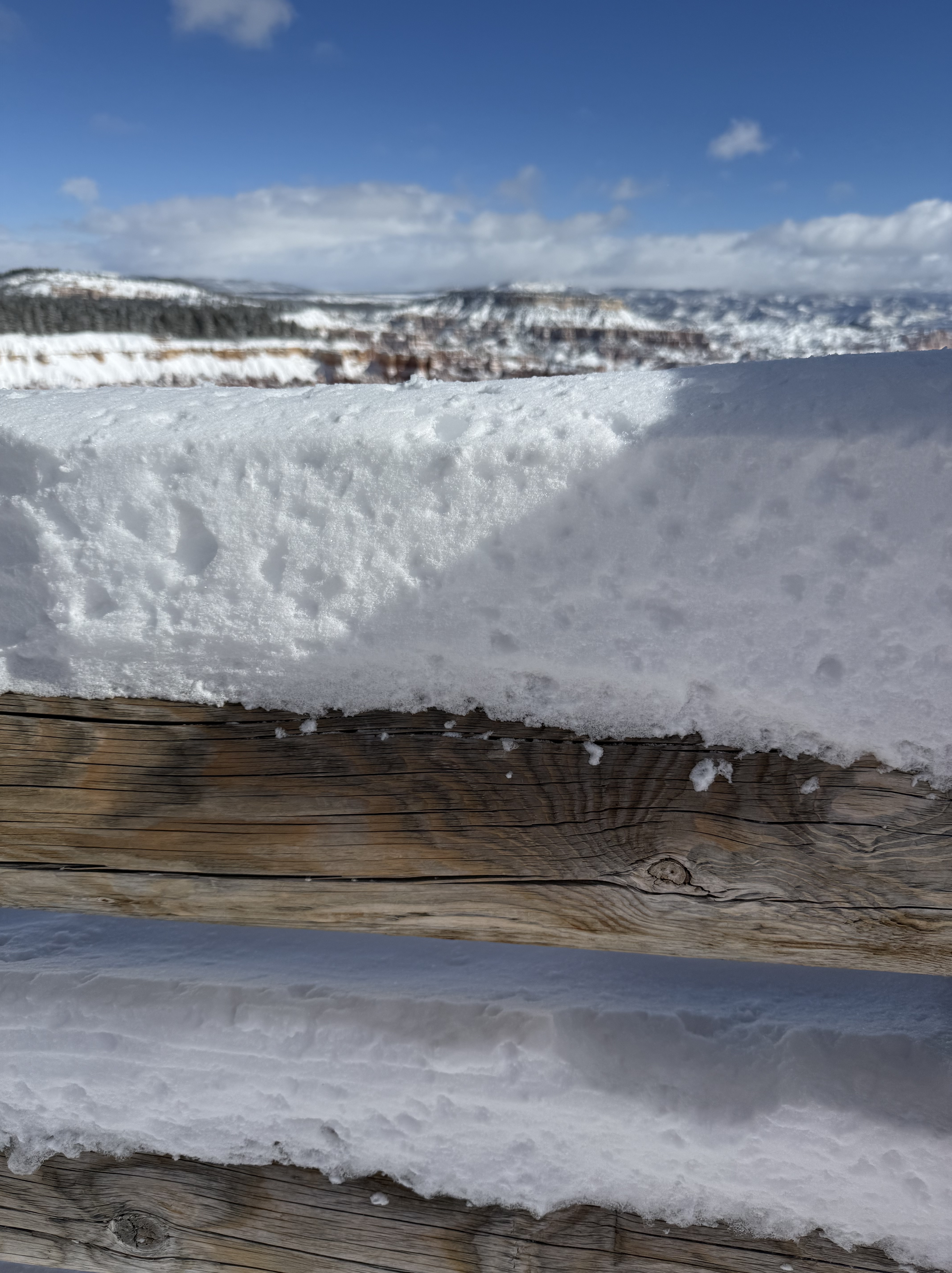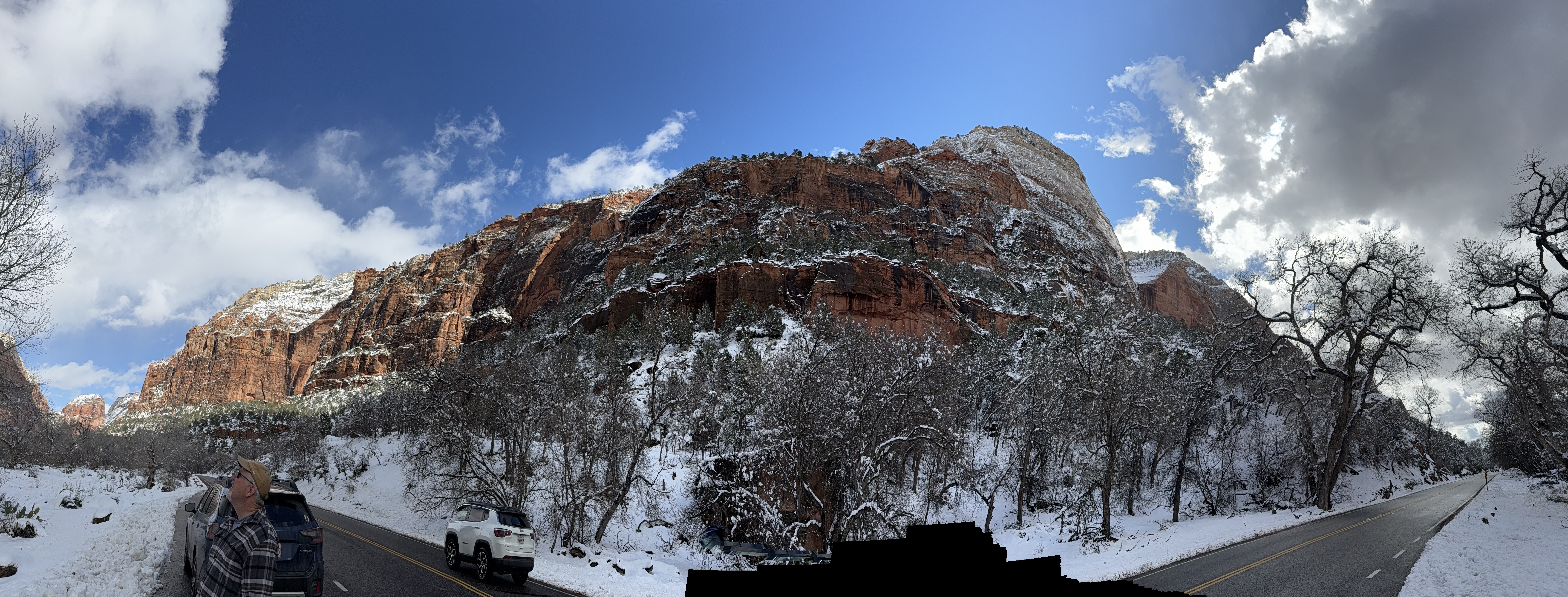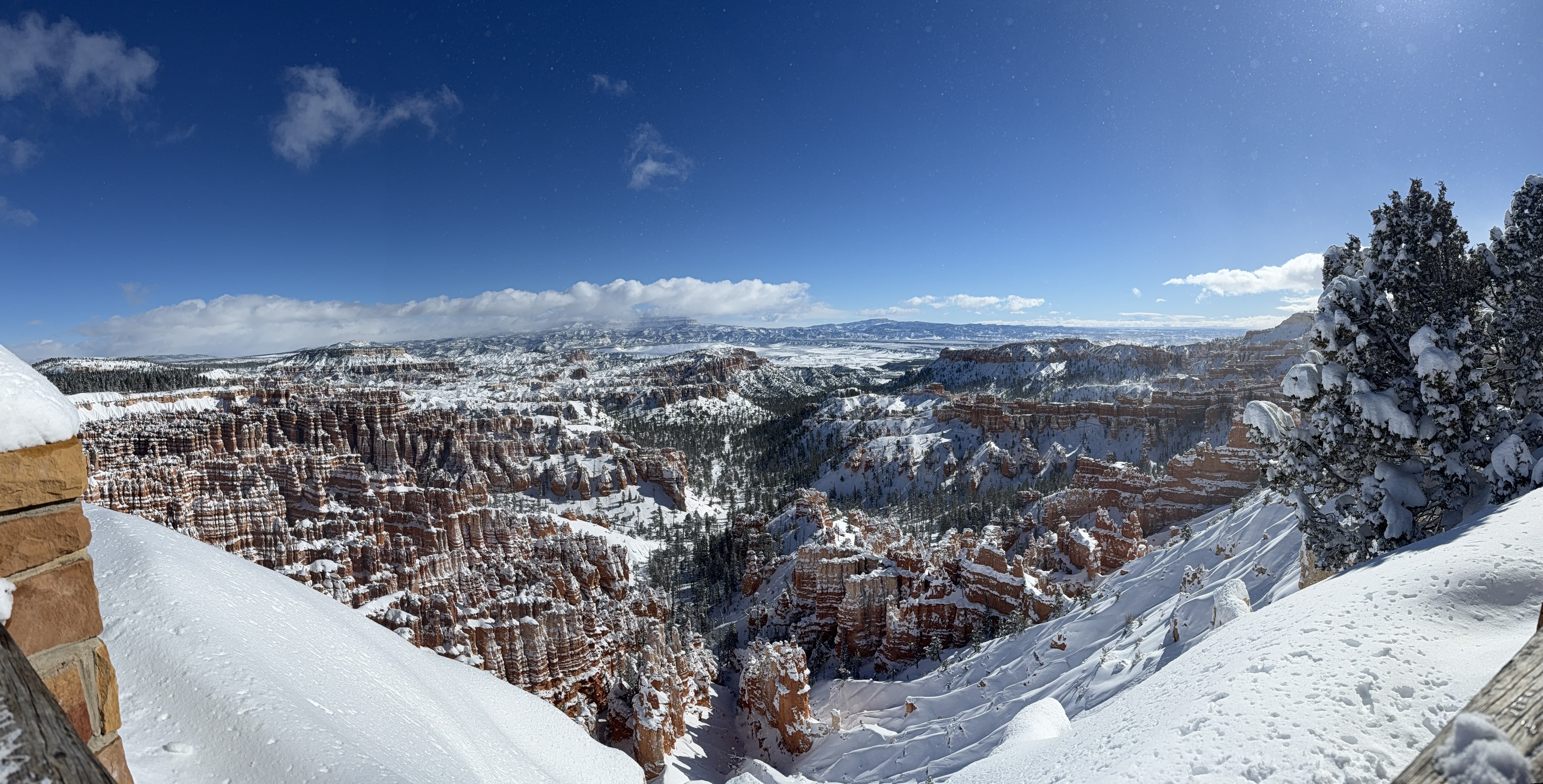 Total miles driven: 1,152We woke up at about 4:00 AM to snow plows dealing with 10″-12″ of new snow. Not an ideal alarm clock and certainly not an ideal wake up time! But, the snow had stopped falling, and we were happy to see that it was being dealt with! We failed to fall back asleep, so we had an early breakfast. The hotel offers a full hot breakfast buffet with the room; a pleasant change from the usual cold cereal and yogurts found with most hotel continental breakfasts. By the time we were done with breakfast, the snow plows were done, and the sun was shining and the sky was clear blue with very few clouds! We headed back into the park to see the views unobstructed. The road was again well plowed, but the maintenance staff was still running bobcats with snowblowers to clear some of the paths. We had the amphitheater viewpoints all to ourselves for a while! And as stunning as the views were yesterday, they were incredible today in the sun. We were able to see out over the plateaus in the distance, and the hoodoos shimmered with the fresh snow that had collected in the crevices. By about 10:00 AM, we decided to head towards Zion National Park, and hope the roads were clear.