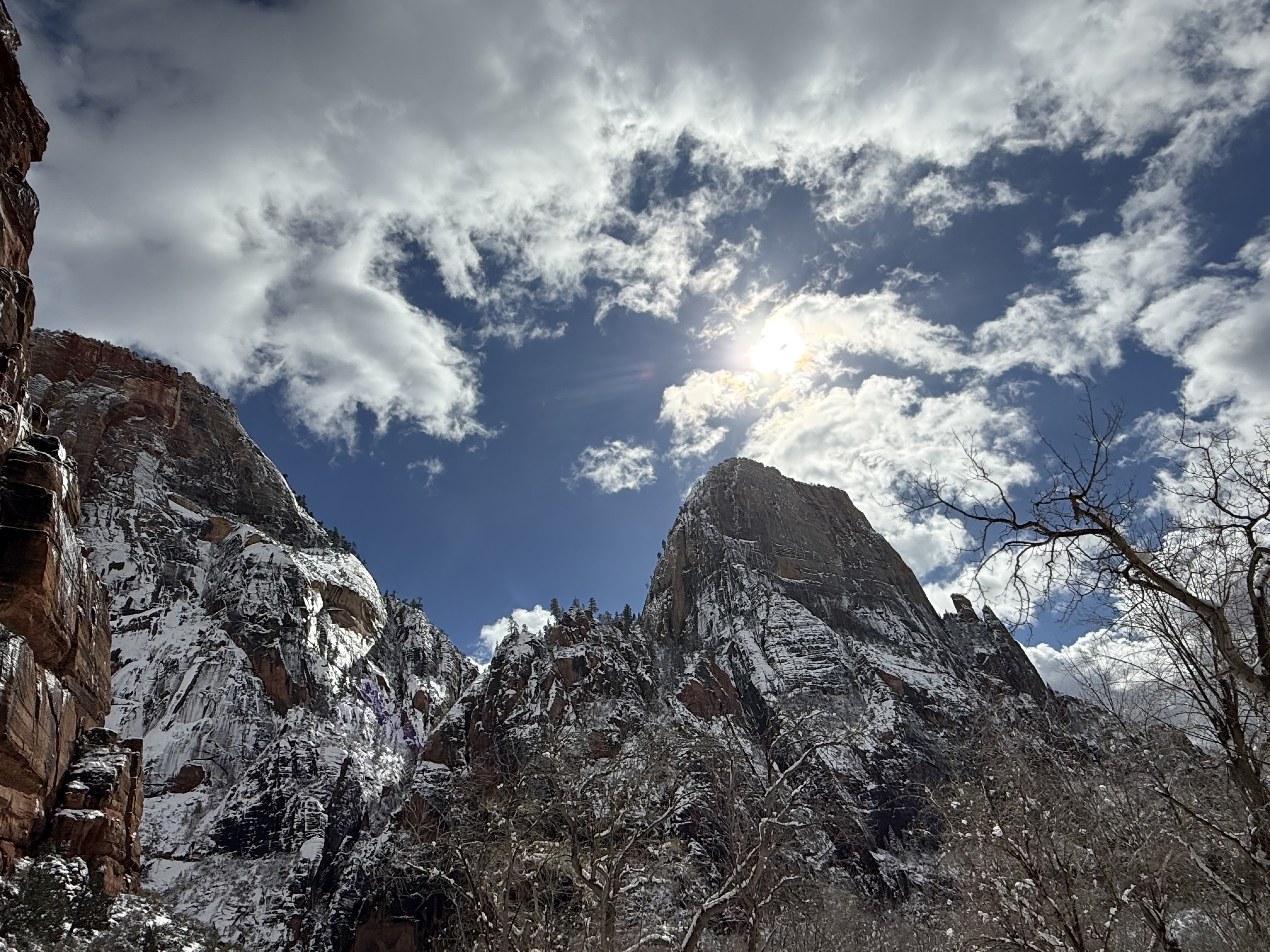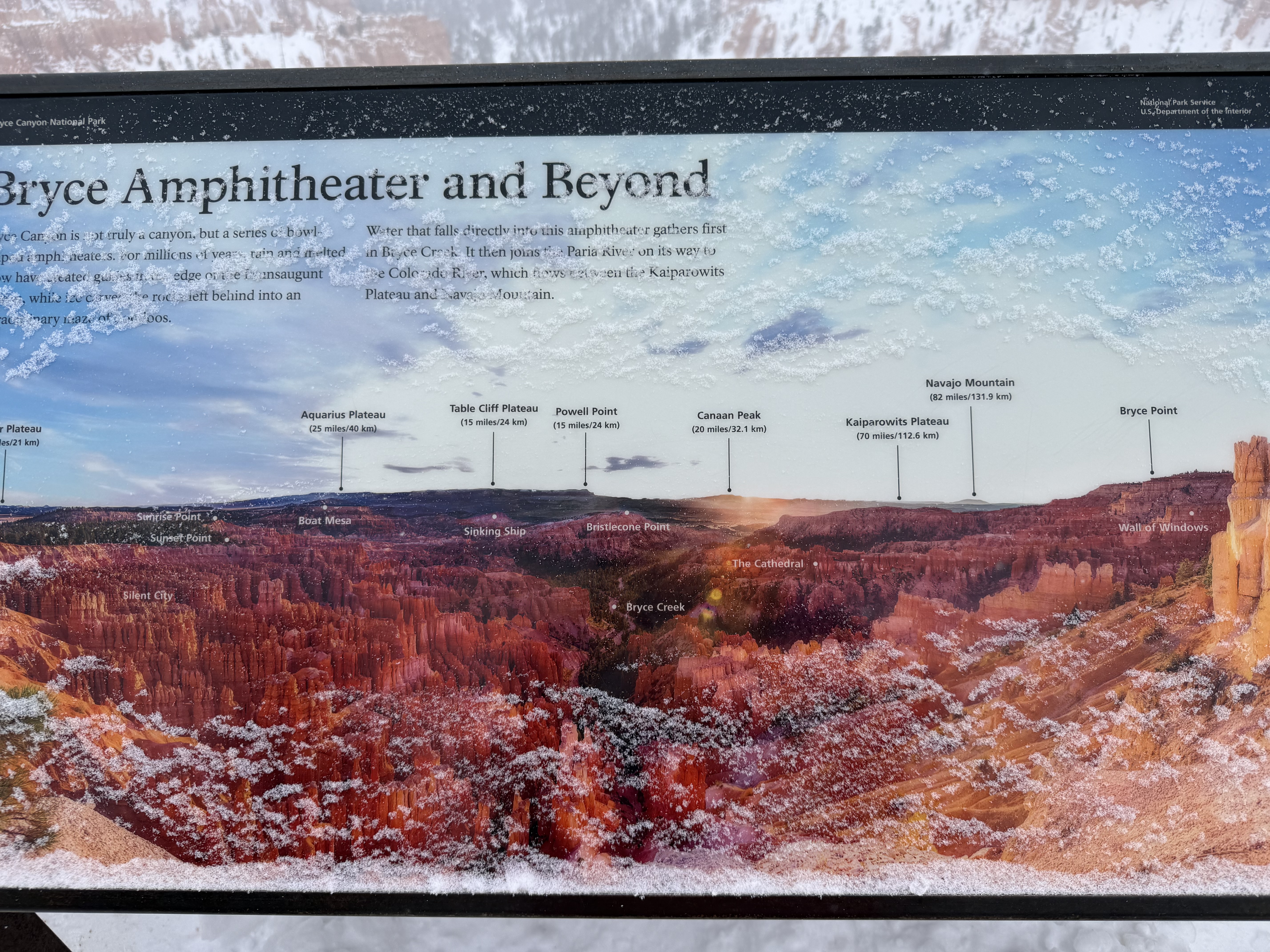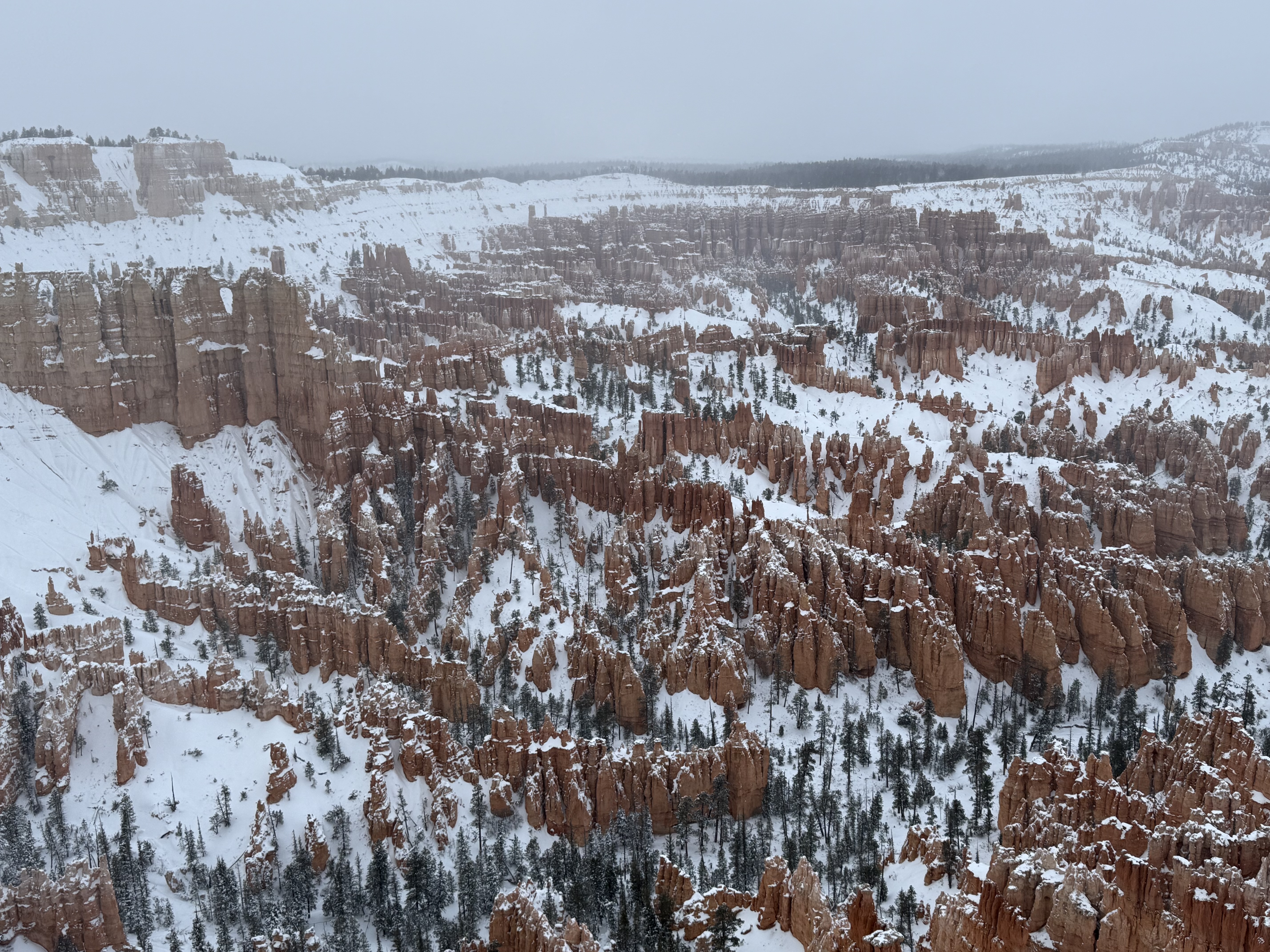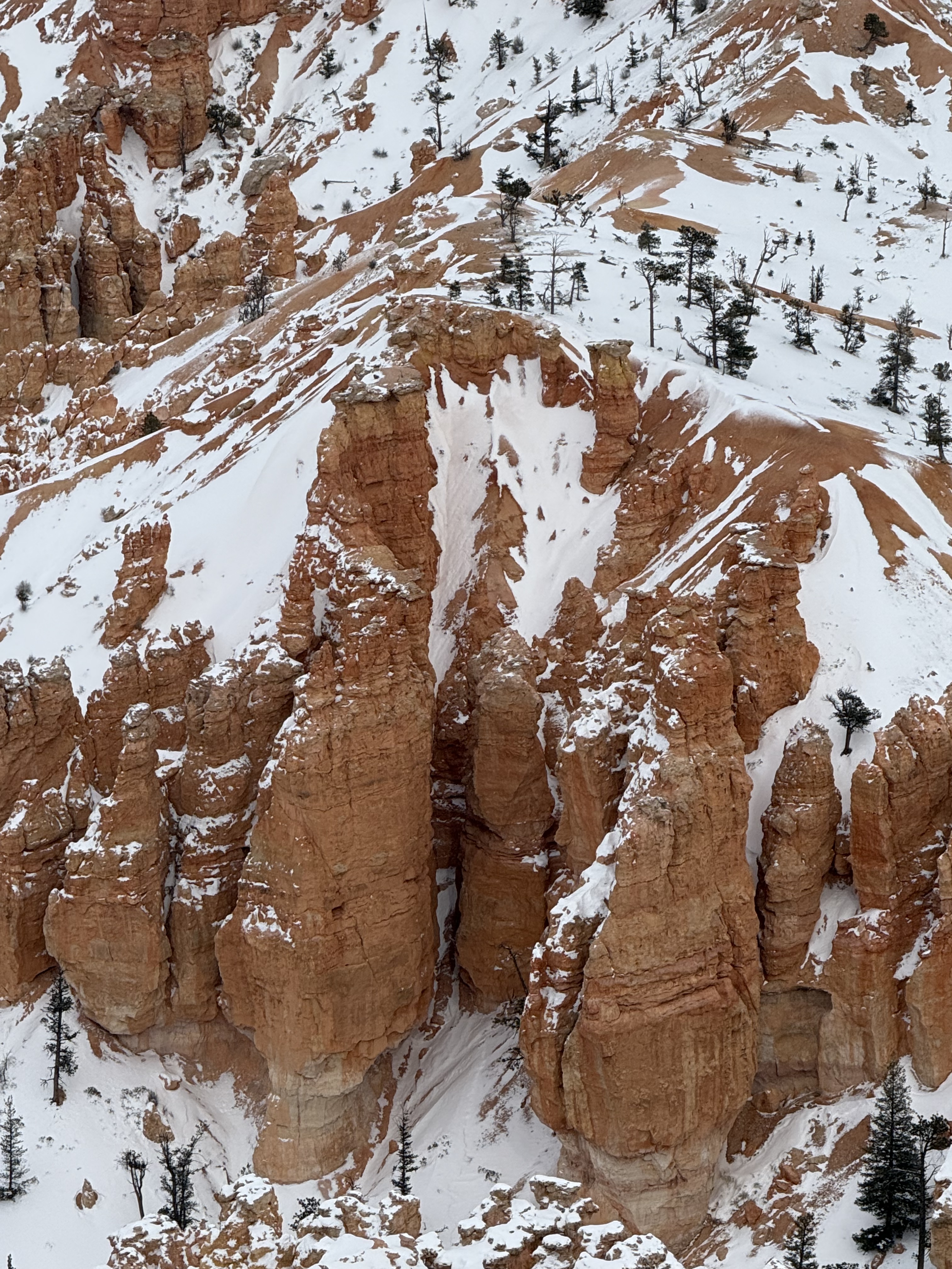 Total miles driven: 1,152We woke up at about 4:00 AM to snow plows dealing with 10″-12″ of new snow. Not an ideal alarm clock and certainly not an ideal wake up time! But, the snow had stopped falling, and we were happy to see that it was being dealt with! We failed to fall back asleep, so we had an early breakfast. The hotel offers a full hot breakfast buffet with the room; a pleasant change from the usual cold cereal and yogurts found with most hotel continental breakfasts. By the time we were done with breakfast, the snow plows were done, and the sun was shining and the sky was clear blue with very few clouds! We headed back into the park to see the views unobstructed. The road was again well plowed, but the maintenance staff was still running bobcats with snowblowers to clear some of the paths. We had the amphitheater viewpoints all to ourselves for a while! And as stunning as the views were yesterday, they were incredible today in the sun. We were able to see out over the plateaus in the distance, and the hoodoos shimmered with the fresh snow that had collected in the crevices. By about 10:00 AM, we decided to head towards Zion National Park, and hope the roads were clear.