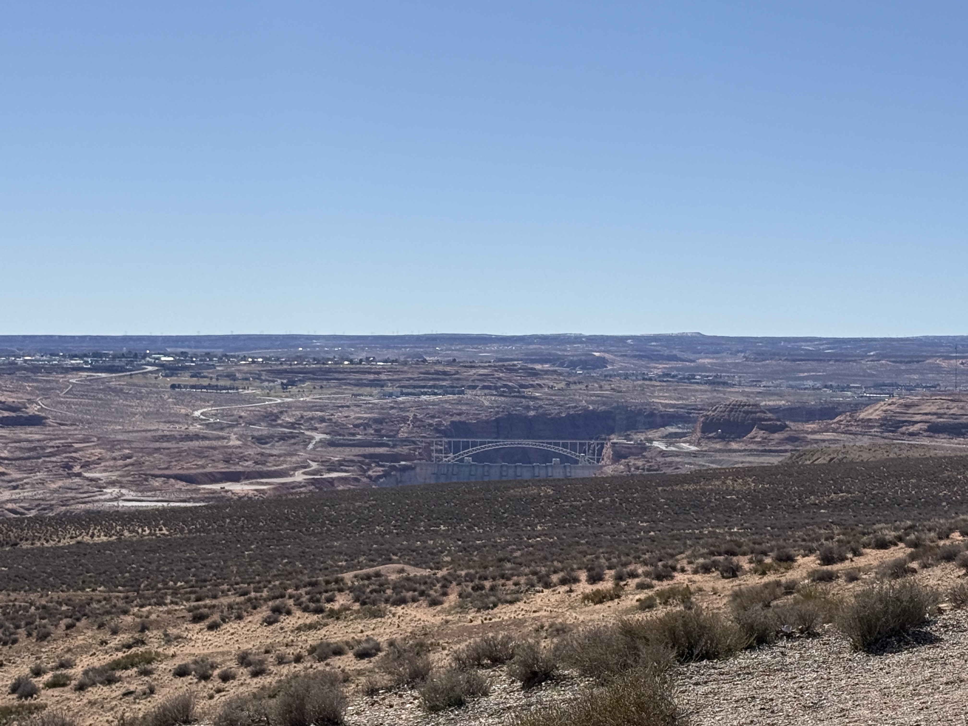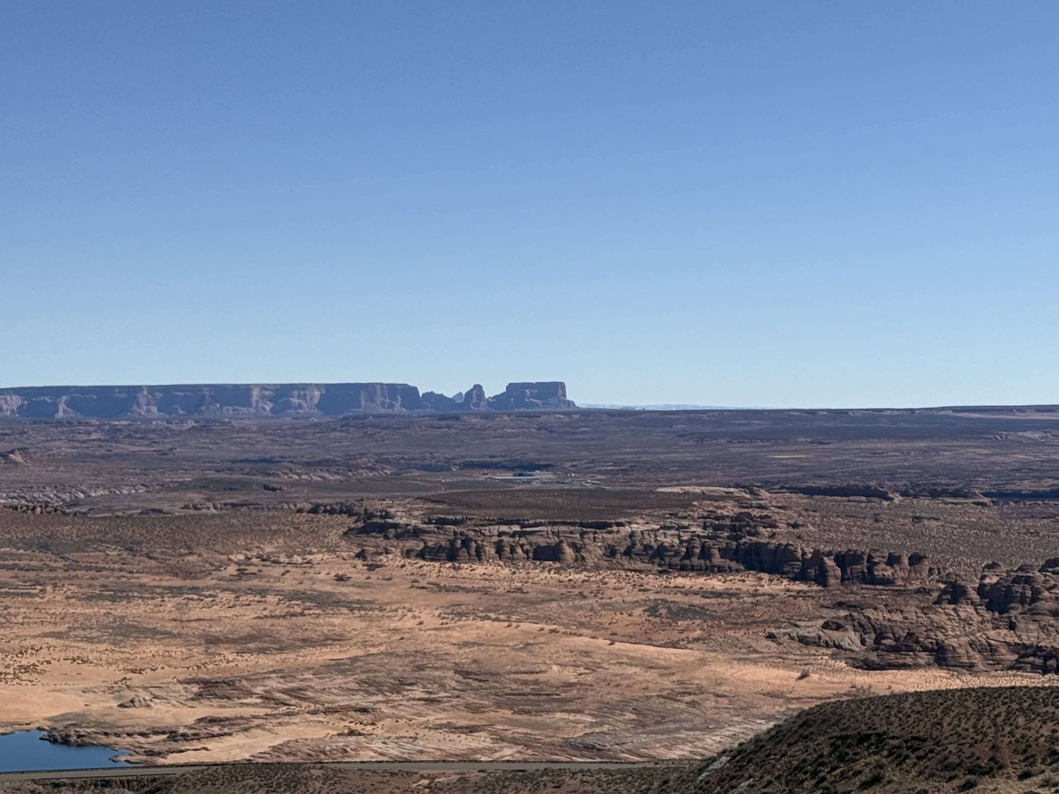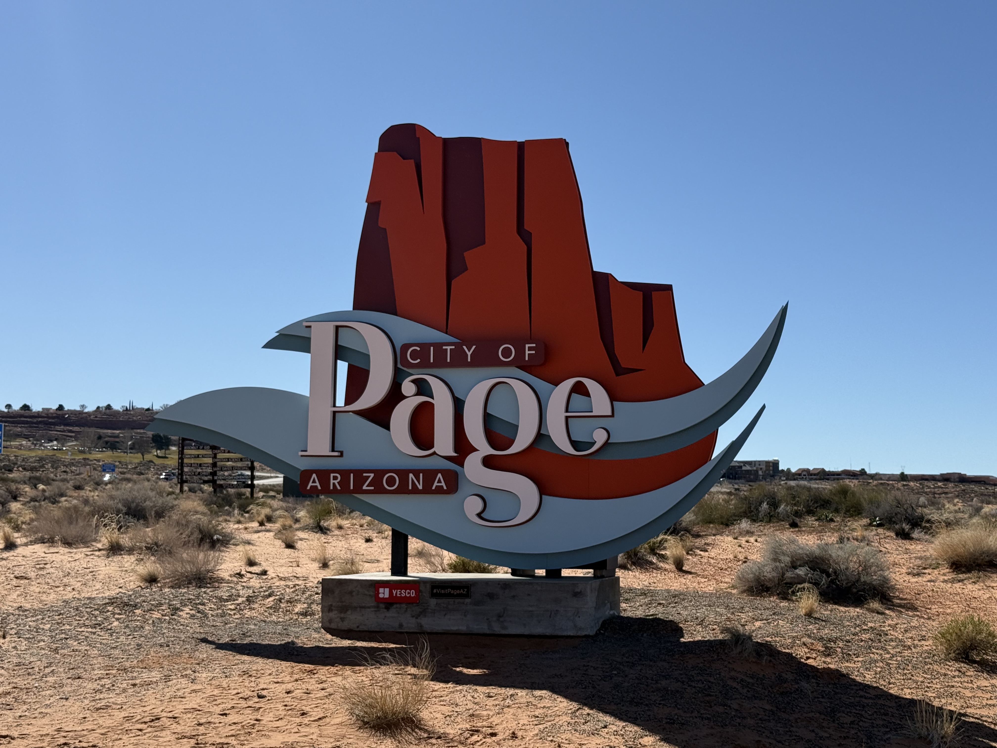 We made an extended stop in Page, AZ. There was an overlook just outside of town with sweeping views of the Glen Canyon. There was a very vocal, and huge, raven hanging out near the gazebo, It was making sounds unlike the ravens we have at home; kind of a clucking sound. We stopped at the Shell gas station, which is immediately adjacent to an area with a natural amphitheater and a arch/cave area. It’s an easy hike up to the cave and around to the amphitheater, and makes for some fun photos.