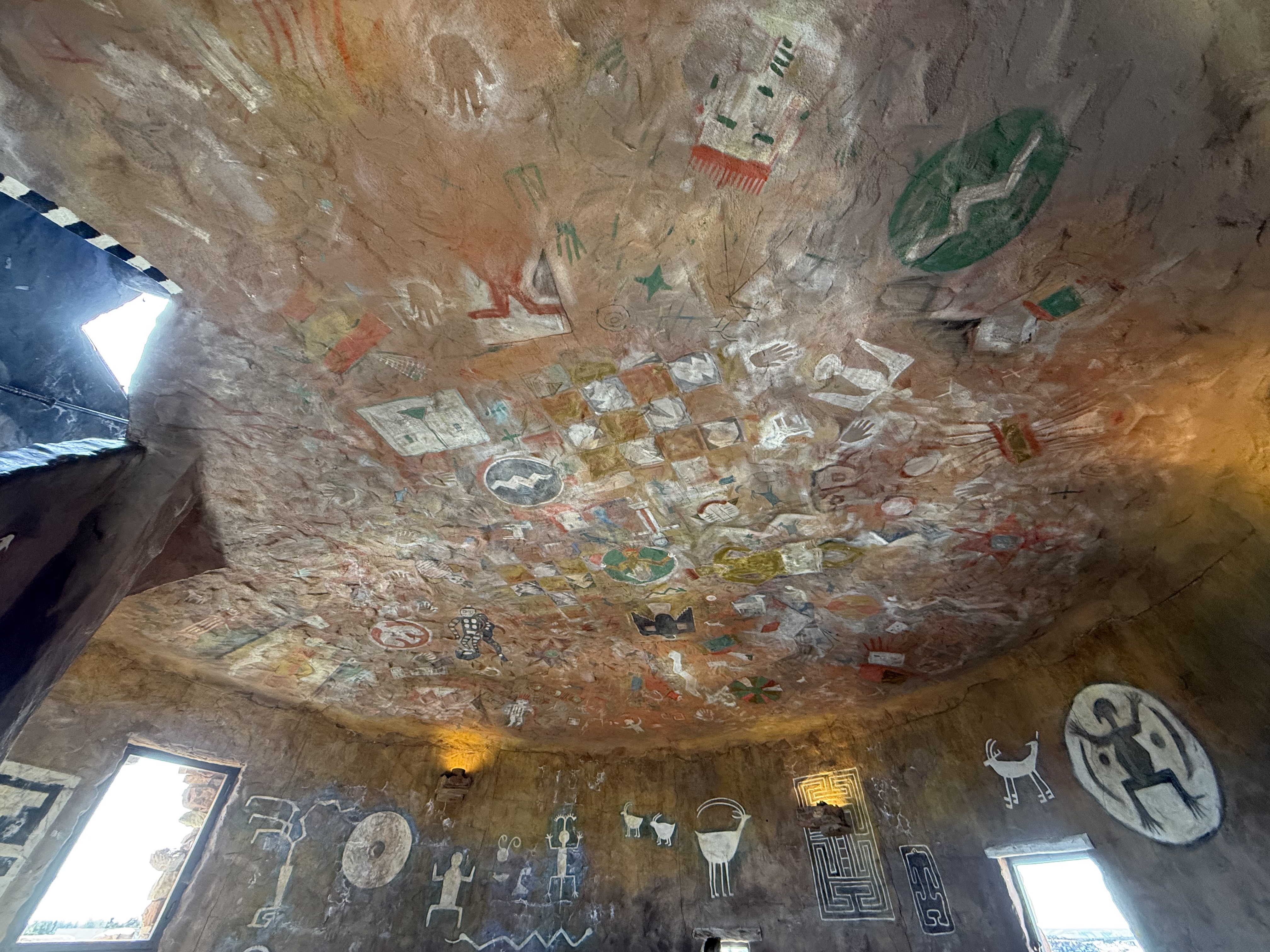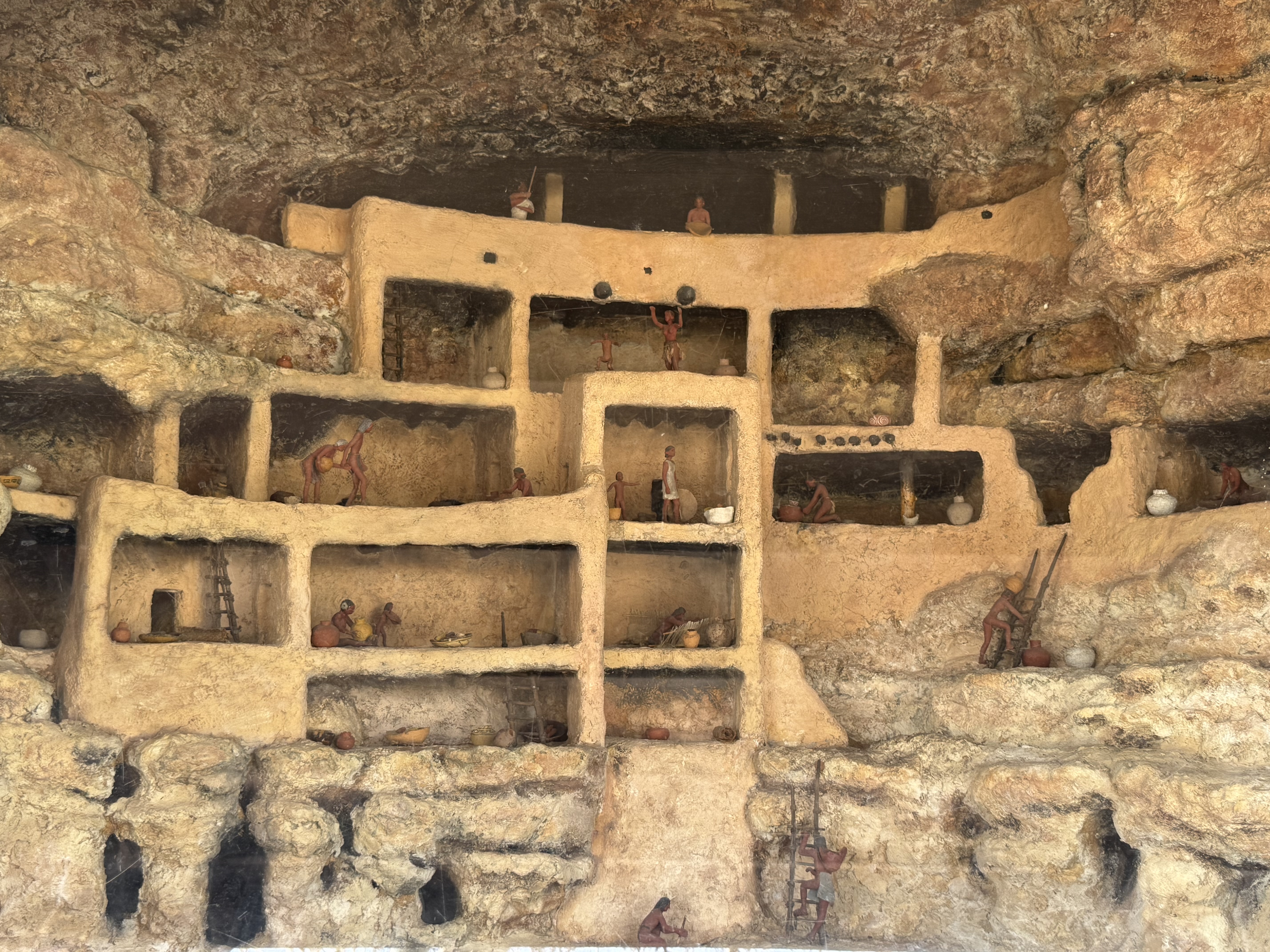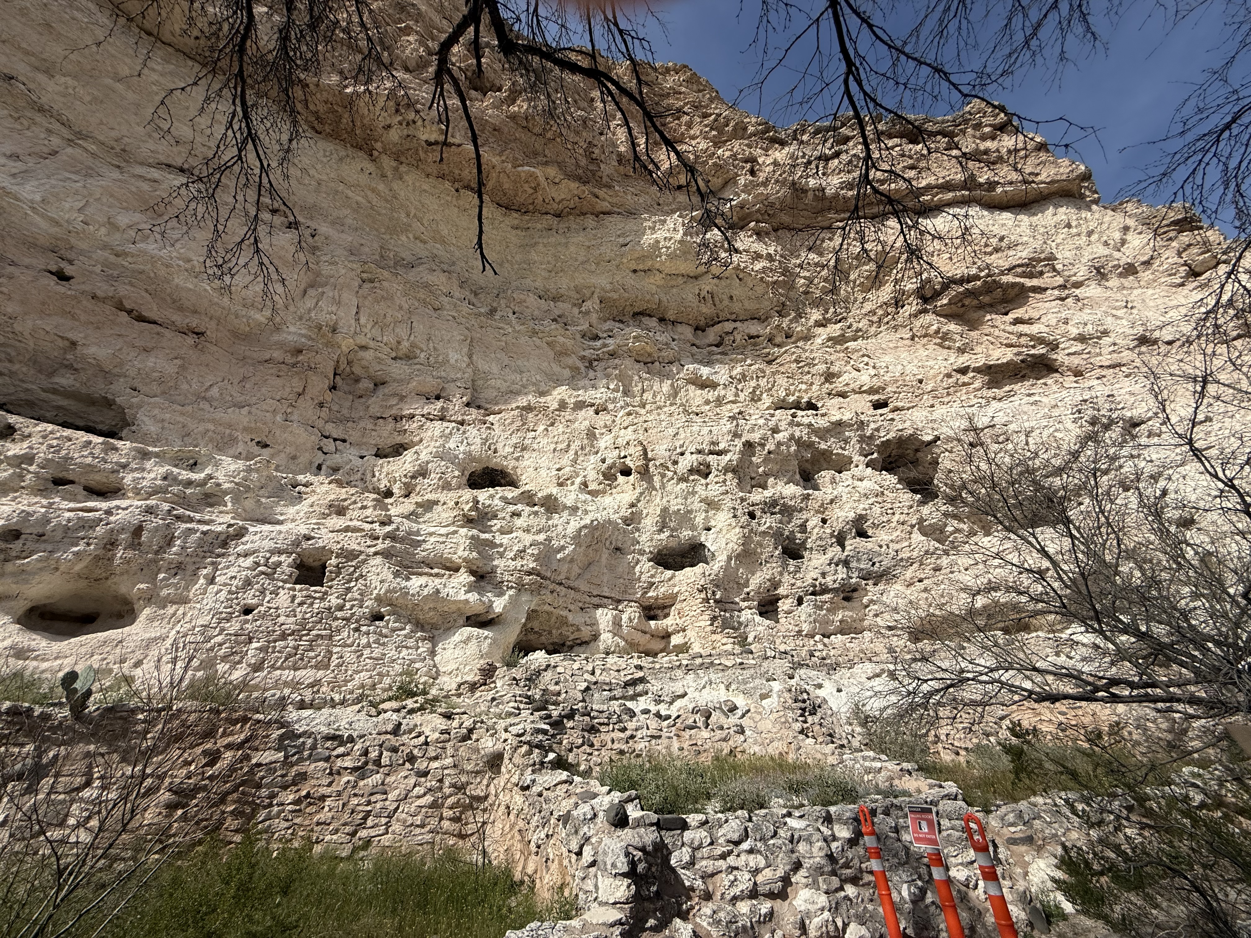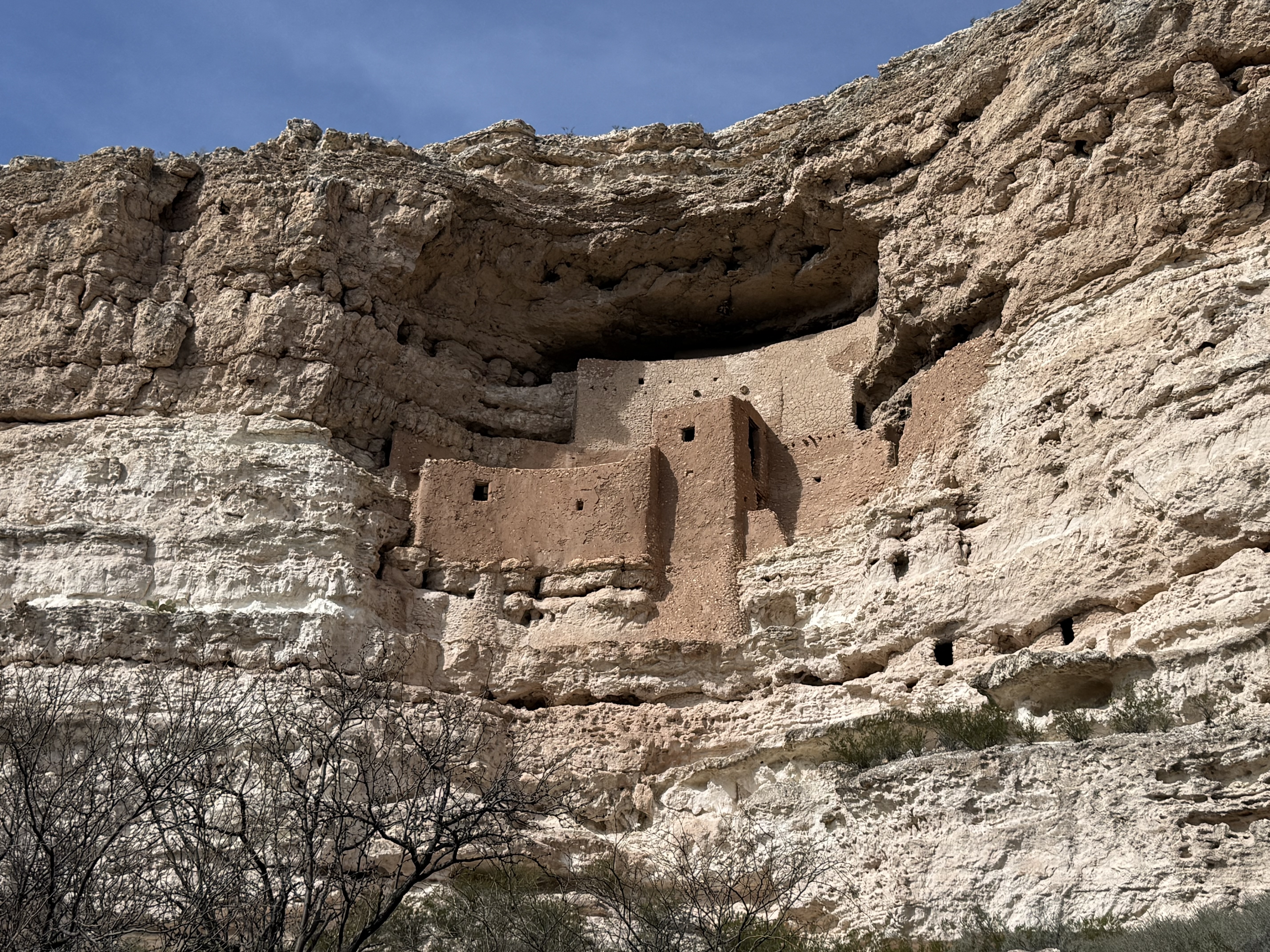 We continued down the highway to Montezuma’s Castle National Monument. A quick stop in the visitor center resulted in another stamp in the National Park Passport. There is a short paved trail walk around the location to view the two structures build into the cliff face. These ancient “apartments” are engineering marvels! Apparently up until about 1951, visitors were allowed to climb ladders up into the structures, but due to concerns about damage to the artifacts and the building. The National Park Service constructed a detailed diorama to demonstrate the rooms inside the structure. A smaller structure farther down the trail is composed of cave-like rooms carved into the rock.