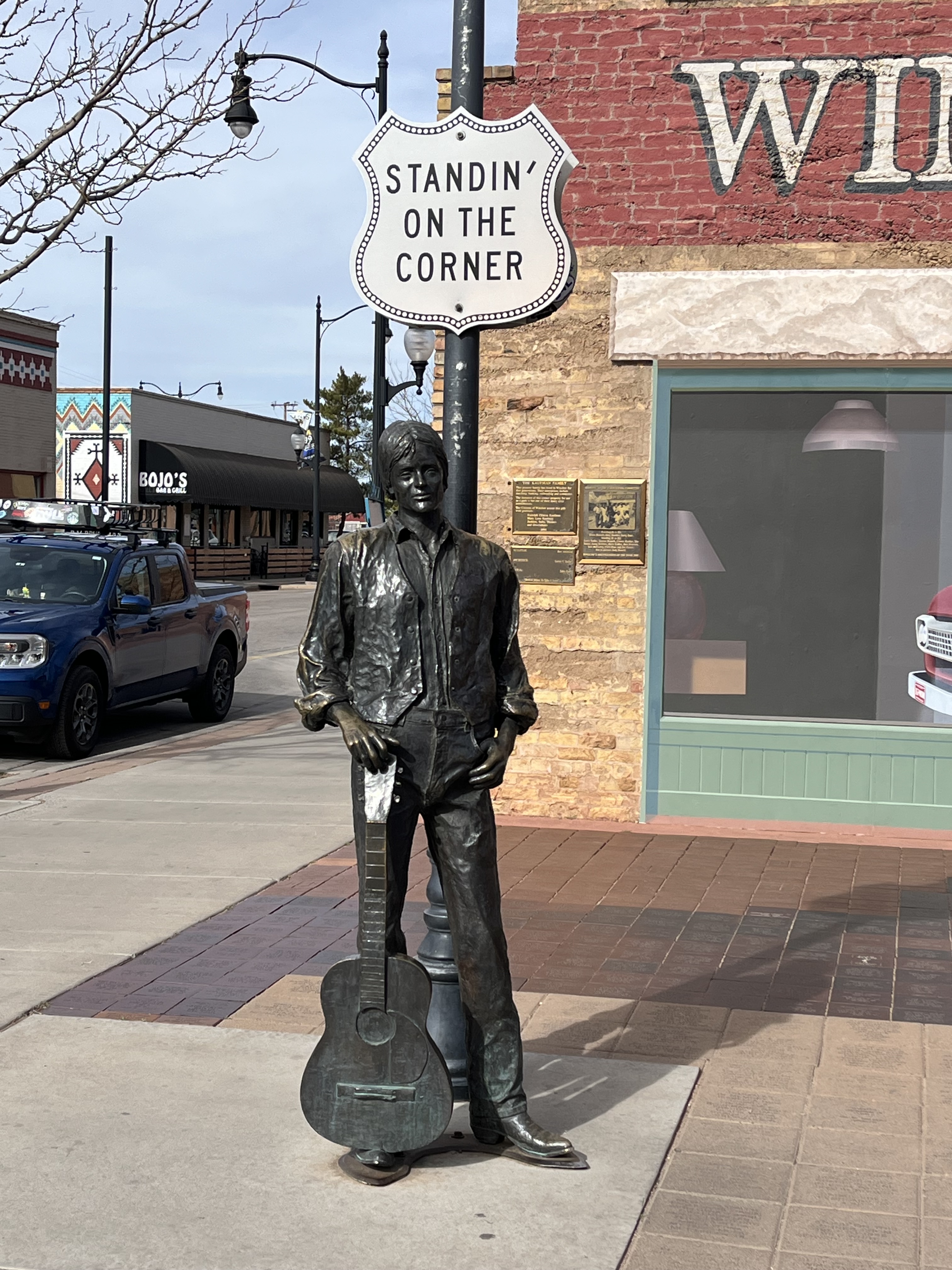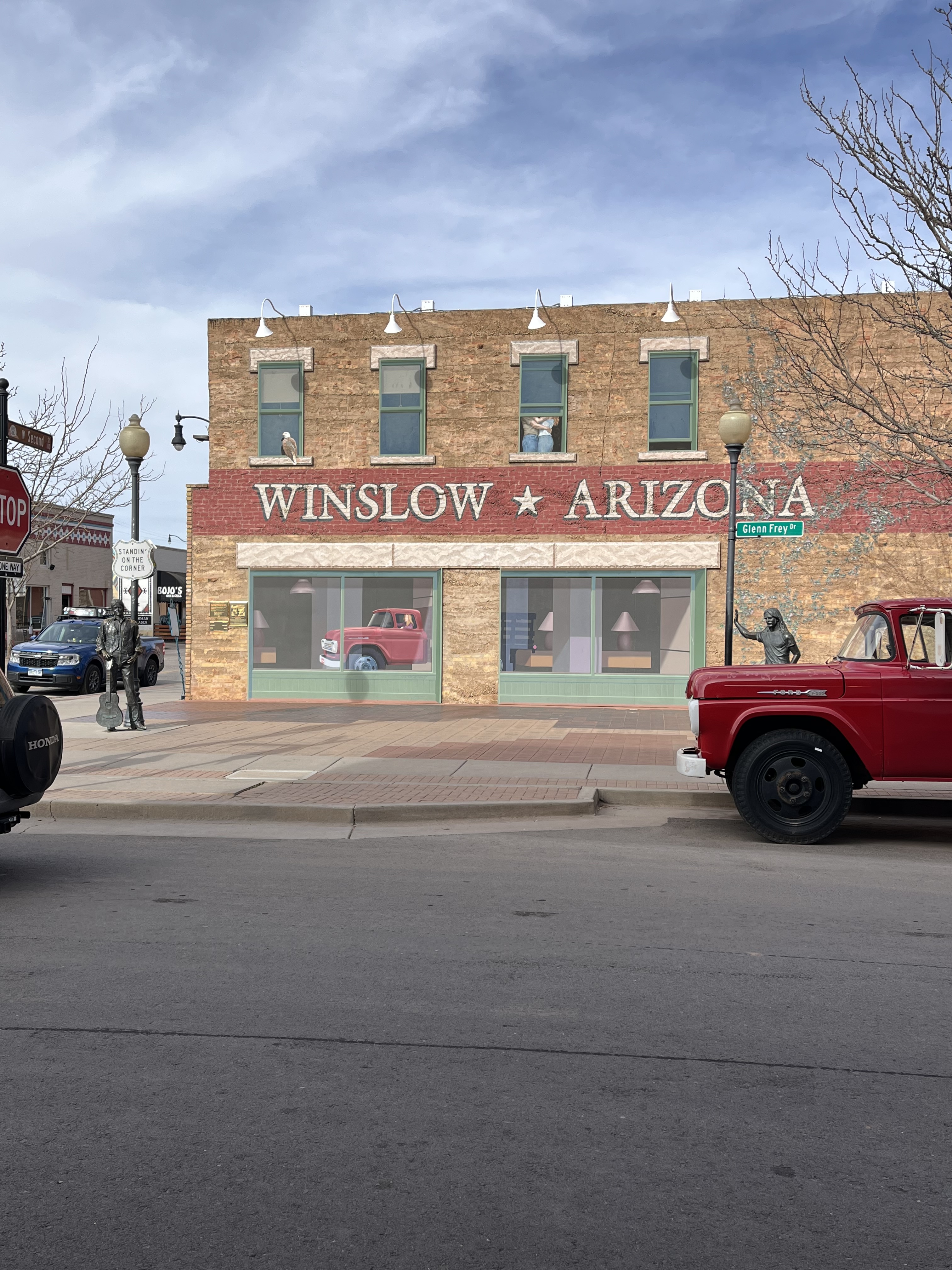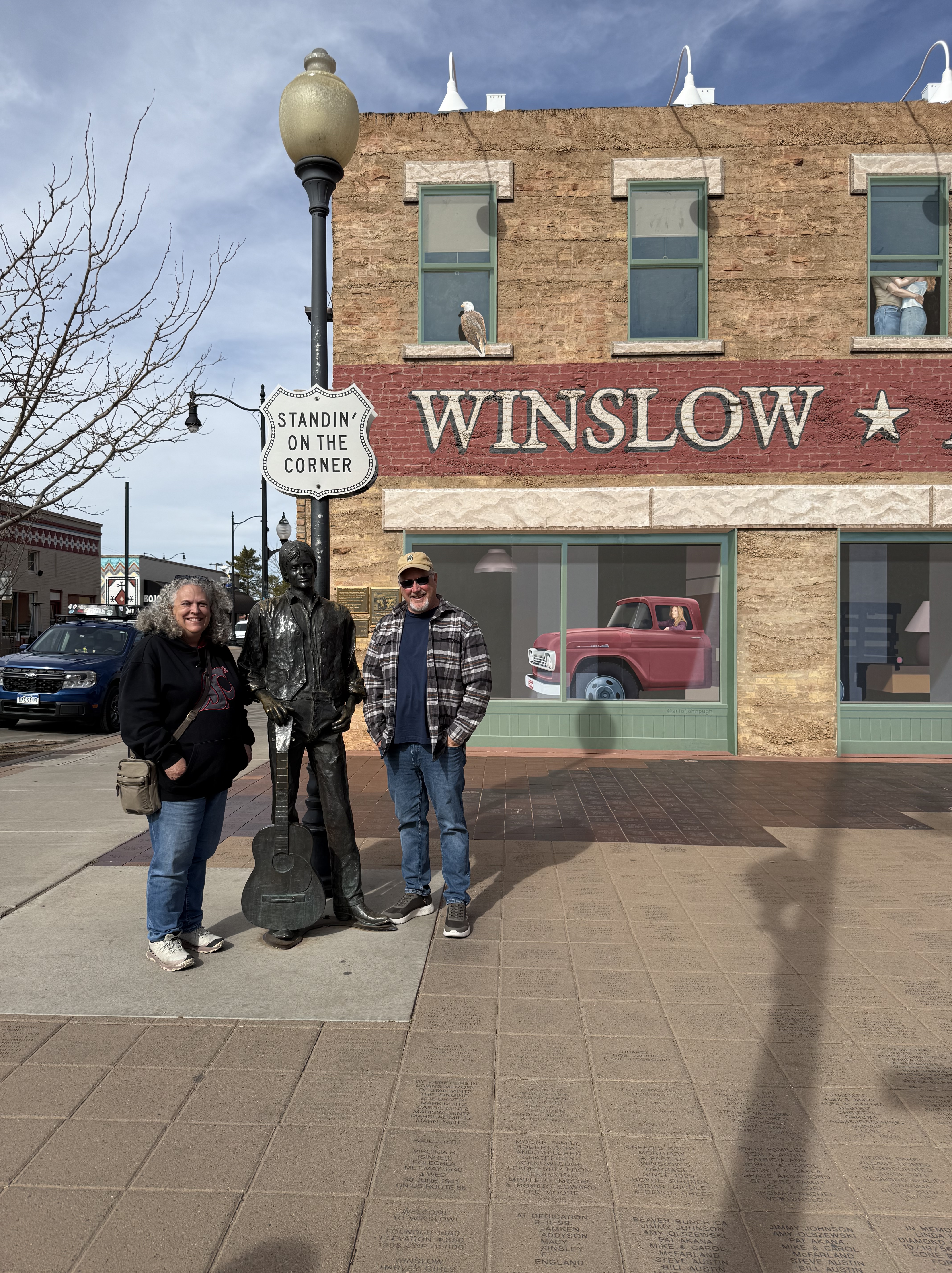 Mileage driven to date: Yeah…I forgot again.Today we was about checking things off our list! First stop was Winslow, AZ, a small town on historic Route 66 that was made famous by inclusion in the song, “Take It Easy” by the Eagles in 1972. We stopped at the “Take It Easy” park, and took photos with the statues of Glenn Fry and the flatbed Ford while ‘standing on the corner.’ It was a fun, quick stop for this Eagles fan!