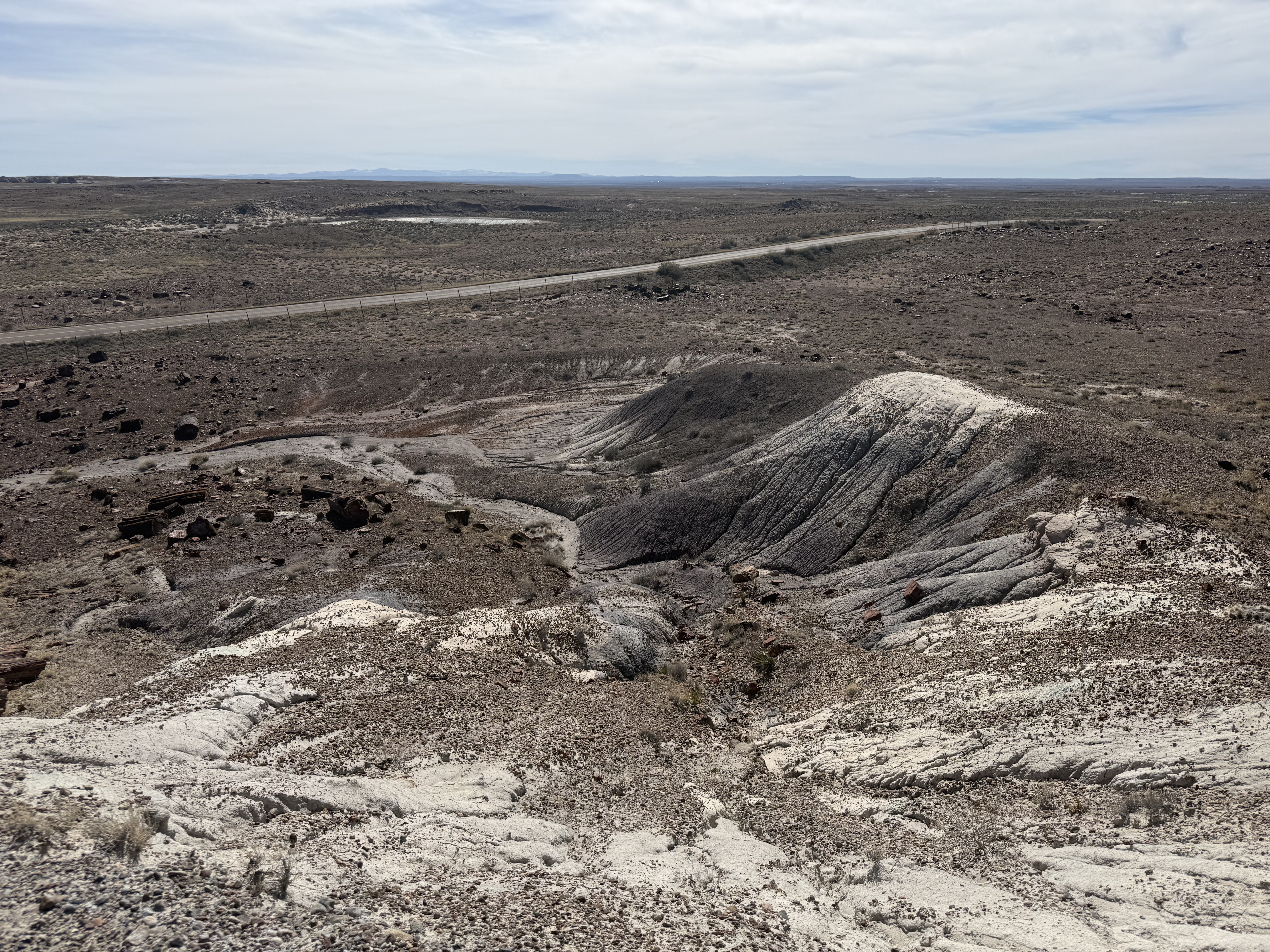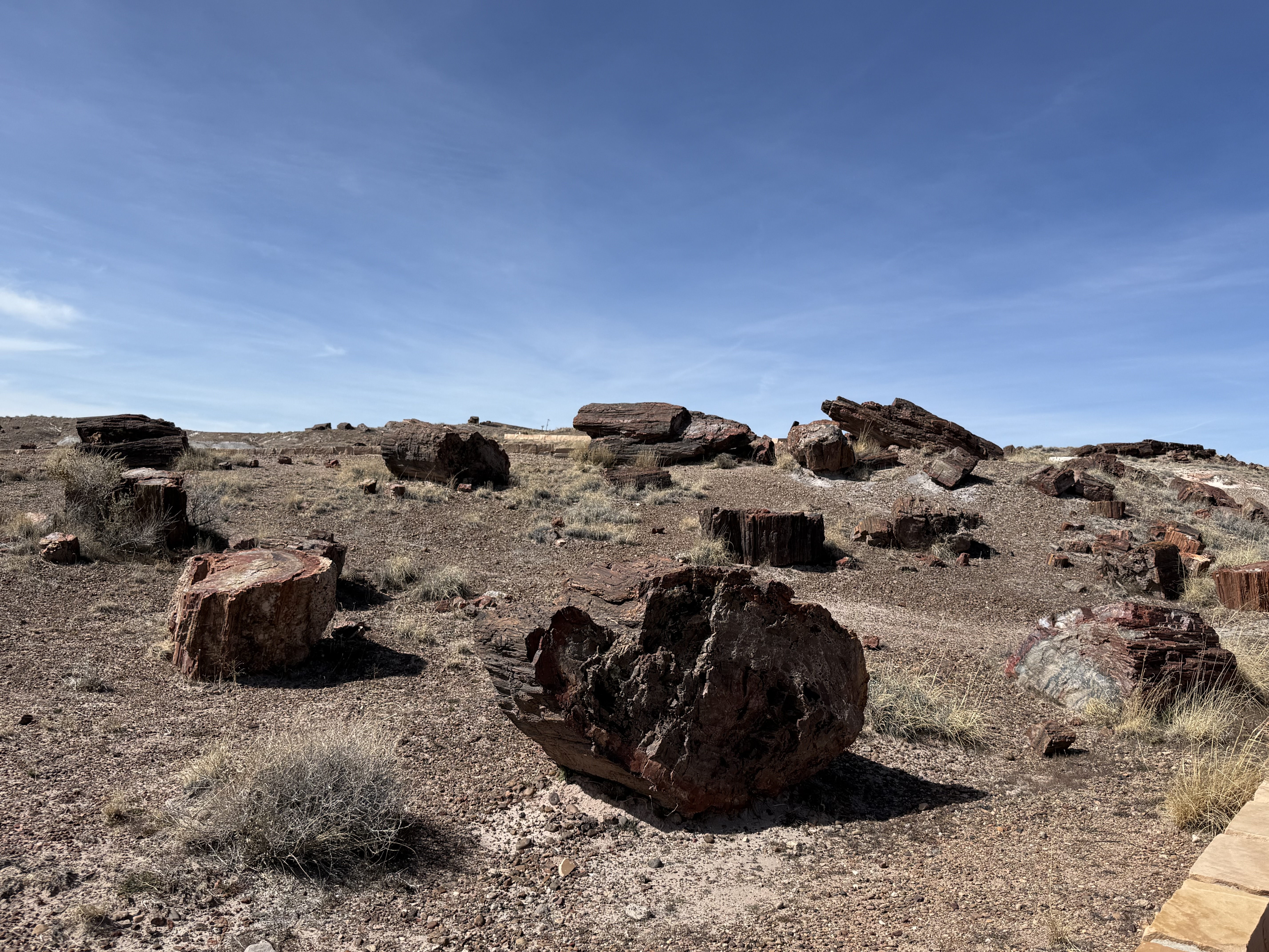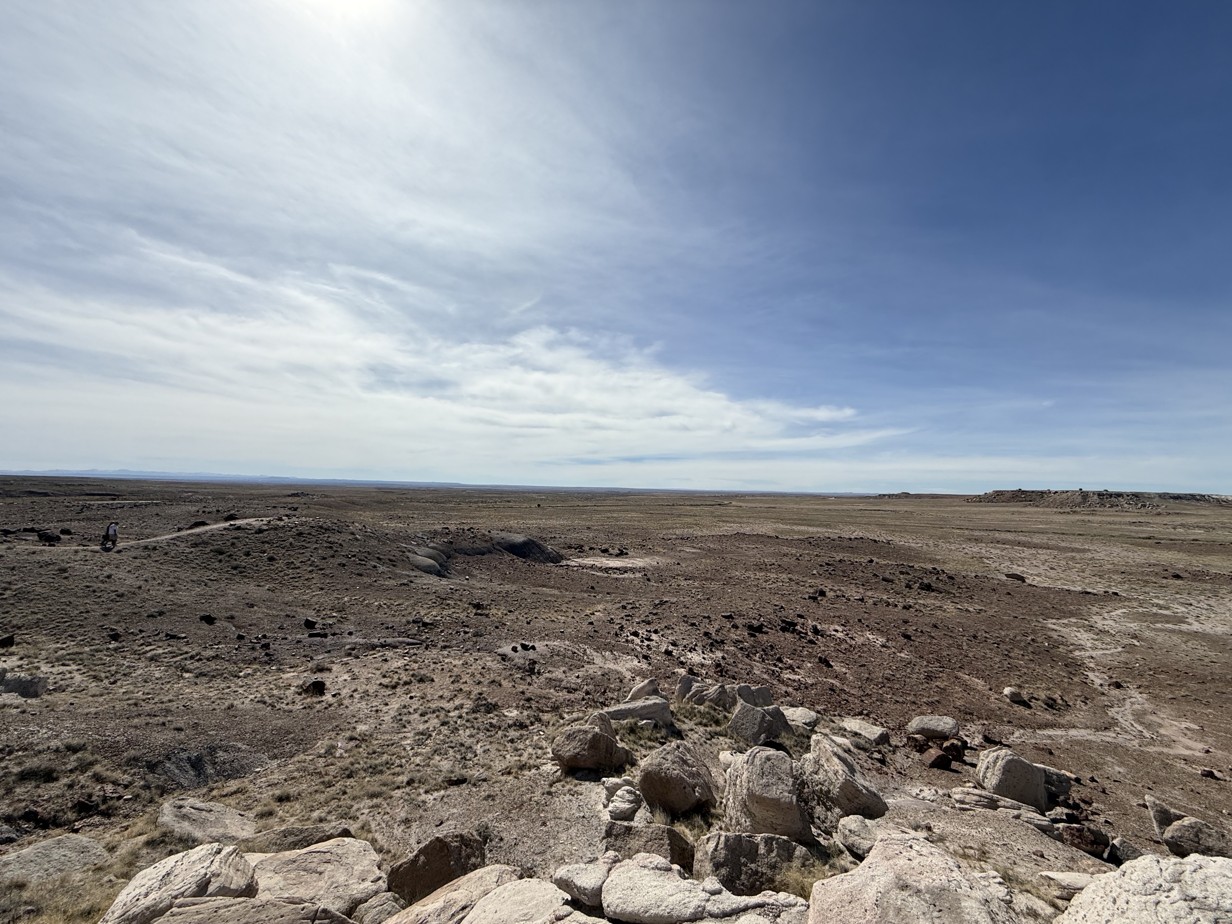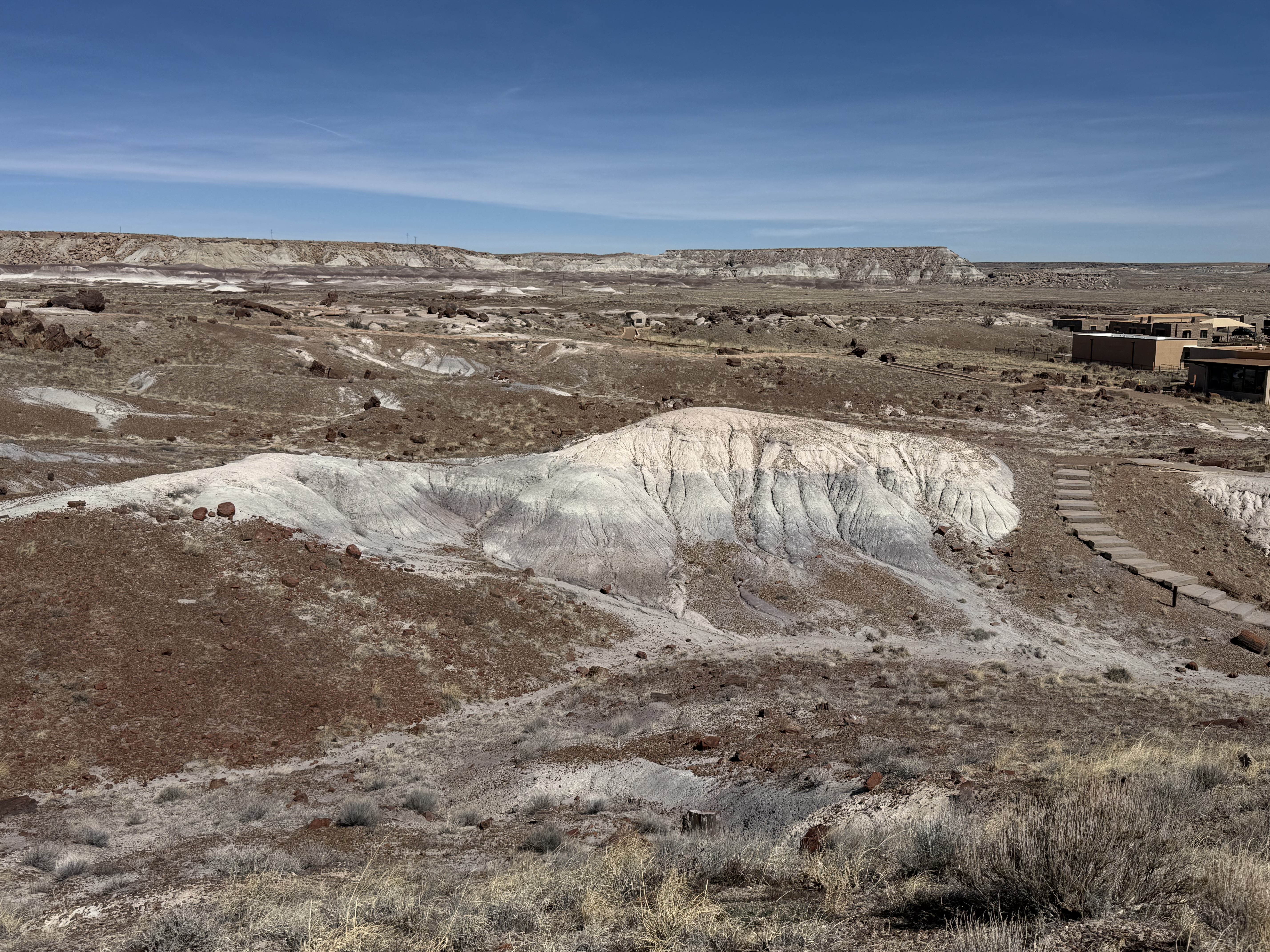 We continued on to the Petrified Forest National Park. This is a less visited National Park, but is still quite interesting and filled with some incredible sights. We entered from the Holbrook entrance, and stopped at the visitor center for a map and a chat with the rangers. We took a short hike through a large field of petrified trees, and then drove through the scenic drive to view several different areas of the park. One area had a 110′ petrified tree spanning a gully; another was a canyon of sorts that was made up of a collection of large mounds of rock with blue and gray strata. We then drove around through the “Painted Desert” portion of the park, which had numerous viewpoints looking over the deep reds, orange, tan and white rock-hills. It was stunning, and we could imagine that at sunset it would be even more breathtaking. We stopped by the second visitor center and gift shop for the park, and picked up some postcards and a fun sticker of a mountain lion petroglyph. The original petroglyph was on display in the gift shop, and was huge – about 3′ long!