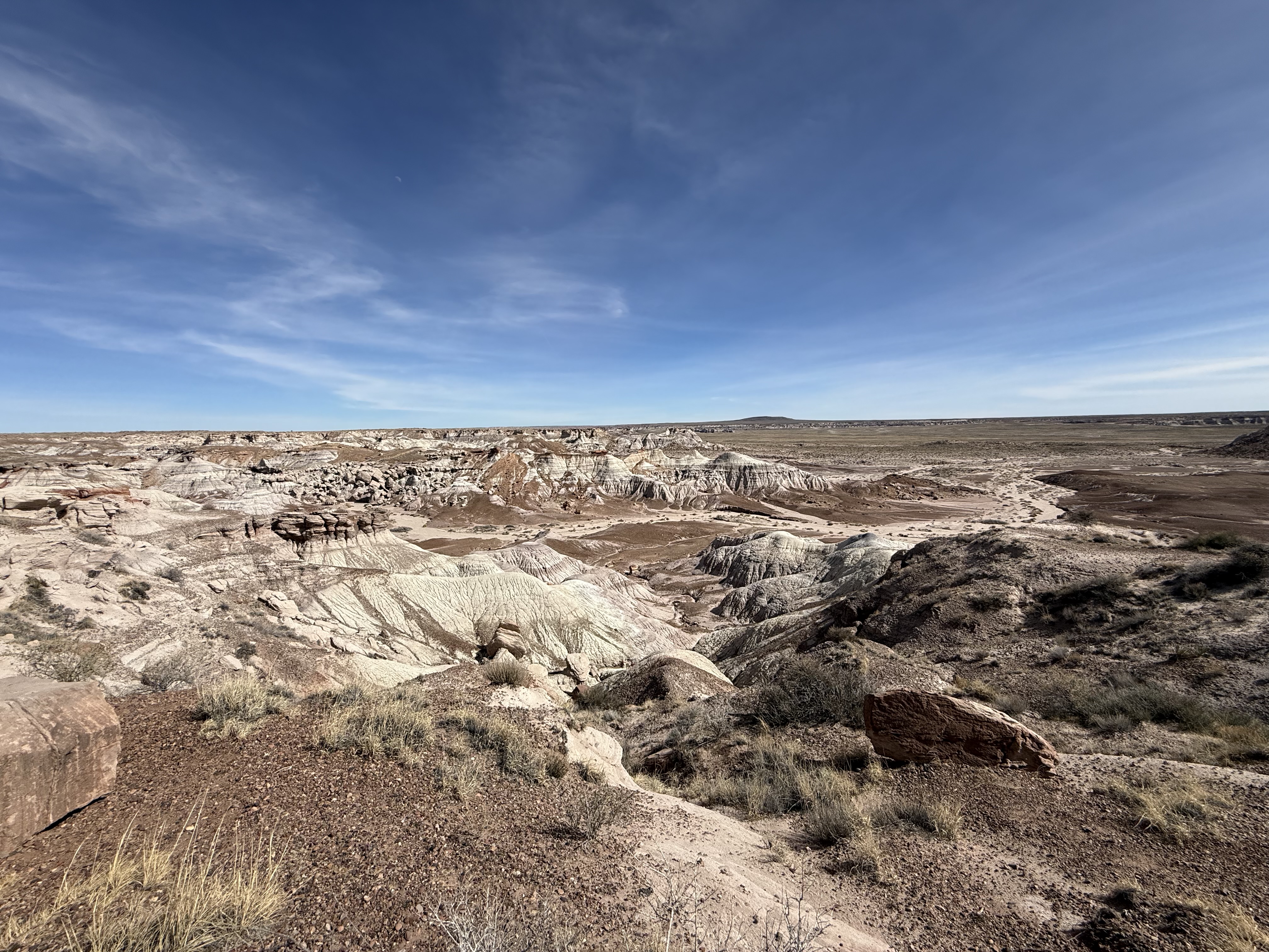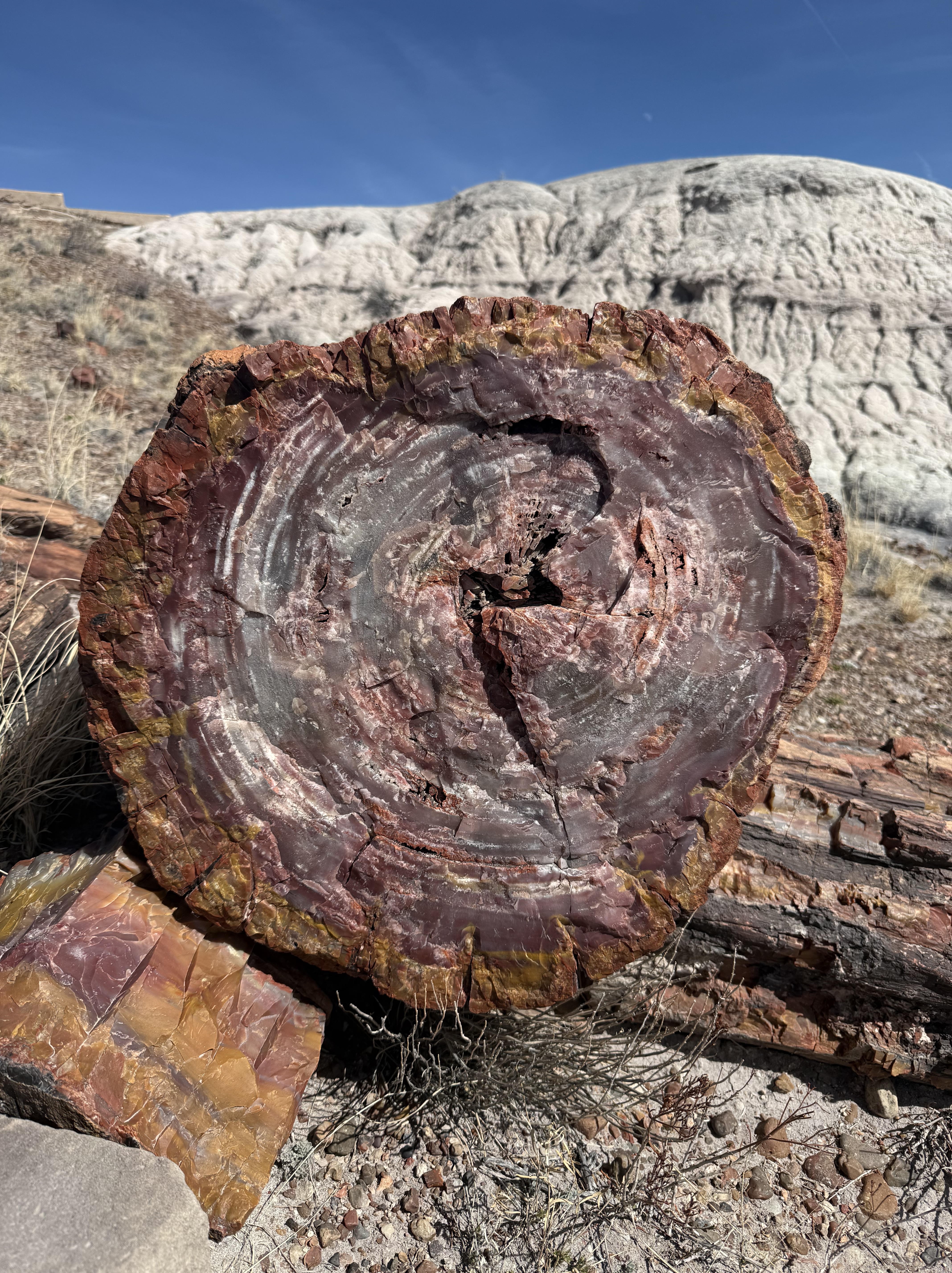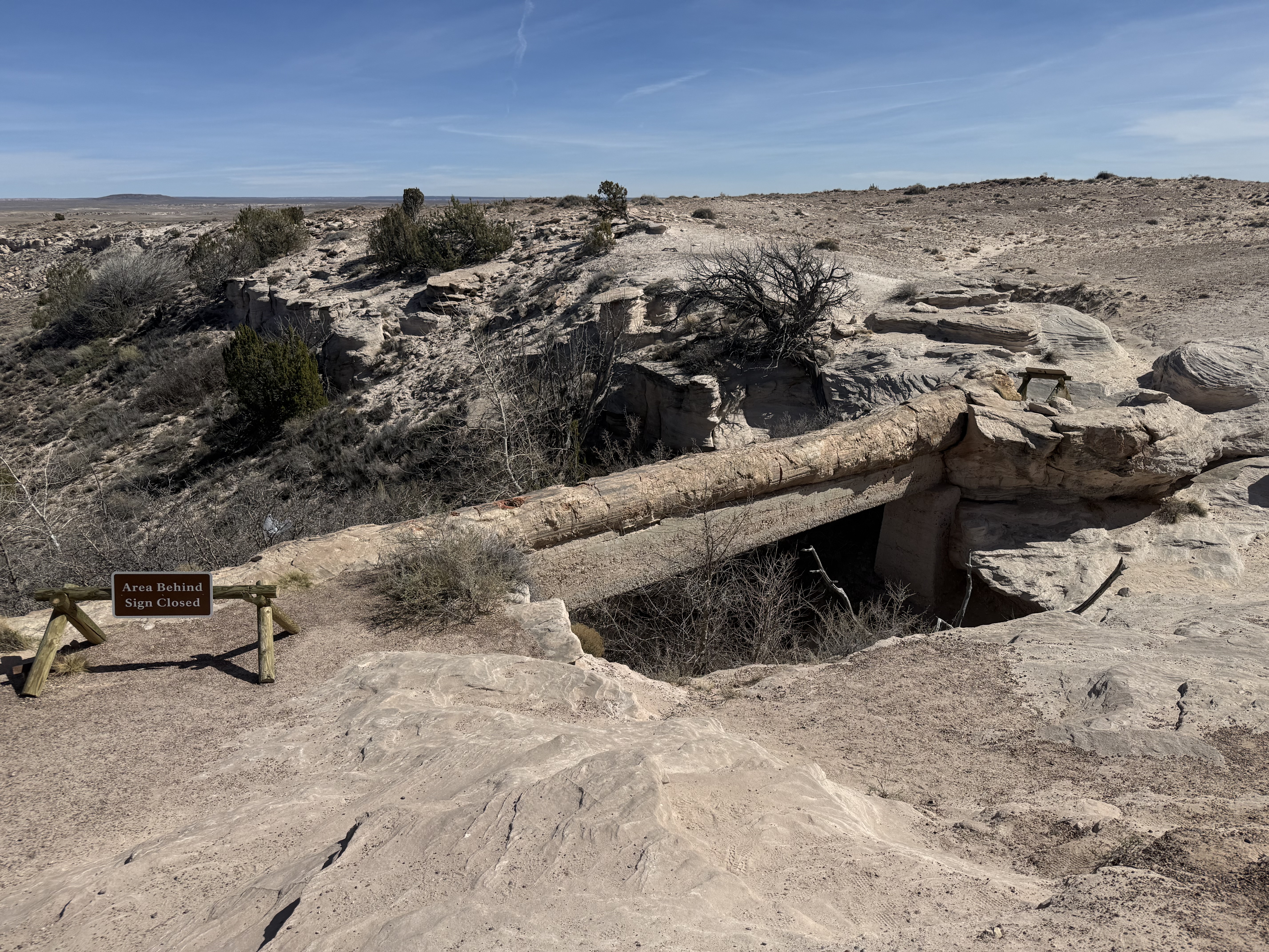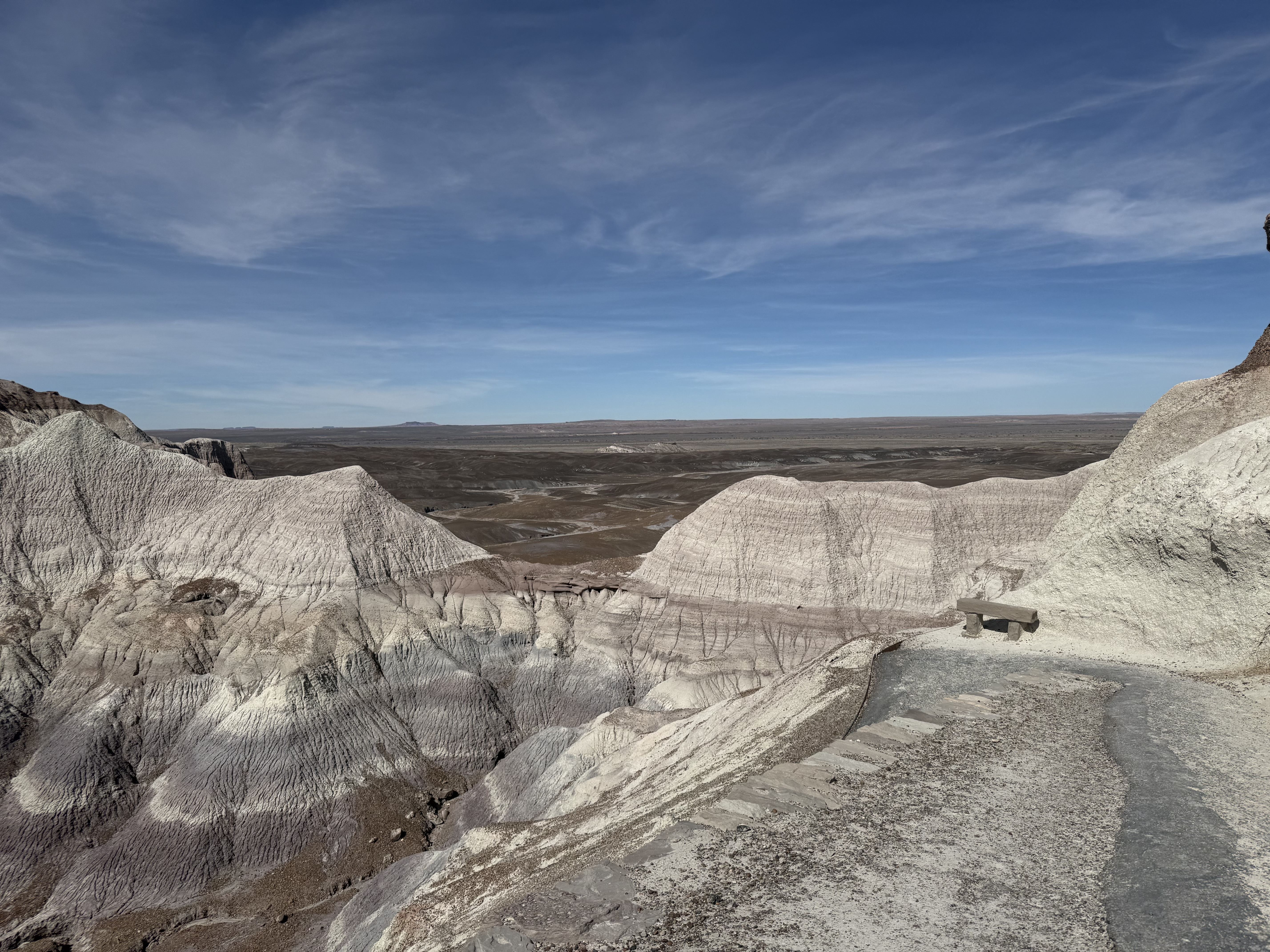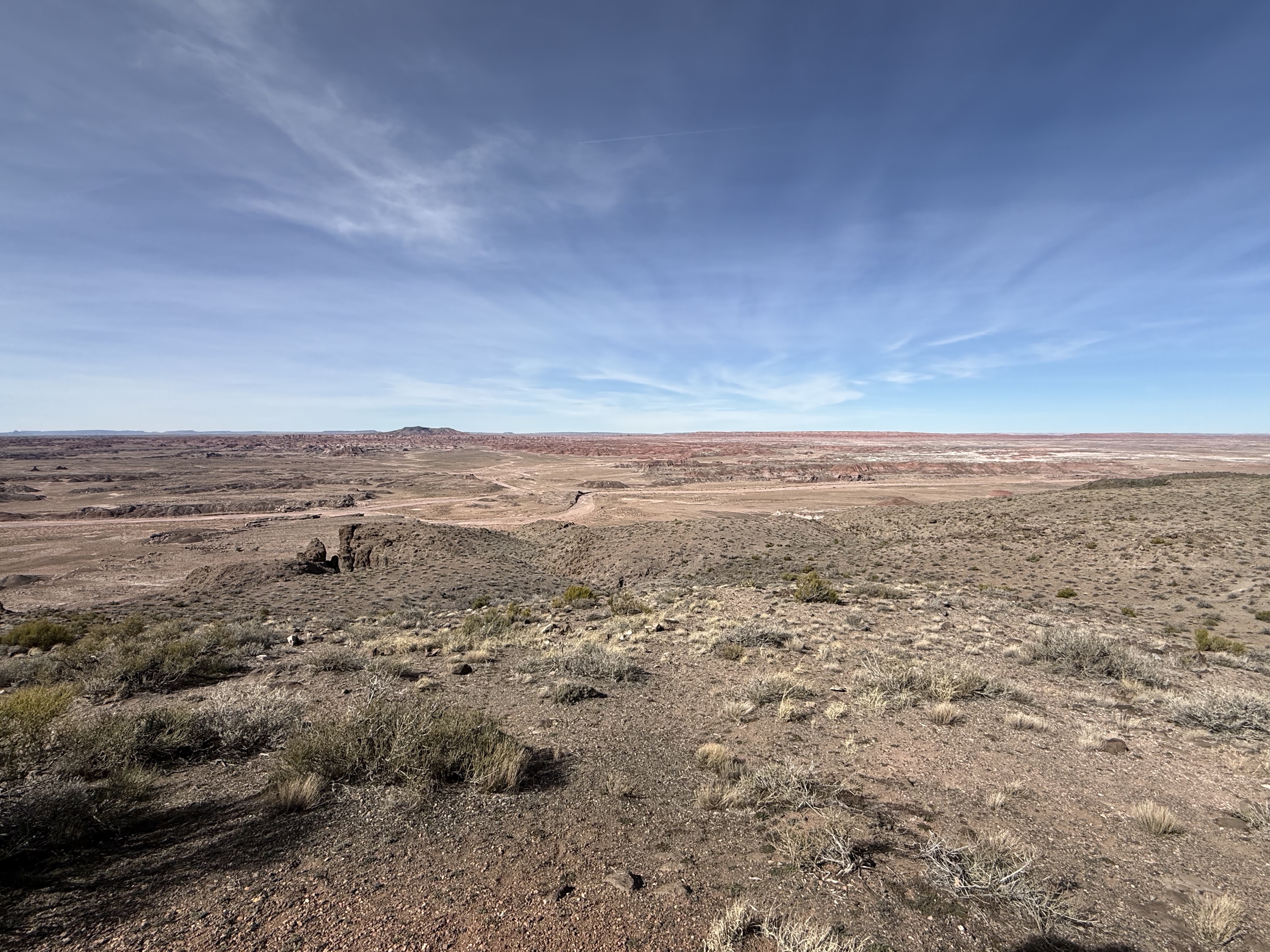 We continued on to the Petrified Forest National Park. This is a less visited National Park, but is still quite interesting and filled with some incredible sights. We entered from the Holbrook entrance, and stopped at the visitor center for a map and a chat with the rangers. We took a short hike through a large field of petrified trees, and then drove through the scenic drive to view several different areas of the park. One area had a 110′ petrified tree spanning a gully; another was a canyon of sorts that was made up of a collection of large mounds of rock with blue and gray strata. We then drove around through the “Painted Desert” portion of the park, which had numerous viewpoints looking over the deep reds, orange, tan and white rock-hills. It was stunning, and we could imagine that at sunset it would be even more breathtaking. We stopped by the second visitor center and gift shop for the park, and picked up some postcards and a fun sticker of a mountain lion petroglyph. The original petroglyph was on display in the gift shop, and was huge – about 3′ long!