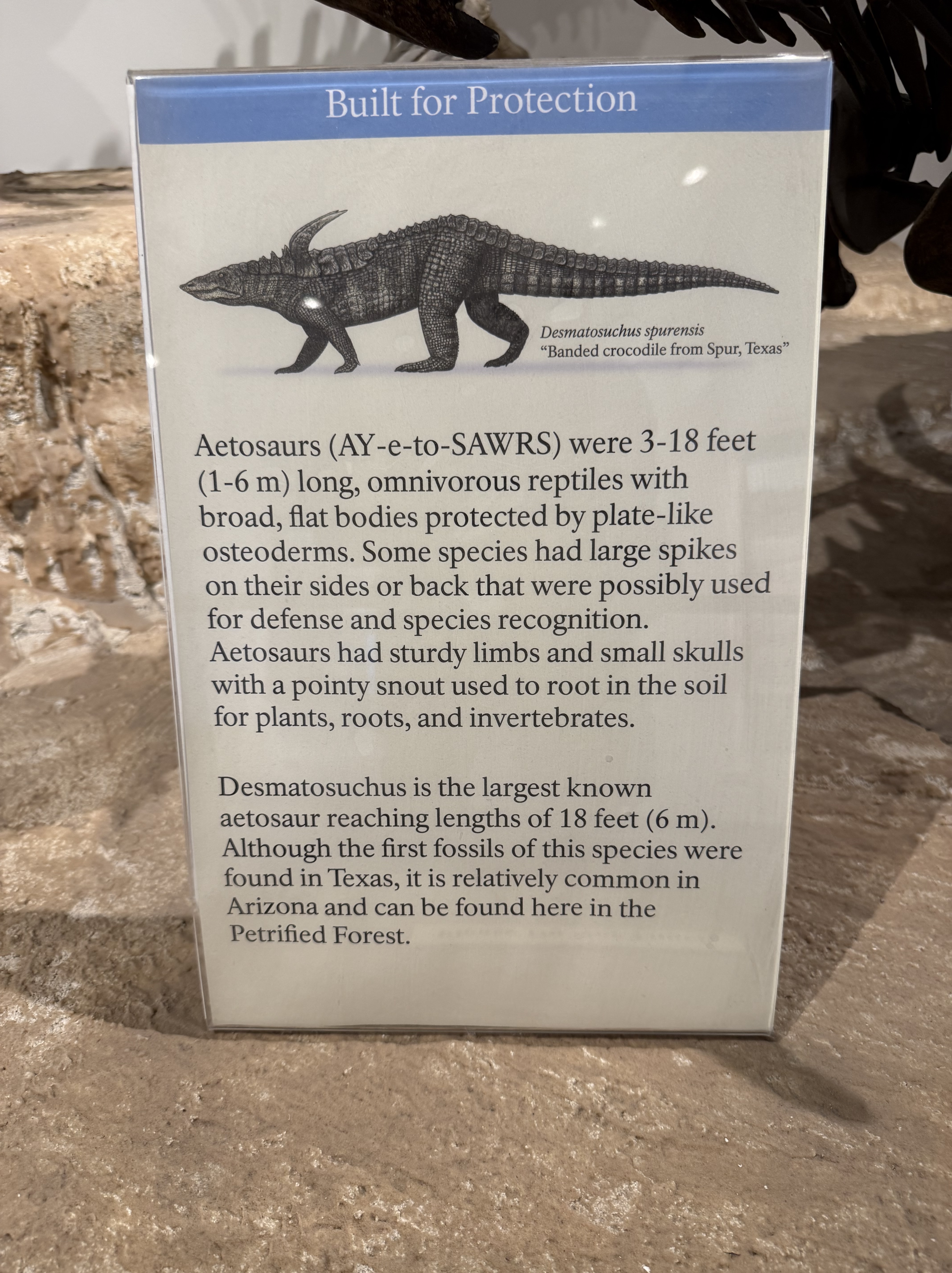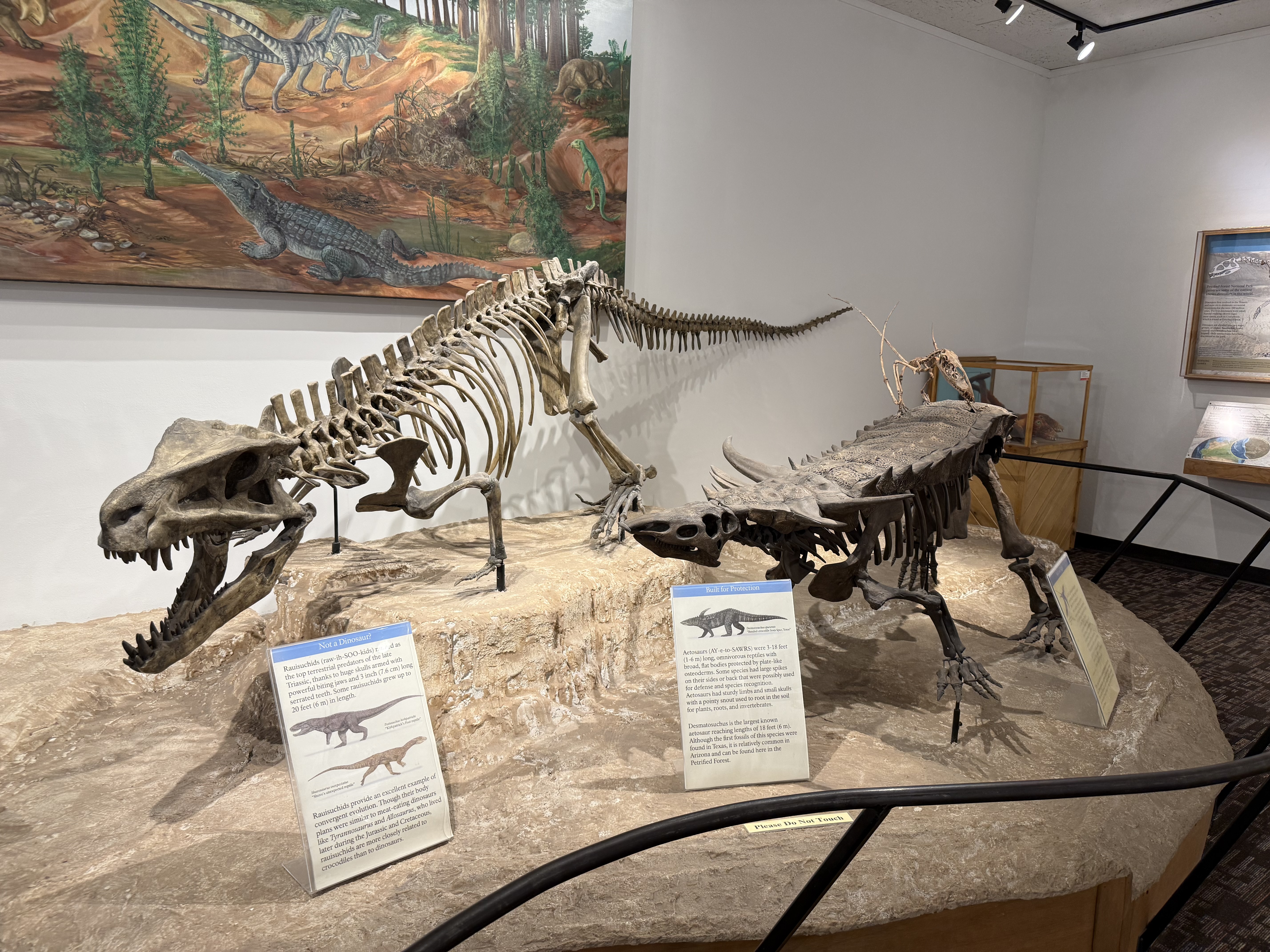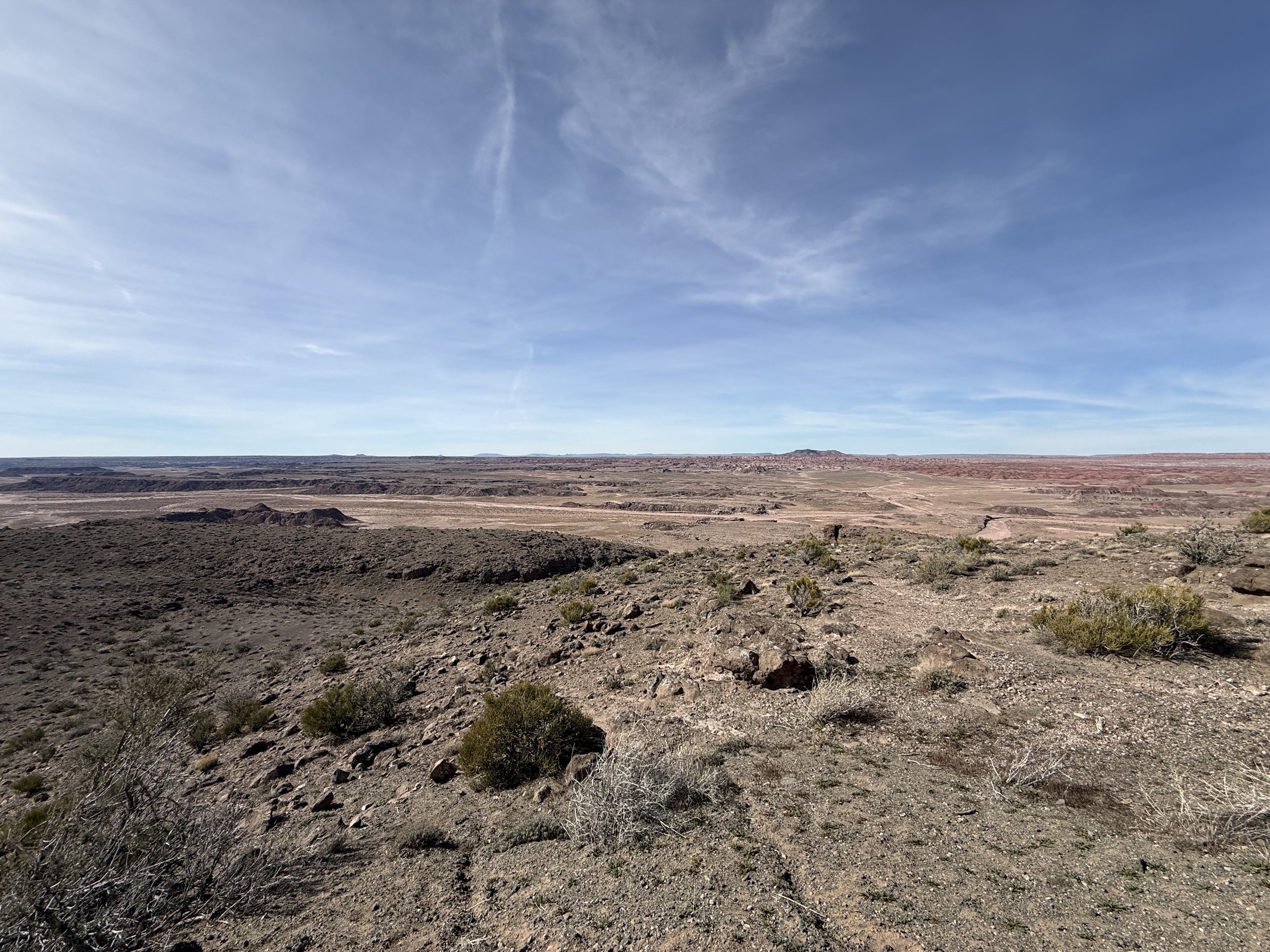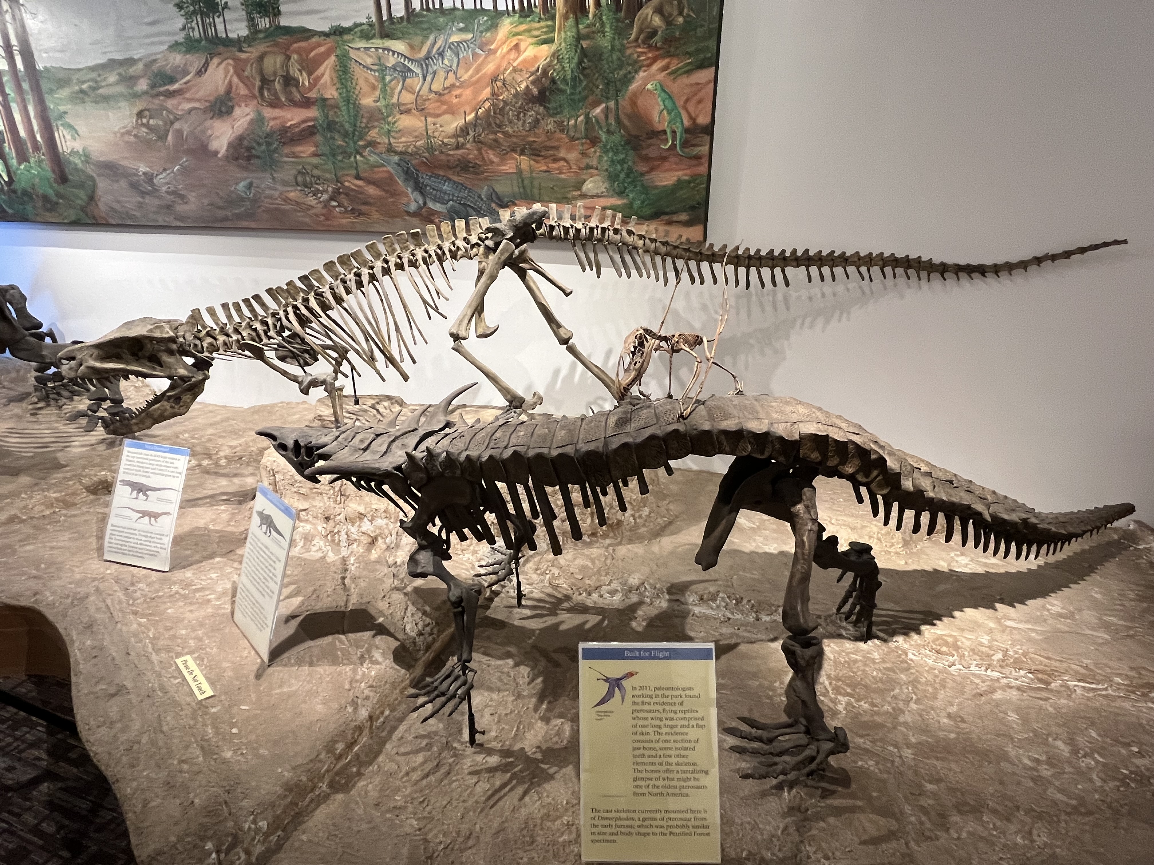 We continued on to the Petrified Forest National Park. This is a less visited National Park, but is still quite interesting and filled with some incredible sights. We entered from the Holbrook entrance, and stopped at the visitor center for a map and a chat with the rangers. We took a short hike through a large field of petrified trees, and then drove through the scenic drive to view several different areas of the park. One area had a 110′ petrified tree spanning a gully; another was a canyon of sorts that was made up of a collection of large mounds of rock with blue and gray strata. We then drove around through the “Painted Desert” portion of the park, which had numerous viewpoints looking over the deep reds, orange, tan and white rock-hills. It was stunning, and we could imagine that at sunset it would be even more breathtaking. We stopped by the second visitor center and gift shop for the park, and picked up some postcards and a fun sticker of a mountain lion petroglyph. The original petroglyph was on display in the gift shop, and was huge – about 3′ long!