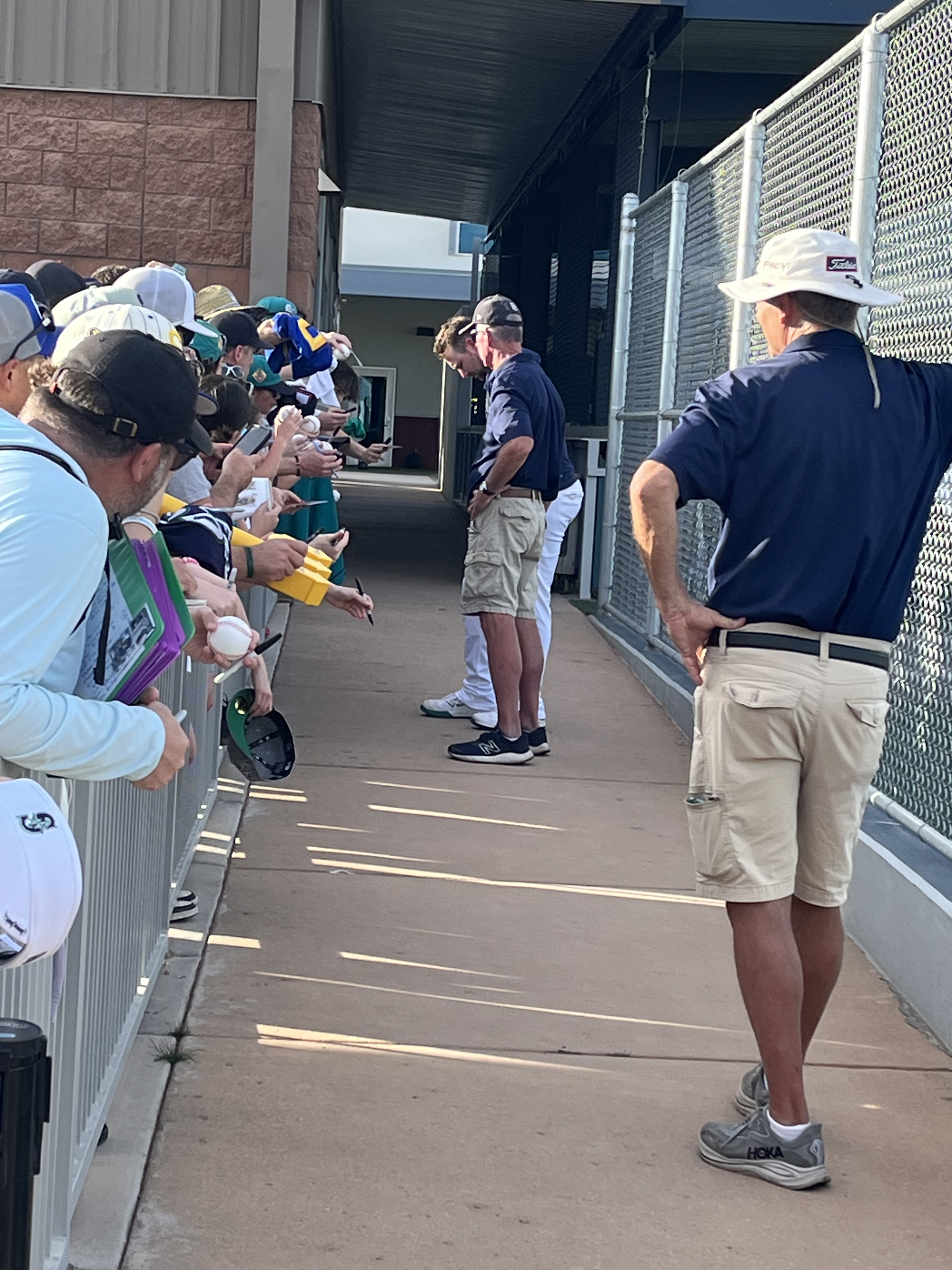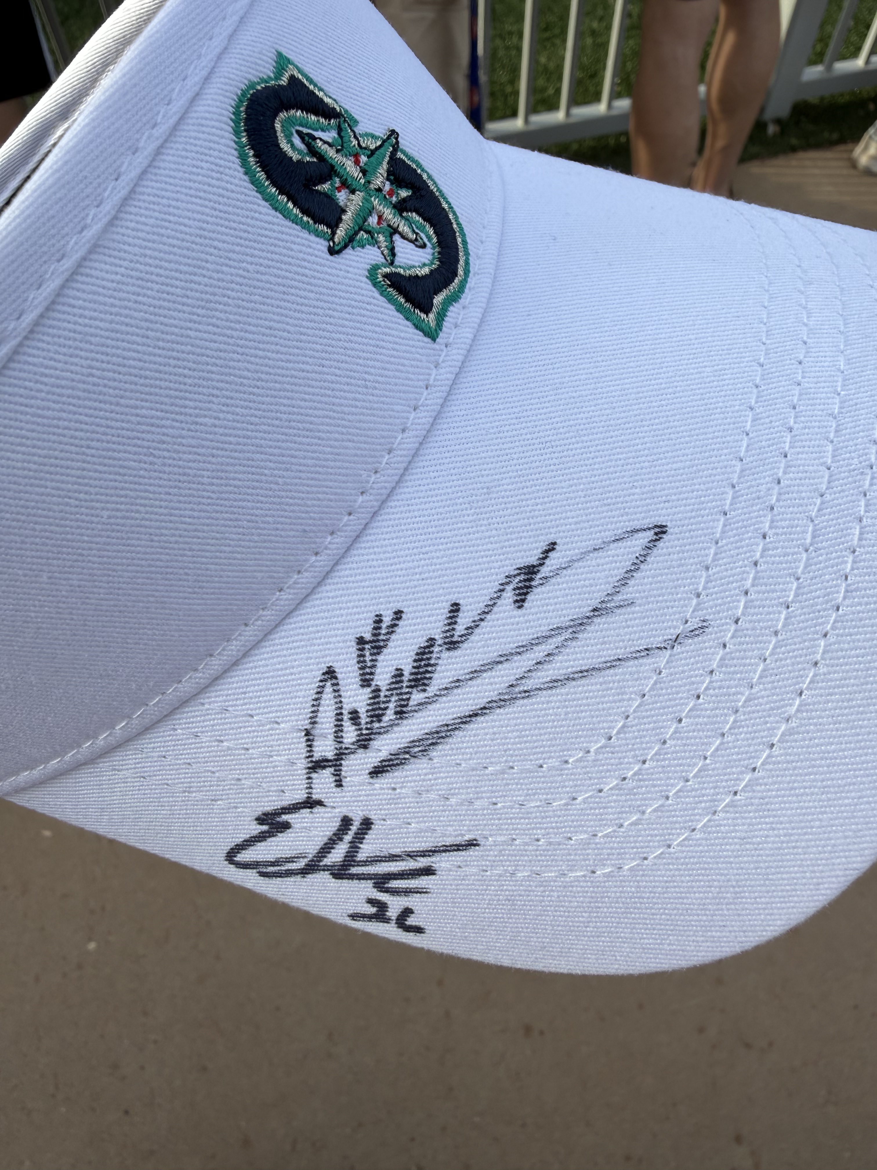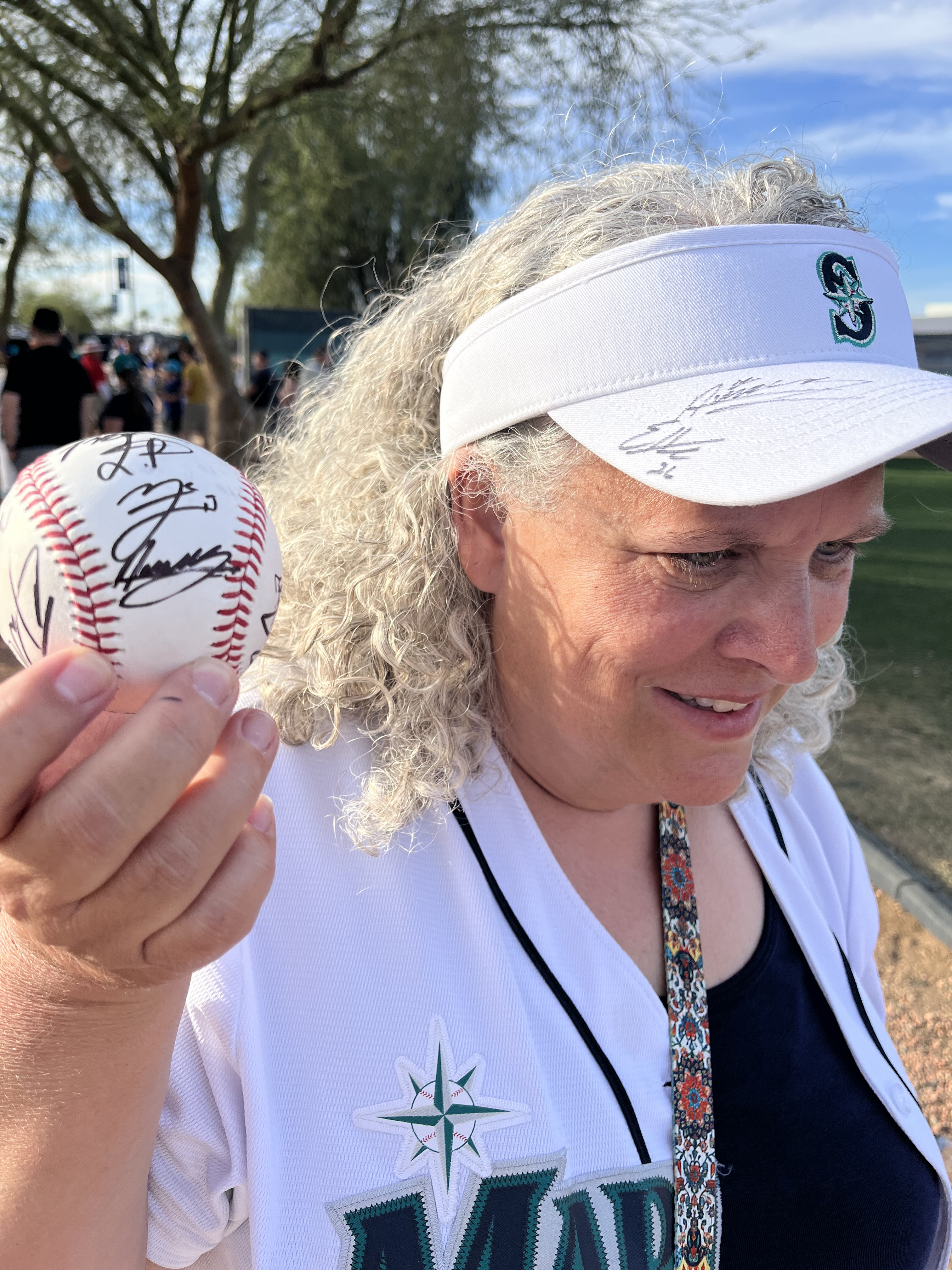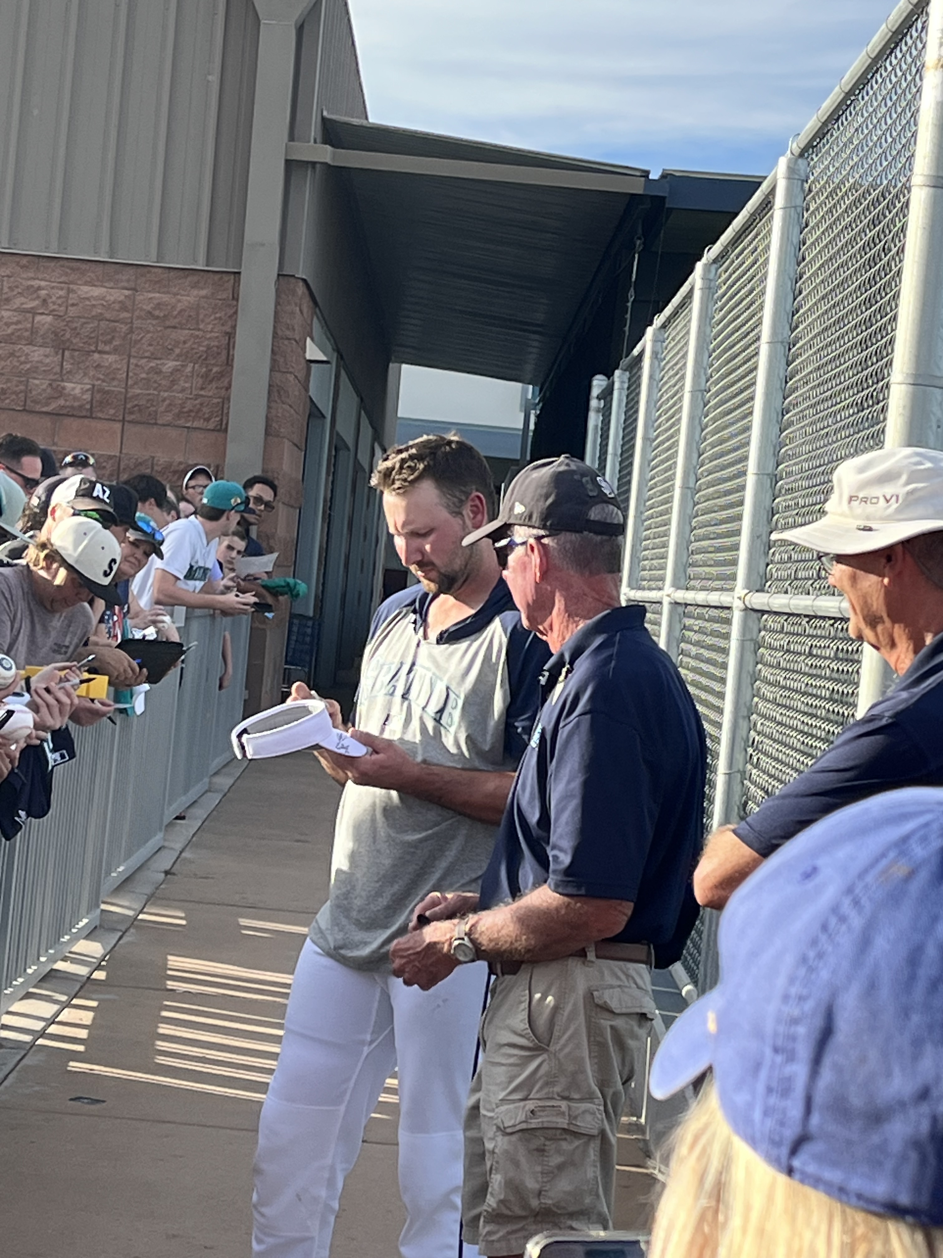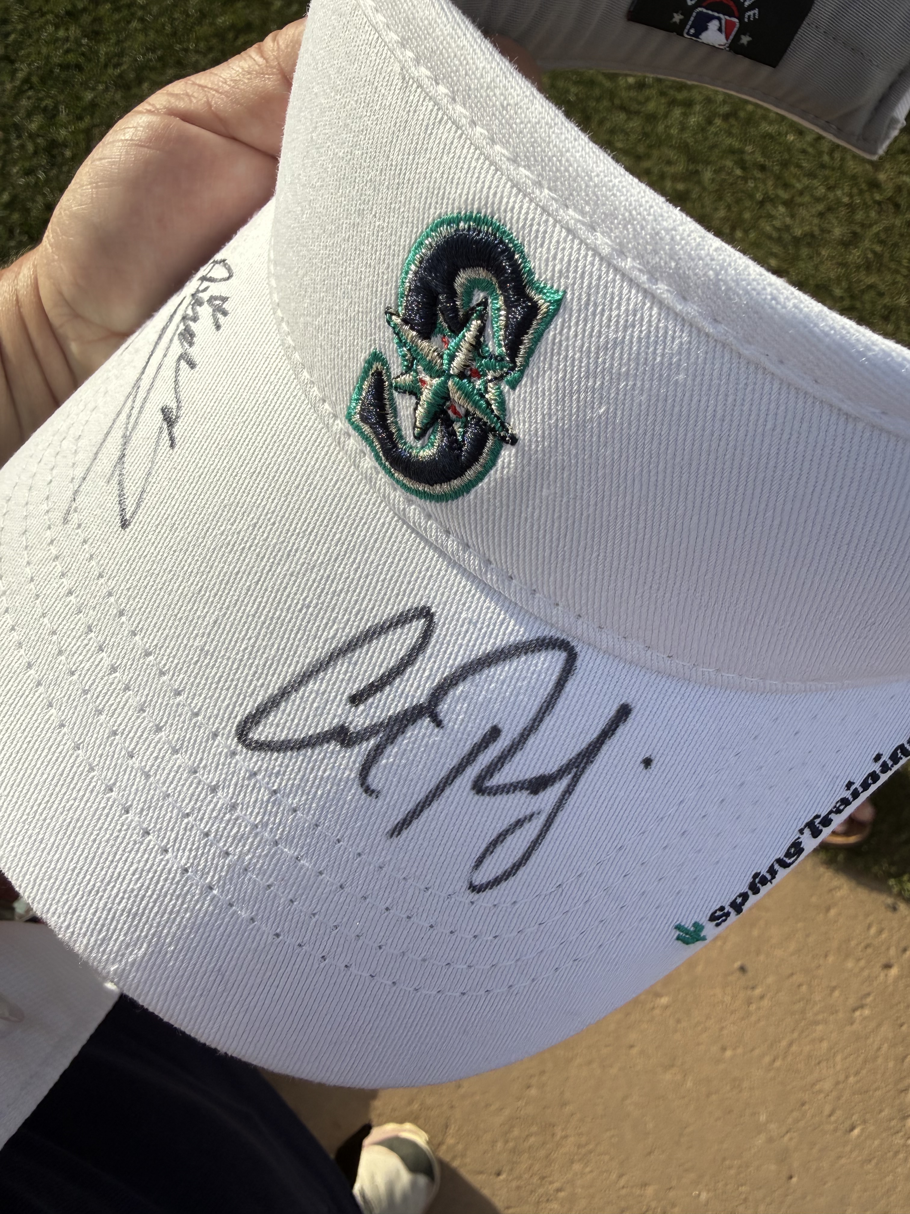 Temperatures this day were in the mid-90’s, with a fairly cloudless sky and nary a breeze to be found. As we entered the practice fields, we decided to stand by the walkway to the pitchers’ field because there were several trees providing some shade along the fence line! The players were anticipated to start practice shortly after 2:00, but it was shortly after 3:00 before the pitchers started exiting the clubhouse. The position players were out for only a very brief time, and then it was determined to be too hot for an extended practice, and there was no batting practice (at least not outside, I imagine they may have been utilizing the batting cages inside the facility). The pitchers, however did have a light practice. We remained standing by the fence line in hopes of catching an autograph from them as they returned to the clubhouse. And indeed, as they were returning, several were willing to stop and sign, and chat briefly. I was happy to have the opportunity to visit with Emerson Hancock and Andres Munoz, drawing them in with a call out of “Would you please sign an old lady’s hat?” With chuckles from both, They signed my “Spring Training 2026” visor, and Munoz also signed a baseball for us. Emerson asked if I would wear the visor after its signed (yes, of course I will!) and then if I would be wearing it to the game that evening (umm yes, Emerson, it’s 95 degrees out with a blazing sun). Munoz and I talked about his cat, Matilda’s social media page. Both of these young men were engaging and warm with their interactions with all the fans. Logan Gilbert was also present signing but got called away before he came to our part of the fence. We then wandered over to the fence near the clubhouse and stumbled upon Cal Raleigh! Once again, my call out of “Would you please sign an old lady’s hat?” worked, and Cal came over to sign my visor. Although he did not engage in any sort of chit-chat, I was grateful for him taking the time to work through the extensive crowd. I can only imagine the pressure on this guy to not only remain at the top of his game day in and day out, but to also be “available” to meet and greet the fans, even when he doesn’t feel up to it. To always be “on show” must be exhausting.