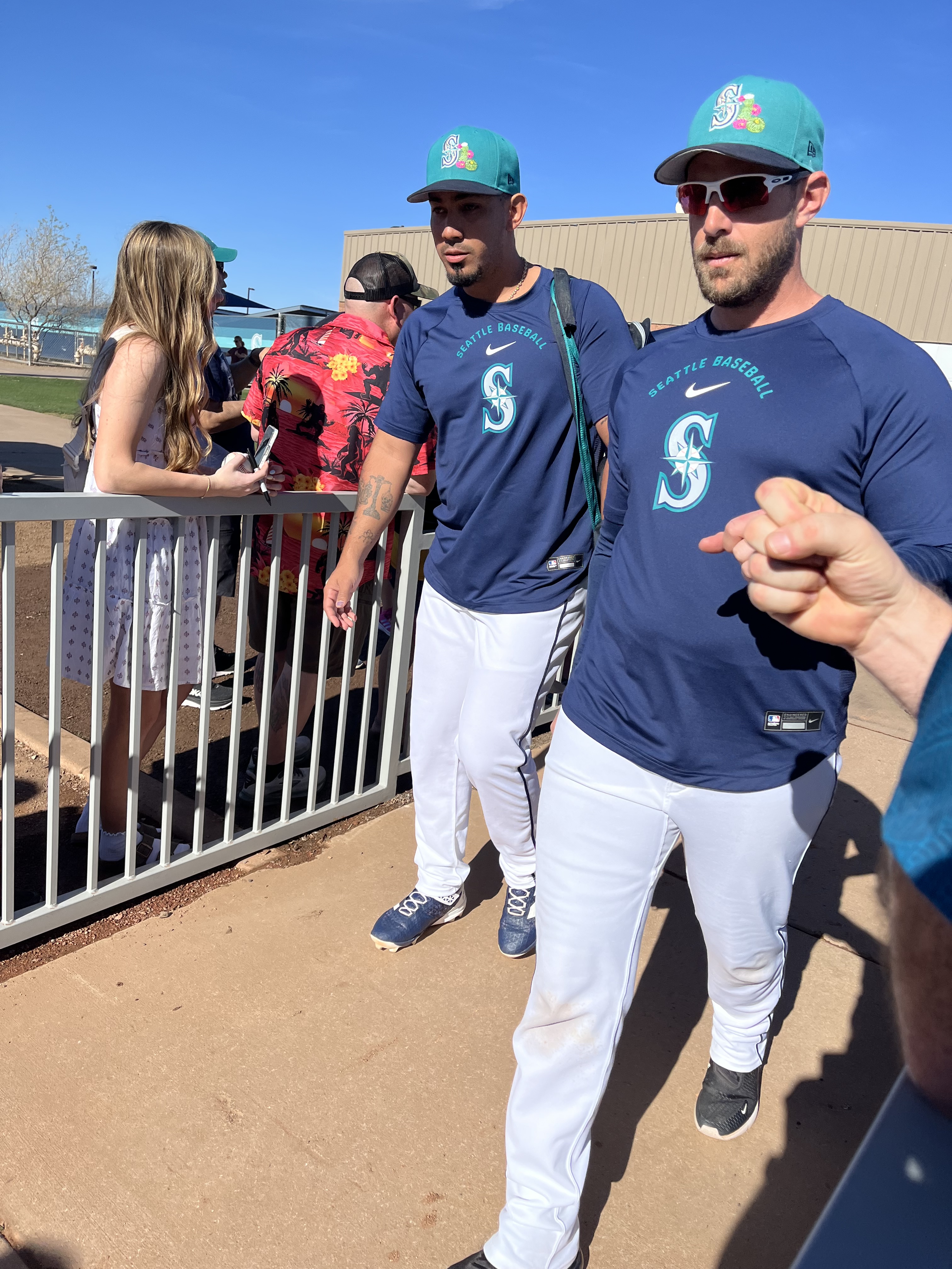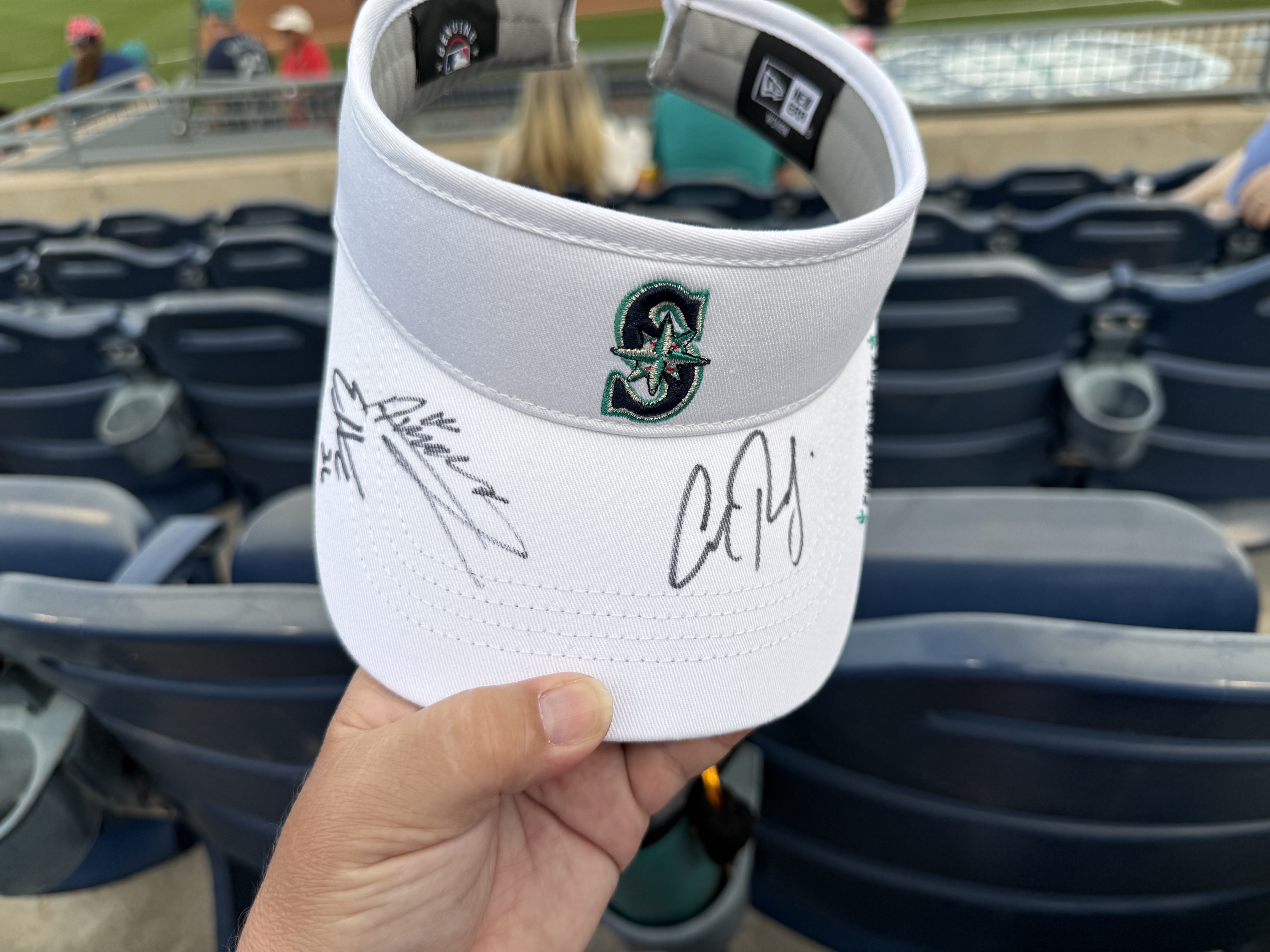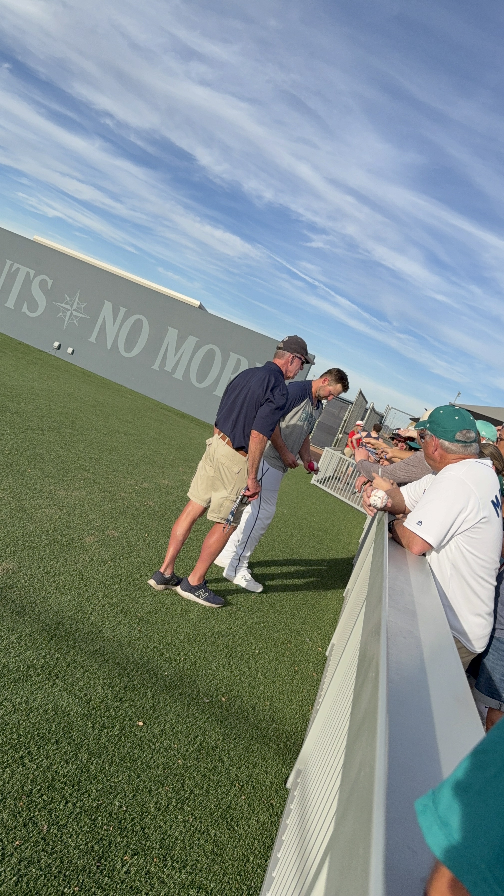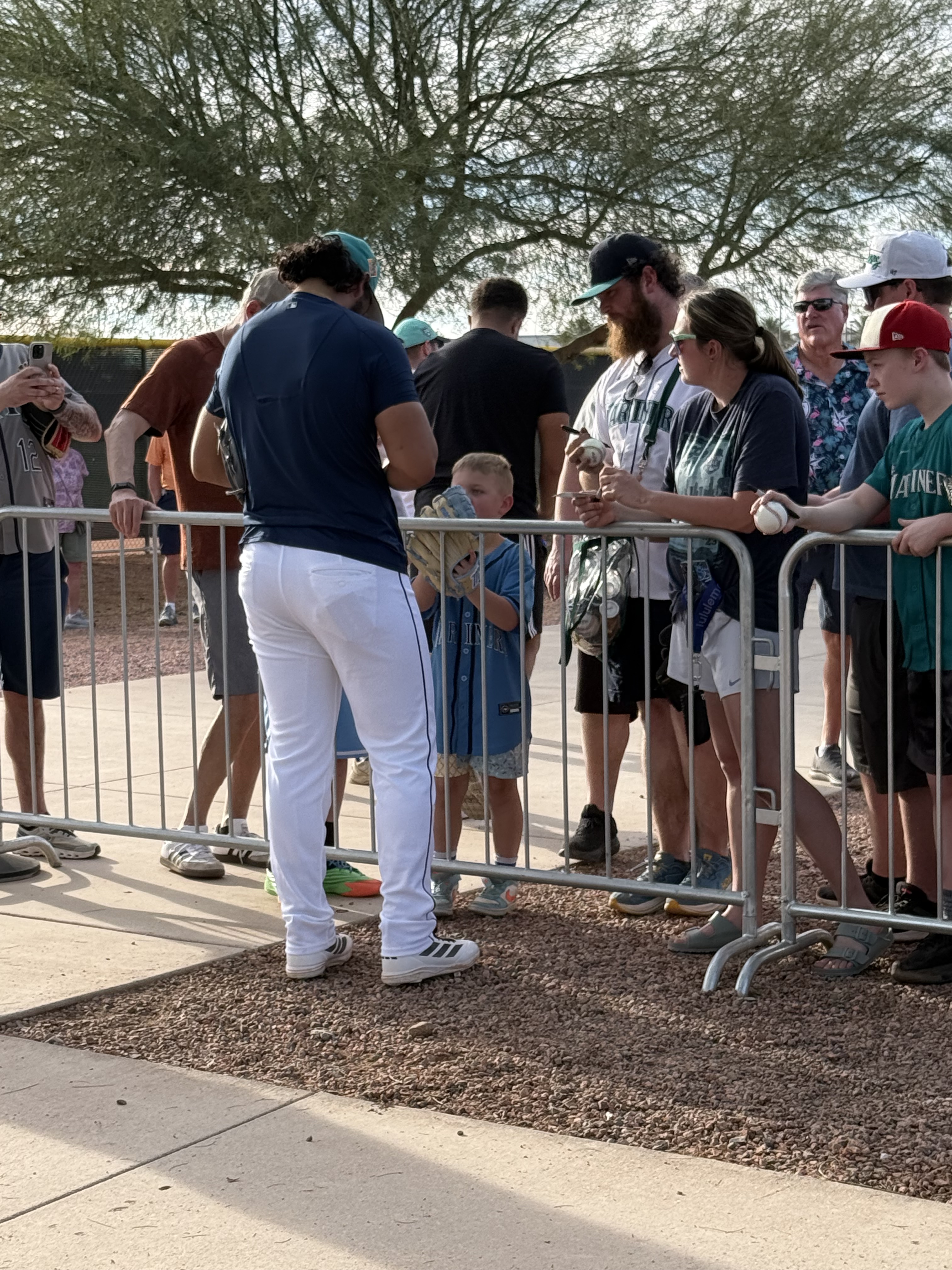 Temperatures this day were in the mid-90’s, with a fairly cloudless sky and nary a breeze to be found. As we entered the practice fields, we decided to stand by the walkway to the pitchers’ field because there were several trees providing some shade along the fence line! The players were anticipated to start practice shortly after 2:00, but it was shortly after 3:00 before the pitchers started exiting the clubhouse. The position players were out for only a very brief time, and then it was determined to be too hot for an extended practice, and there was no batting practice (at least not outside, I imagine they may have been utilizing the batting cages inside the facility). The pitchers, however did have a light practice. We remained standing by the fence line in hopes of catching an autograph from them as they returned to the clubhouse. And indeed, as they were returning, several were willing to stop and sign, and chat briefly. I was happy to have the opportunity to visit with Emerson Hancock and Andres Munoz, drawing them in with a call out of “Would you please sign an old lady’s hat?” With chuckles from both, They signed my “Spring Training 2026” visor, and Munoz also signed a baseball for us. Emerson asked if I would wear the visor after its signed (yes, of course I will!) and then if I would be wearing it to the game that evening (umm yes, Emerson, it’s 95 degrees out with a blazing sun). Munoz and I talked about his cat, Matilda’s social media page. Both of these young men were engaging and warm with their interactions with all the fans. Logan Gilbert was also present signing but got called away before he came to our part of the fence. We then wandered over to the fence near the clubhouse and stumbled upon Cal Raleigh! Once again, my call out of “Would you please sign an old lady’s hat?” worked, and Cal came over to sign my visor. Although he did not engage in any sort of chit-chat, I was grateful for him taking the time to work through the extensive crowd. I can only imagine the pressure on this guy to not only remain at the top of his game day in and day out, but to also be “available” to meet and greet the fans, even when he doesn’t feel up to it. To always be “on show” must be exhausting.
