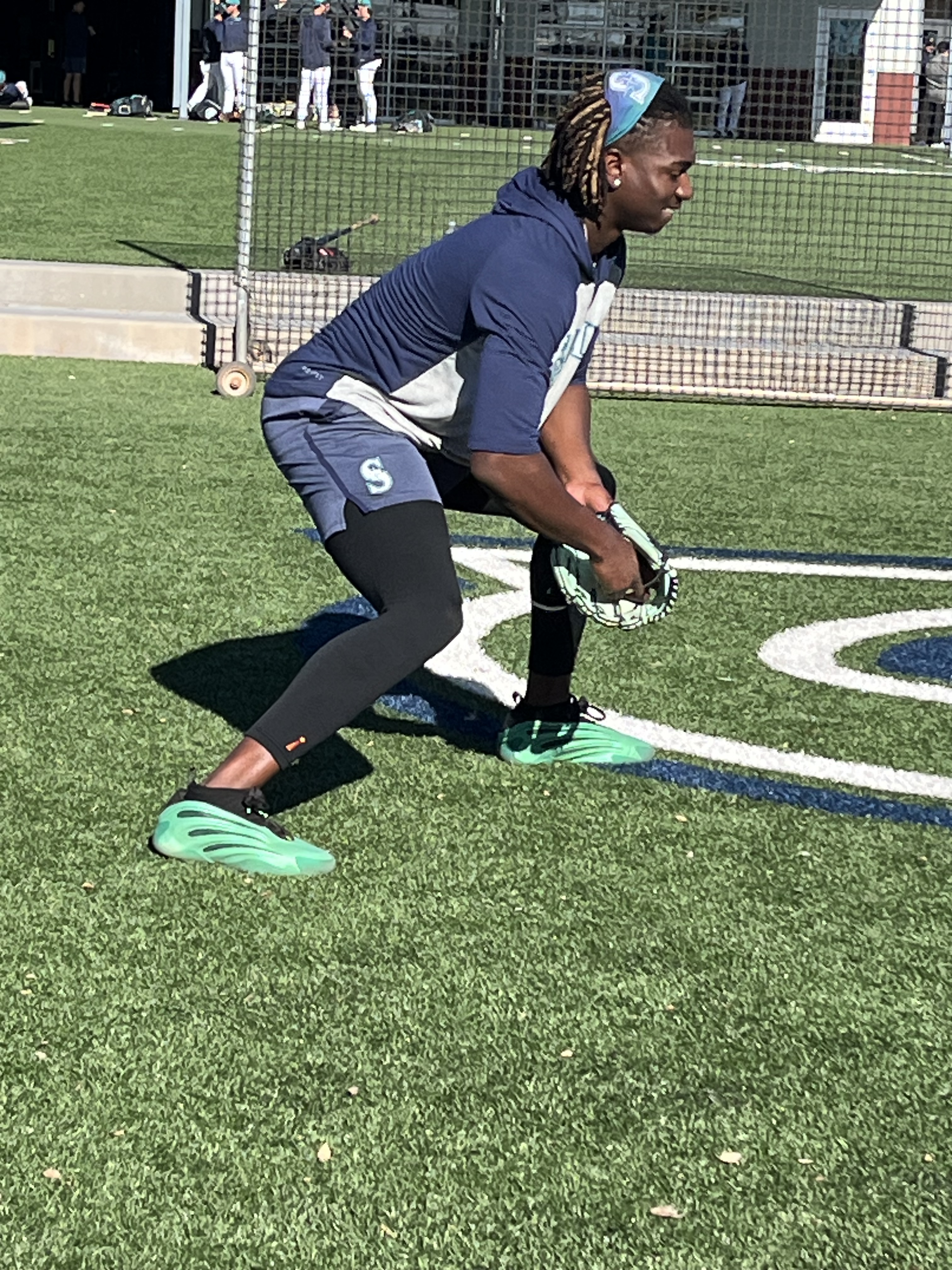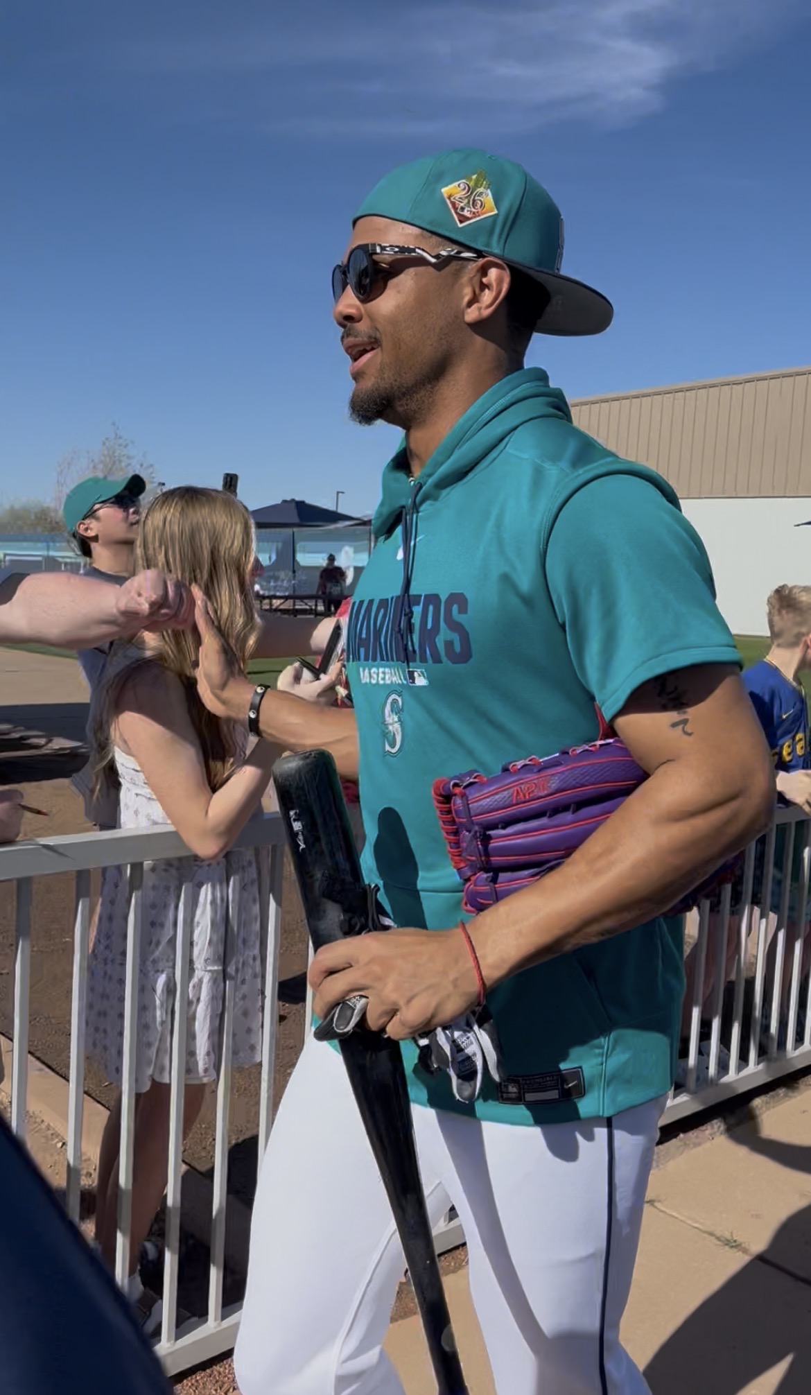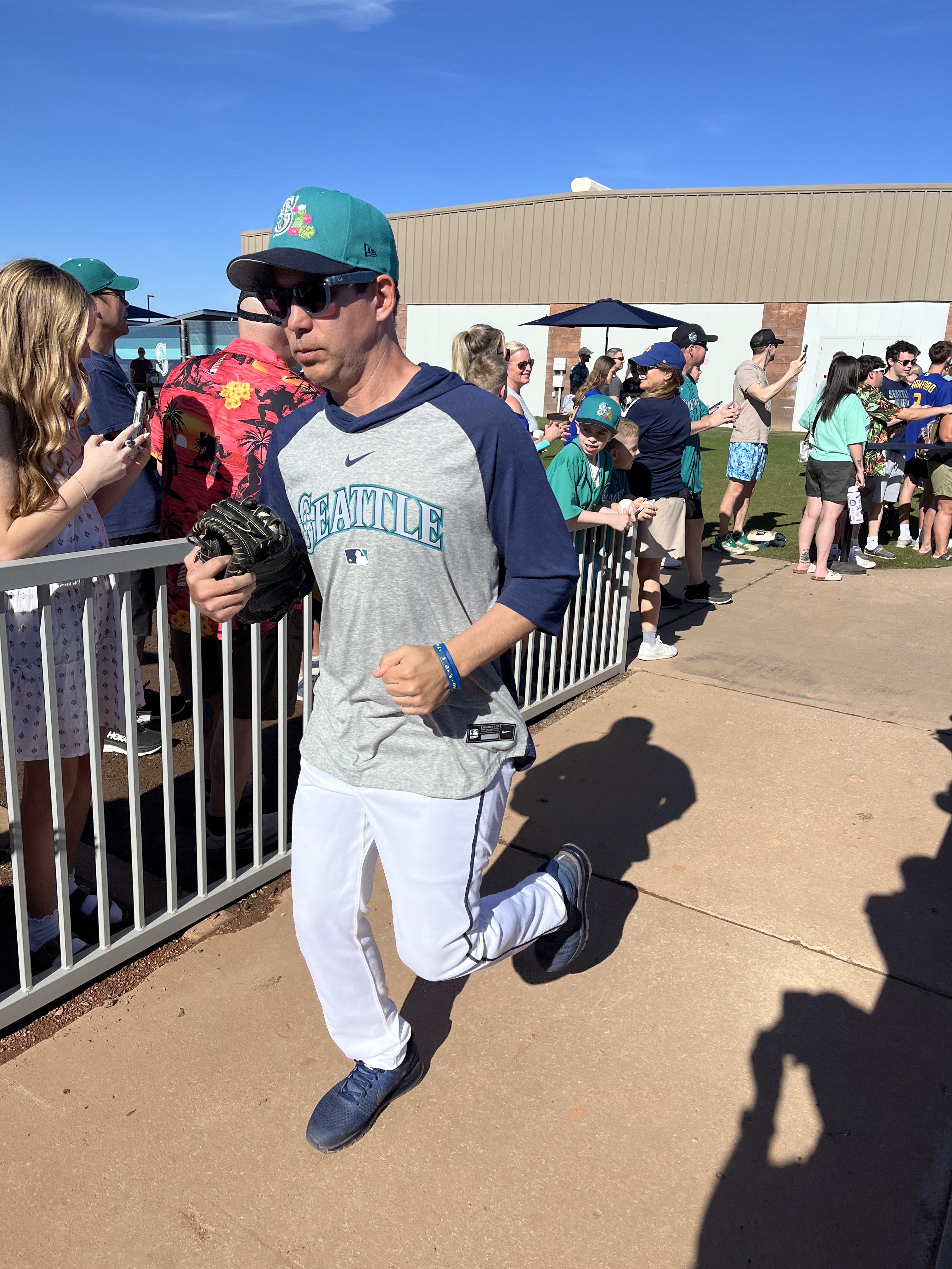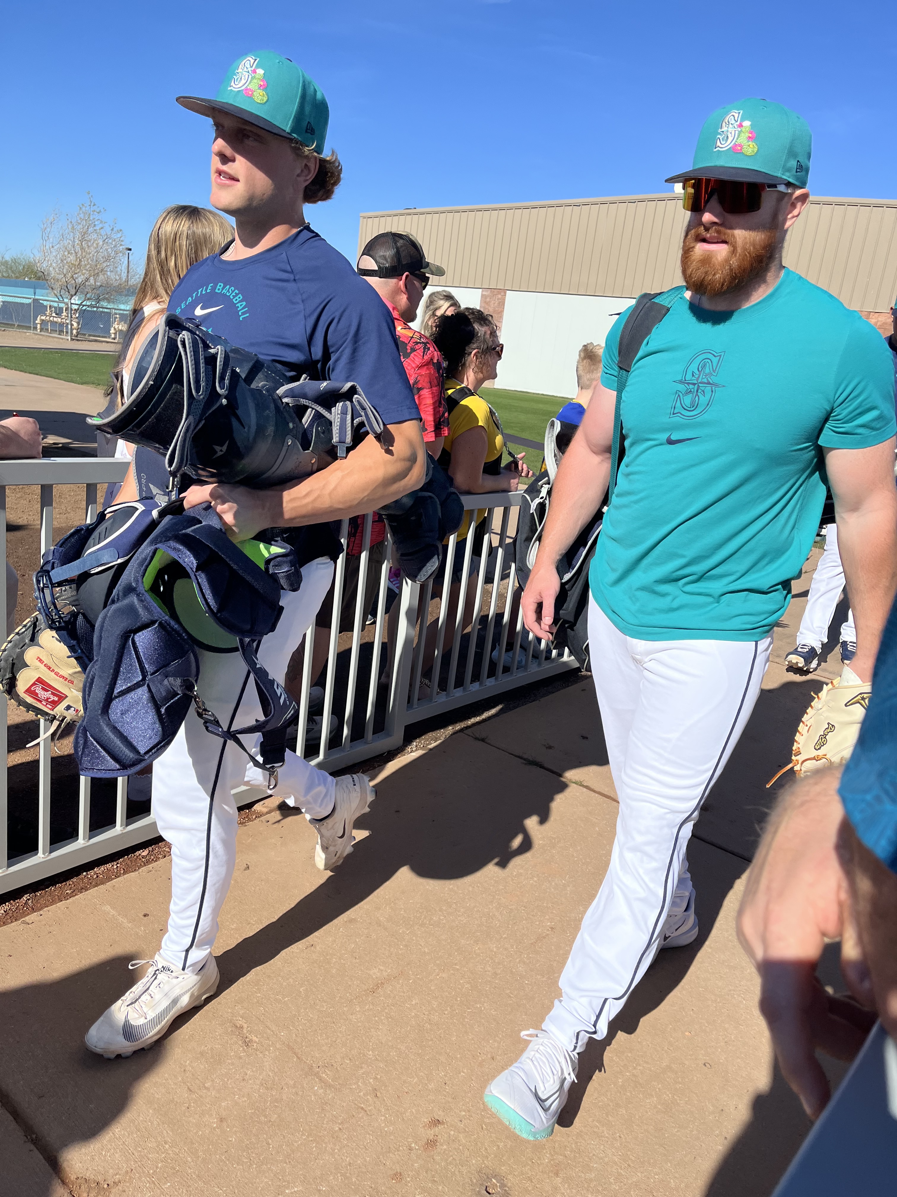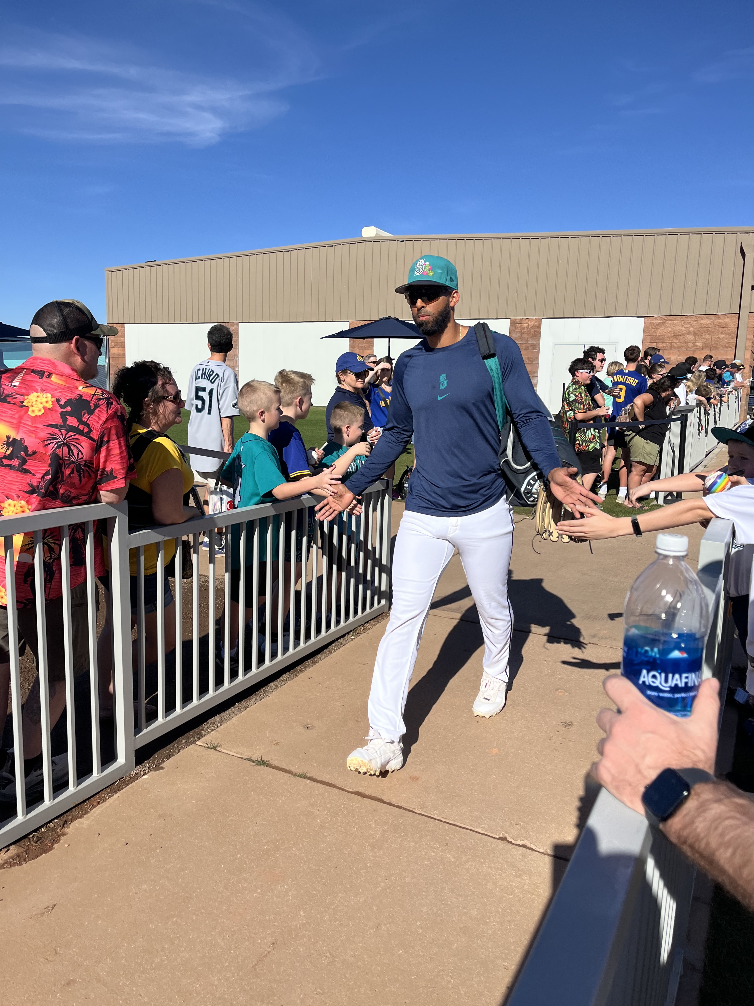 Temperatures this day were in the mid-90’s, with a fairly cloudless sky and nary a breeze to be found. As we entered the practice fields, we decided to stand by the walkway to the pitchers’ field because there were several trees providing some shade along the fence line! The players were anticipated to start practice shortly after 2:00, but it was shortly after 3:00 before the pitchers started exiting the clubhouse. The position players were out for only a very brief time, and then it was determined to be too hot for an extended practice, and there was no batting practice (at least not outside, I imagine they may have been utilizing the batting cages inside the facility). The pitchers, however did have a light practice. We remained standing by the fence line in hopes of catching an autograph from them as they returned to the clubhouse. And indeed, as they were returning, several were willing to stop and sign, and chat briefly. I was happy to have the opportunity to visit with Emerson Hancock and Andres Munoz, drawing them in with a call out of “Would you please sign an old lady’s hat?” With chuckles from both, They signed my “Spring Training 2026” visor, and Munoz also signed a baseball for us. Emerson asked if I would wear the visor after its signed (yes, of course I will!) and then if I would be wearing it to the game that evening (umm yes, Emerson, it’s 95 degrees out with a blazing sun). Munoz and I talked about his cat, Matilda’s social media page. Both of these young men were engaging and warm with their interactions with all the fans. Logan Gilbert was also present signing but got called away before he came to our part of the fence. We then wandered over to the fence near the clubhouse and stumbled upon Cal Raleigh! Once again, my call out of “Would you please sign an old lady’s hat?” worked, and Cal came over to sign my visor. Although he did not engage in any sort of chit-chat, I was grateful for him taking the time to work through the extensive crowd. I can only imagine the pressure on this guy to not only remain at the top of his game day in and day out, but to also be “available” to meet and greet the fans, even when he doesn’t feel up to it. To always be “on show” must be exhausting.