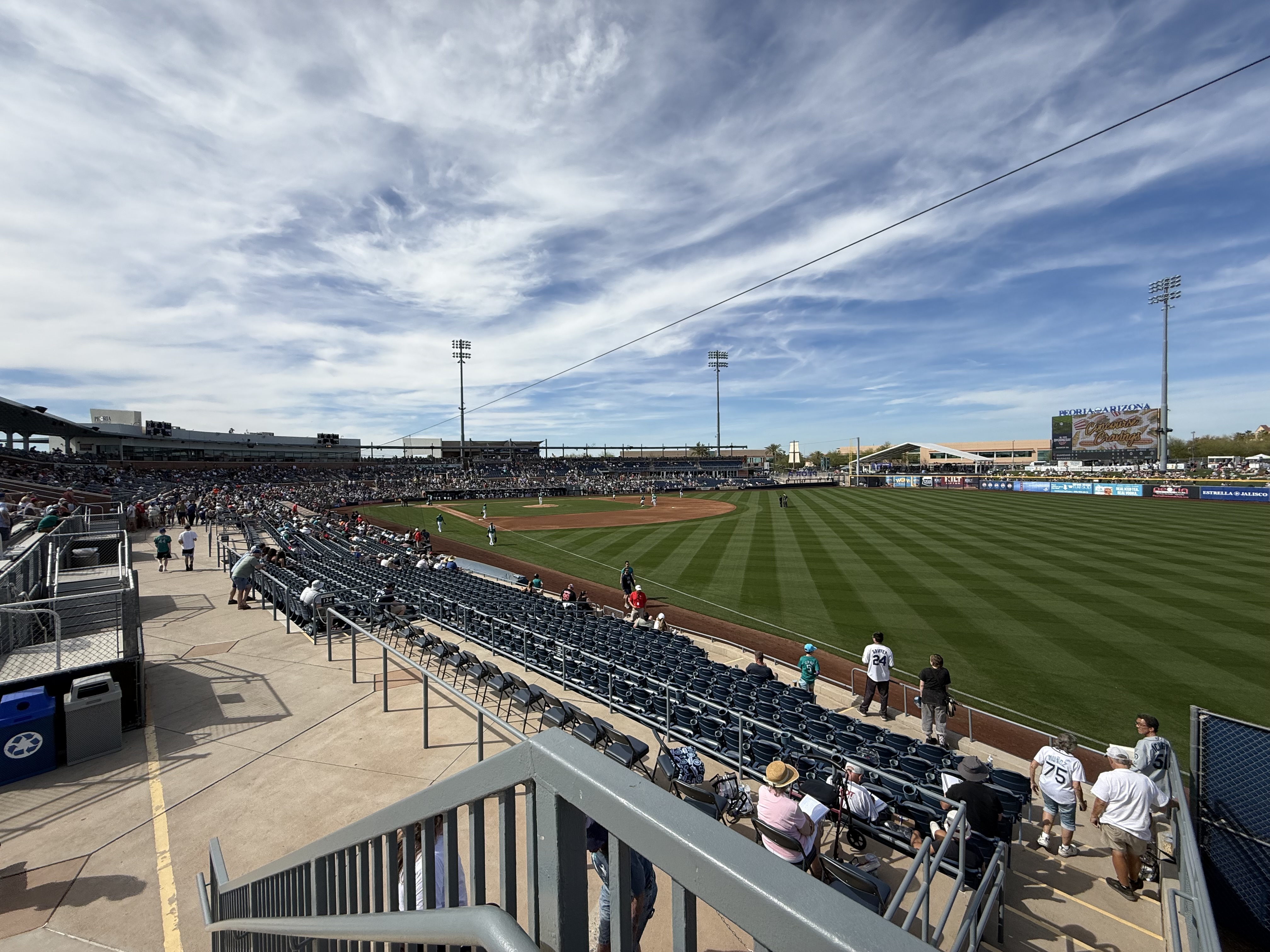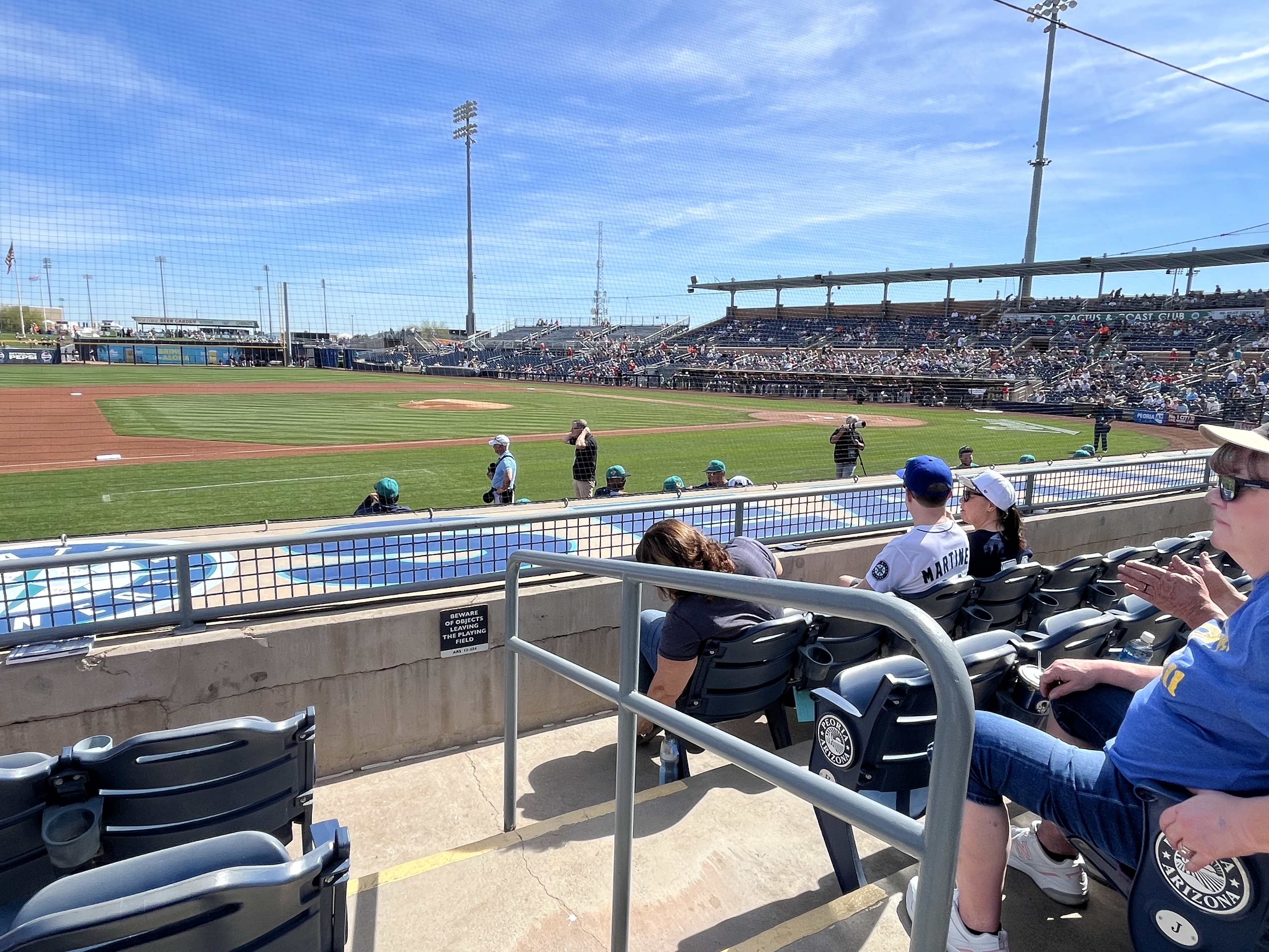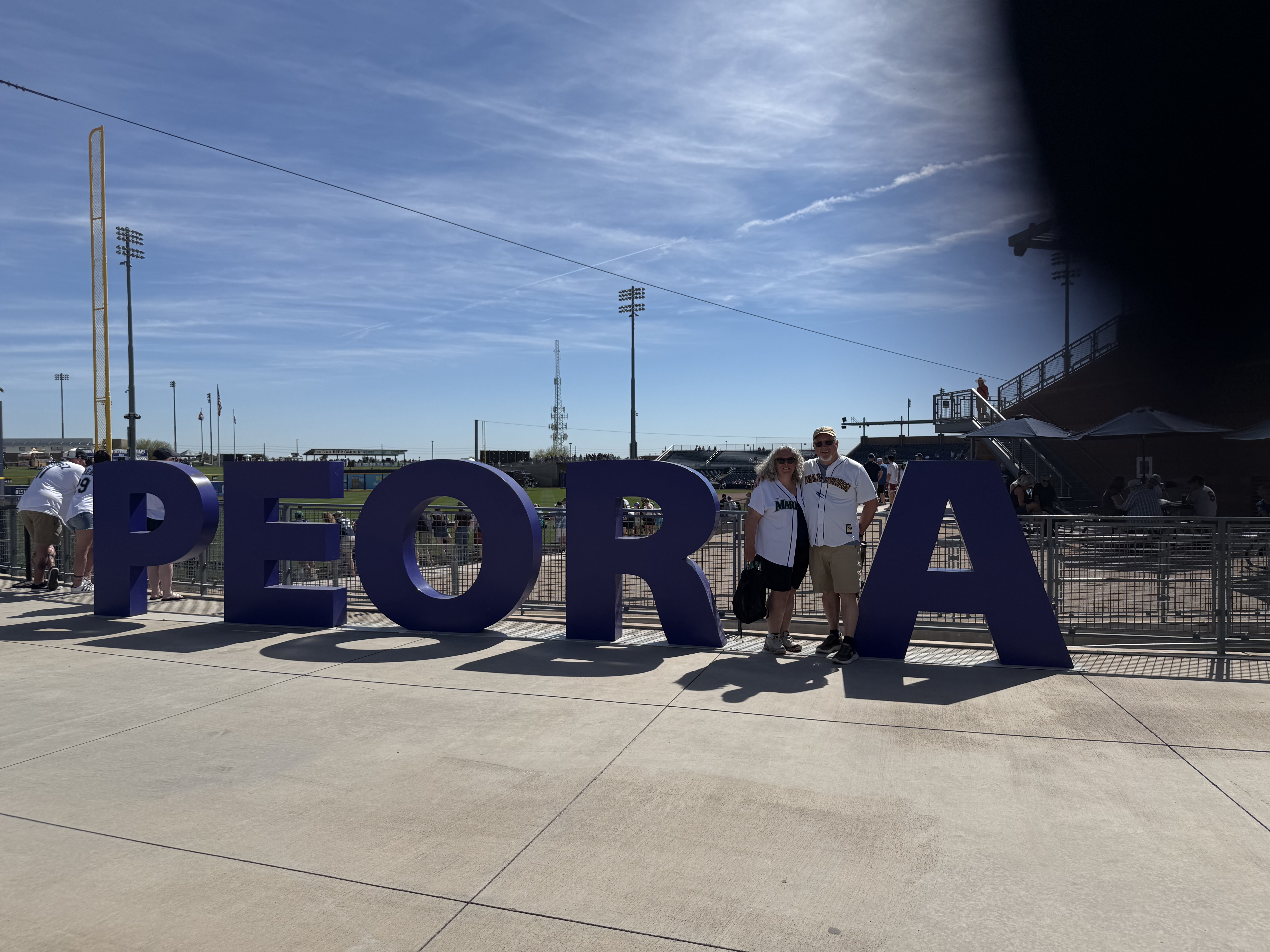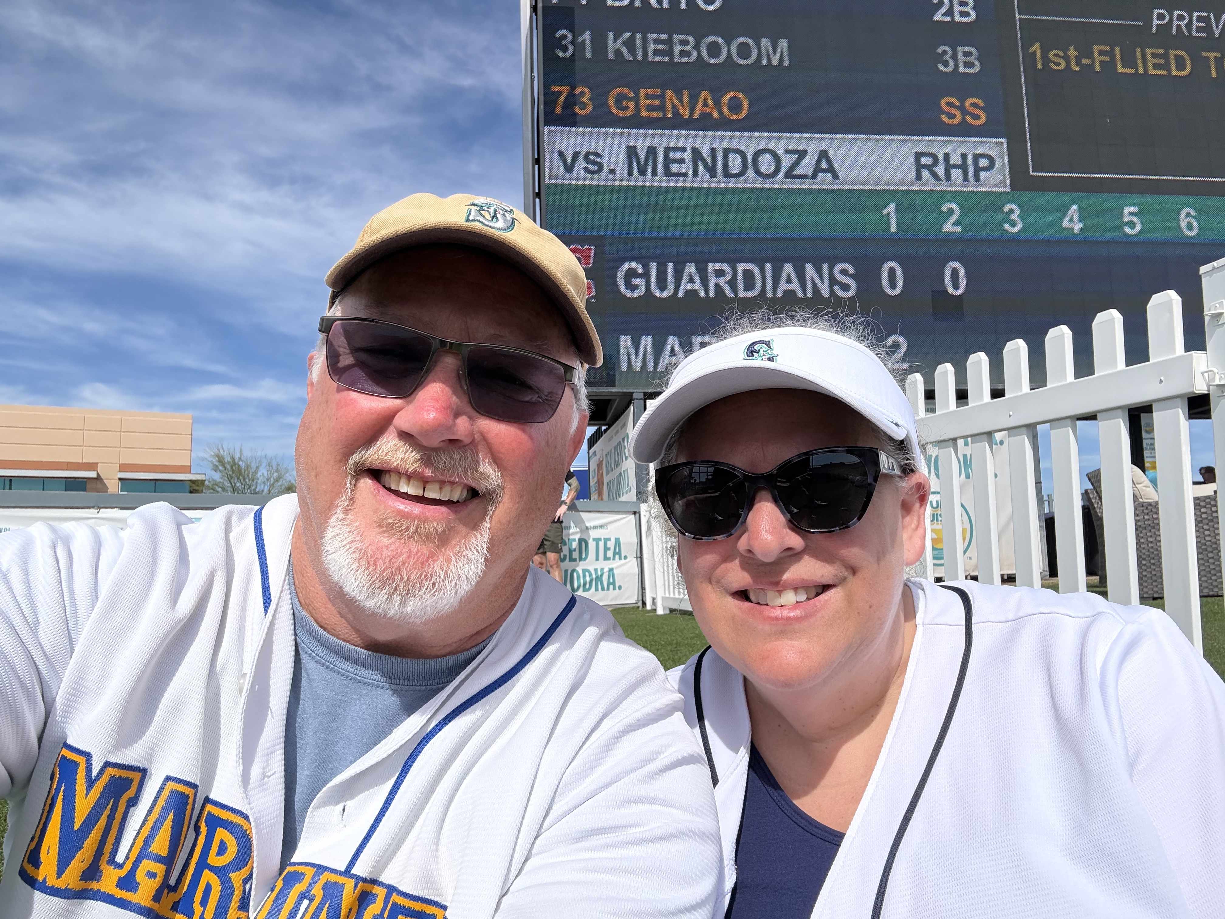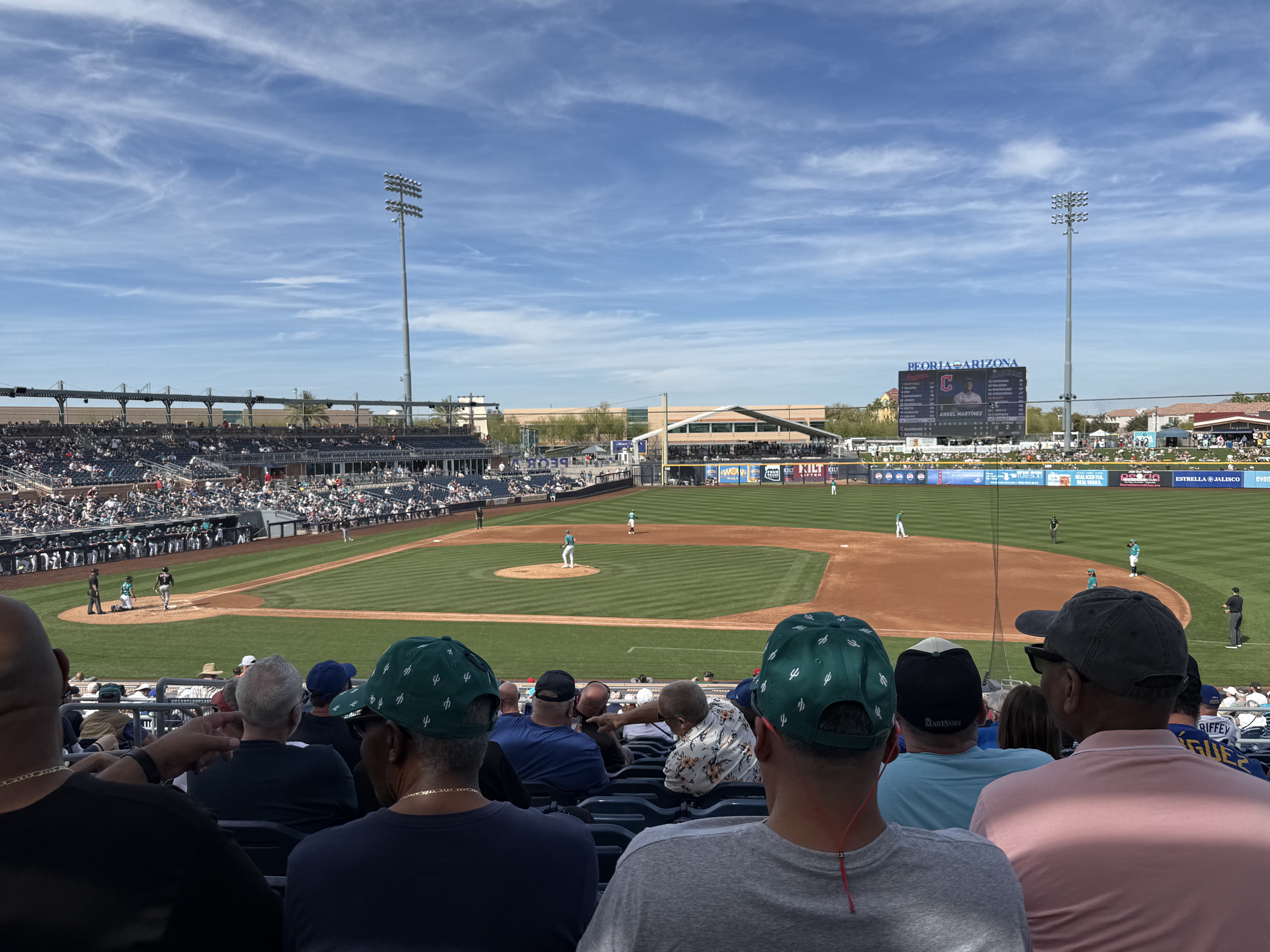 Mileage driven to date: 2,599We were up and out the door by 6:30 AM today, and headed towards Peoria, AZ (after a quick stop for an egg McMuffin), for a Mariners‘ Spring Training game against the Cleveland Guardians. We arrived just before 9:00 AM, which was a good thing because we parked in the wrong parking lot, which we didn’t discover until we were at the (wrong) entrance gate (it was for the San Diego Padres!). So after walking back to the car, and driving around to the opposite side of the training facility, we were ready to watch morning practice! While standing in line, we ran into Susie and Dave, acquaintances from back home, who were attending the game with Susie’s daughter and family.