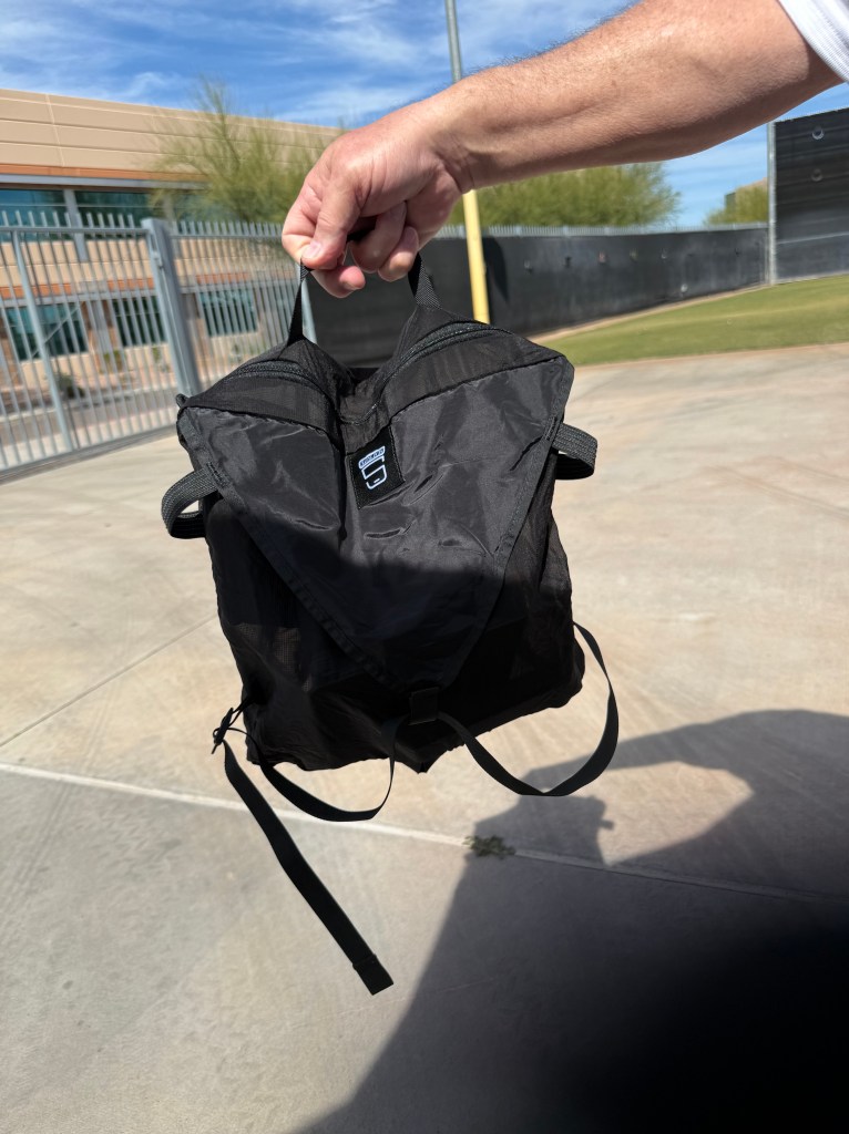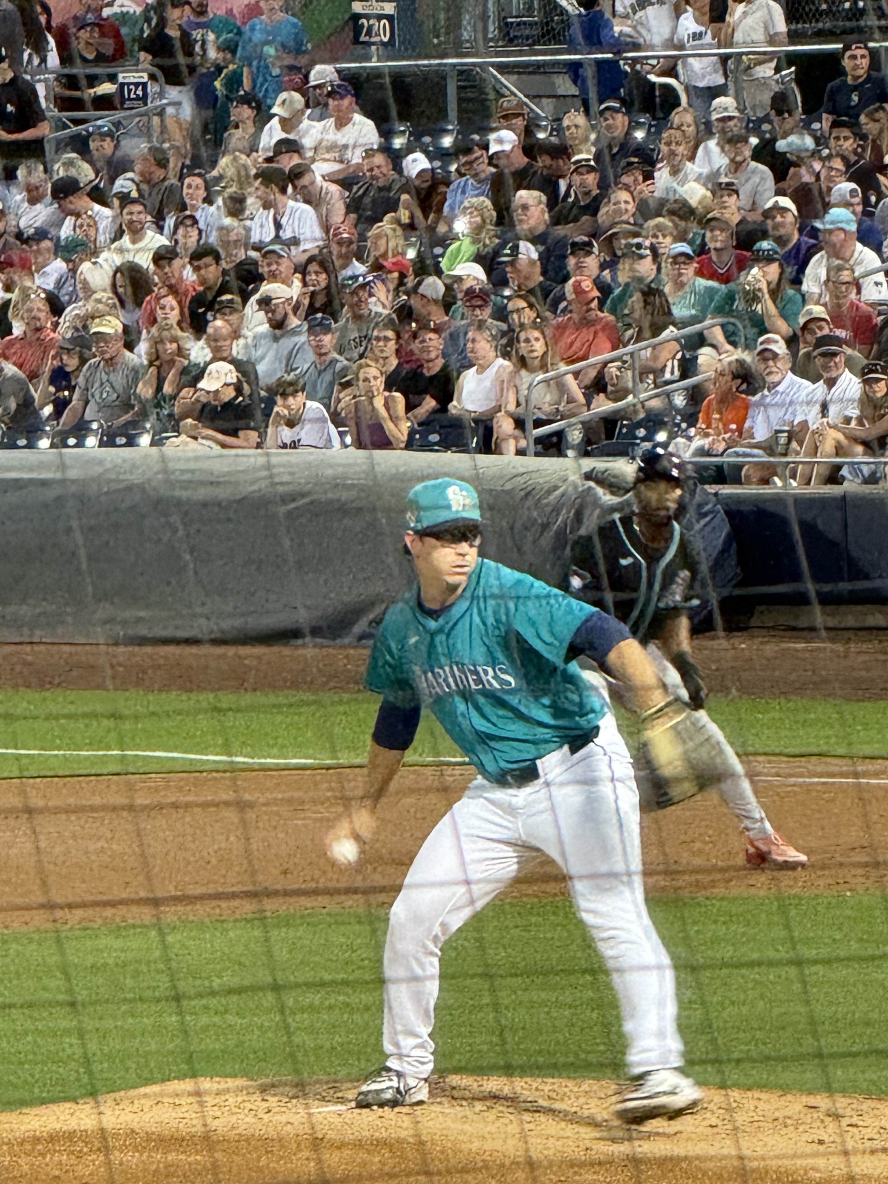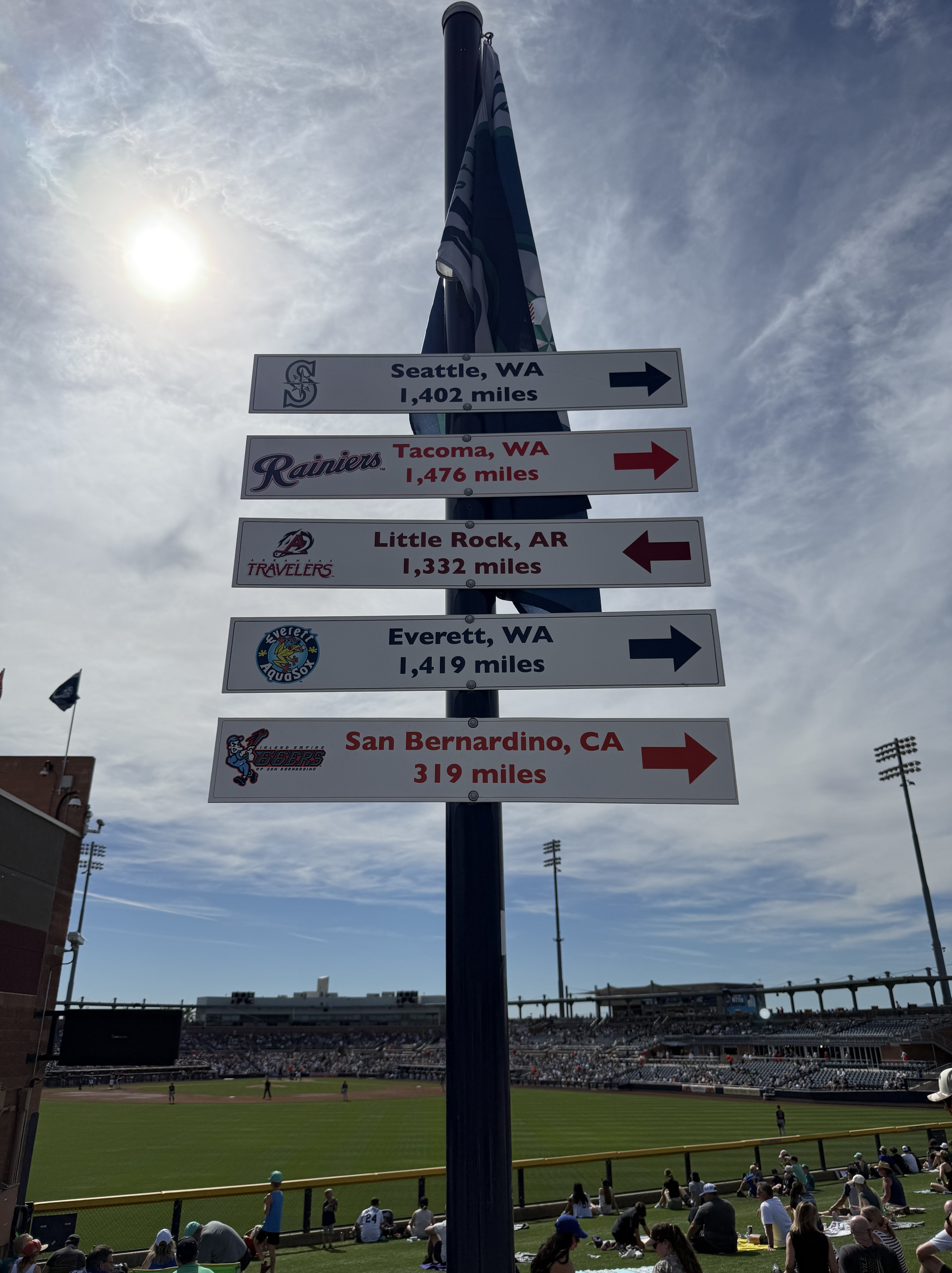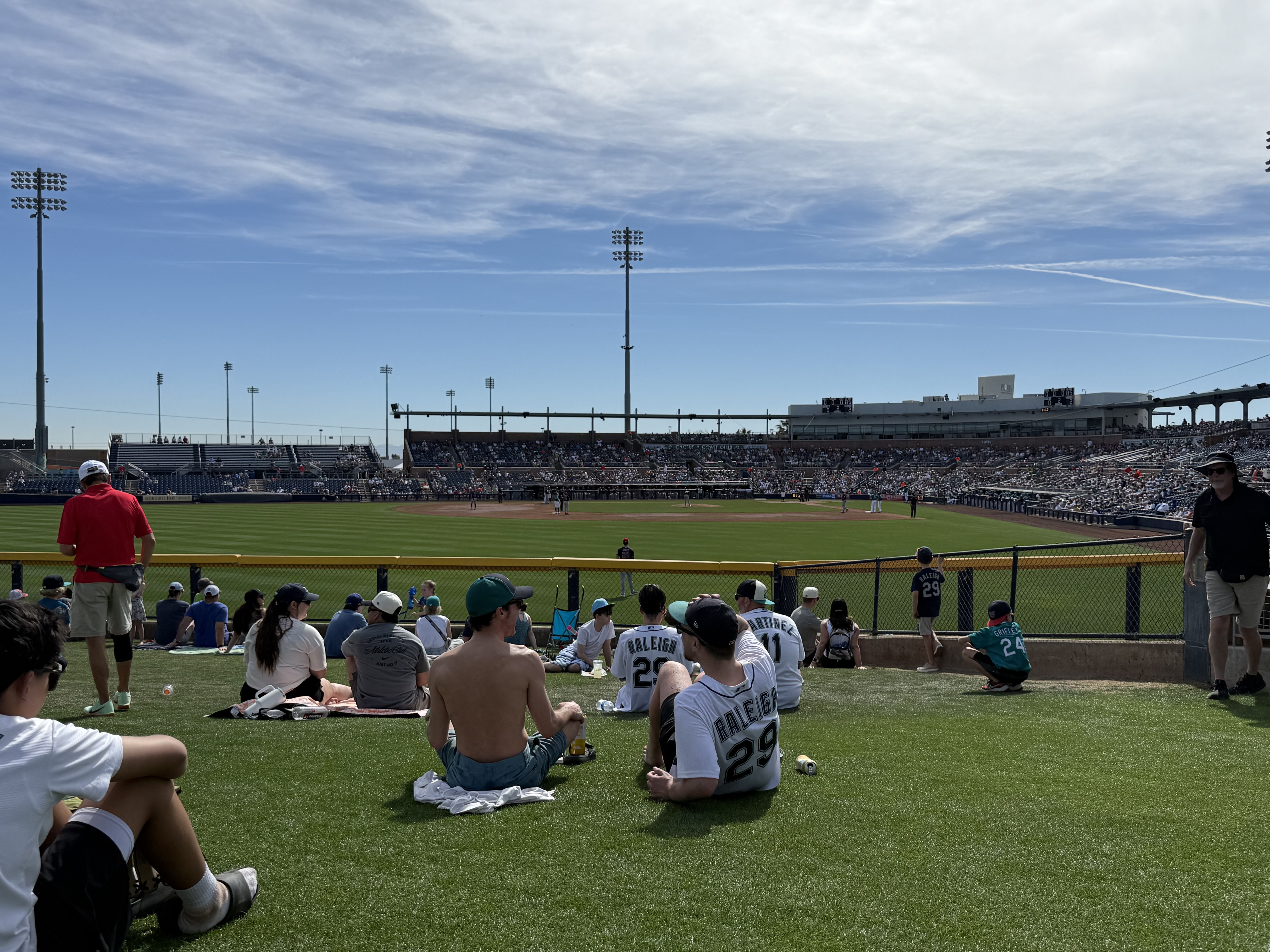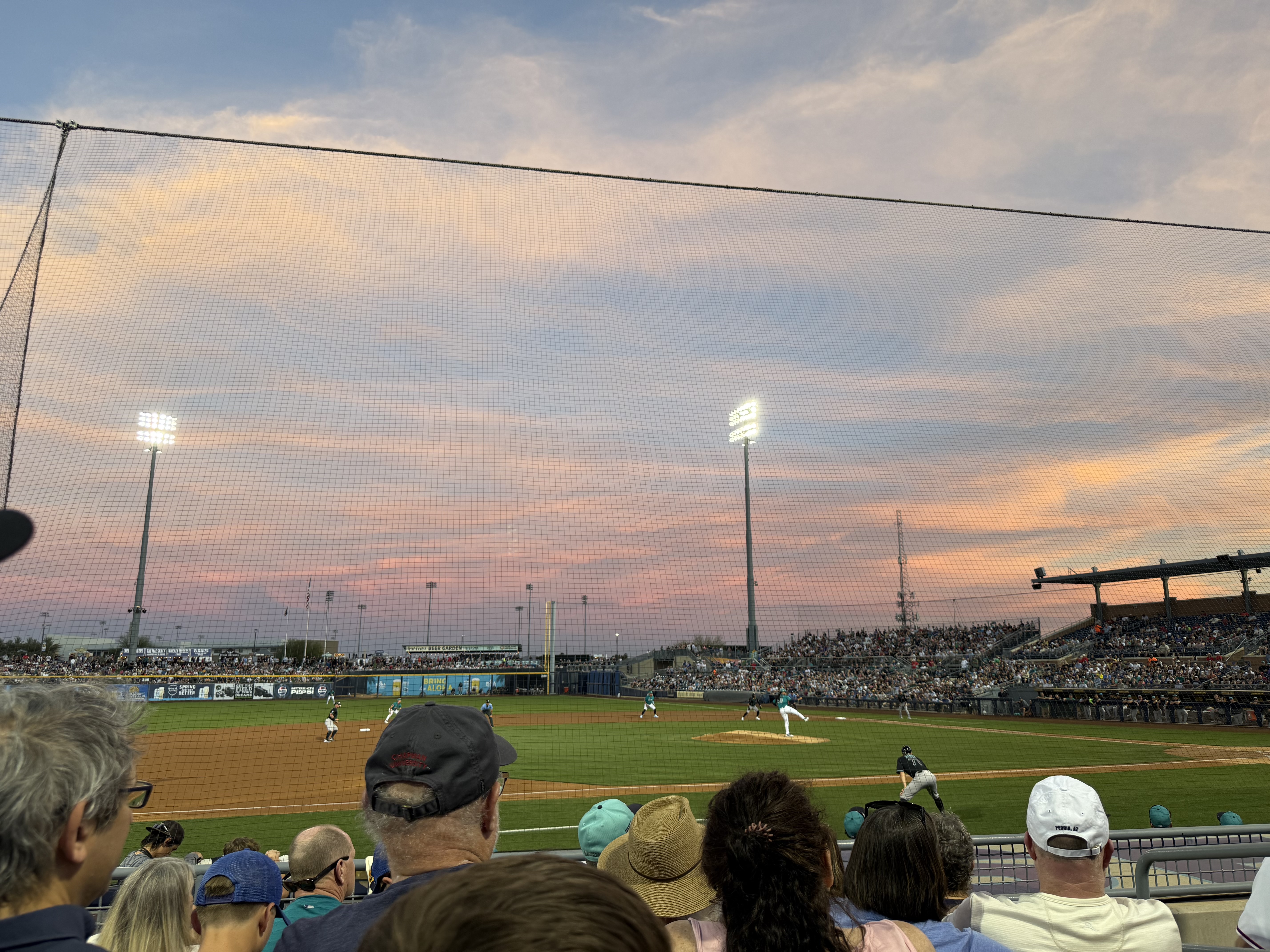 Mileage driven to date: 2,599We were up and out the door by 6:30 AM today, and headed towards Peoria, AZ (after a quick stop for an egg McMuffin), for a Mariners‘ Spring Training game against the Cleveland Guardians. We arrived just before 9:00 AM, which was a good thing because we parked in the wrong parking lot, which we didn’t discover until we were at the (wrong) entrance gate (it was for the San Diego Padres!). So after walking back to the car, and driving around to the opposite side of the training facility, we were ready to watch morning practice! While standing in line, we ran into Susie and Dave, acquaintances from back home, who were attending the game with Susie’s daughter and family.