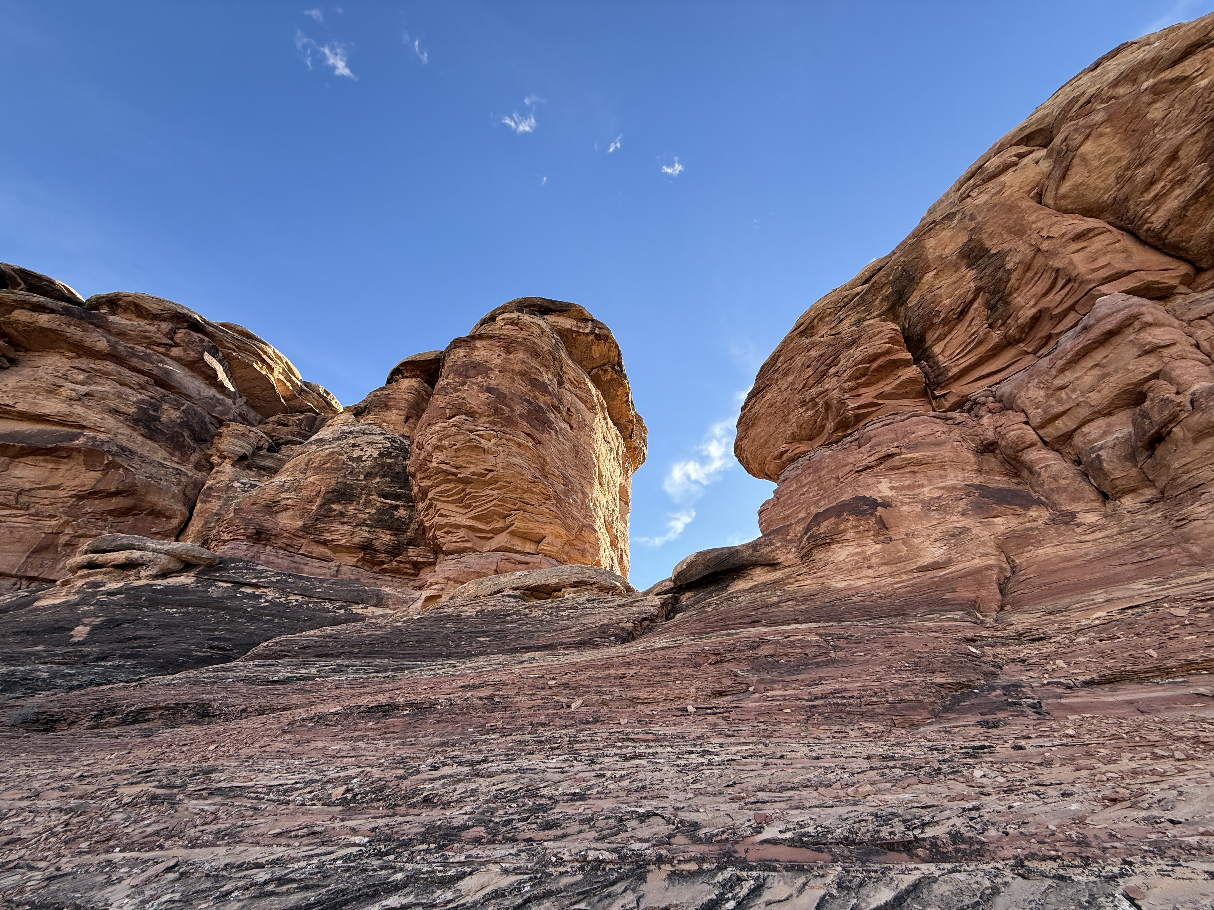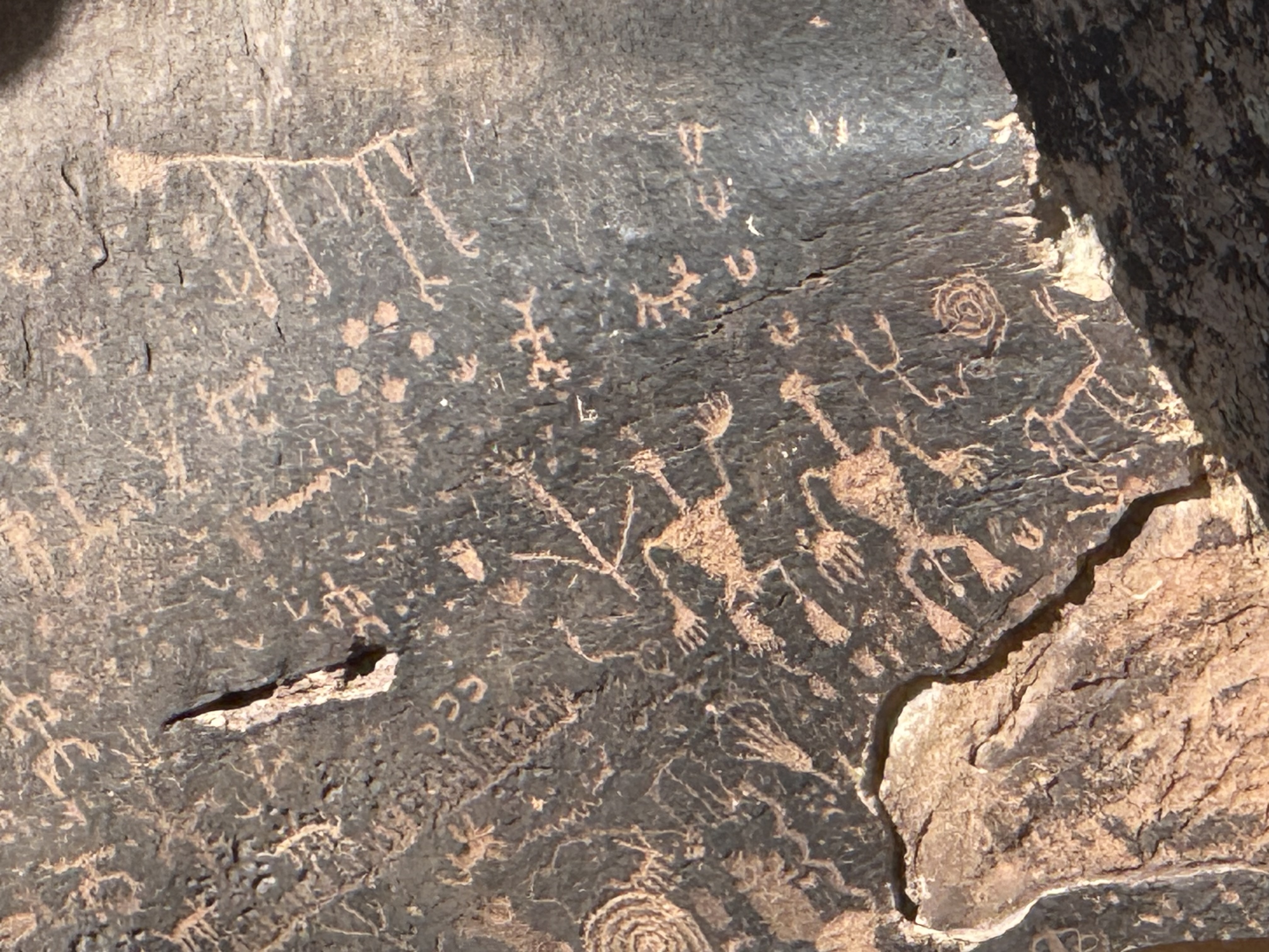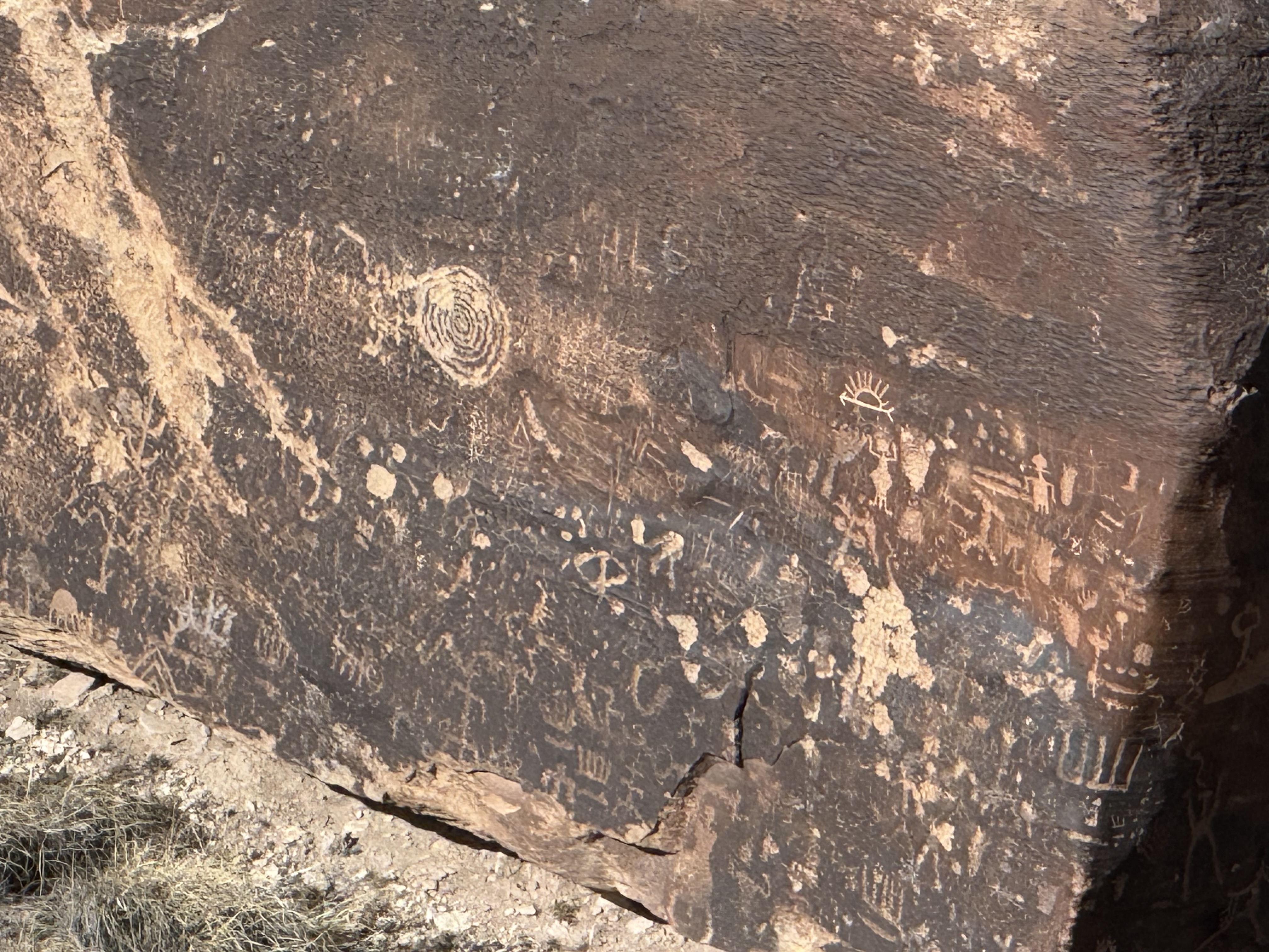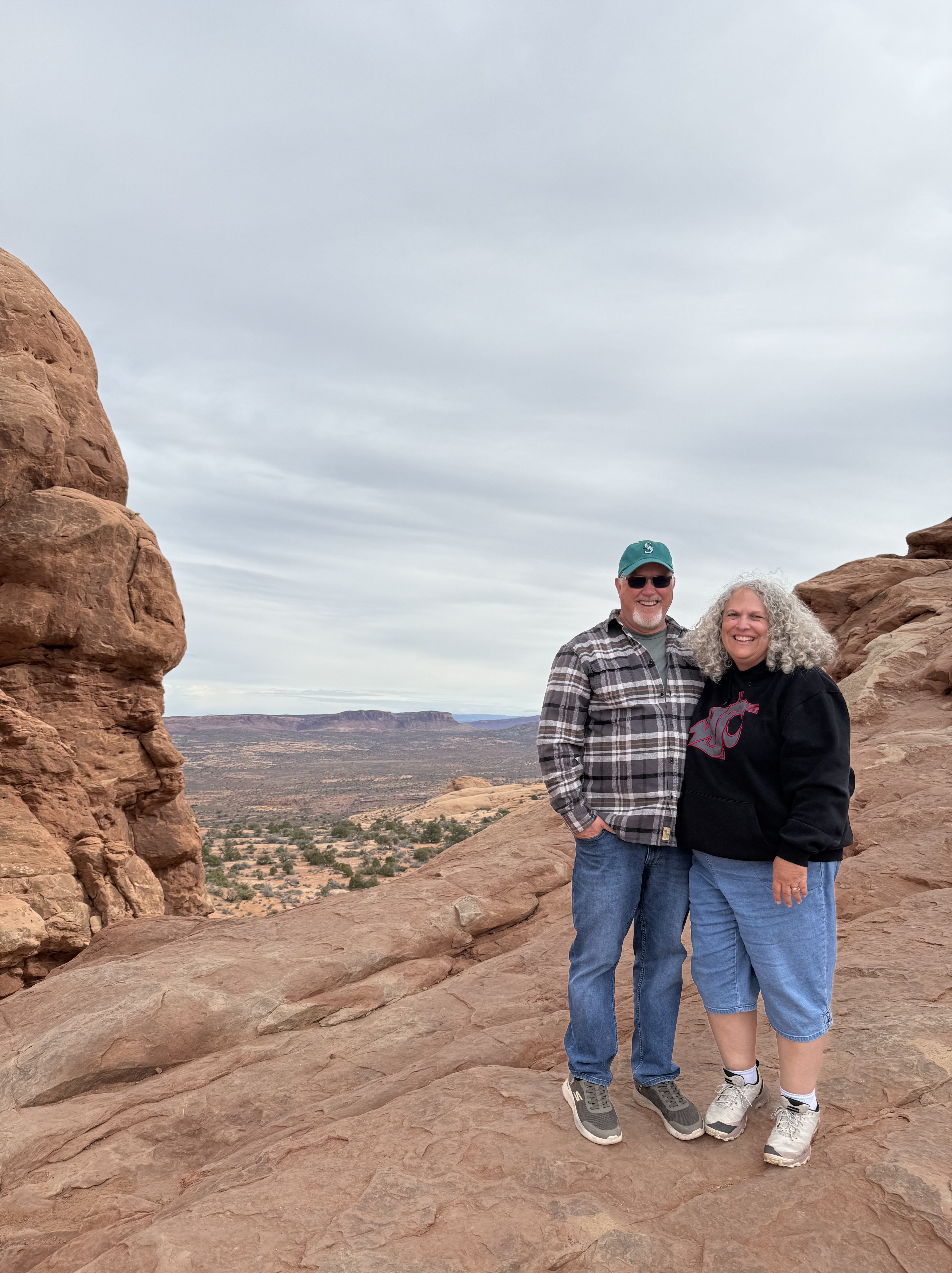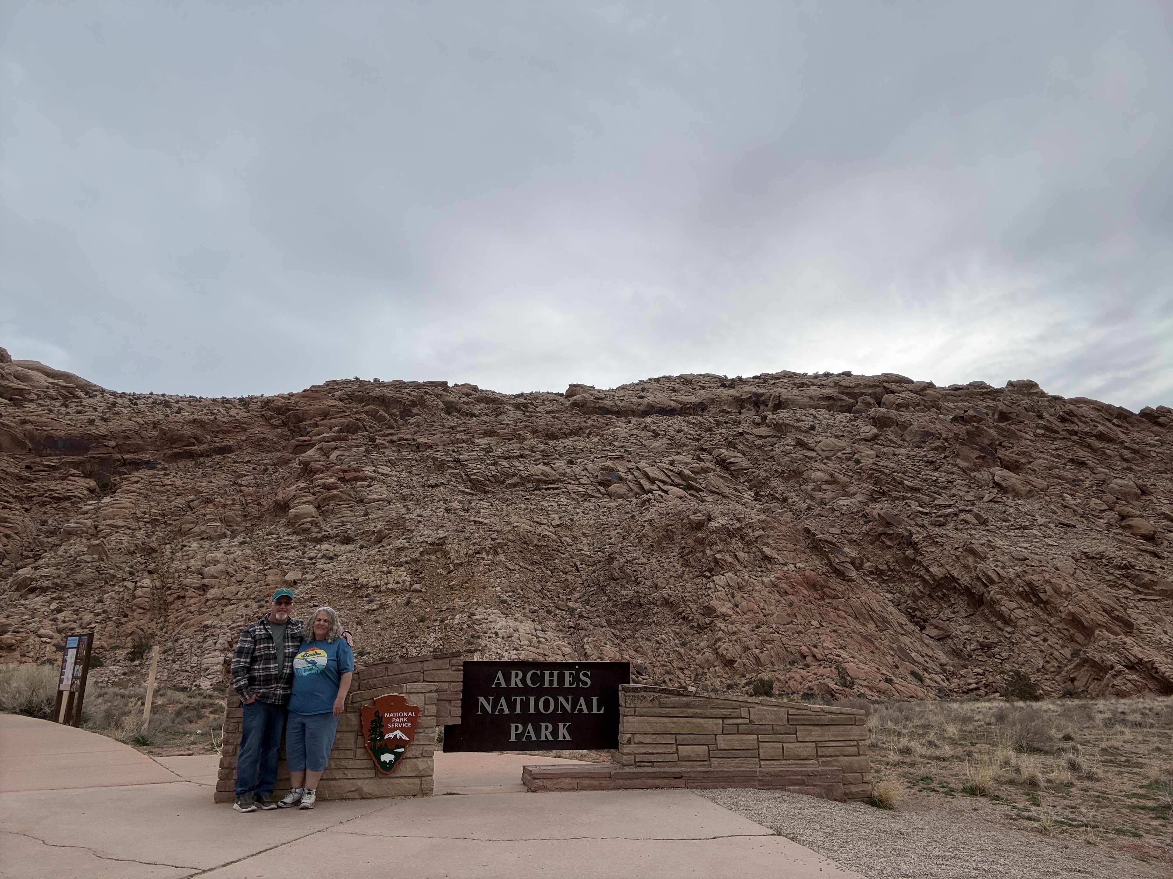 We continued our journey towards Canyonlands National Park, located just outside of Moab, UT. We were quickly approaching 4:00 PM, so after a quick stop at Newspaper Rock State Historic Monument, which was an up close view of a large petroglyph covered rock, we hurried on to the visitor center for a map and a stamp for our Passport Book. The Park Ranger and visitor center host were both gracious and friendly, and Jon had a nice chat with them while gathered the stamp and a sticker for the passport book, too. We then drove through the park, stopping at a few viewpoints to take in the splendor of this unknown-to-us national treasure. This was a beautiful drive with alternating vistas, canyons, and spires of multi-colored sandstone and rocks. At the end of the road, we opted for a short hike up some of the rocks to take in the view of a canyon in one direction and the desert vista in the other. It was beginning to near sunset, and we had not had lunch so dinner was starting to be a priority. We cut our exploring short, and returned to the highway to Moab. Canyonlands NP was a true surprise and a real treat. We would like to return to explore it more sometime in the future.