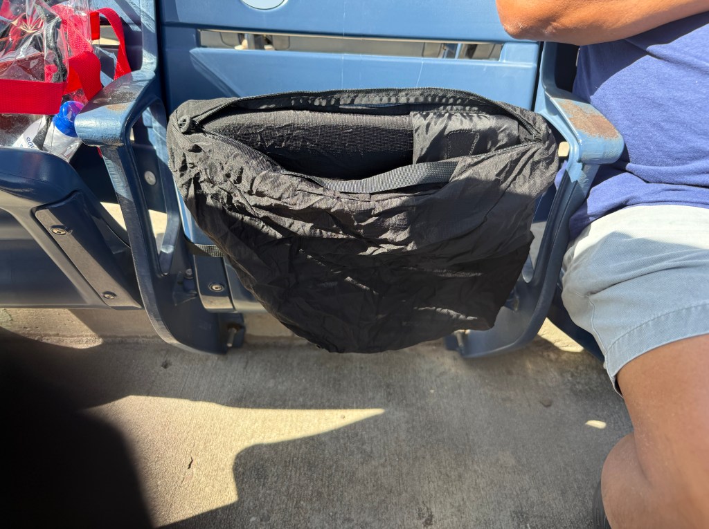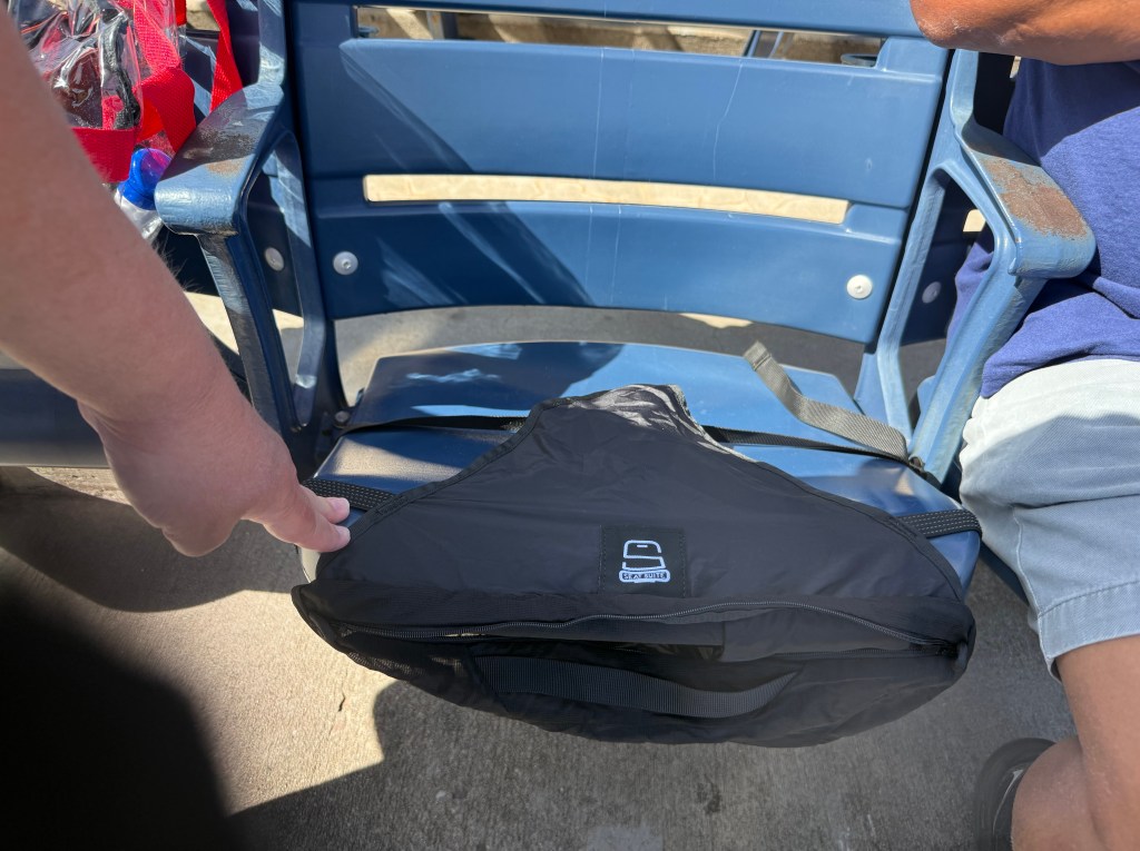 The Seat Suite on a folded down stadium seat.