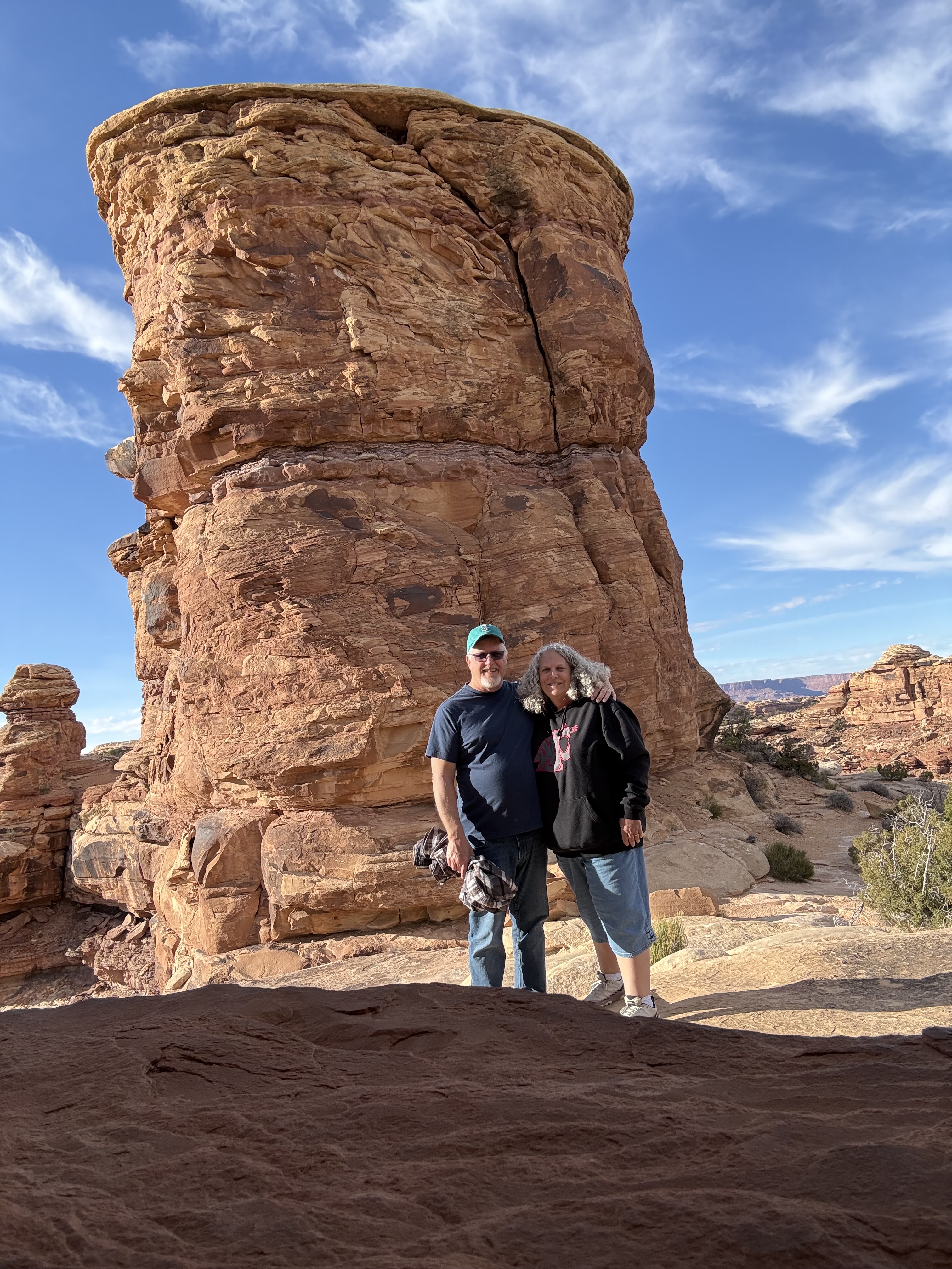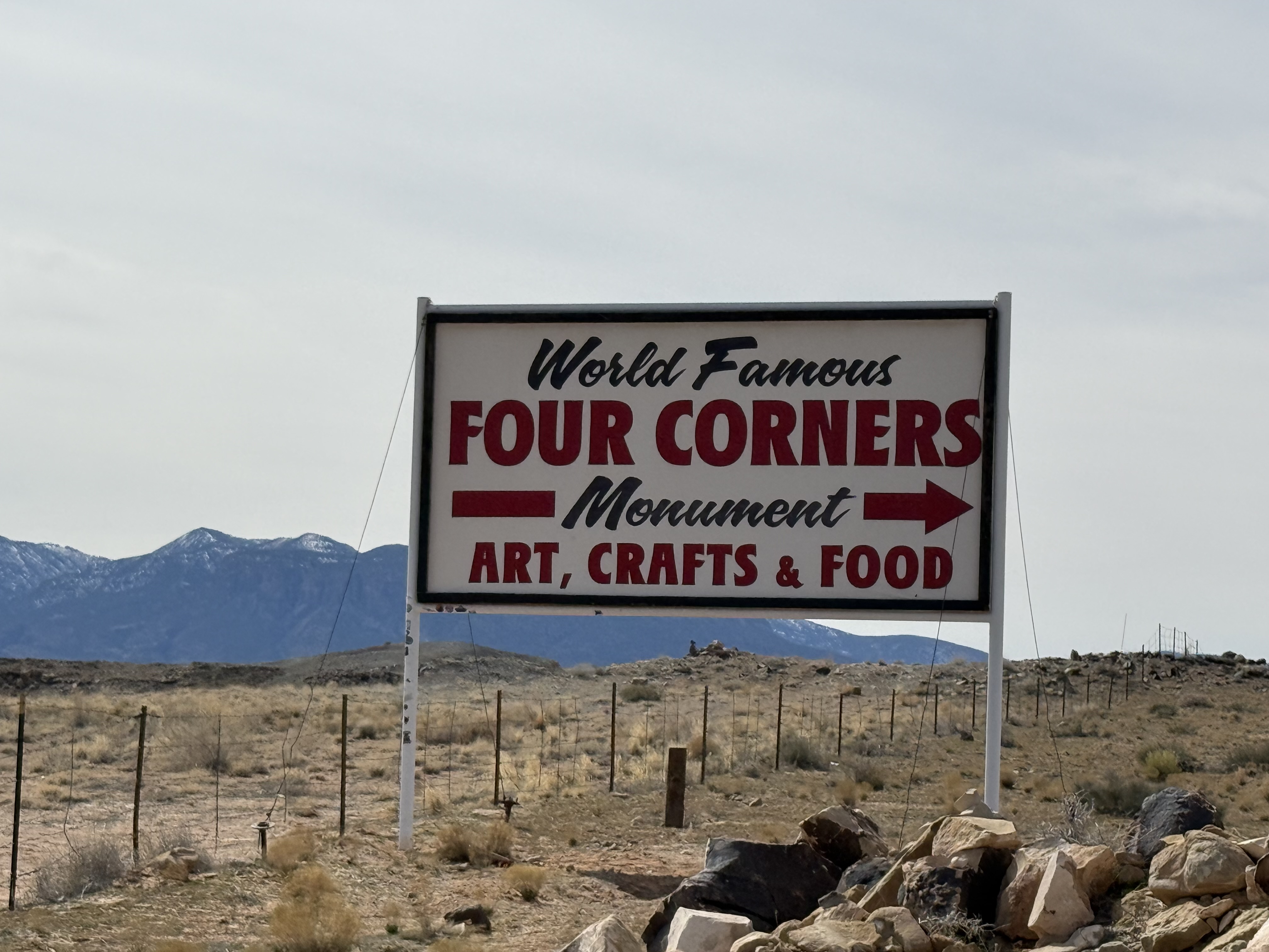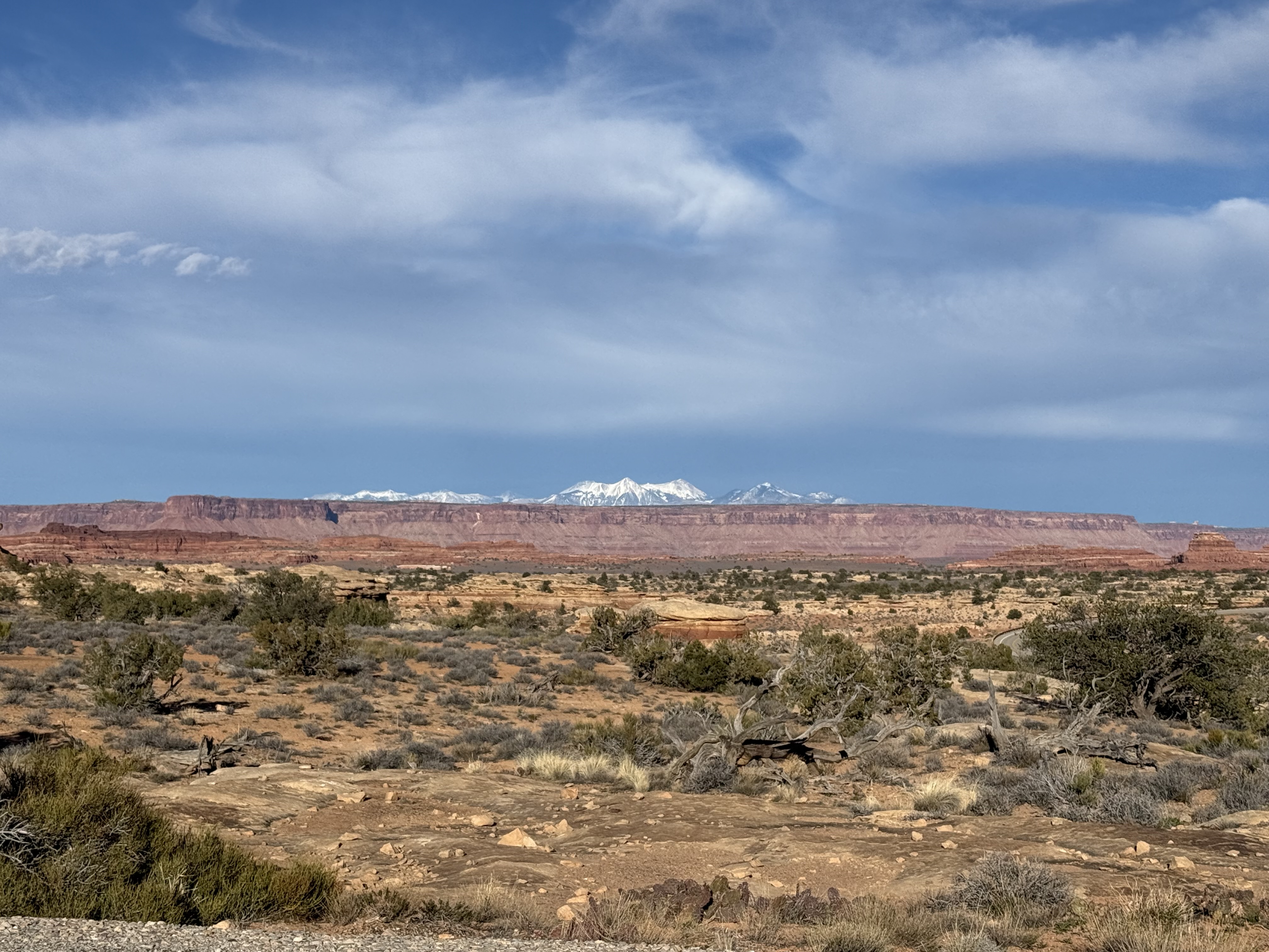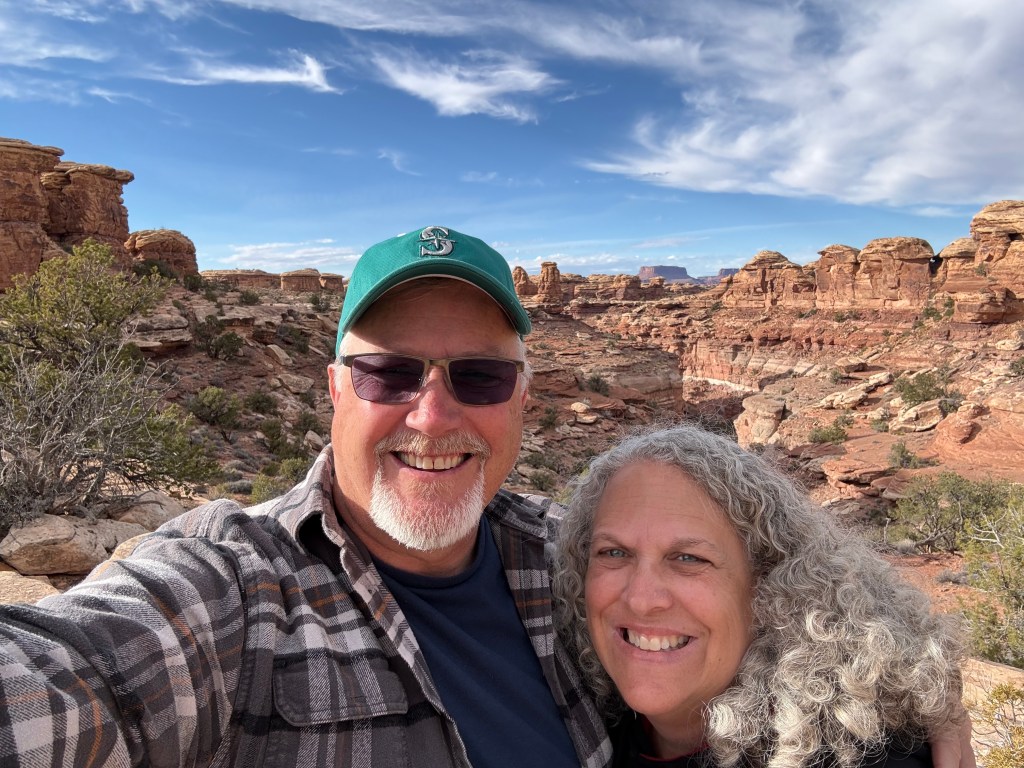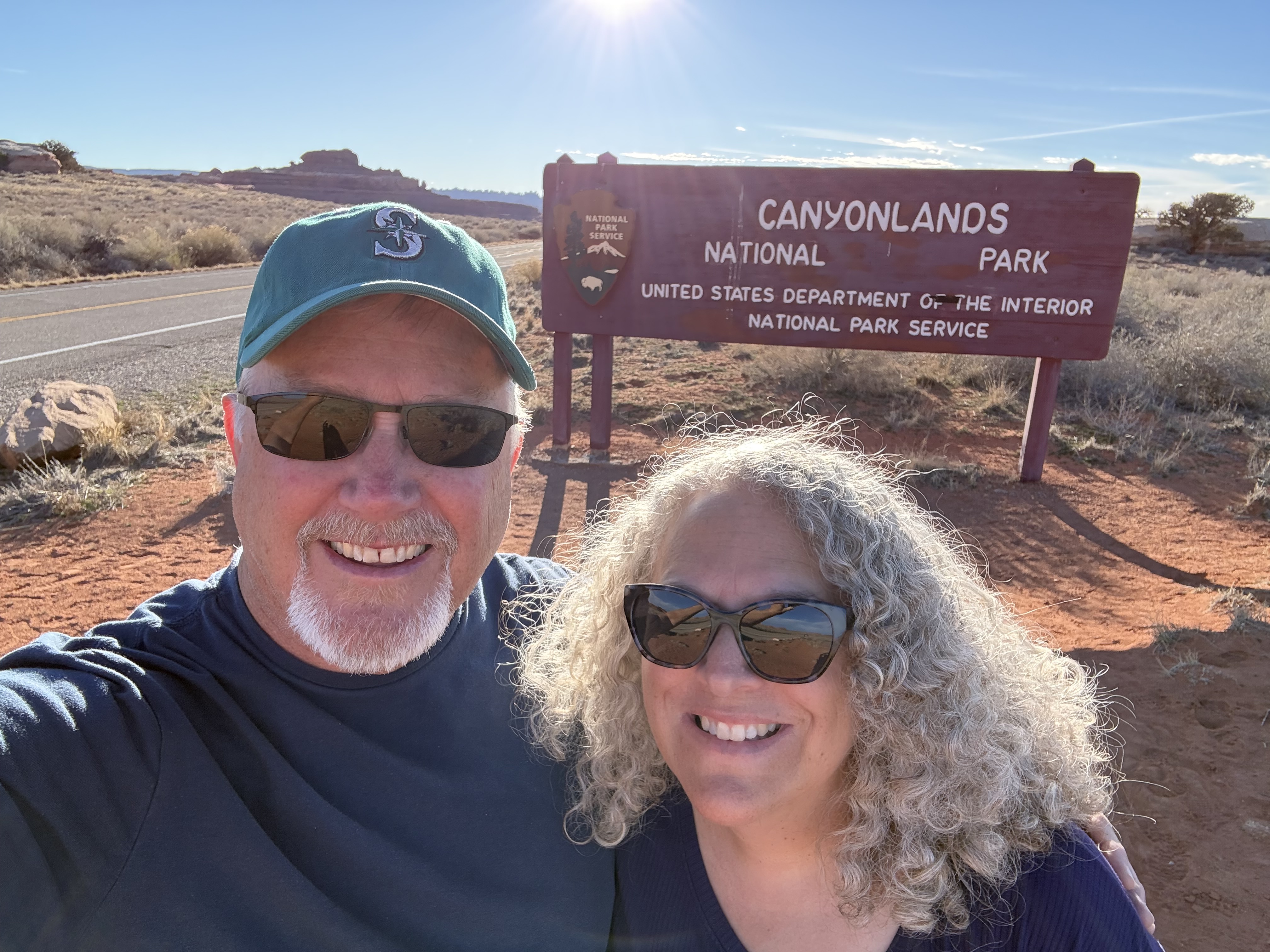 Because we did not travel the scenic drive through Monument Valley or stop at the visitor center, we decided to make a detour to visit the Four Corners, which was about a 90 minute addition to our route towards Canyonlands NP. The back road to this tourist trap we were routed on was nearly empty, and left me wondering if Google Maps knew where it was going! Eventually we came to the famed Four Corners spot, only to discover (again) that it is now a pay-to-see experience, due to being on Native American land rather than US owned land. We were not willing to pay $20 to stand on a marker for a 30 second photo experience, so we turned around continued on our way. So far, we’ve struck out on the side trips for the day! But this trip to the Four Corners did take us not only briefly into Utah and Arizona, but then also into New Mexico for a while and then (unexpectedly) into state #7 for the trip – Colorado, before returning us to Utah!