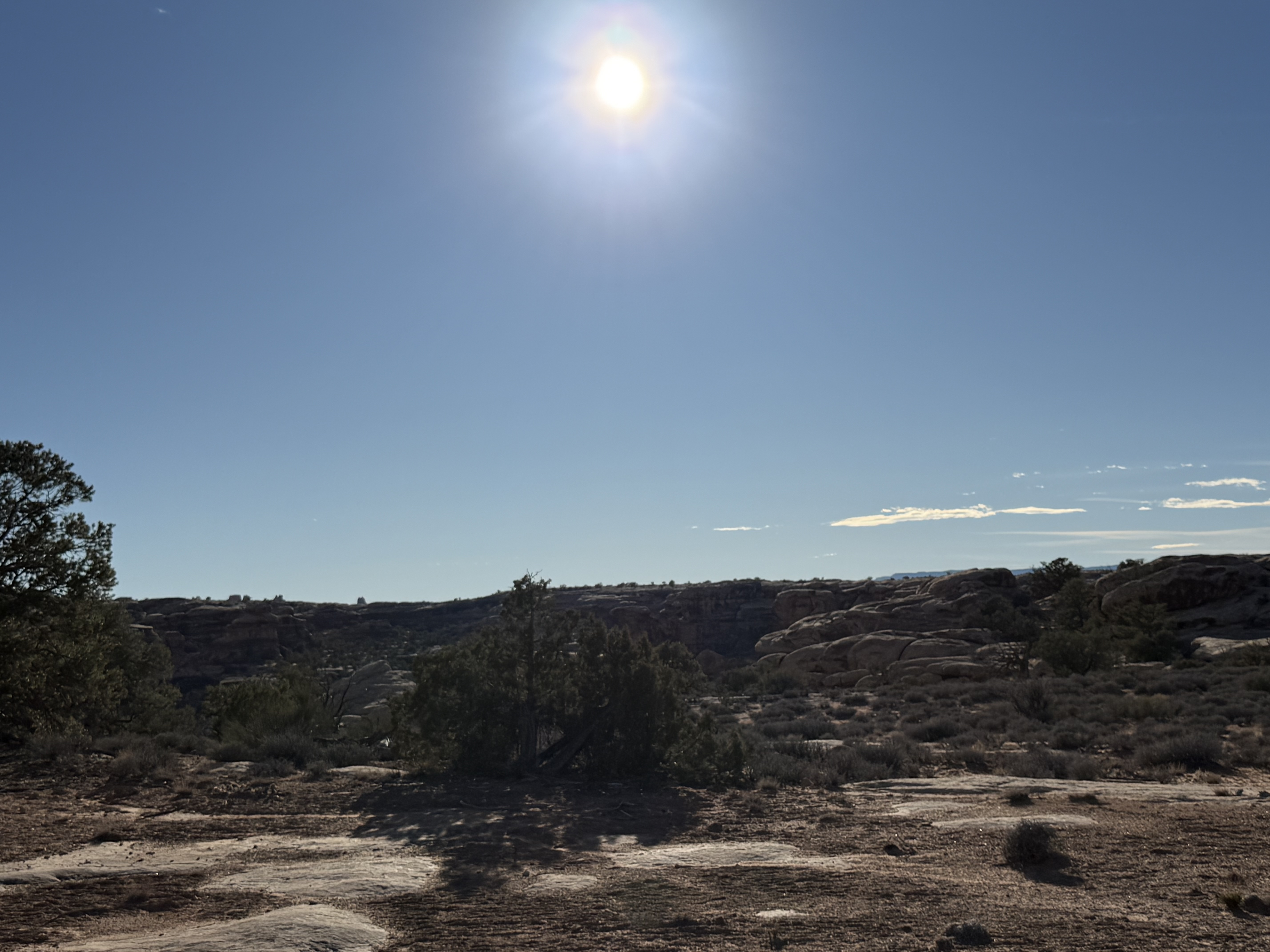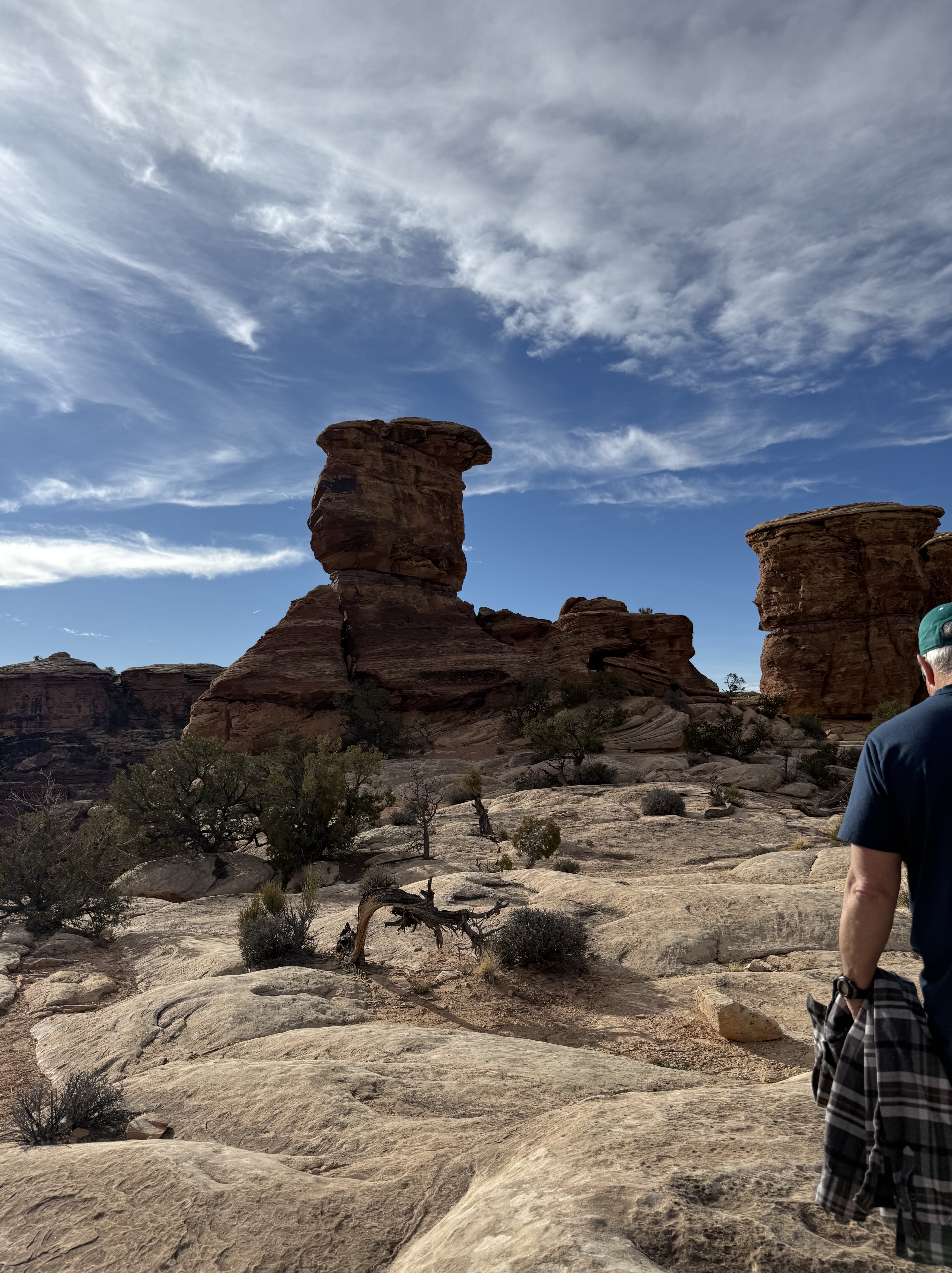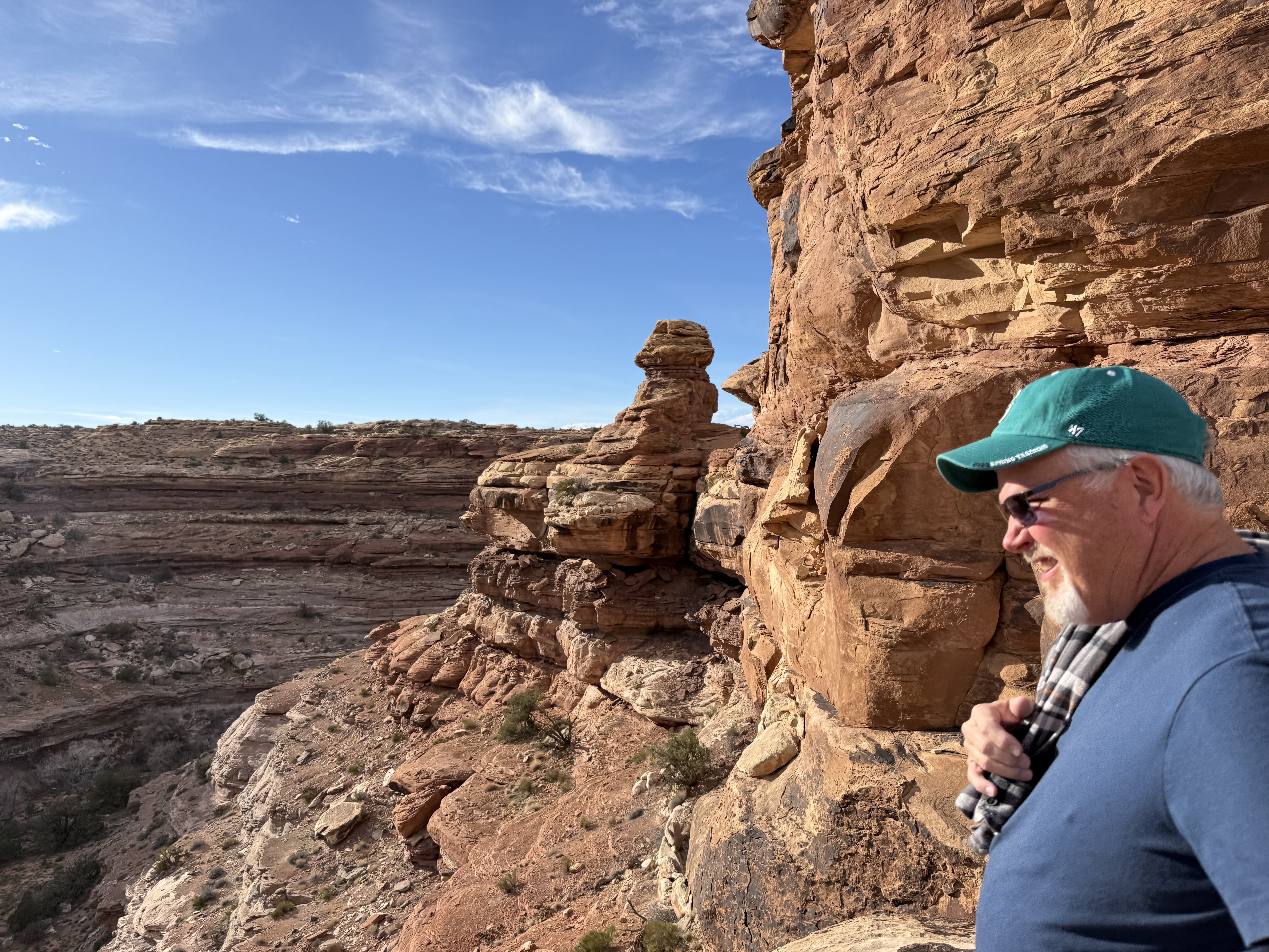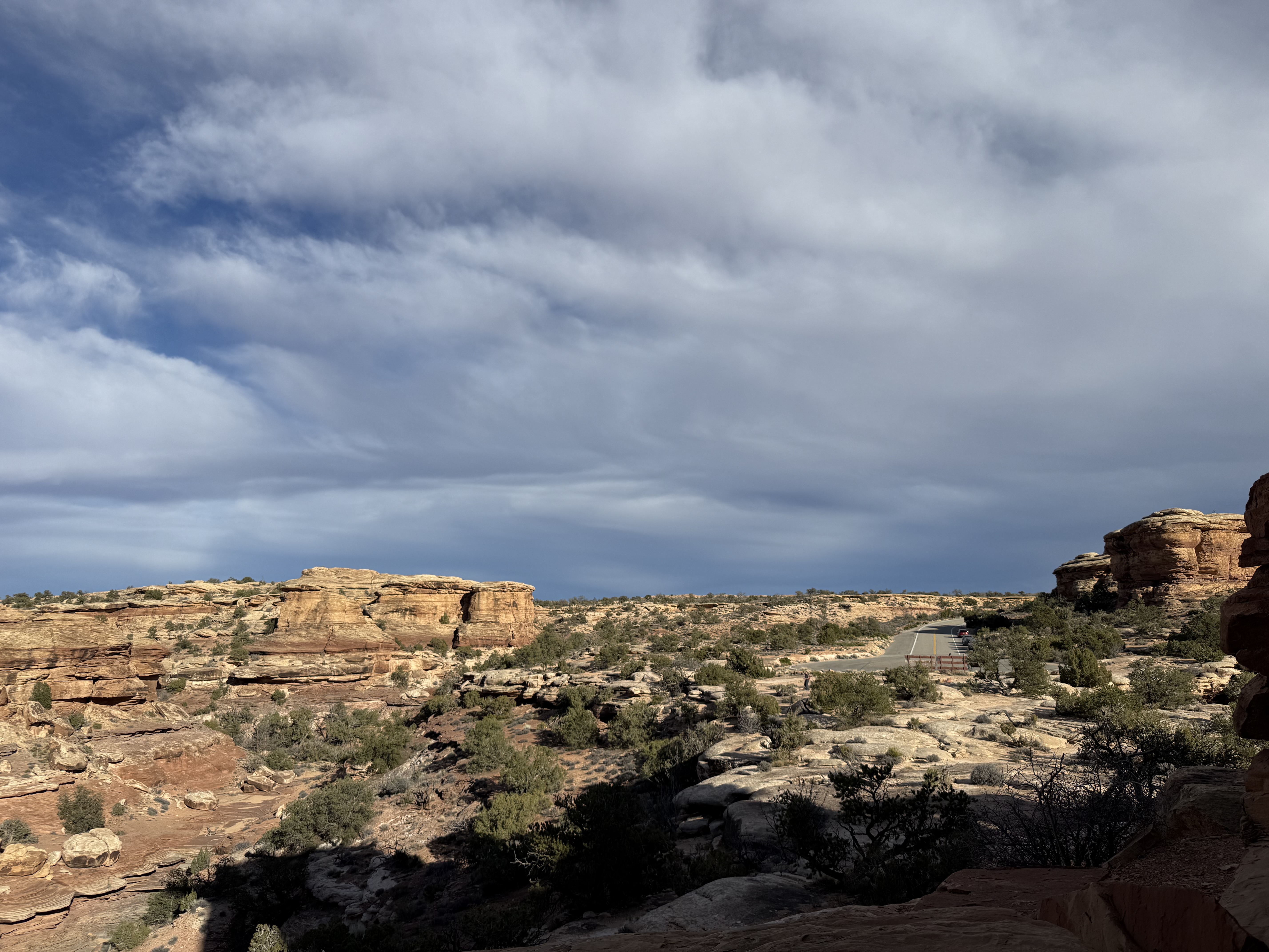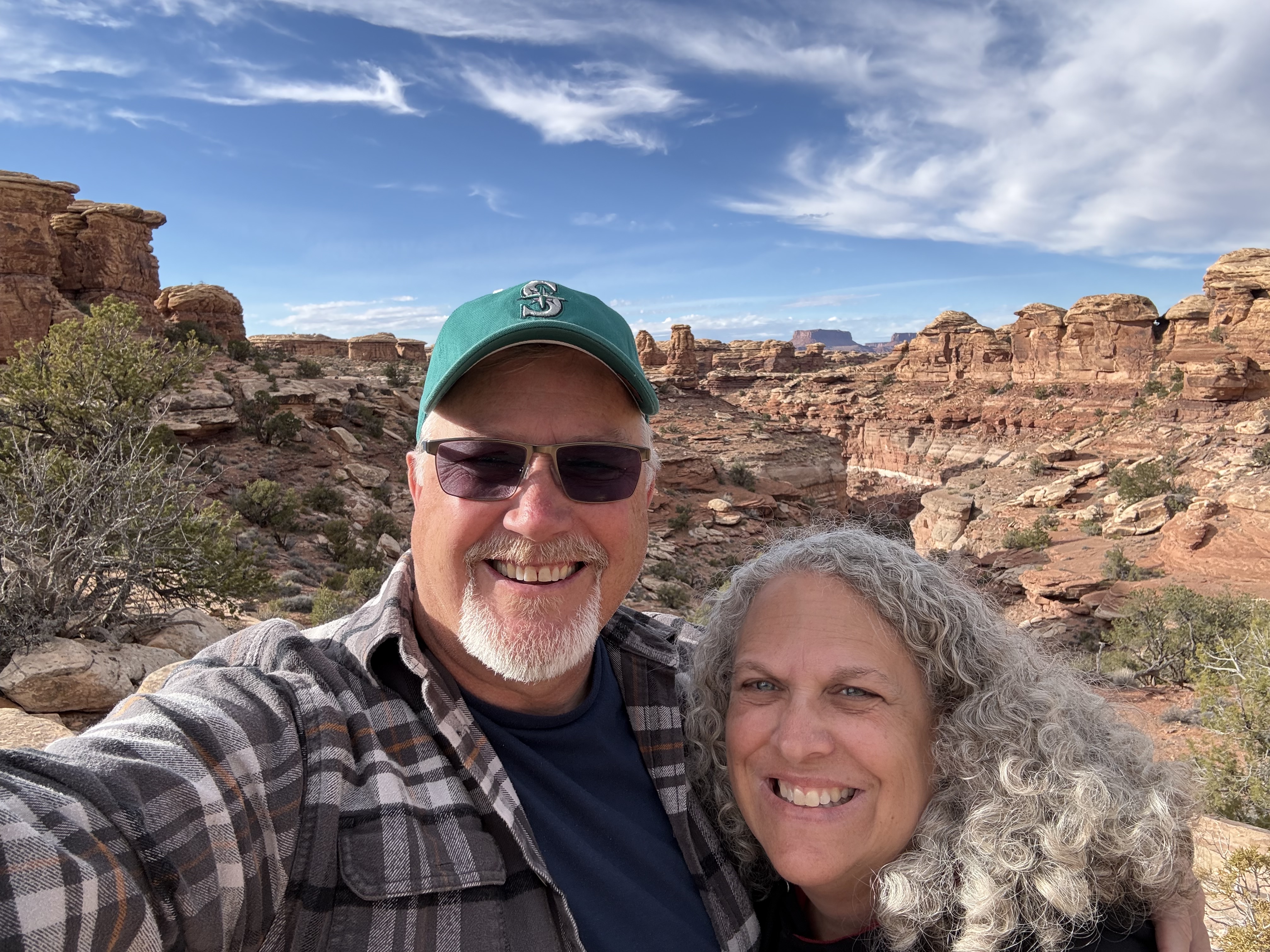 Because we did not travel the scenic drive through Monument Valley or stop at the visitor center, we decided to make a detour to visit the Four Corners, which was about a 90 minute addition to our route towards Canyonlands NP. The back road to this tourist trap we were routed on was nearly empty, and left me wondering if Google Maps knew where it was going! Eventually we came to the famed Four Corners spot, only to discover (again) that it is now a pay-to-see experience, due to being on Native American land rather than US owned land. We were not willing to pay $20 to stand on a marker for a 30 second photo experience, so we turned around continued on our way. So far, we’ve struck out on the side trips for the day! But this trip to the Four Corners did take us not only briefly into Utah and Arizona, but then also into New Mexico for a while and then (unexpectedly) into state #7 for the trip – Colorado, before returning us to Utah!
