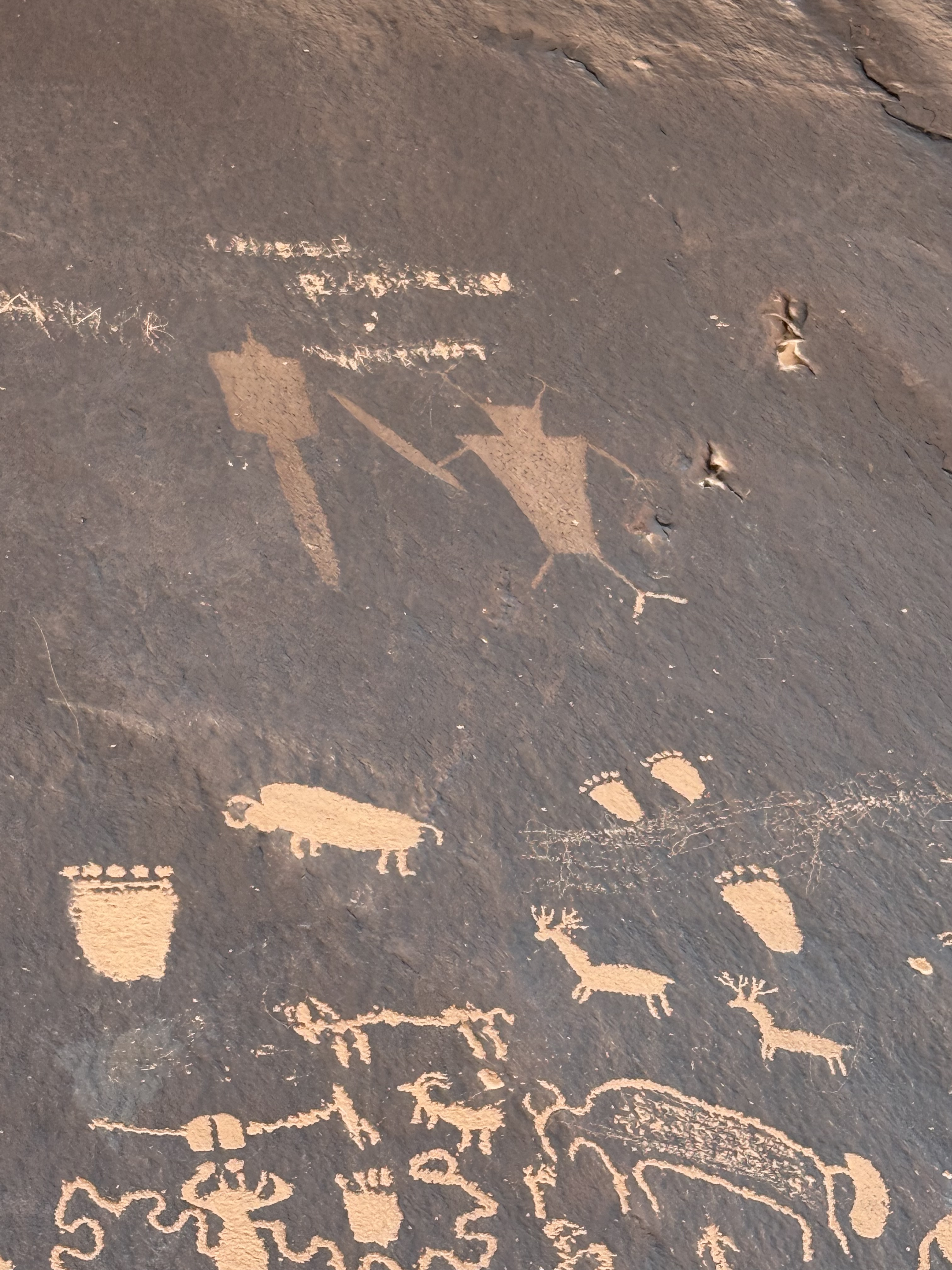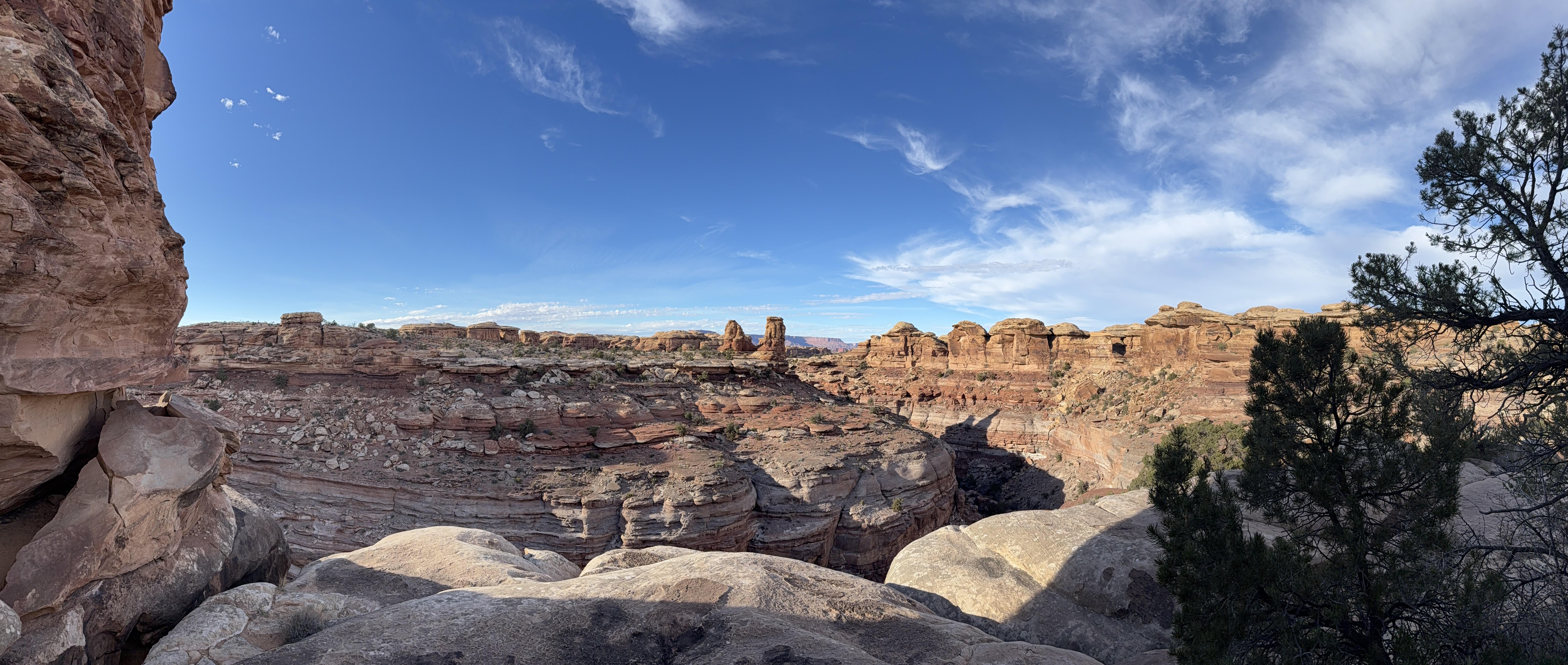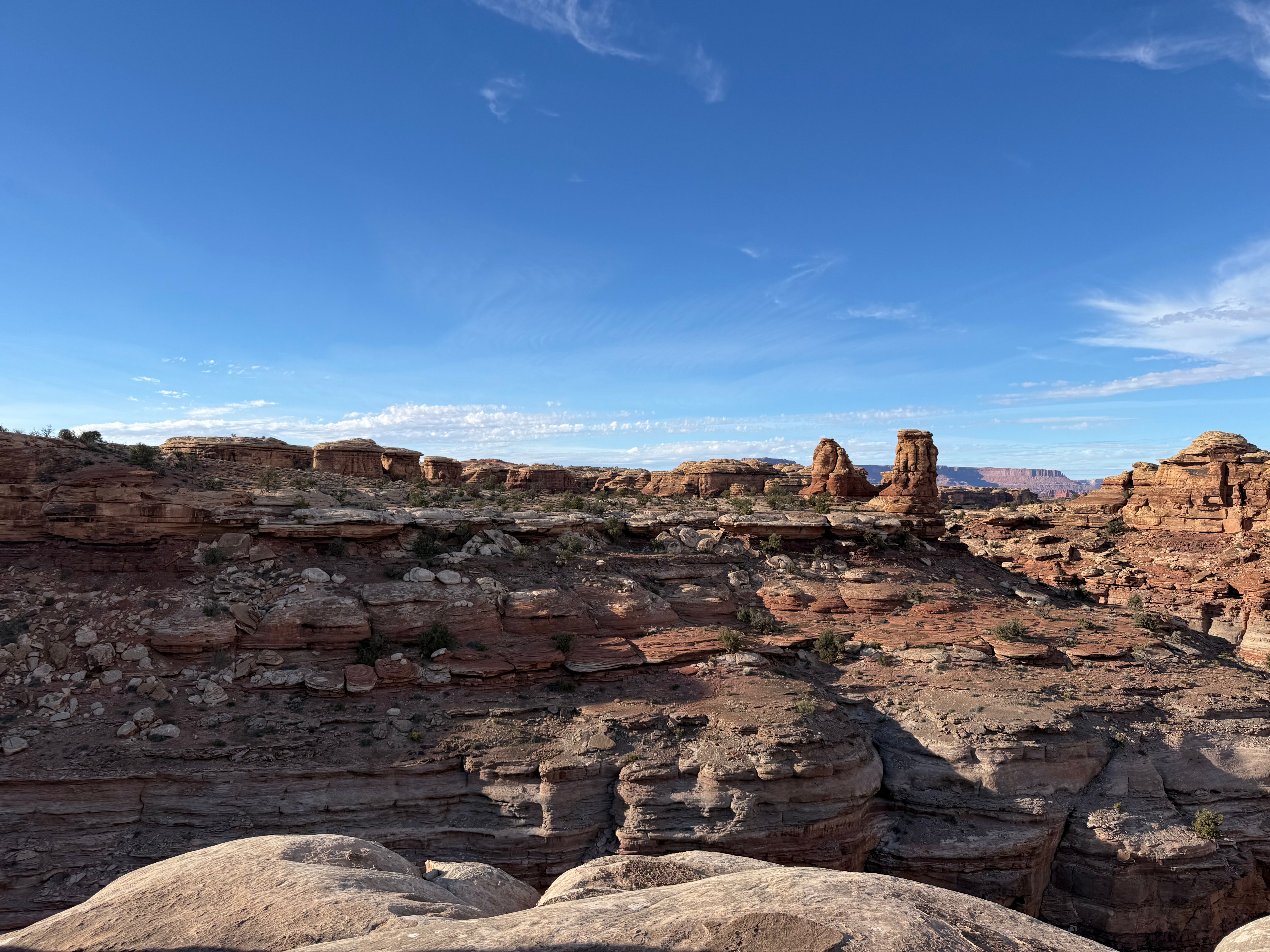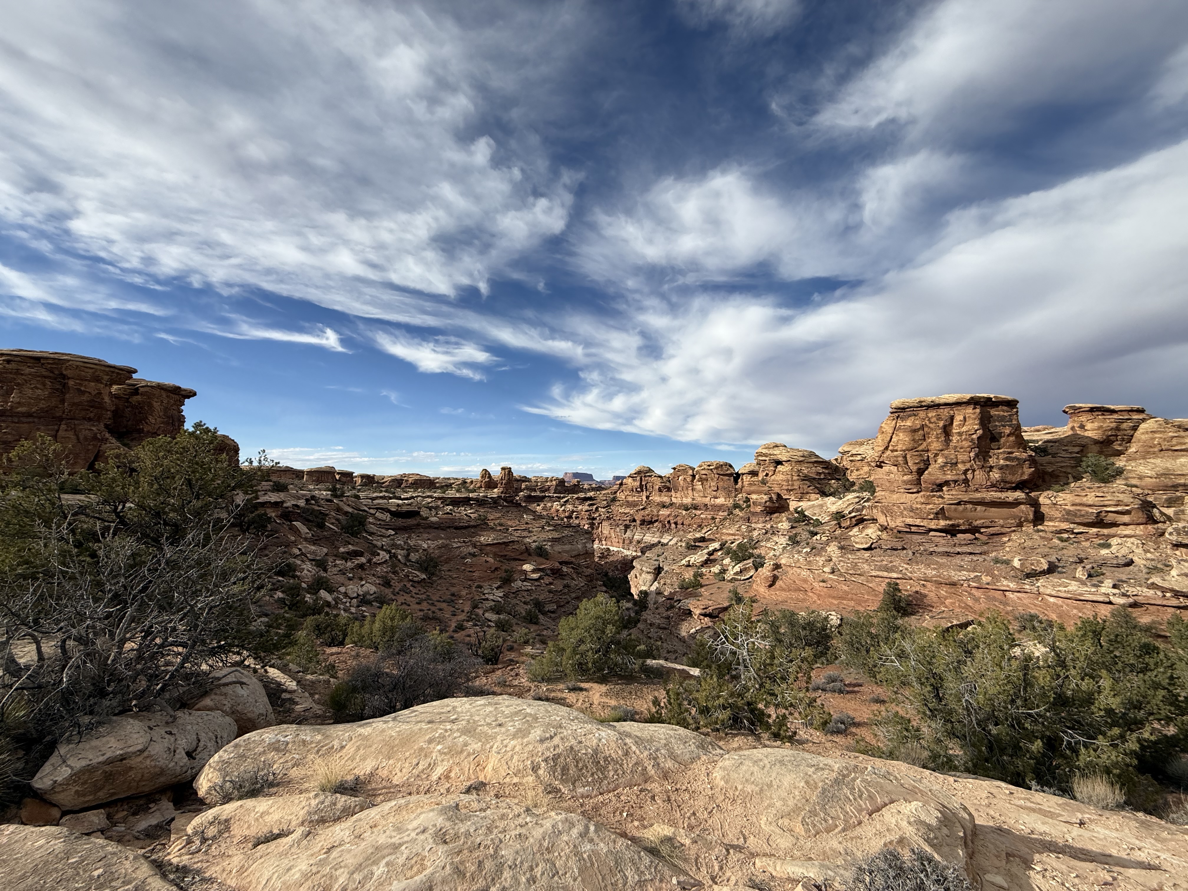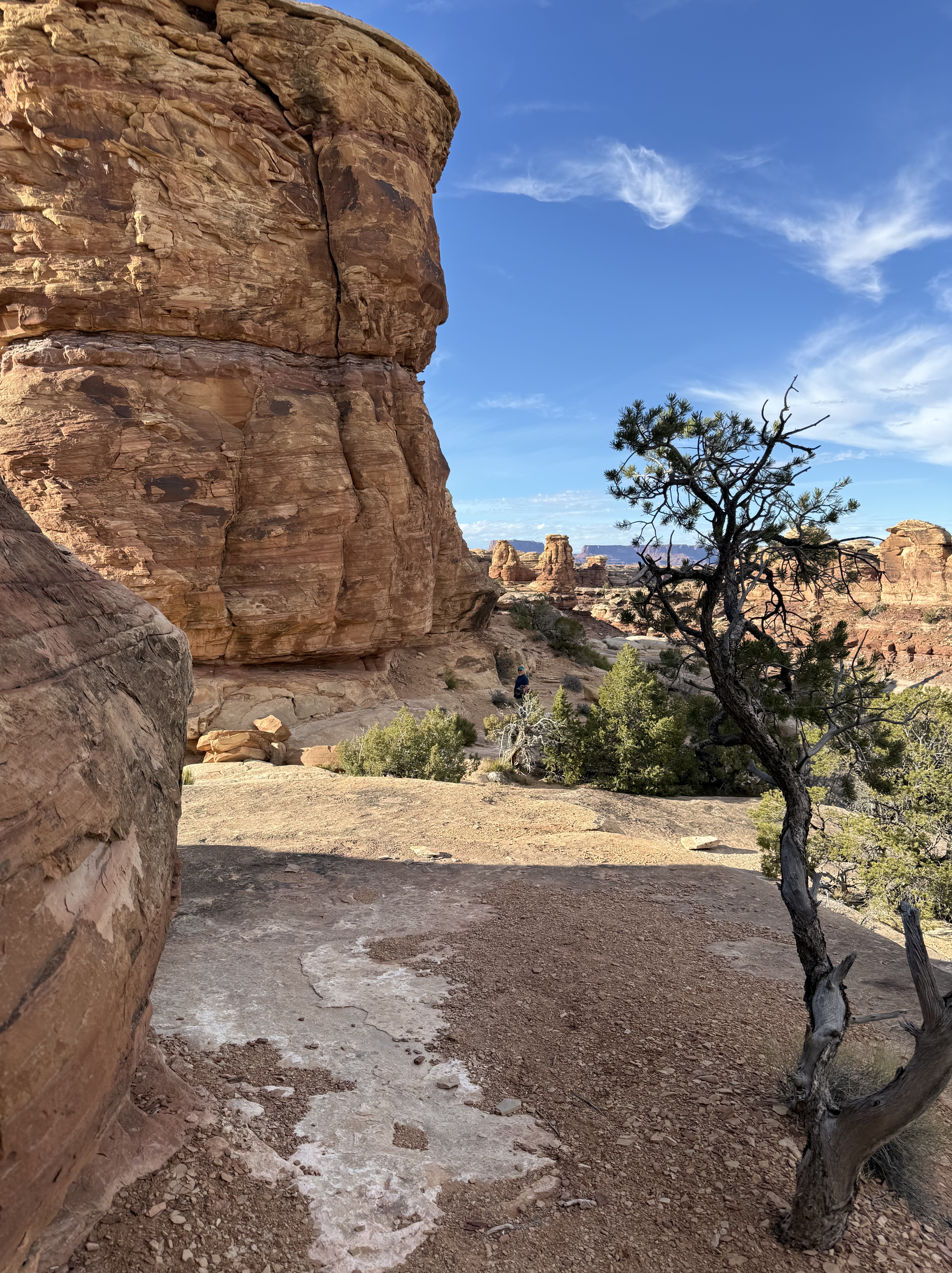 Because we did not travel the scenic drive through Monument Valley or stop at the visitor center, we decided to make a detour to visit the Four Corners, which was about a 90 minute addition to our route towards Canyonlands NP. The back road to this tourist trap we were routed on was nearly empty, and left me wondering if Google Maps knew where it was going! Eventually we came to the famed Four Corners spot, only to discover (again) that it is now a pay-to-see experience, due to being on Native American land rather than US owned land. We were not willing to pay $20 to stand on a marker for a 30 second photo experience, so we turned around continued on our way. So far, we’ve struck out on the side trips for the day! But this trip to the Four Corners did take us not only briefly into Utah and Arizona, but then also into New Mexico for a while and then (unexpectedly) into state #7 for the trip – Colorado, before returning us to Utah!