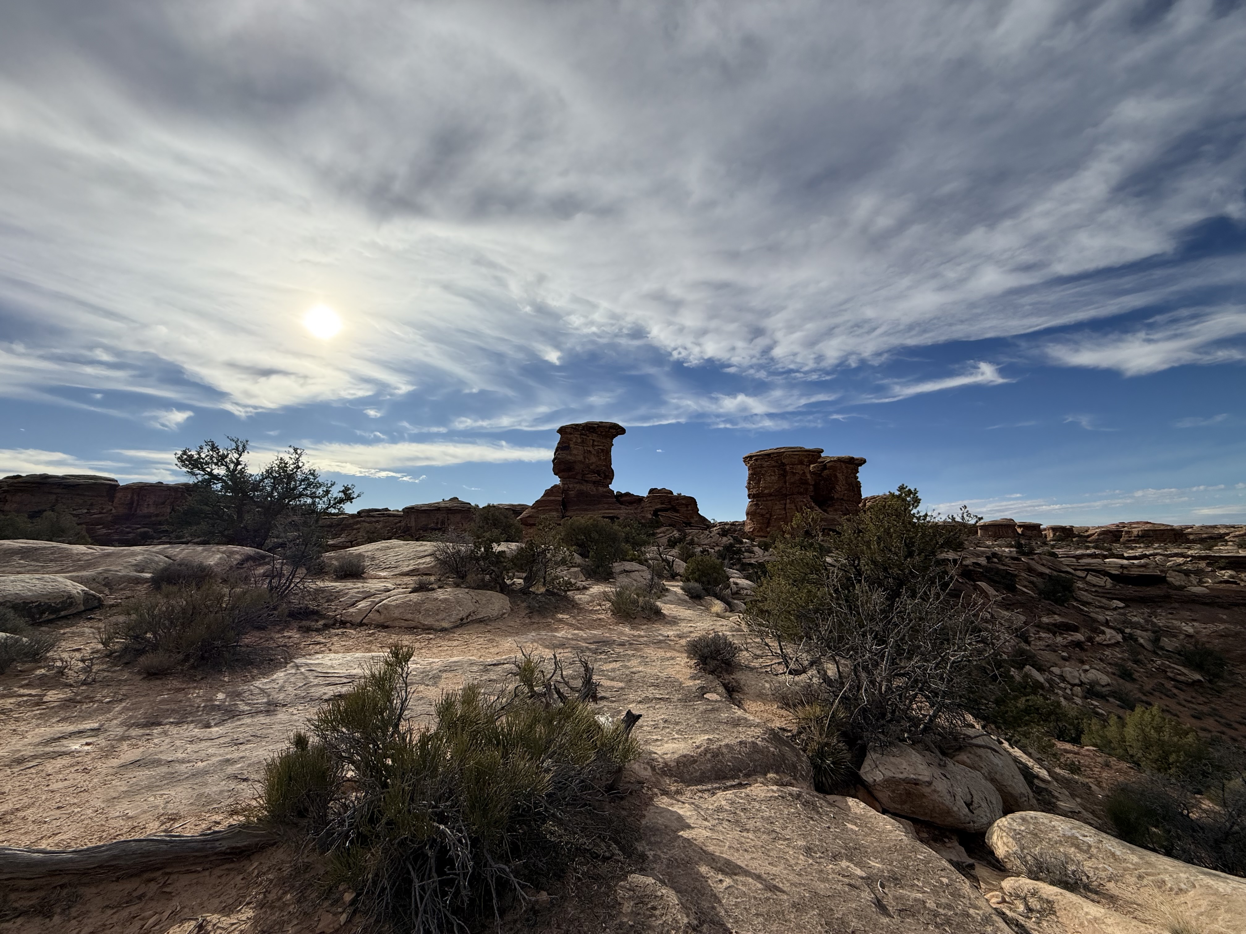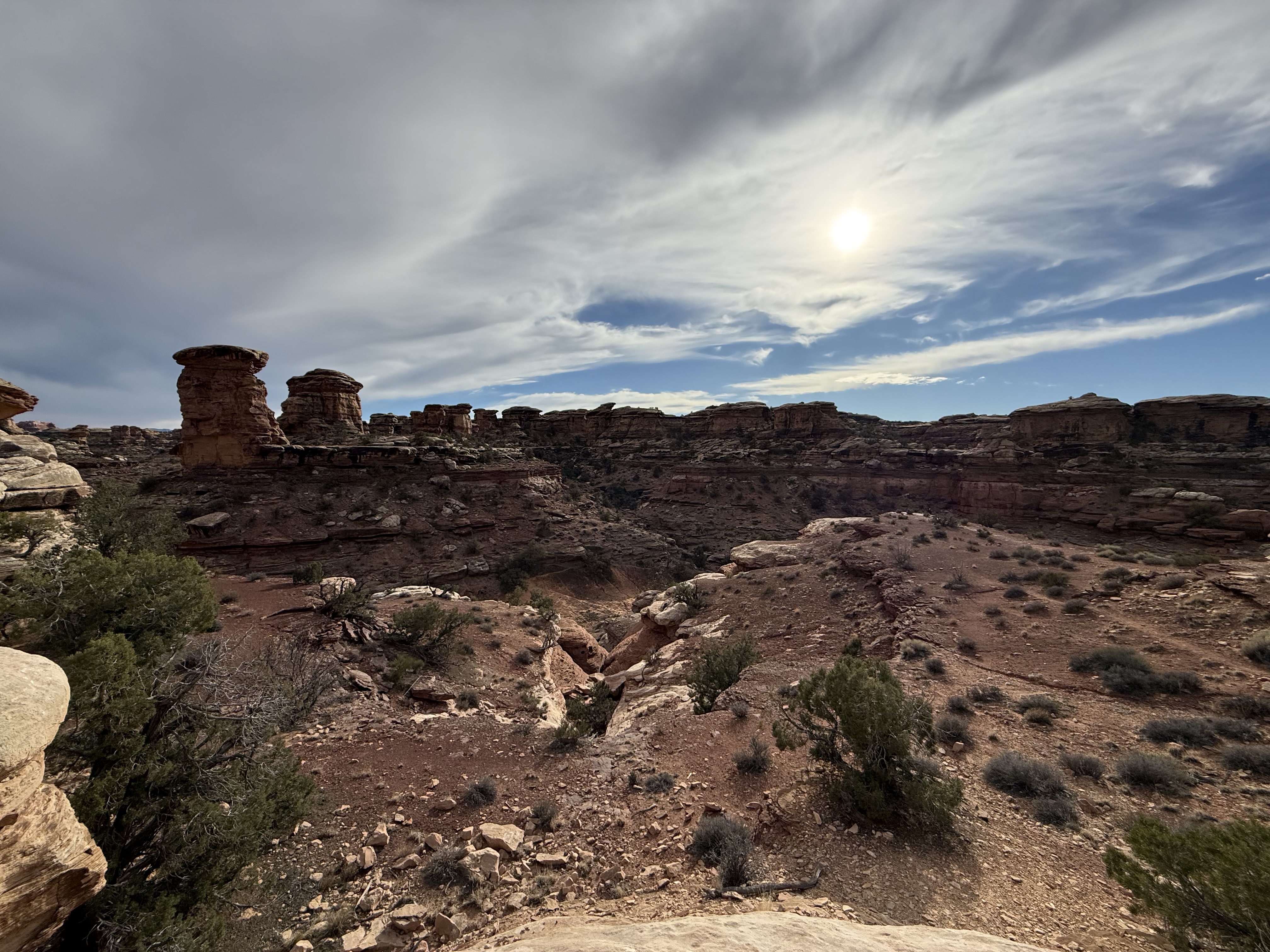 Our plan was to drive through Monument Valley and then head on to Canyonlands National Park. However when we arrived at Monument Valley, we discovered that the famous scenic drive was closed due to an ultra-marathon! Fun fact: This scenic drive is located in a Native American National Park, and is not a part of the US National Park Service. So, it costs $10 per person to visit the visitor center, and an additional $35 per vehicle to drive the scenic drive through the valley. We chose not to pay $20 to enter the visitor center, and continued down the highway that skirts just around the scenic drive. We were still able to see nearly all of the “monuments,” just not from as close. They were still very impressive, and we were left in awe of these magnificent rock structures. It is easy to see why this region is used as an iconic backdrop for so many western movies.